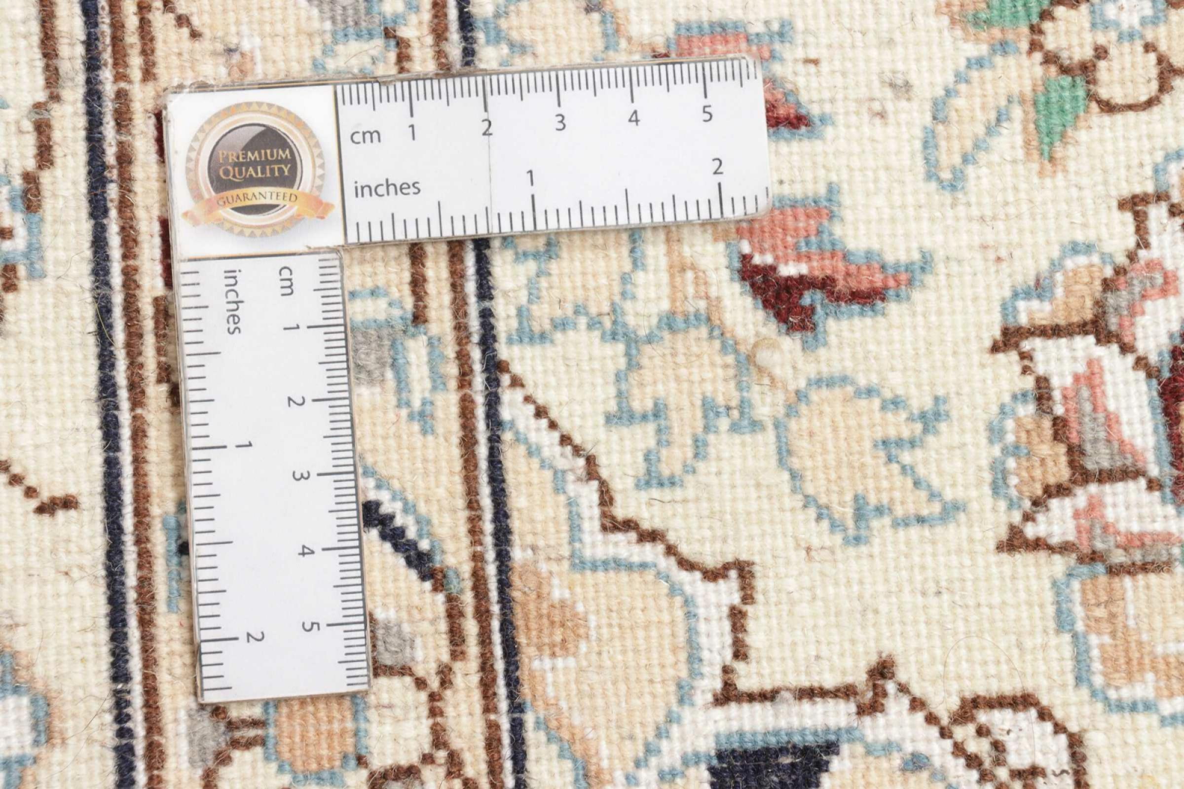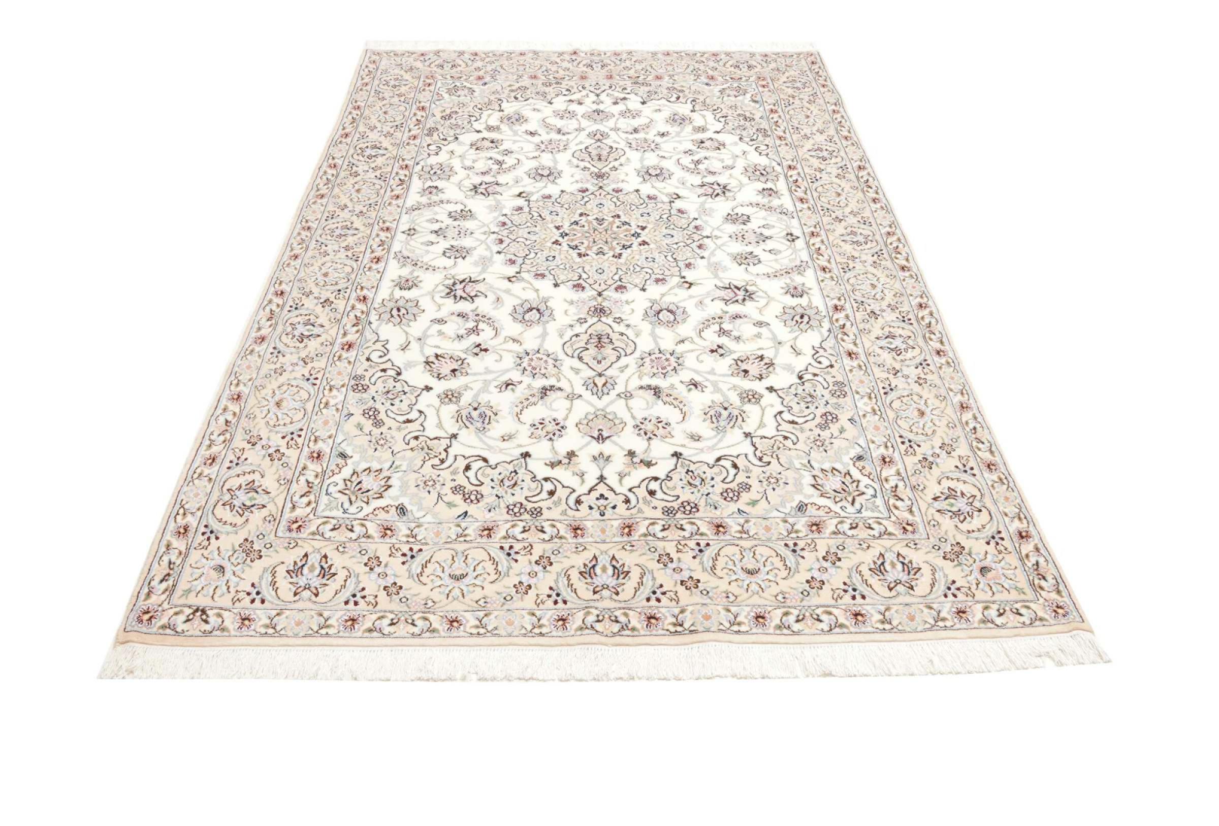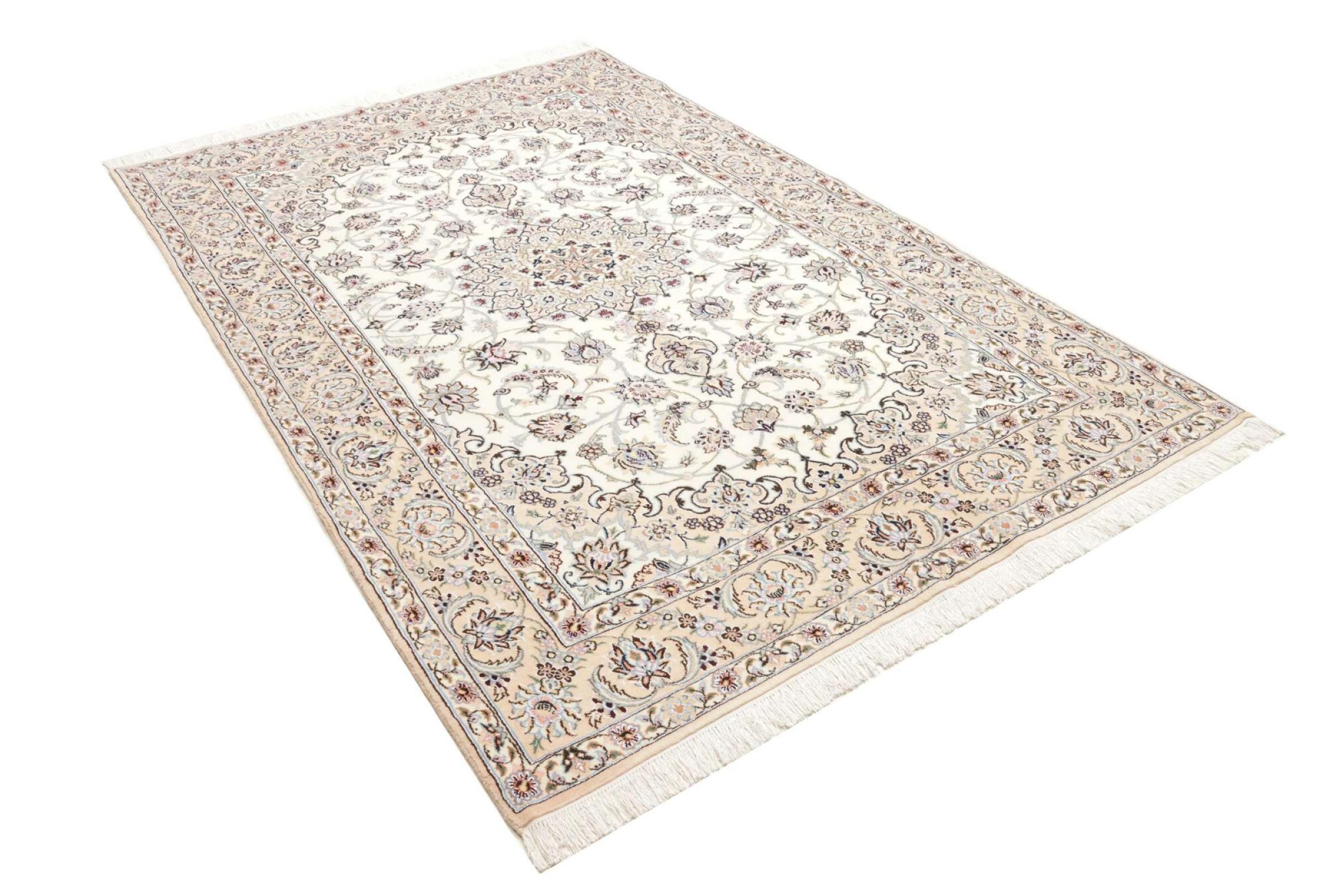 Dette Nain-tæppe er klassificeret 9La. Den fremragende kvalitet, det smukke orientalske design med sine buede mønstre glæder enhver køber. Dette persiske tæppe blev håndknyttet af højkvalitets uld og natursilke i byen Nain, som ligger i den vestlige udkant af Dasht-e-Kavir-ørkenen. 9La Nain er væsentligt finere end en 12La og viser allerede smukke detaljer.