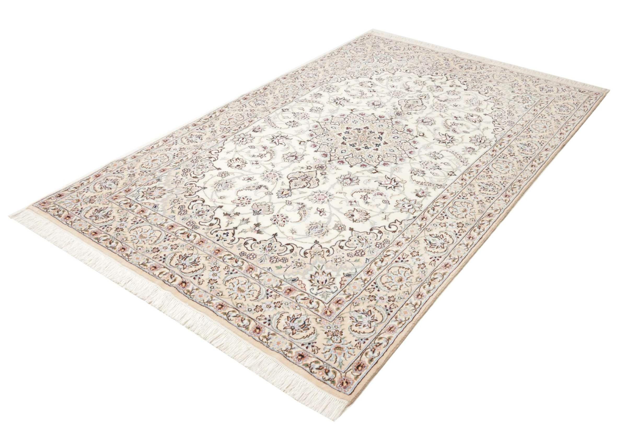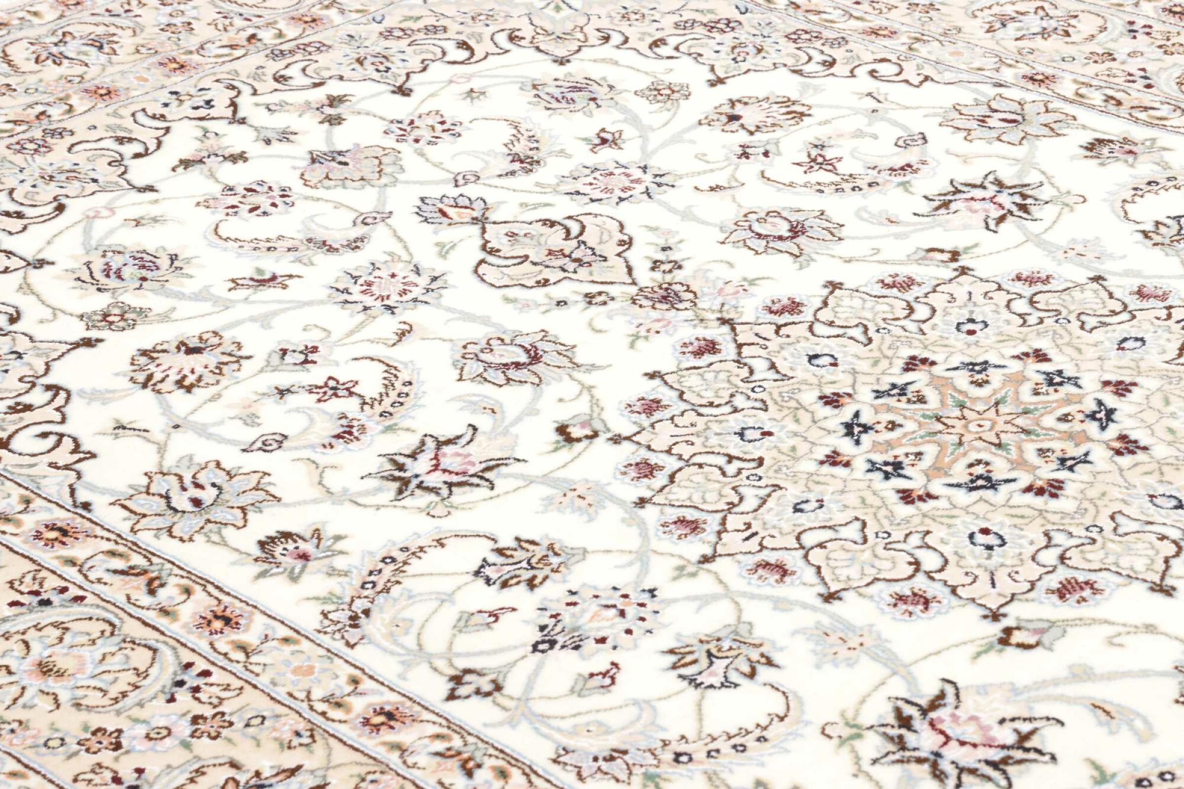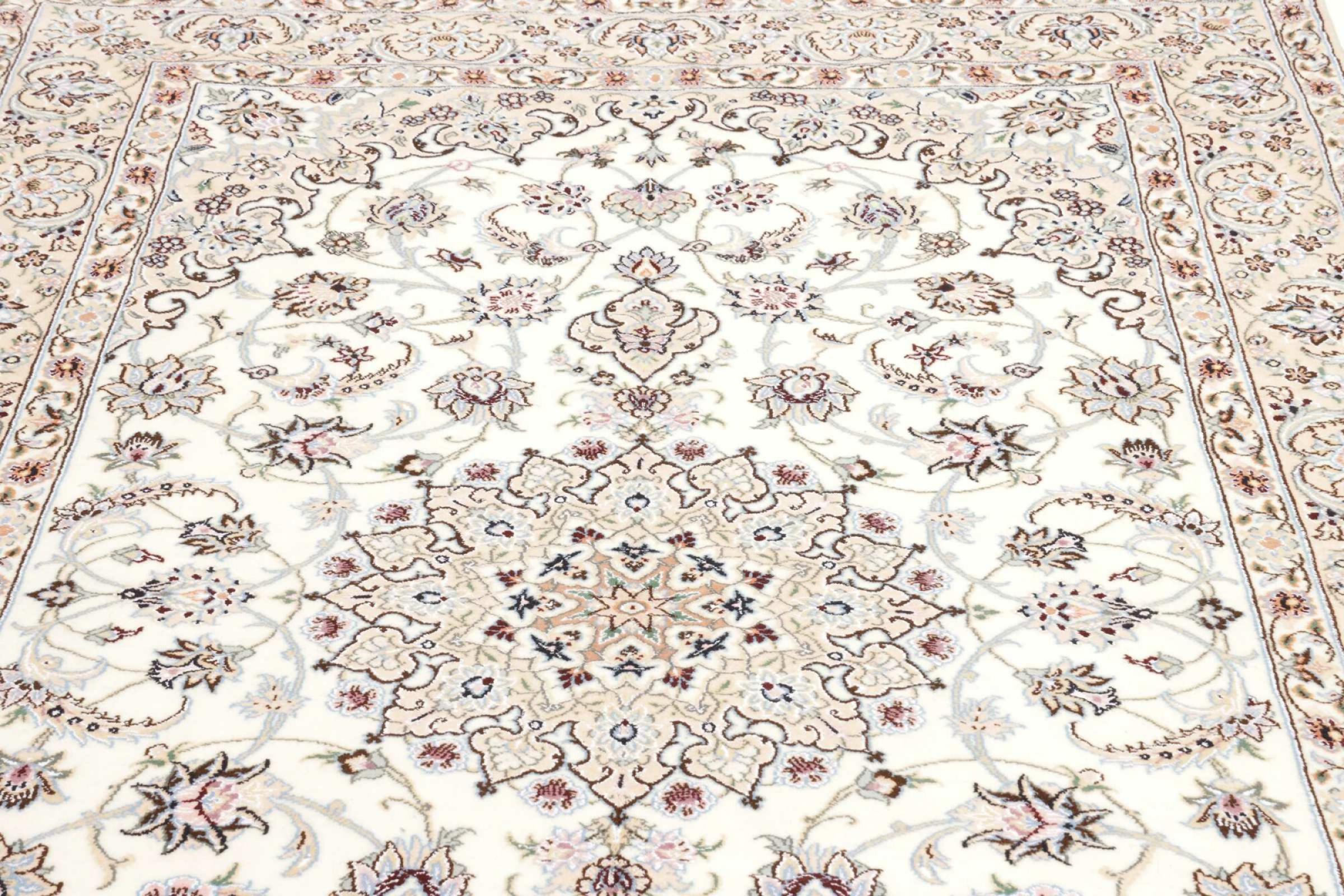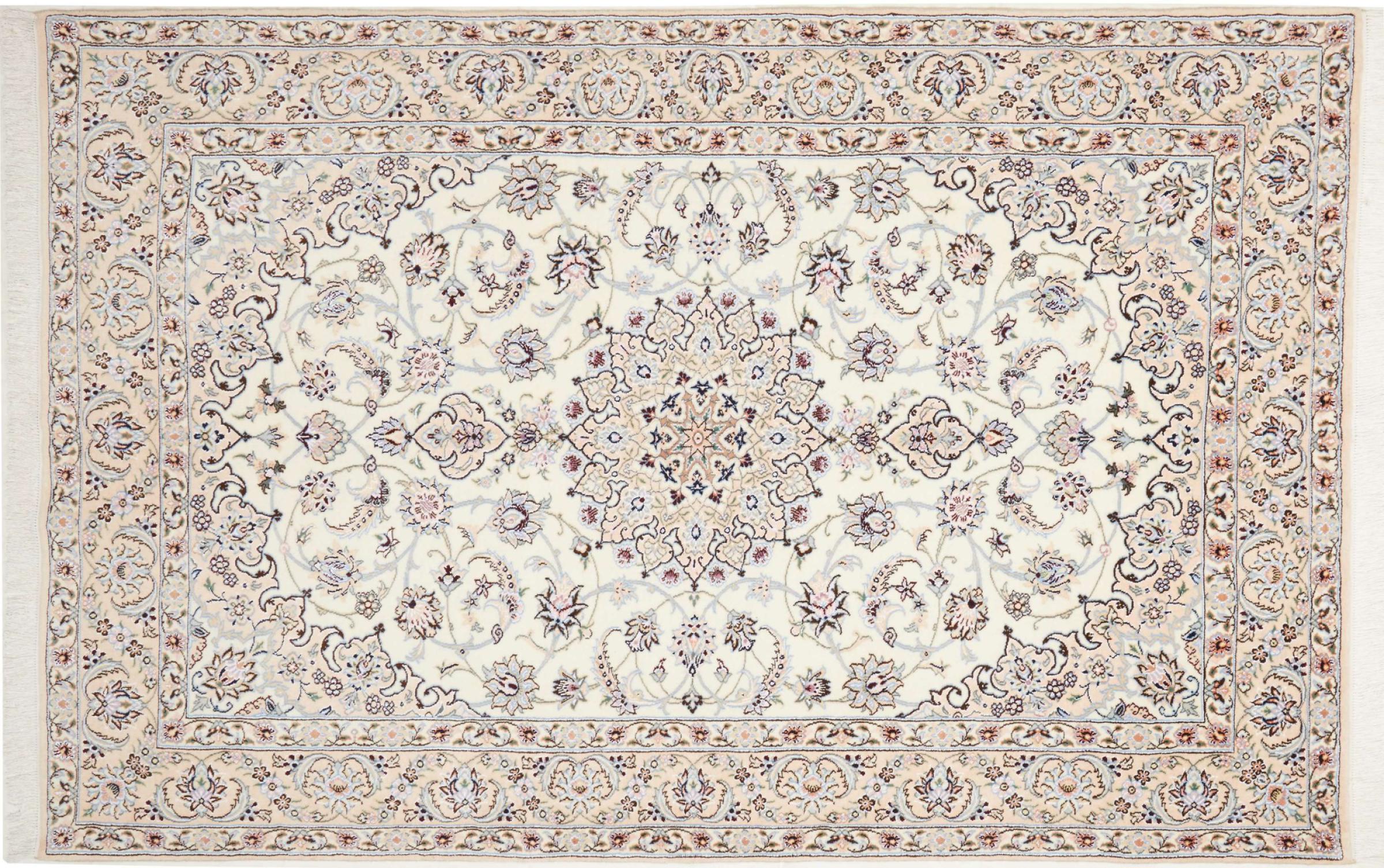 Dette Nain-tæppe er klassificeret 9La. Den fremragende kvalitet, det smukke orientalske design med sine buede mønstre glæder enhver køber. Dette persiske tæppe blev håndknyttet af højkvalitets uld og natursilke i byen Nain, som ligger i den vestlige udkant af Dasht-e-Kavir-ørkenen. 9La Nain er væsentligt finere end en 12La og viser allerede smukke detaljer.