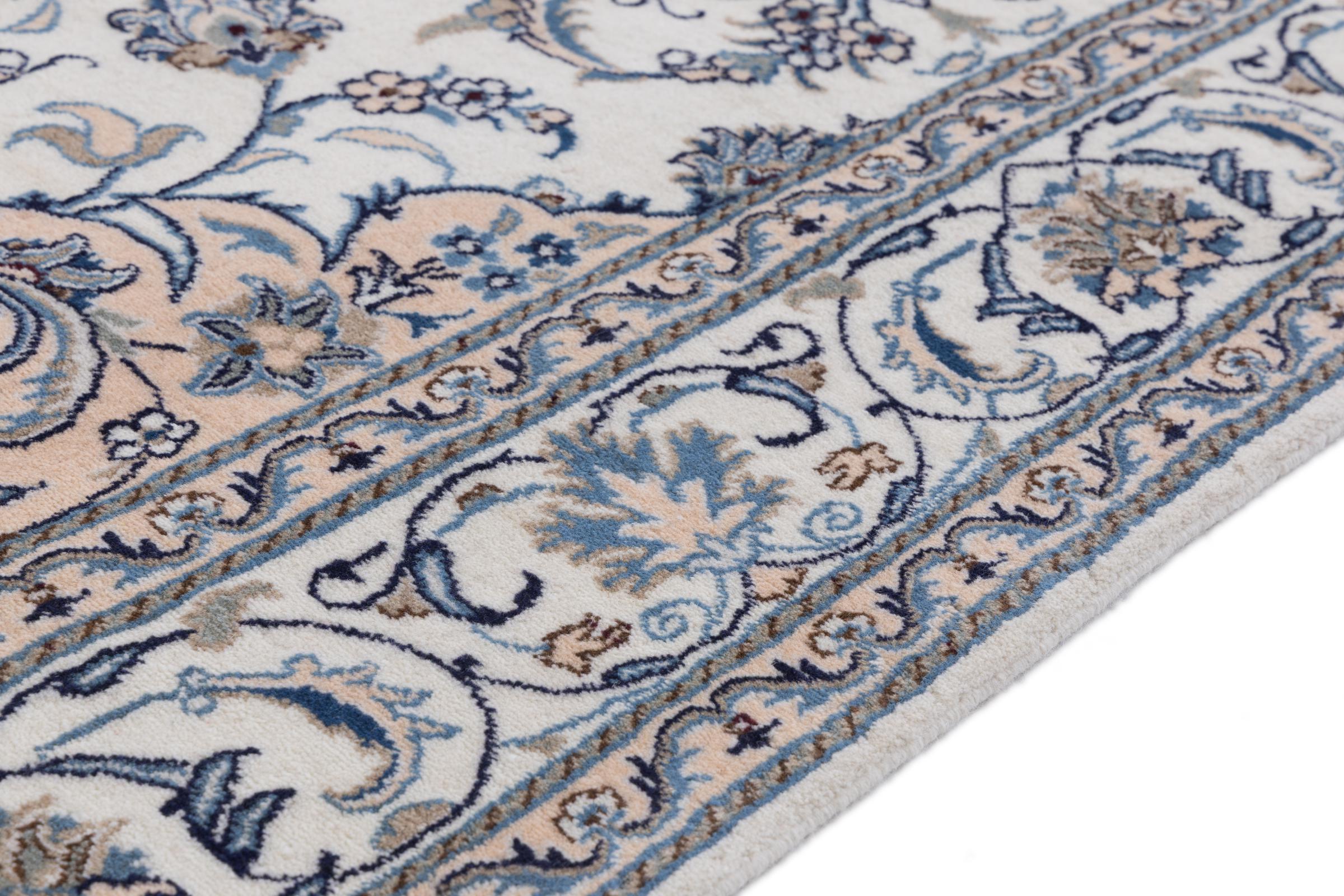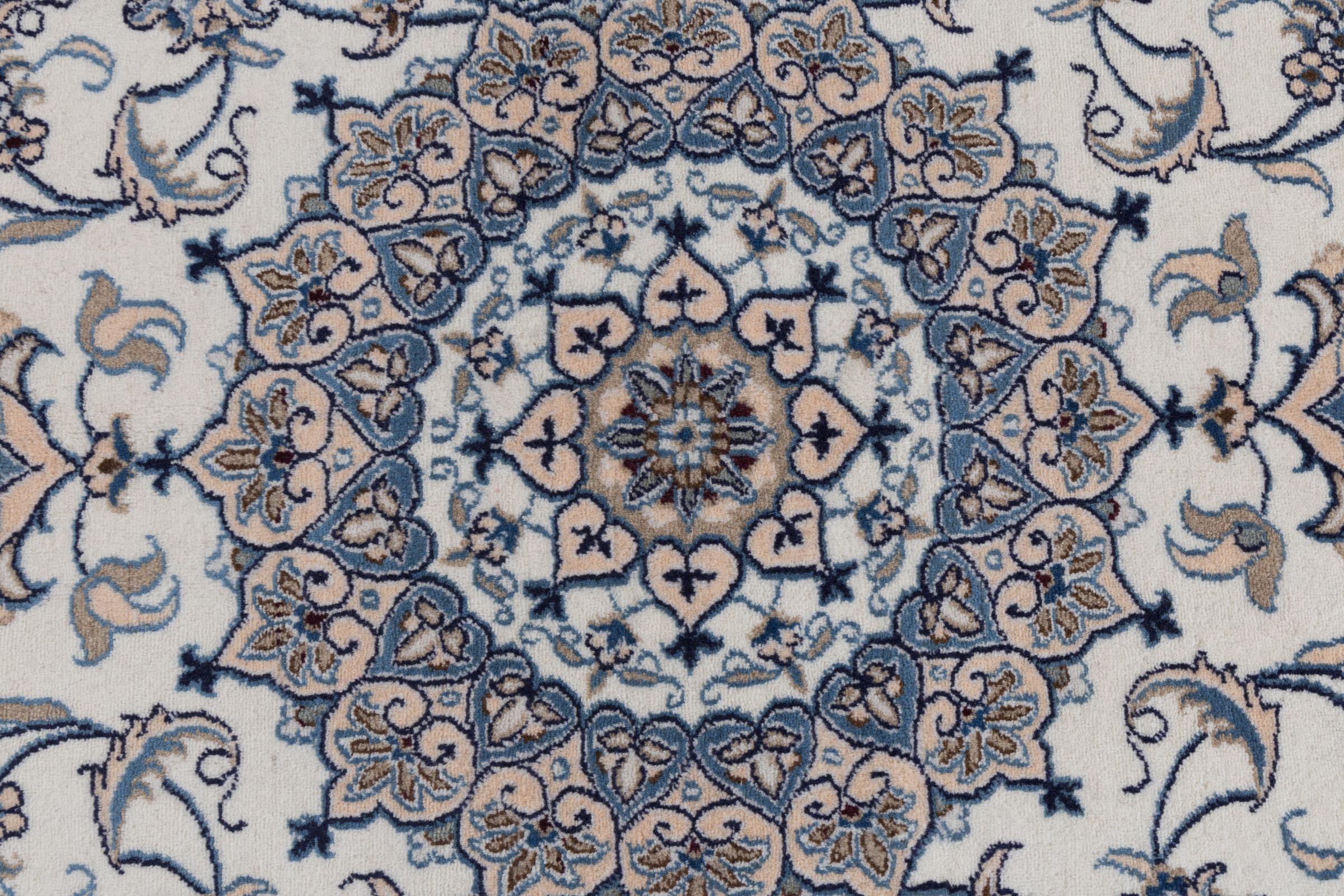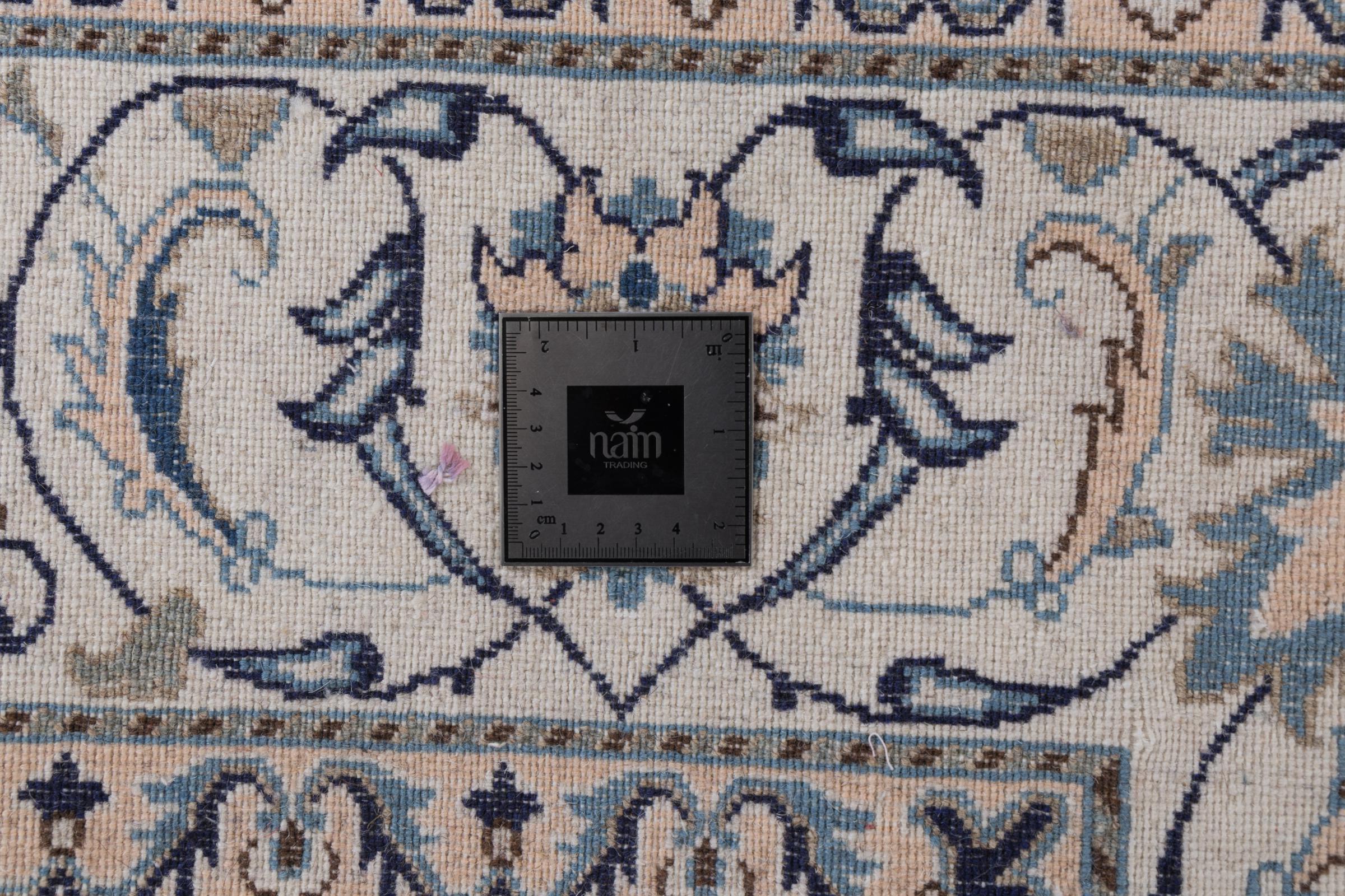 Dette Nain tæppe er vurderet til 12La. Det ser elegant og ædelt ud i sit typiske Nain-farveskema. Dette persiske tæppe blev håndknyttet af højkvalitets uld og natursilke i byen Nain, som ligger i den vestlige udkant af Dasht-e-Kavir-ørkenen. Med 12La er den ikke så fint og detaljeret udsmykket som en Nain 9La eller 6La.