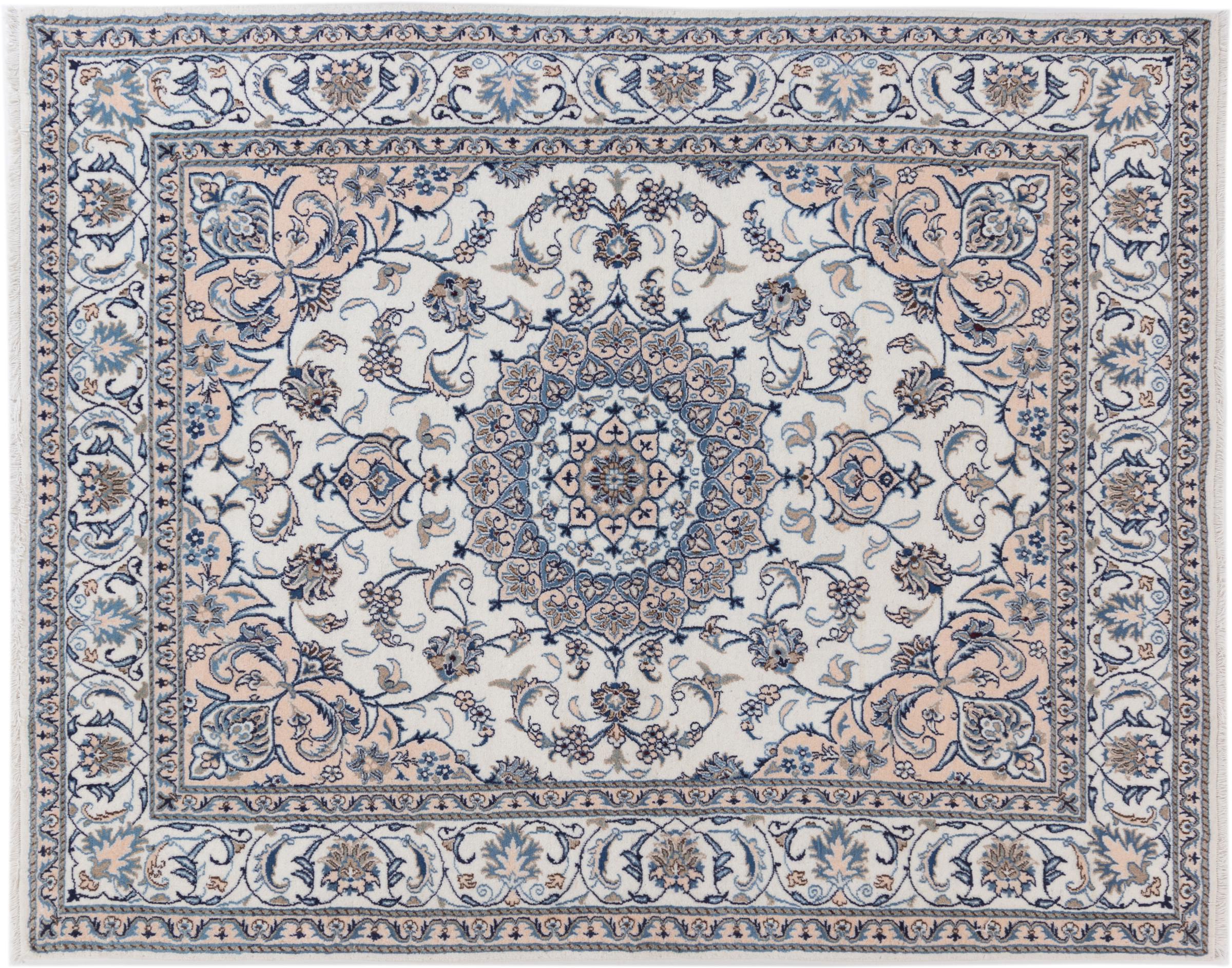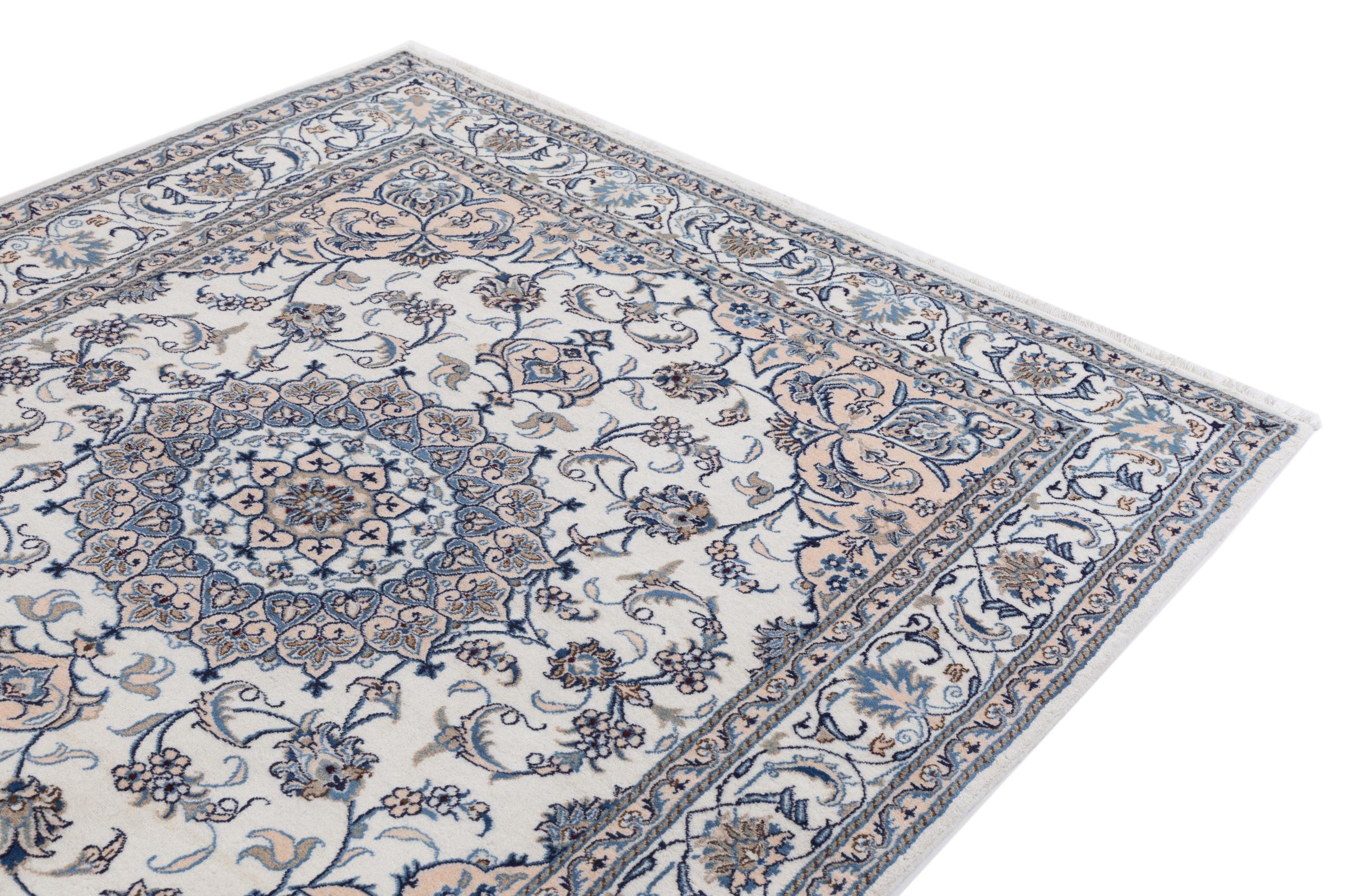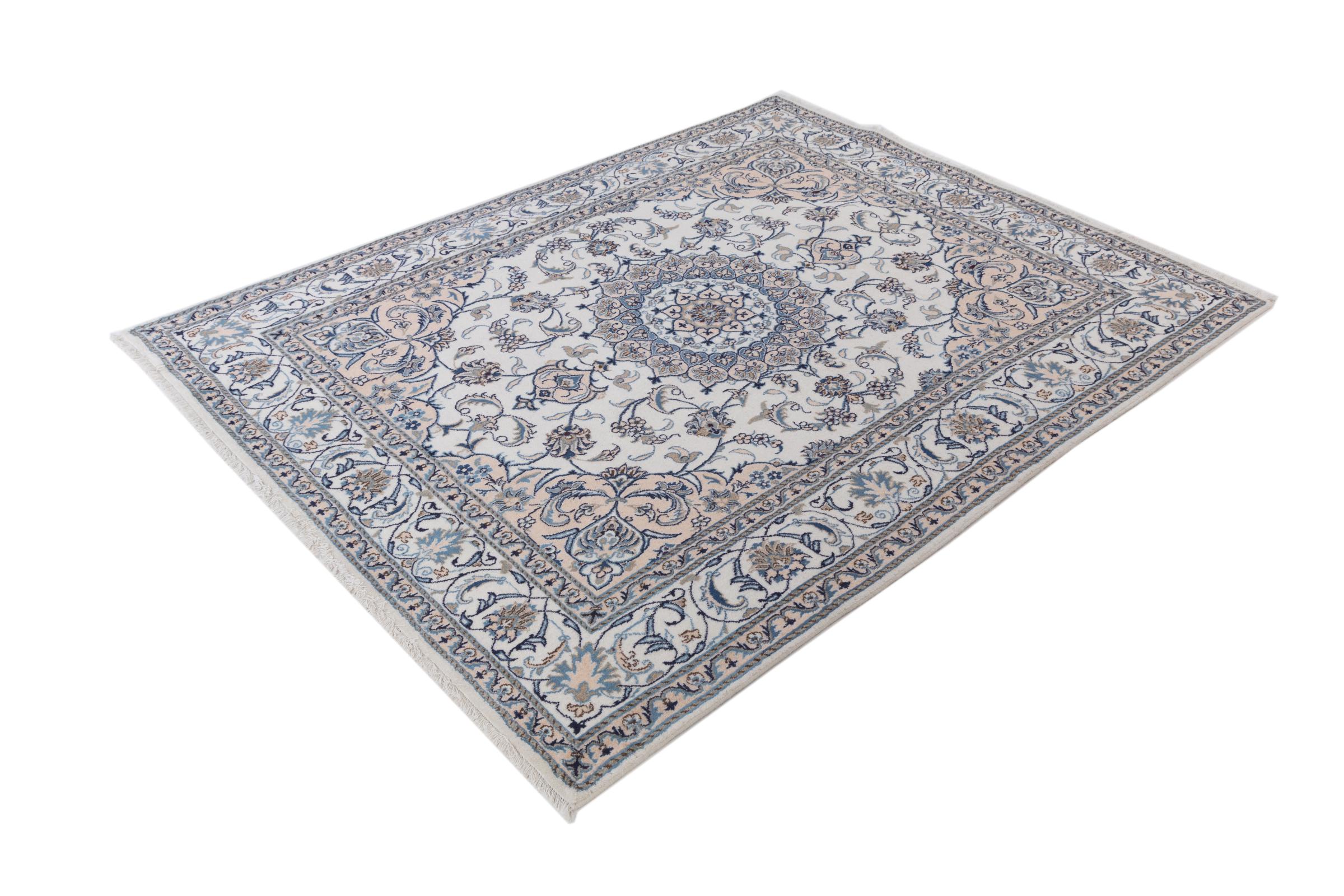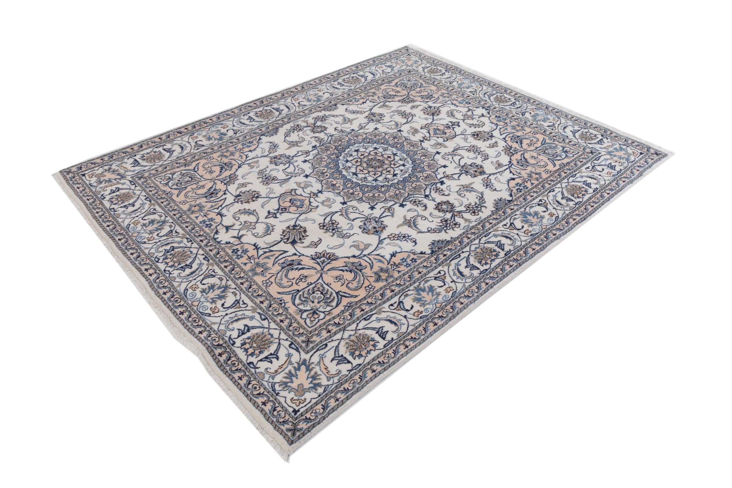 Dette Nain tæppe er vurderet til 12La. Det ser elegant og ædelt ud i sit typiske Nain-farveskema. Dette persiske tæppe blev håndknyttet af højkvalitets uld og natursilke i byen Nain, som ligger i den vestlige udkant af Dasht-e-Kavir-ørkenen. Med 12La er den ikke så fint og detaljeret udsmykket som en Nain 9La eller 6La.