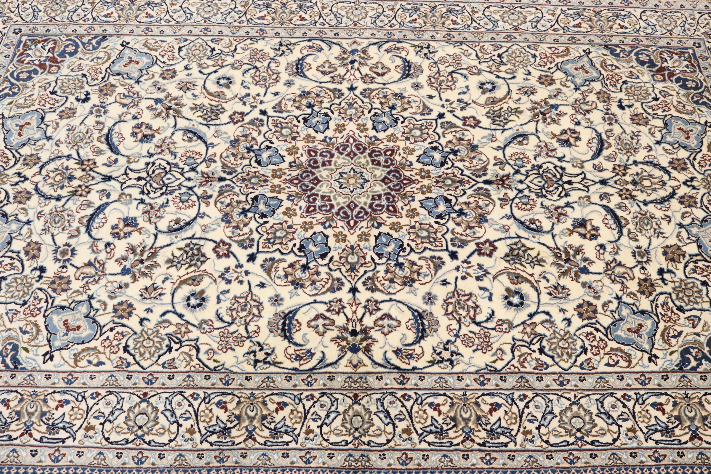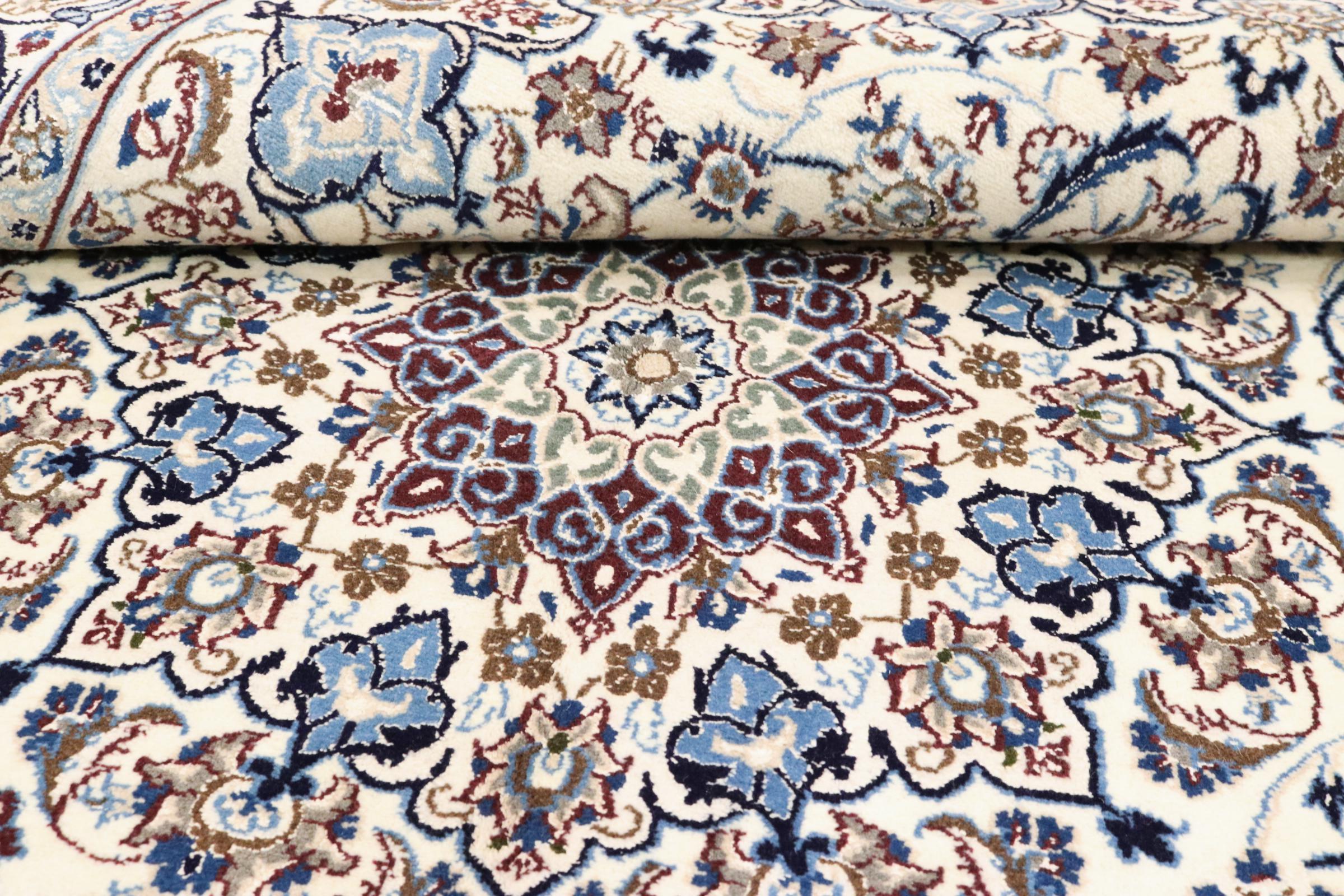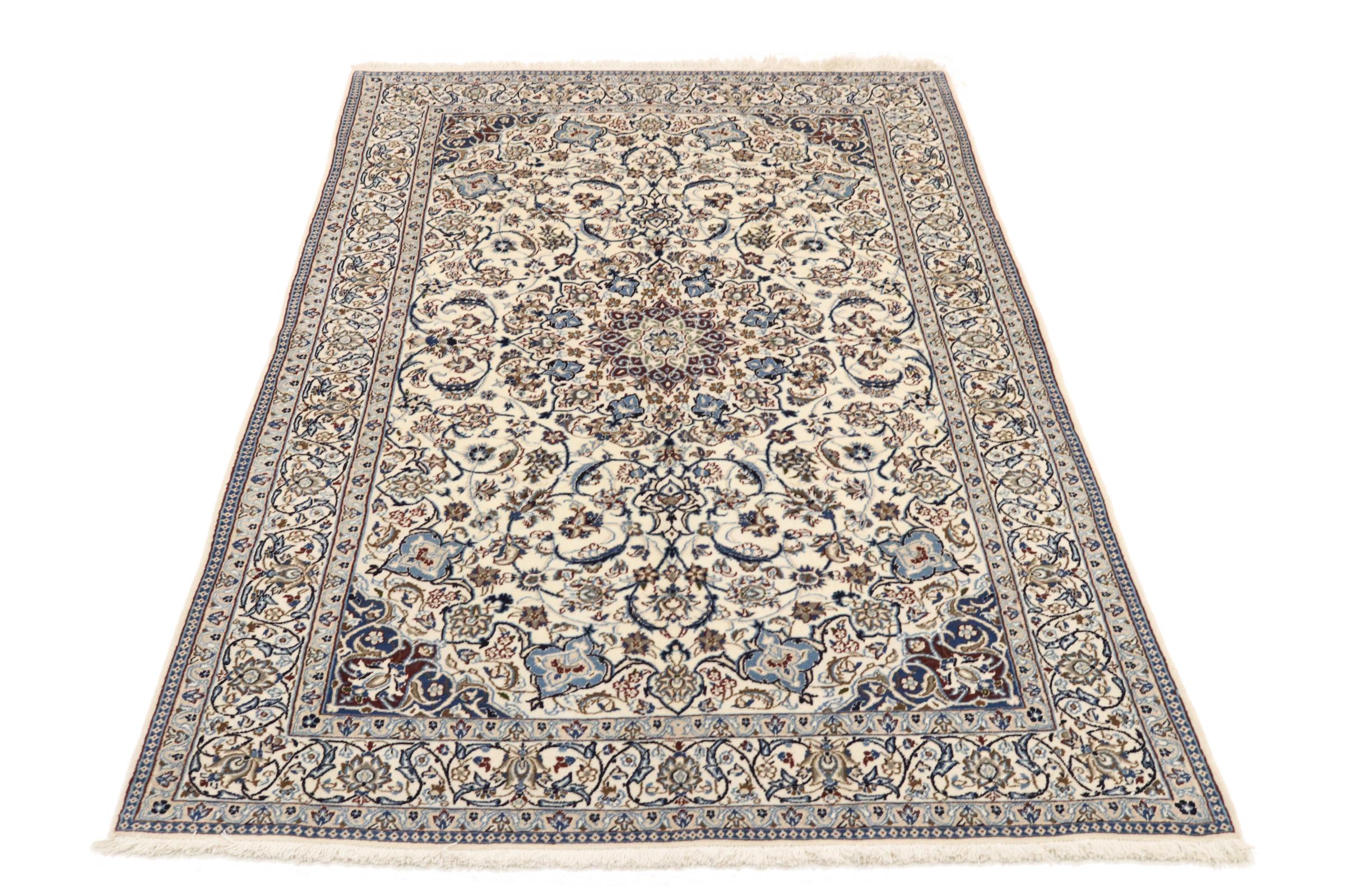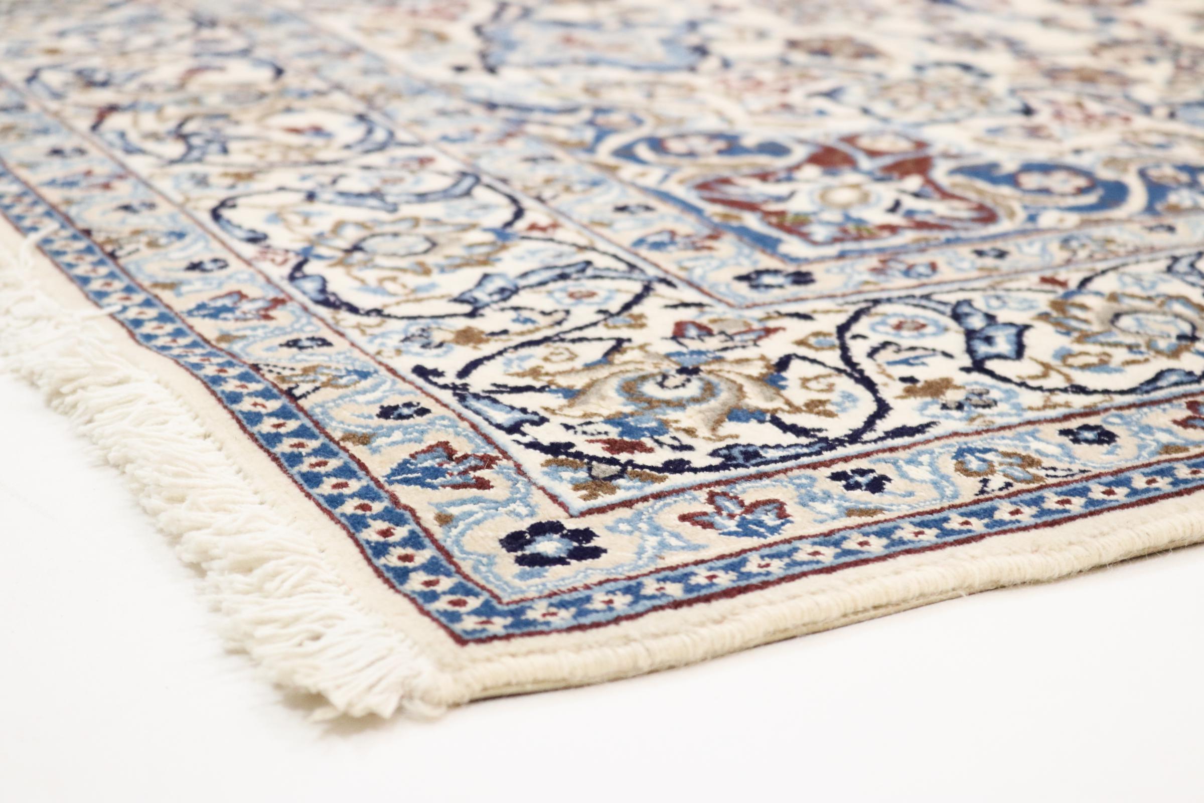Dette Nain-tæppe er klassificeret 9La. Den fremragende kvalitet, det smukke orientalske design med sine buede mønstre glæder enhver køber. Dette persiske tæppe blev håndknyttet af højkvalitets uld og natursilke i byen Nain, som ligger i den vestlige udkant af Dasht-e-Kavir-ørkenen. 9La Nain er væsentligt finere end en 12La og viser allerede smukke detaljer.