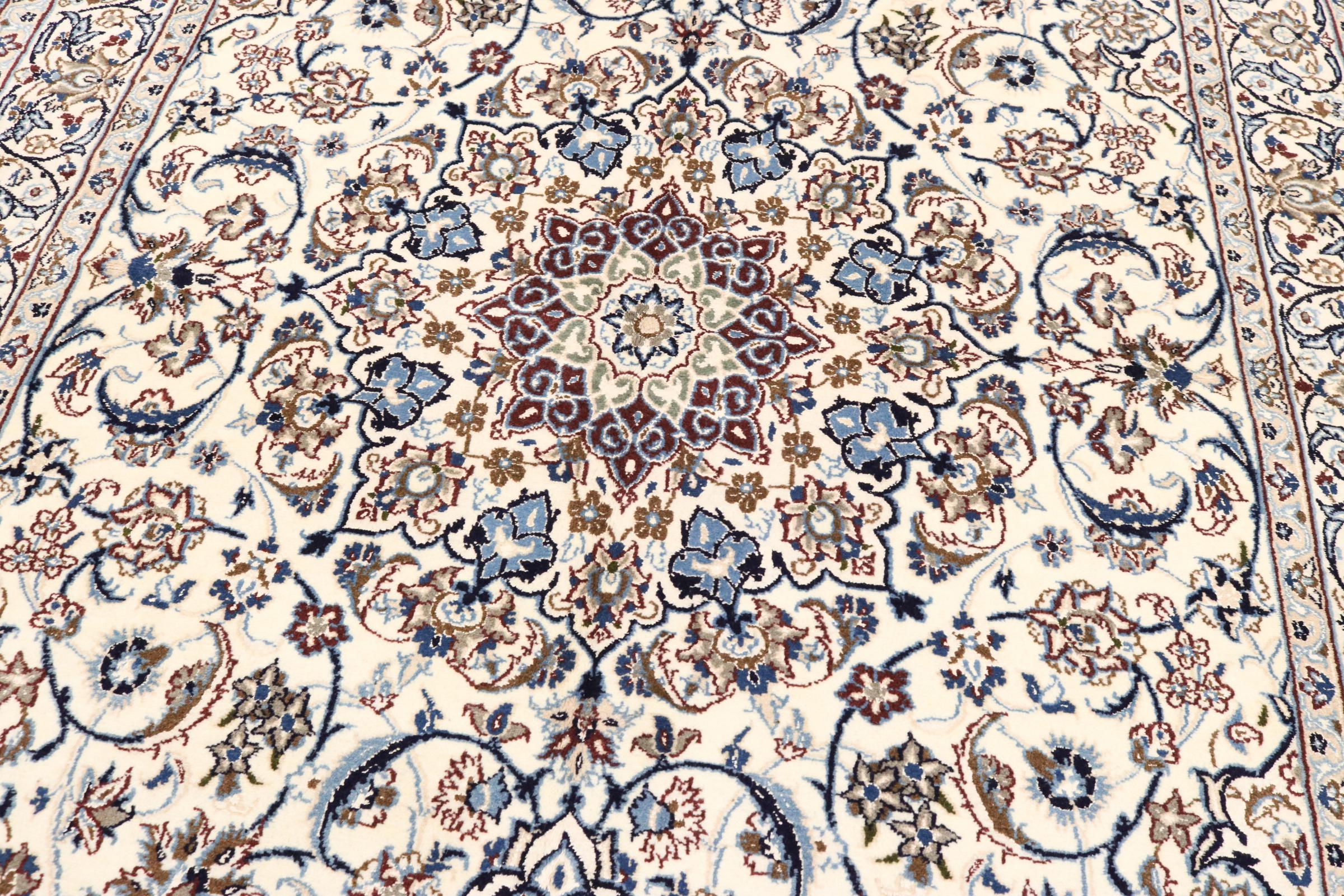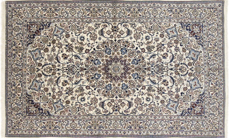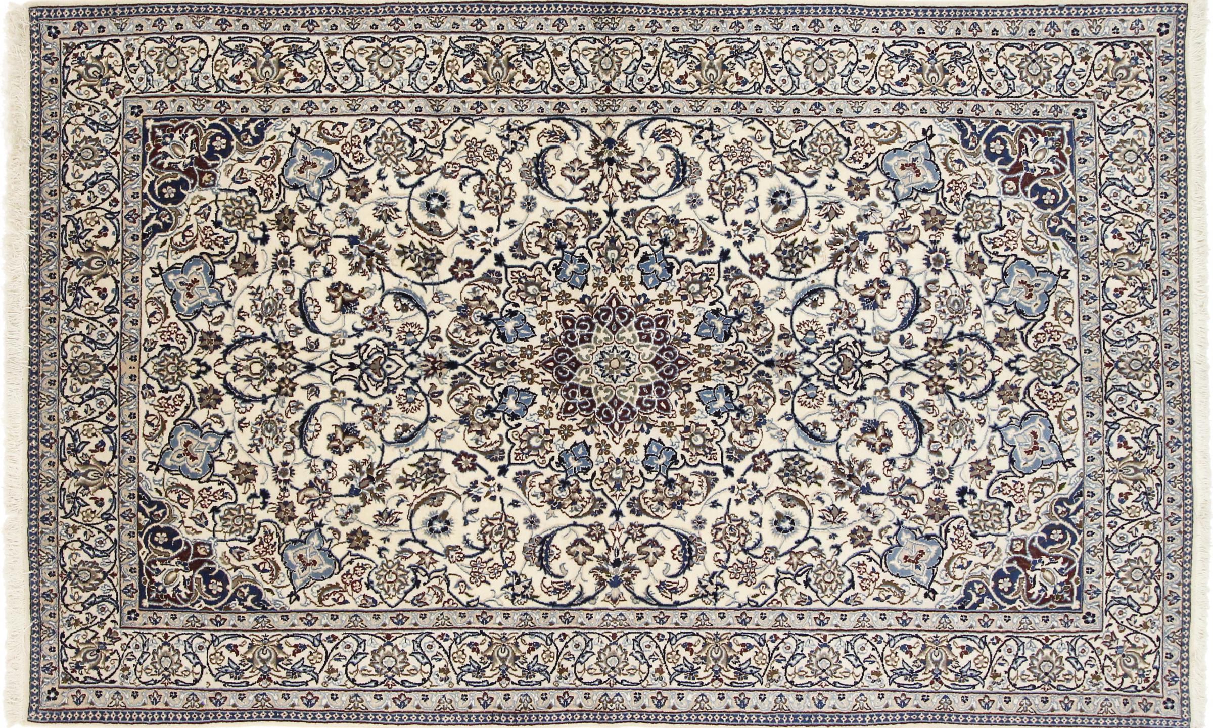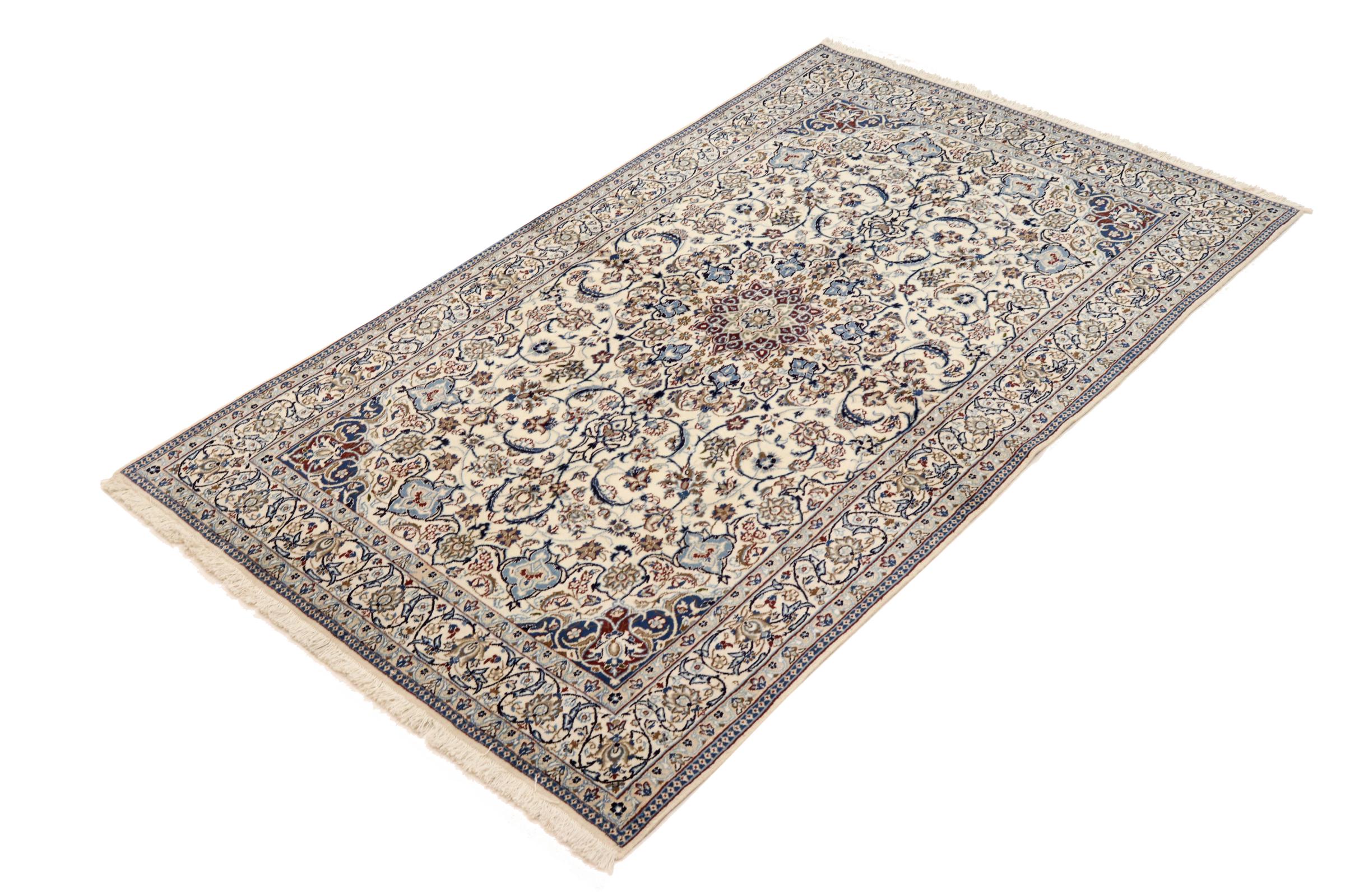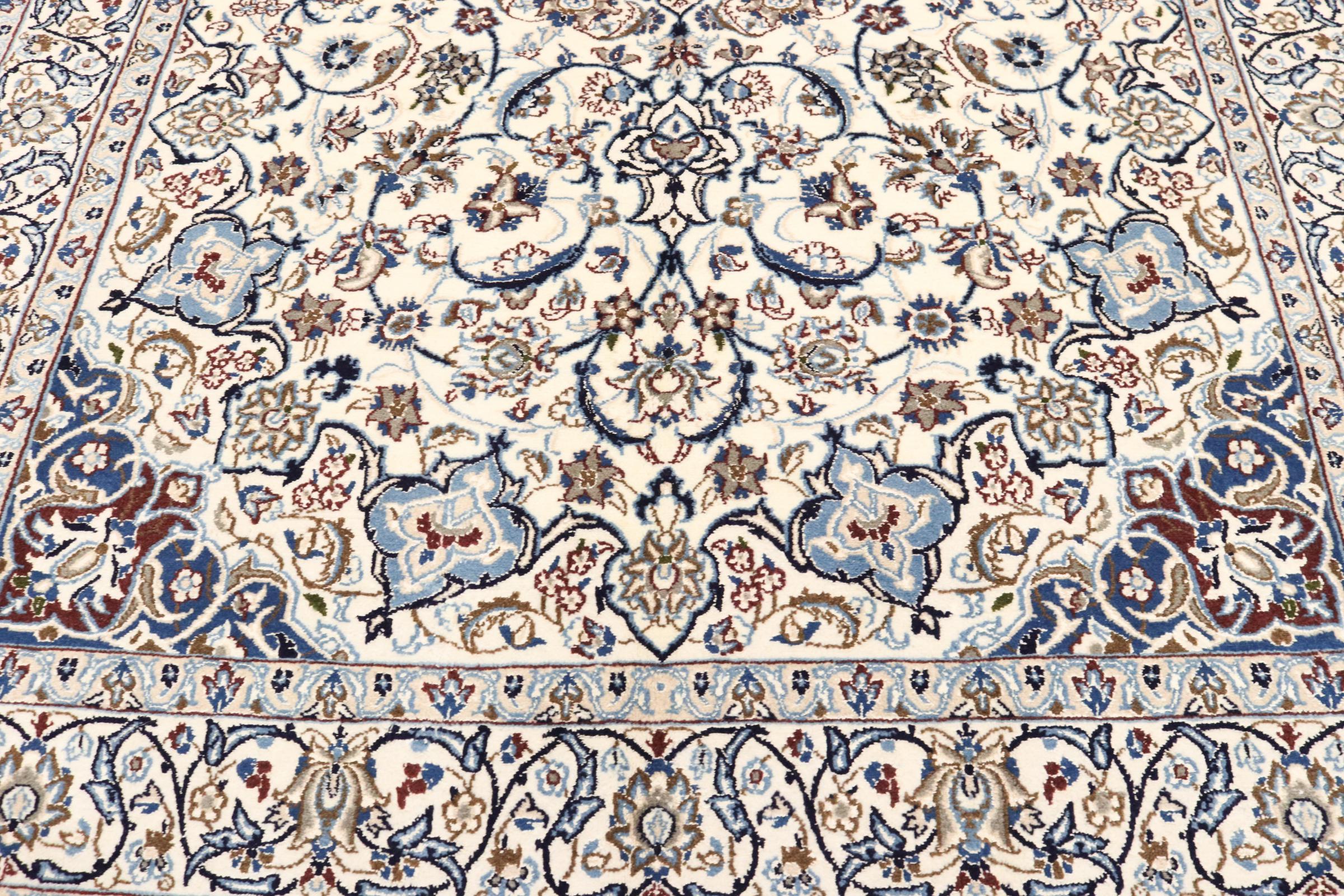 Dette Nain-tæppe er klassificeret 9La. Den fremragende kvalitet, det smukke orientalske design med sine buede mønstre glæder enhver køber. Dette persiske tæppe blev håndknyttet af højkvalitets uld og natursilke i byen Nain, som ligger i den vestlige udkant af Dasht-e-Kavir-ørkenen. 9La Nain er væsentligt finere end en 12La og viser allerede smukke detaljer.