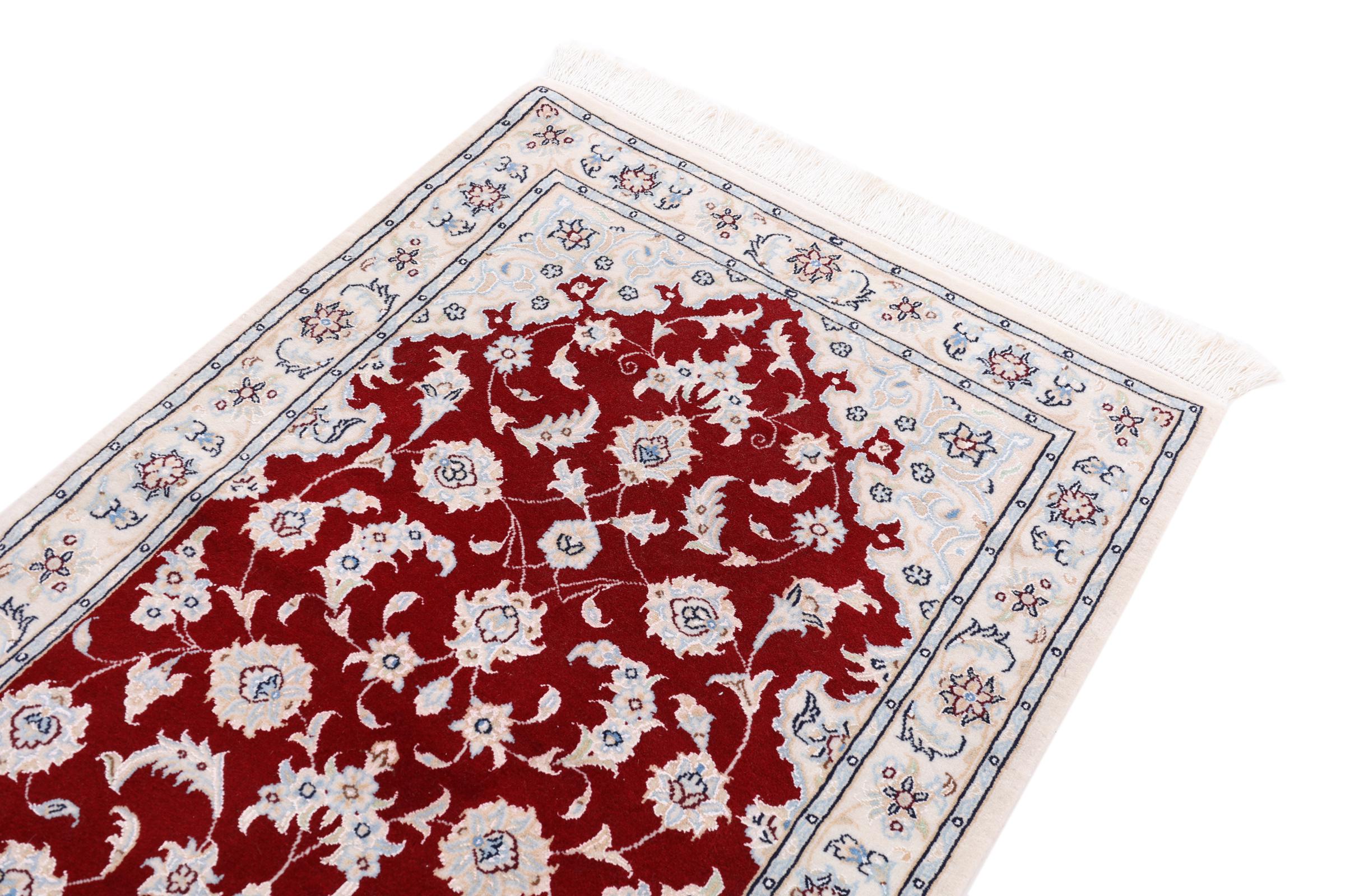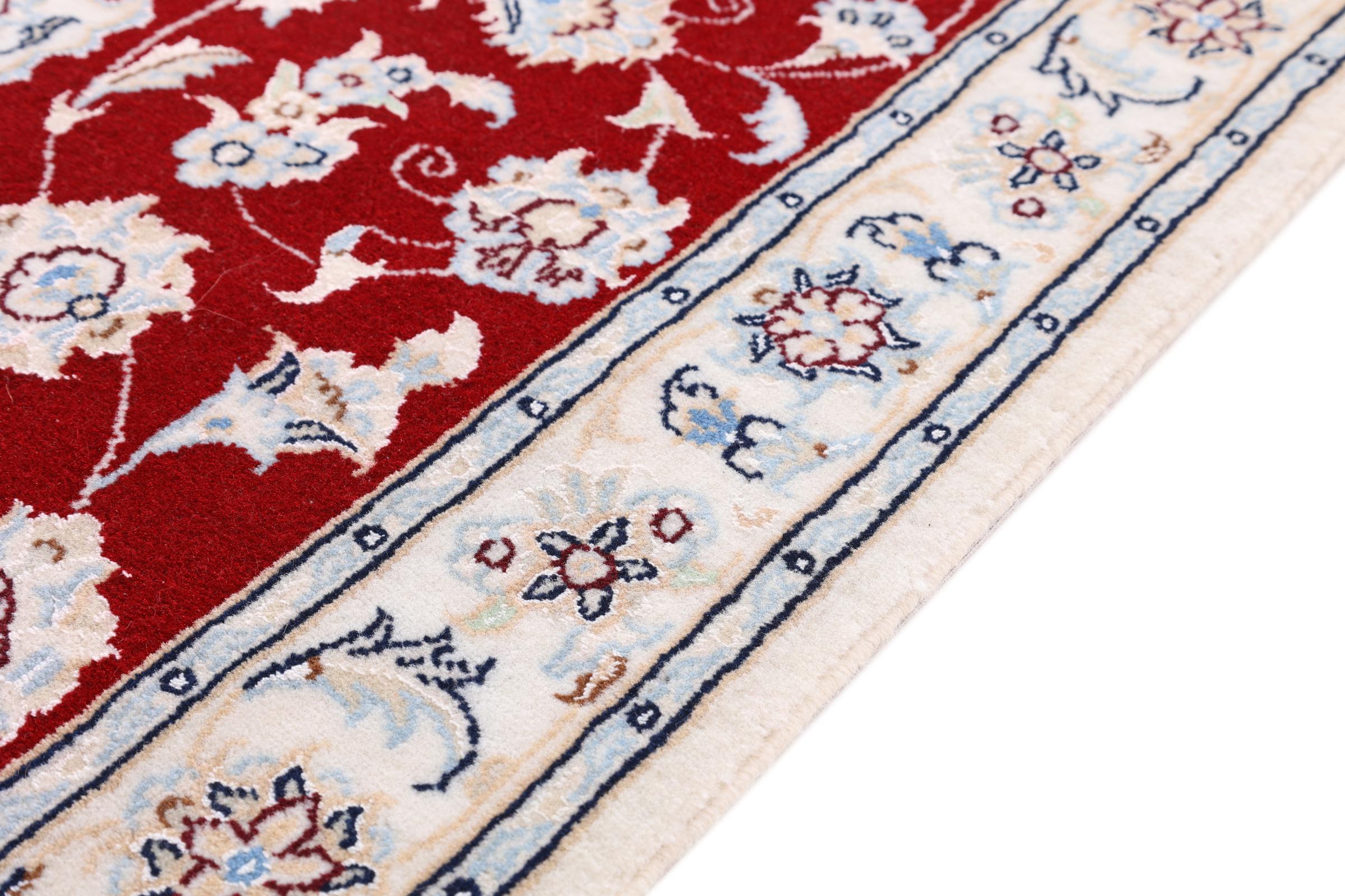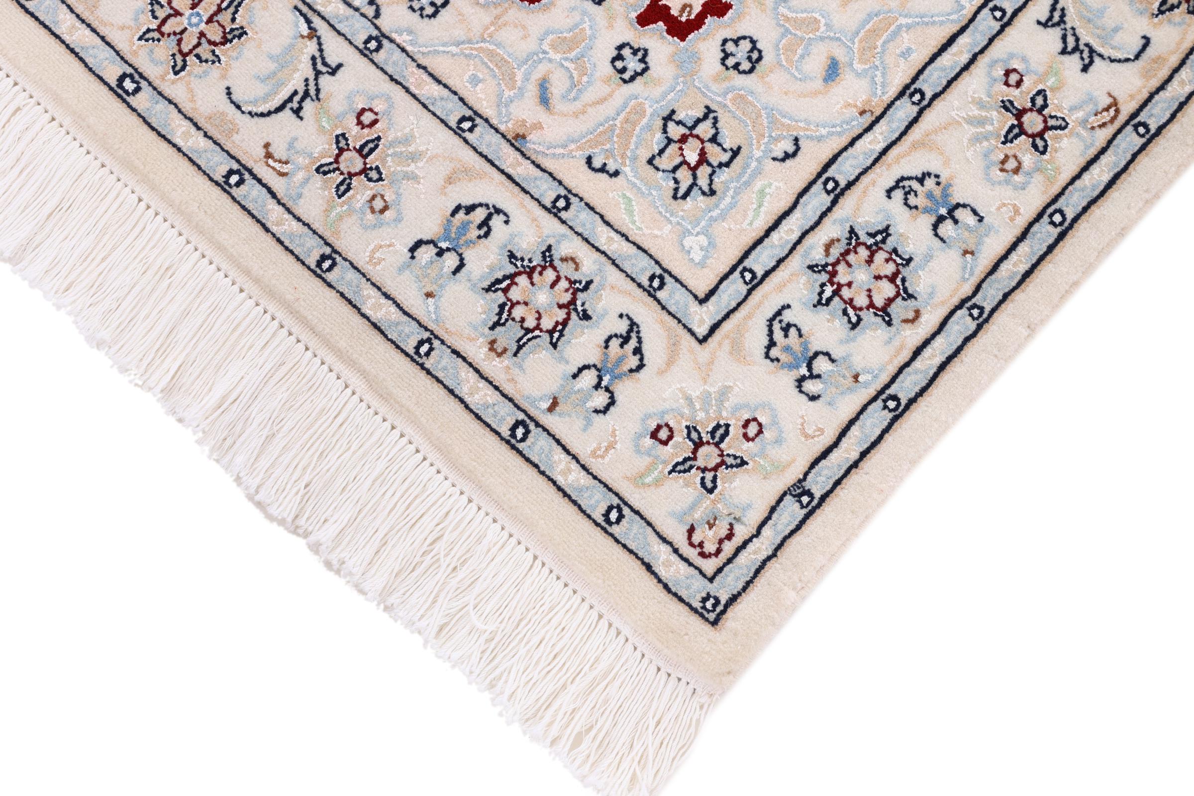 Dette Nain-tæppe er klassificeret 9La. Den fremragende kvalitet, det smukke orientalske design med sine buede mønstre glæder enhver køber. Dette persiske tæppe blev håndknyttet af højkvalitets uld og natursilke i byen Nain, som ligger i den vestlige udkant af Dasht-e-Kavir-ørkenen. 9La Nain er væsentligt finere end en 12La og viser allerede smukke detaljer.