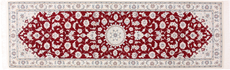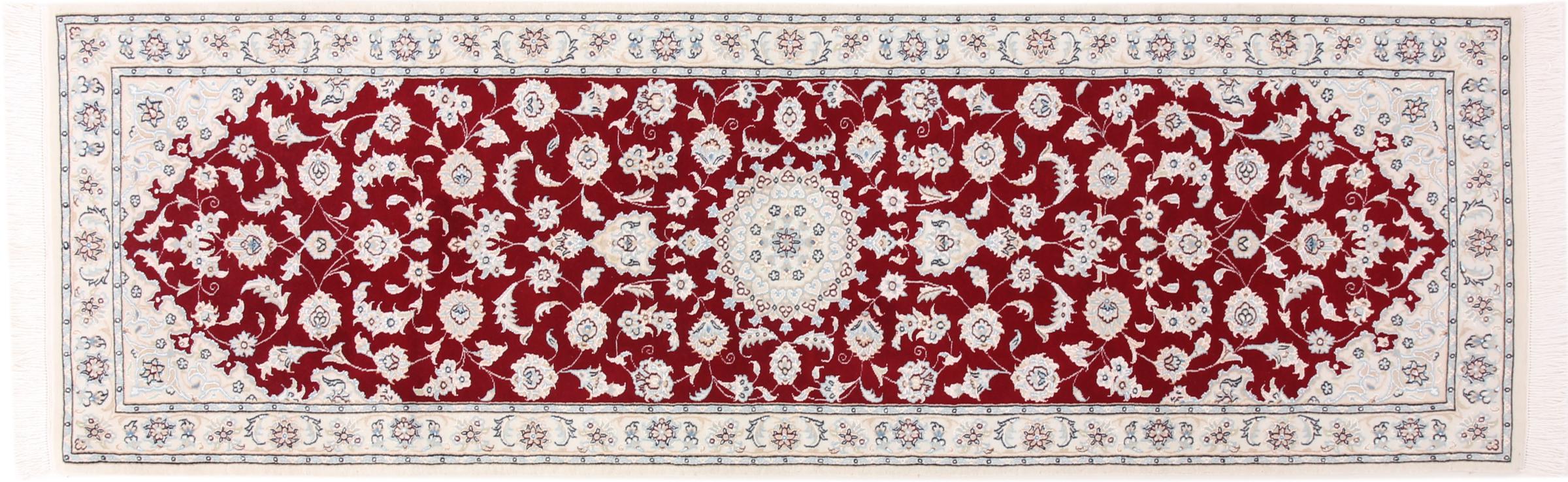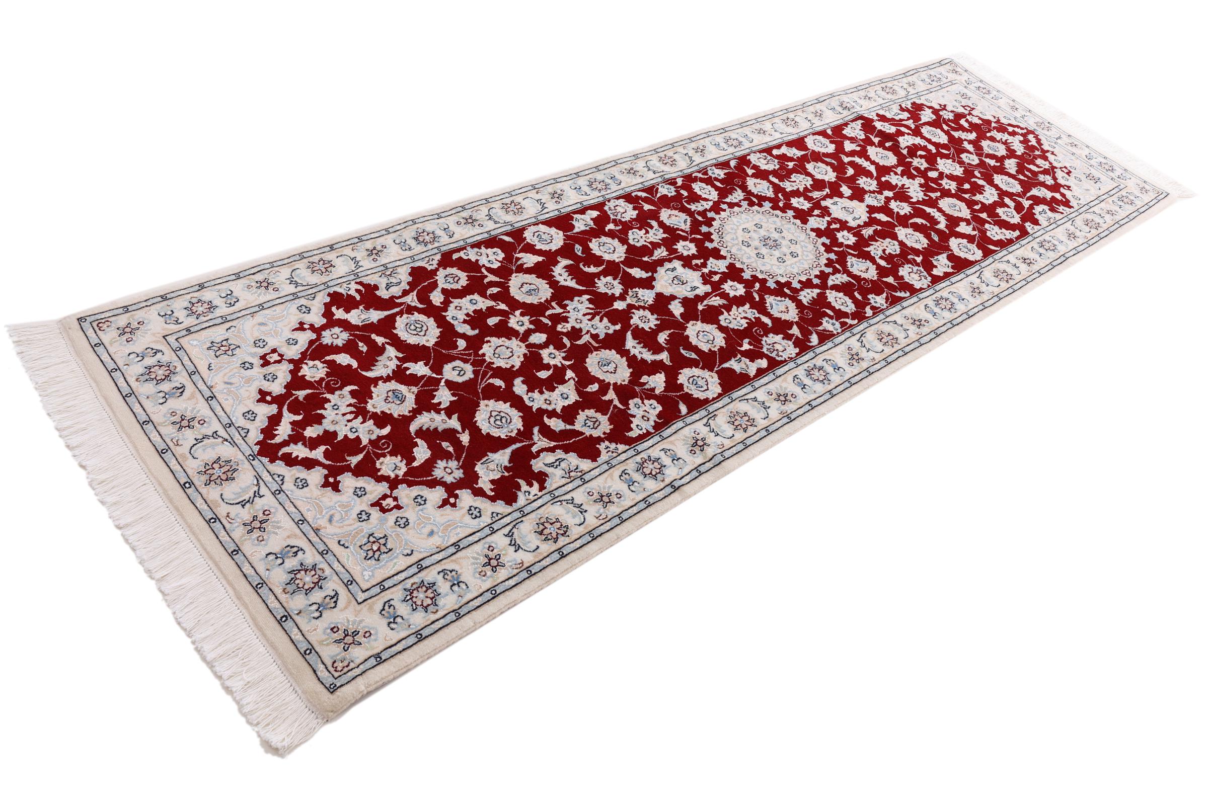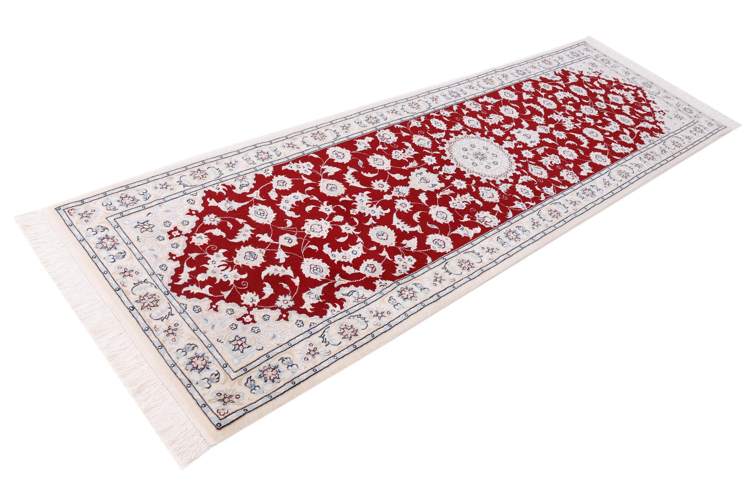 Dette Nain-tæppe er klassificeret 9La. Den fremragende kvalitet, det smukke orientalske design med sine buede mønstre glæder enhver køber. Dette persiske tæppe blev håndknyttet af højkvalitets uld og natursilke i byen Nain, som ligger i den vestlige udkant af Dasht-e-Kavir-ørkenen. 9La Nain er væsentligt finere end en 12La og viser allerede smukke detaljer.