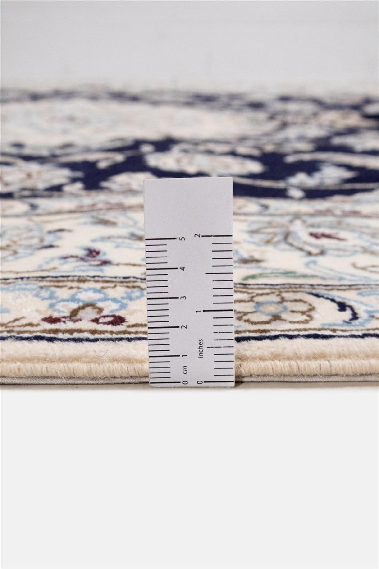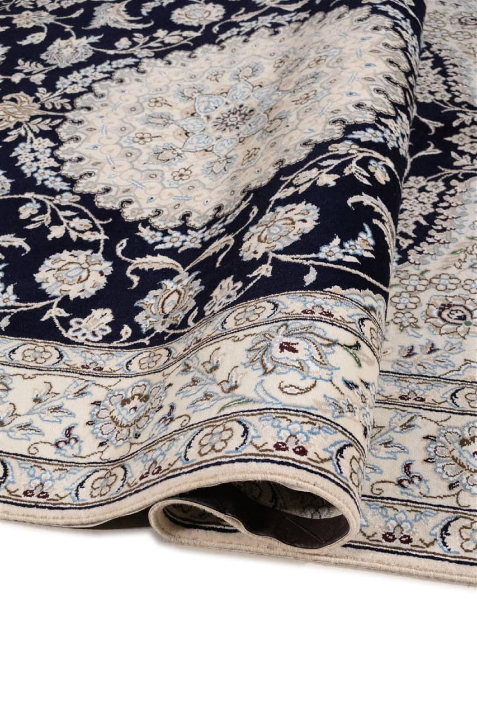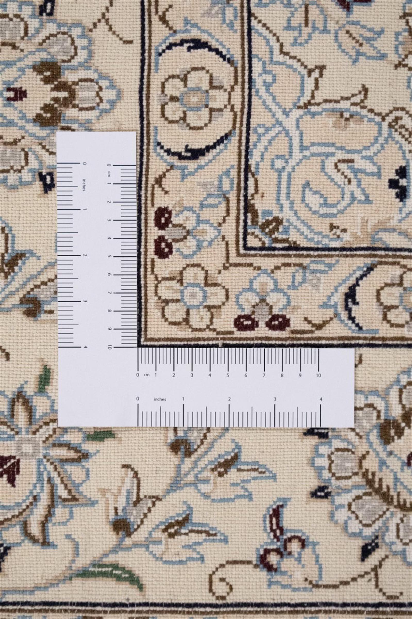 Dette Nain-tæppe er klassificeret 9La. Den fremragende kvalitet, det smukke orientalske design med sine buede mønstre glæder enhver køber. Dette persiske tæppe blev håndknyttet af højkvalitets uld og natursilke i byen Nain, som ligger i den vestlige udkant af Dasht-e-Kavir-ørkenen. 9La Nain er væsentligt finere end en 12La og viser allerede smukke detaljer.