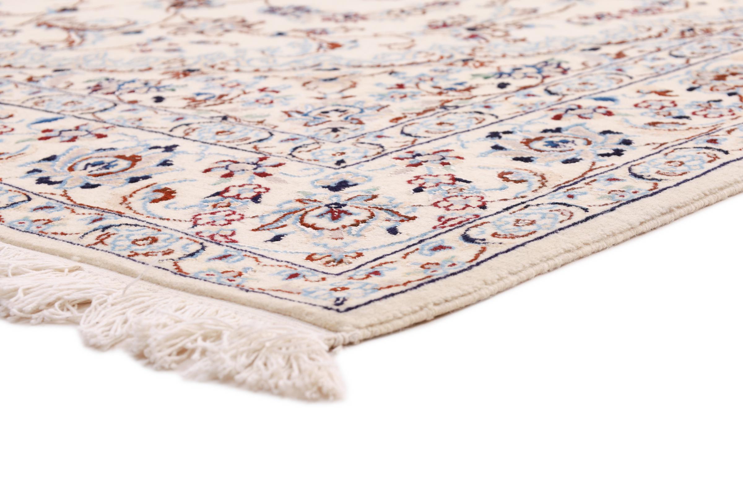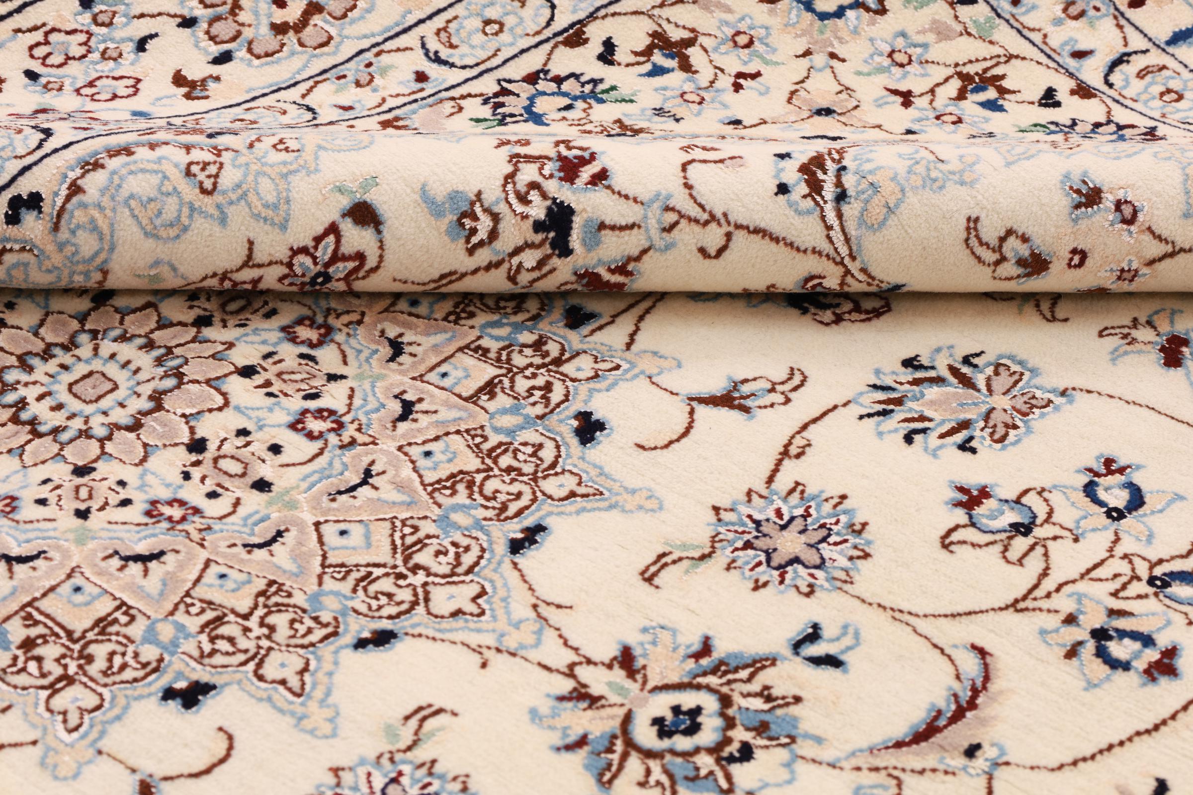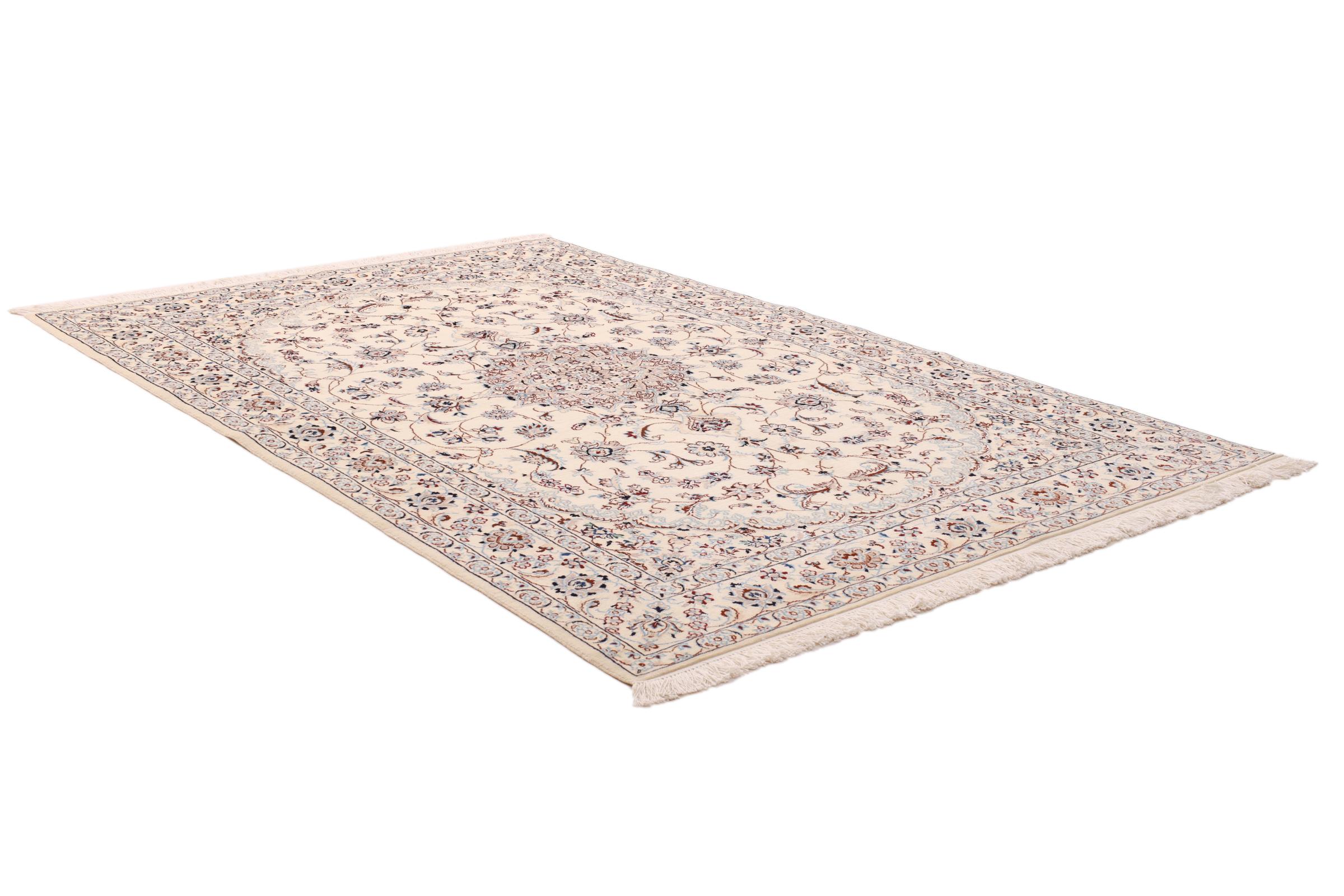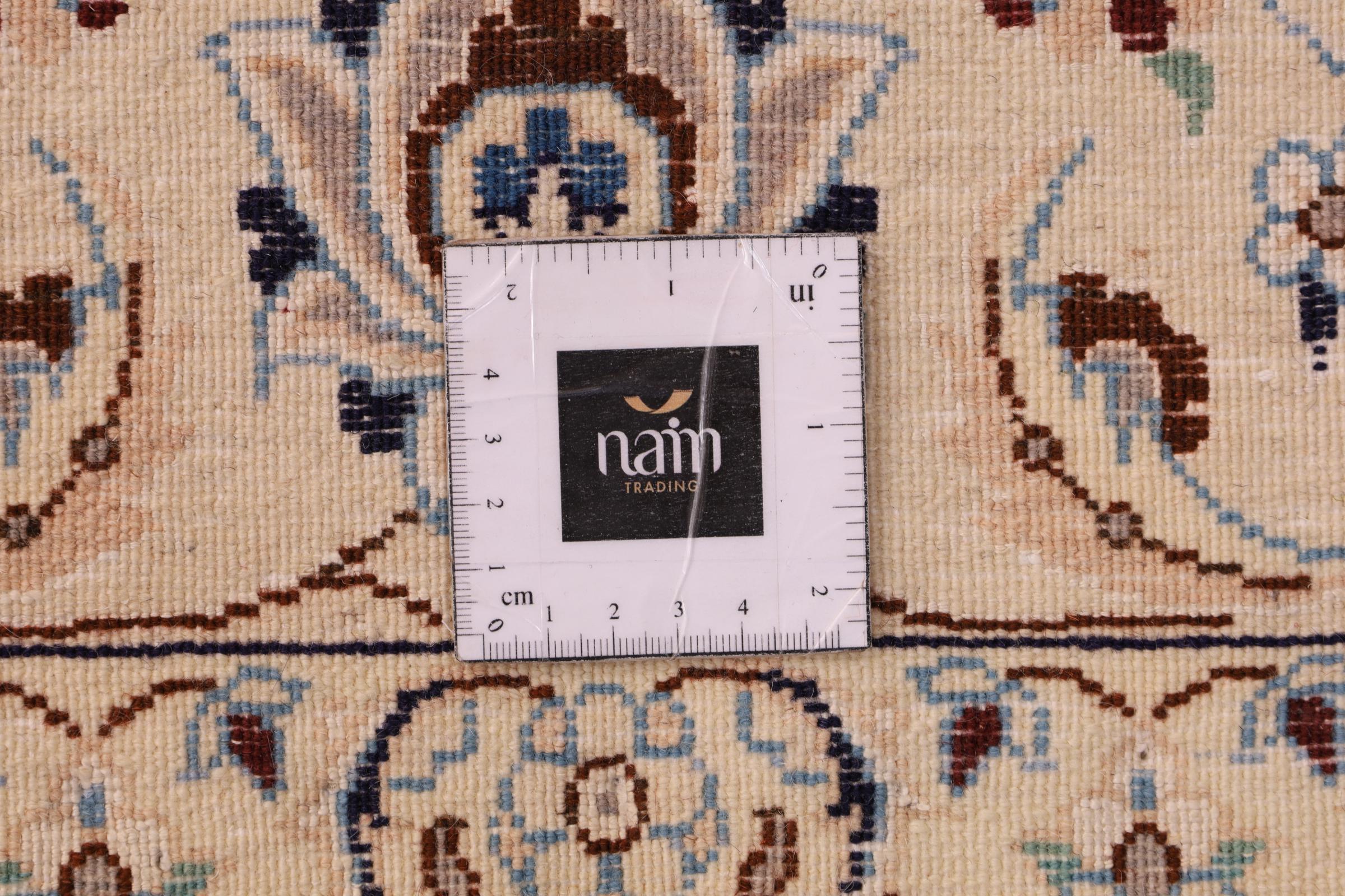 Dette Nain-tæppe er klassificeret 9La. Den fremragende kvalitet, det smukke orientalske design med sine buede mønstre glæder enhver køber. Dette persiske tæppe blev håndknyttet af højkvalitets uld og natursilke i byen Nain, som ligger i den vestlige udkant af Dasht-e-Kavir-ørkenen. 9La Nain er væsentligt finere end en 12La og viser allerede smukke detaljer.