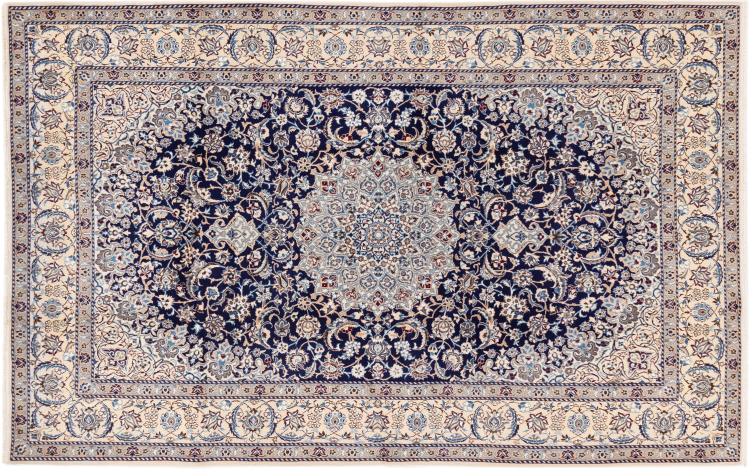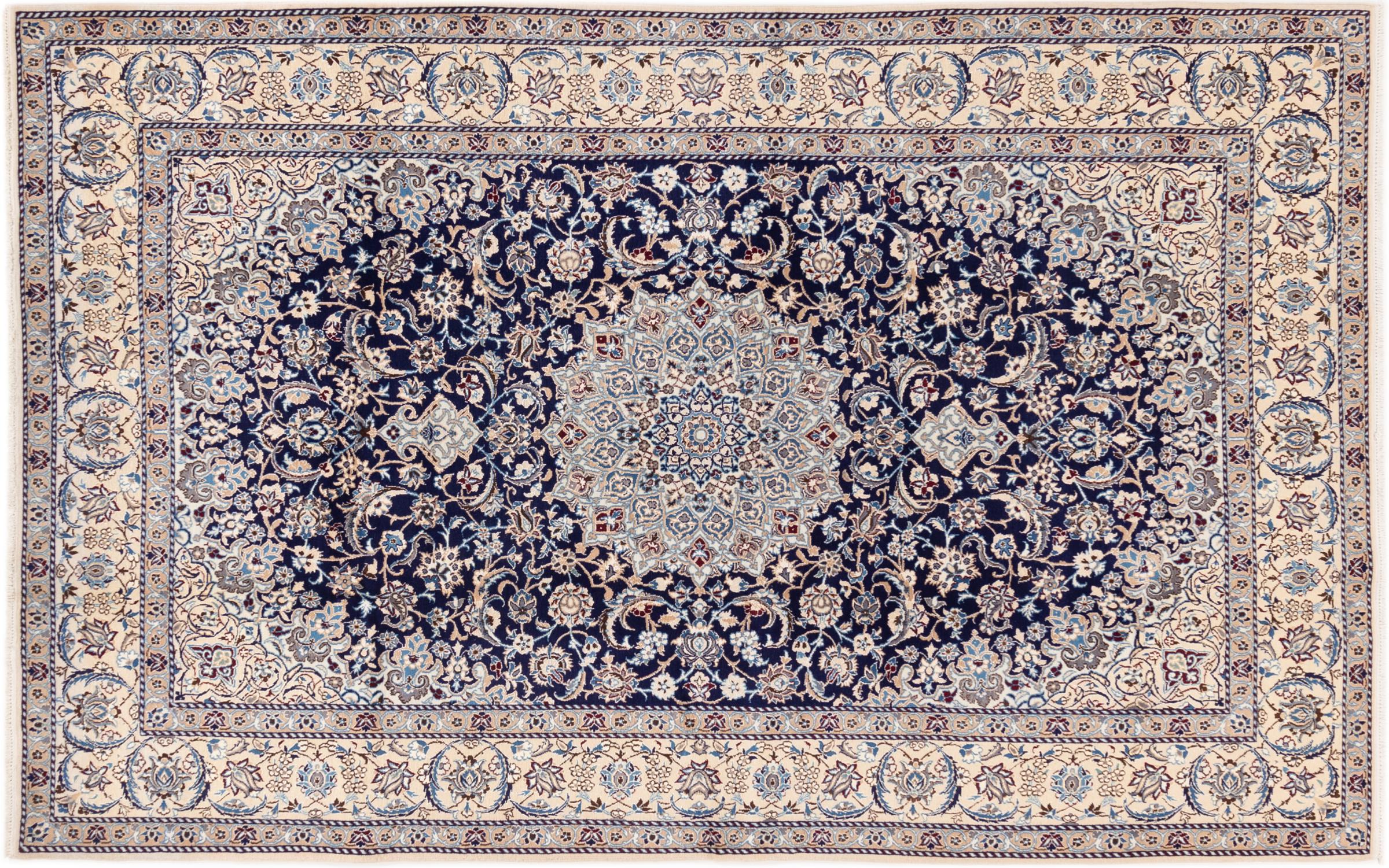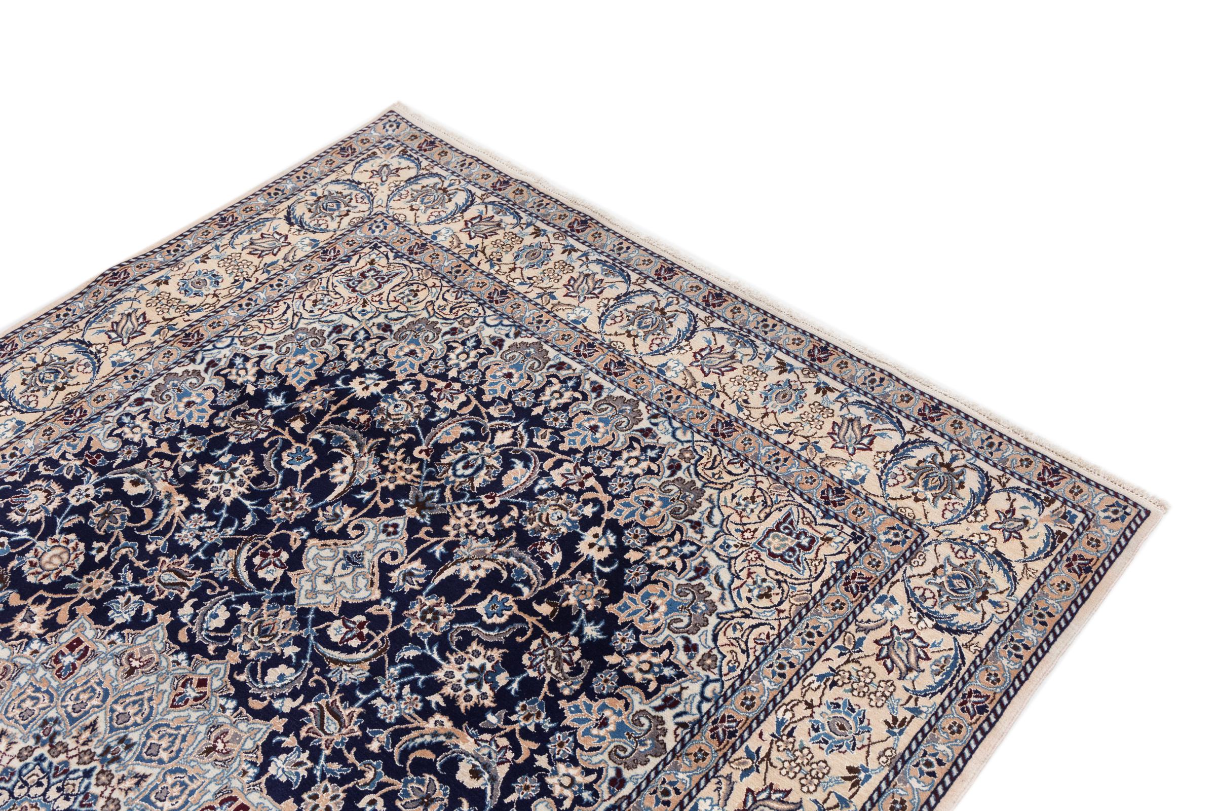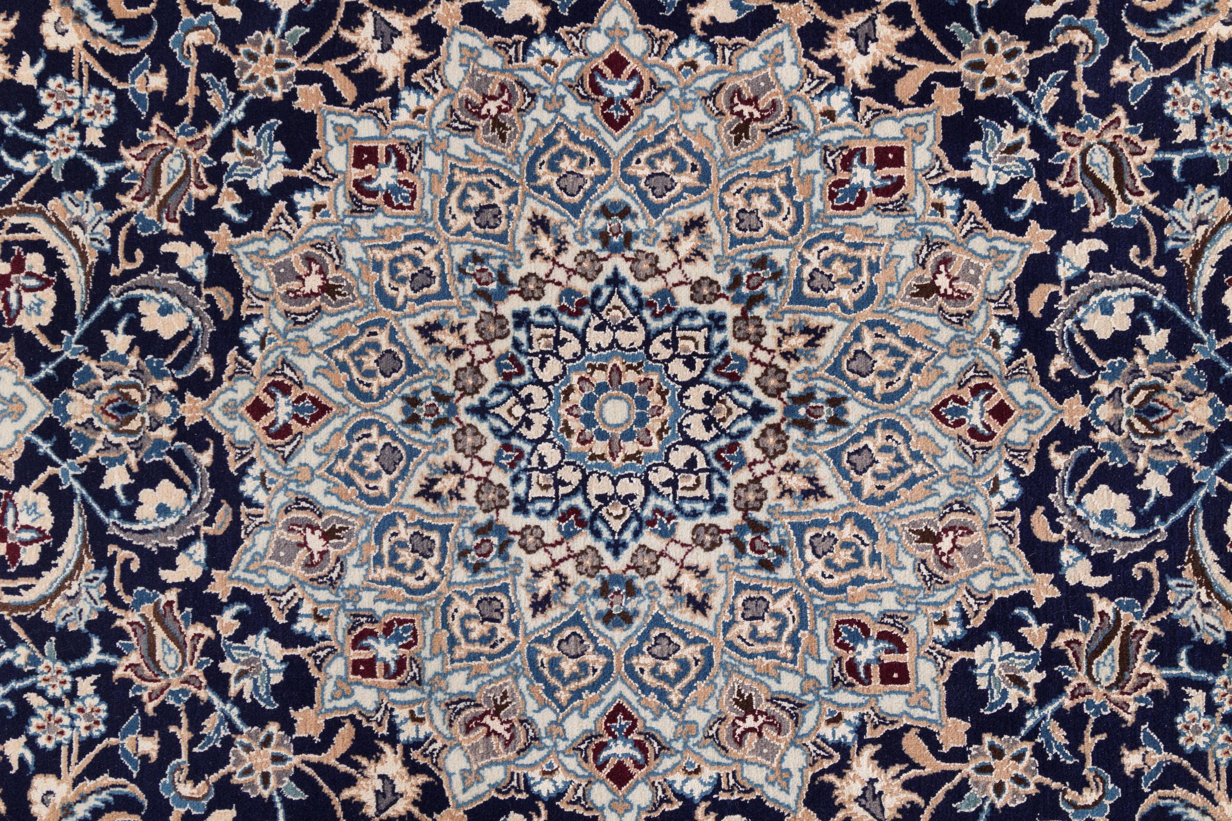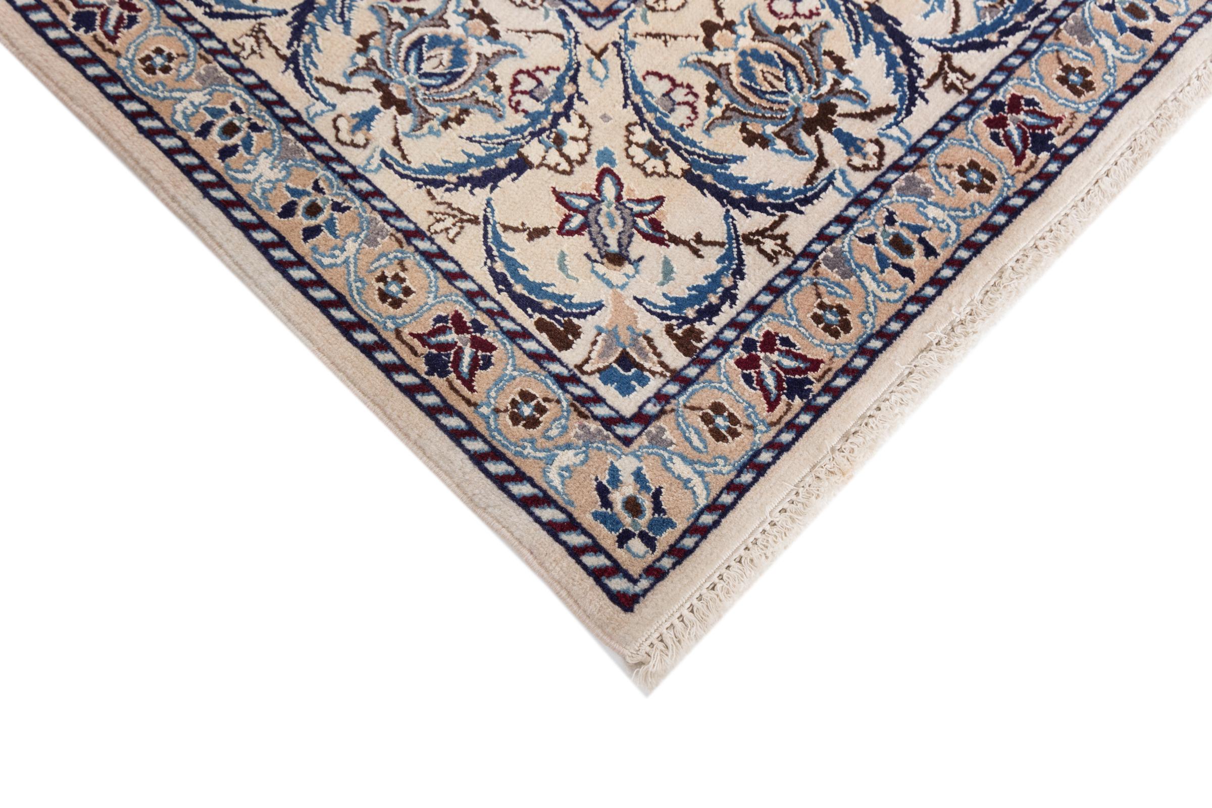 Dette Nain-tæppe er klassificeret 9La. Den fremragende kvalitet, det smukke orientalske design med sine buede mønstre glæder enhver køber. Dette persiske tæppe blev håndknyttet af højkvalitets uld og natursilke i byen Nain, som ligger i den vestlige udkant af Dasht-e-Kavir-ørkenen. 9La Nain er væsentligt finere end en 12La og viser allerede smukke detaljer.