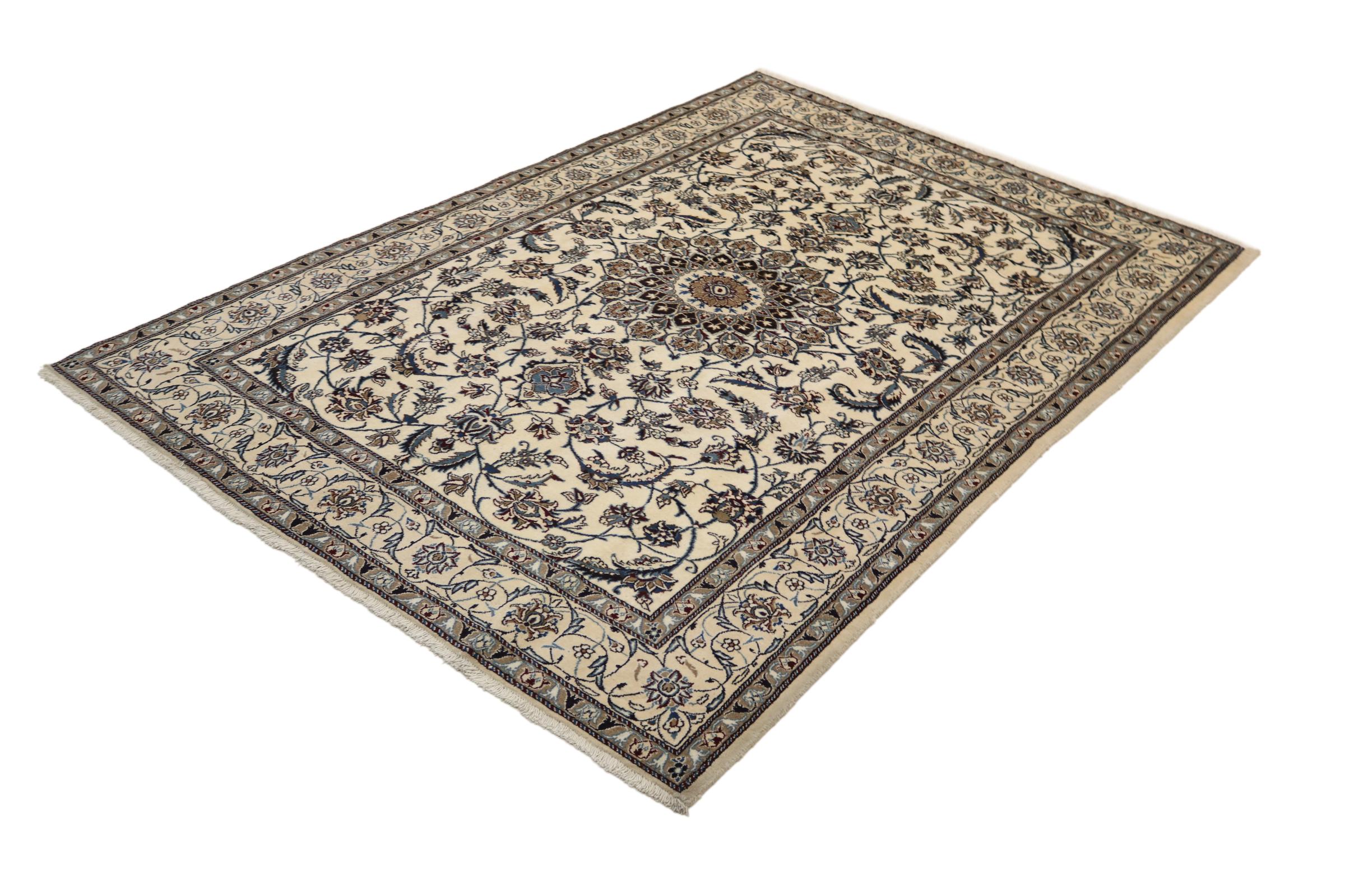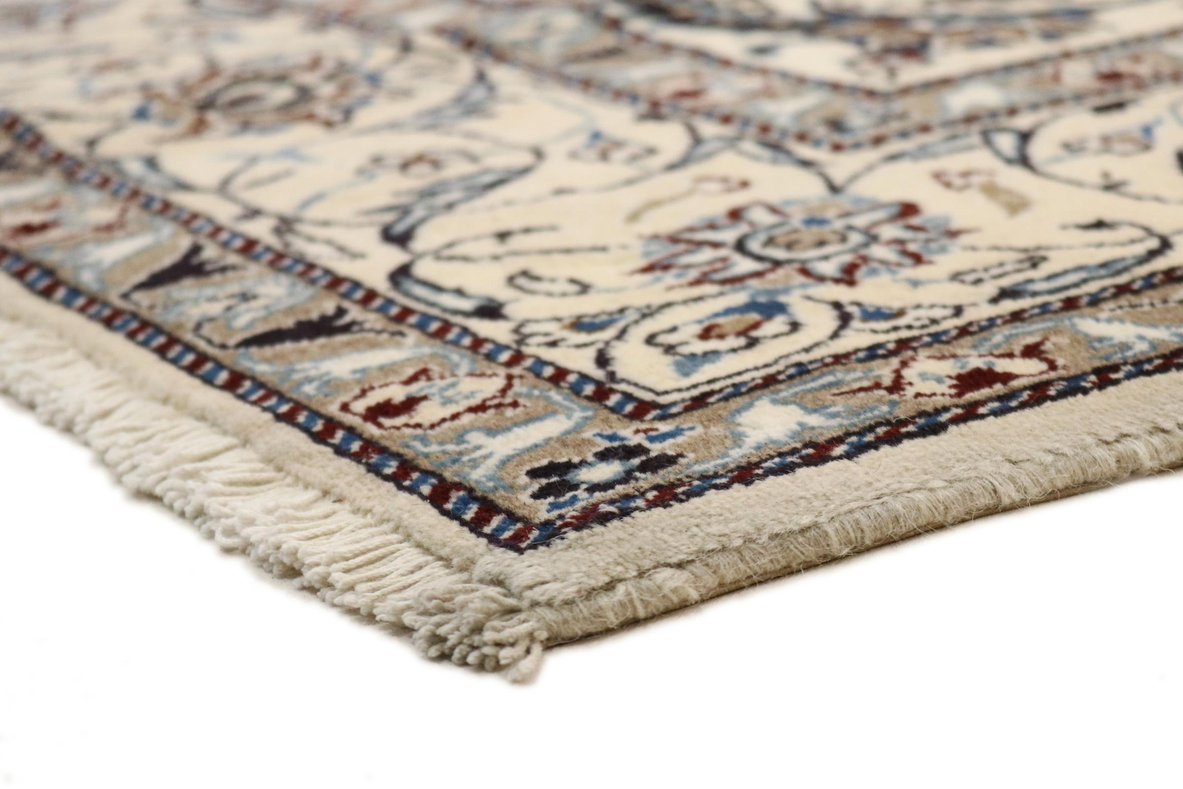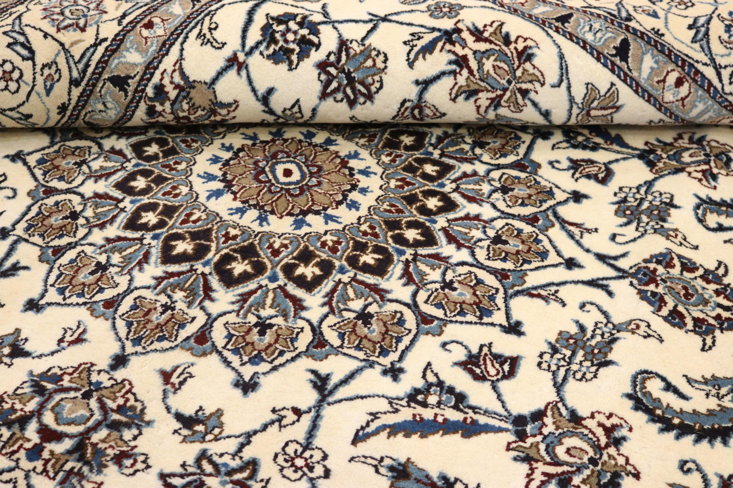Dette Nain tæppe er vurderet til 12La. Det ser elegant og ædelt ud i sit typiske Nain-farveskema. Dette persiske tæppe blev håndknyttet af højkvalitets uld og natursilke i byen Nain, som ligger i den vestlige udkant af Dasht-e-Kavir-ørkenen. Med 12La er den ikke så fint og detaljeret udsmykket som en Nain 9La eller 6La.