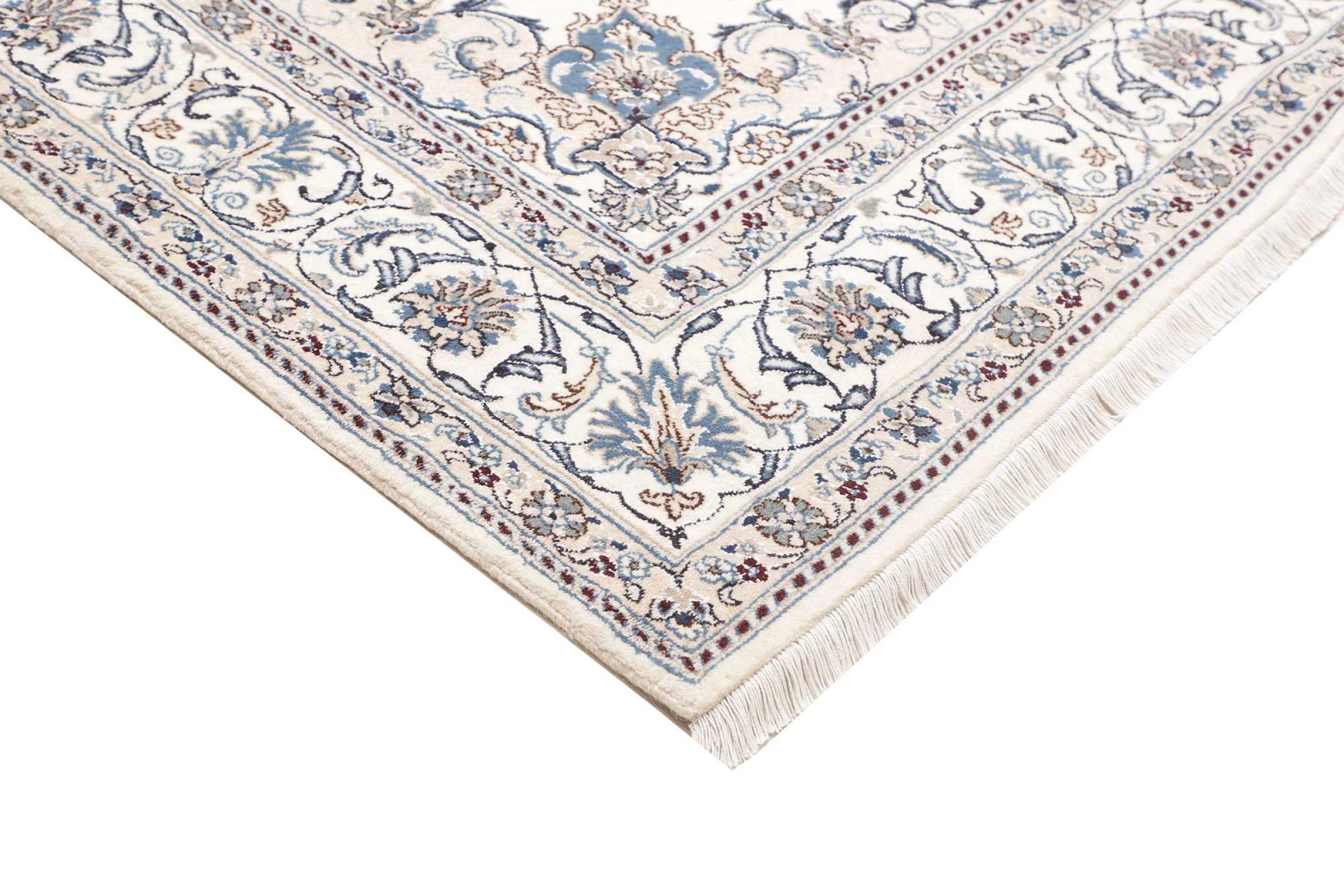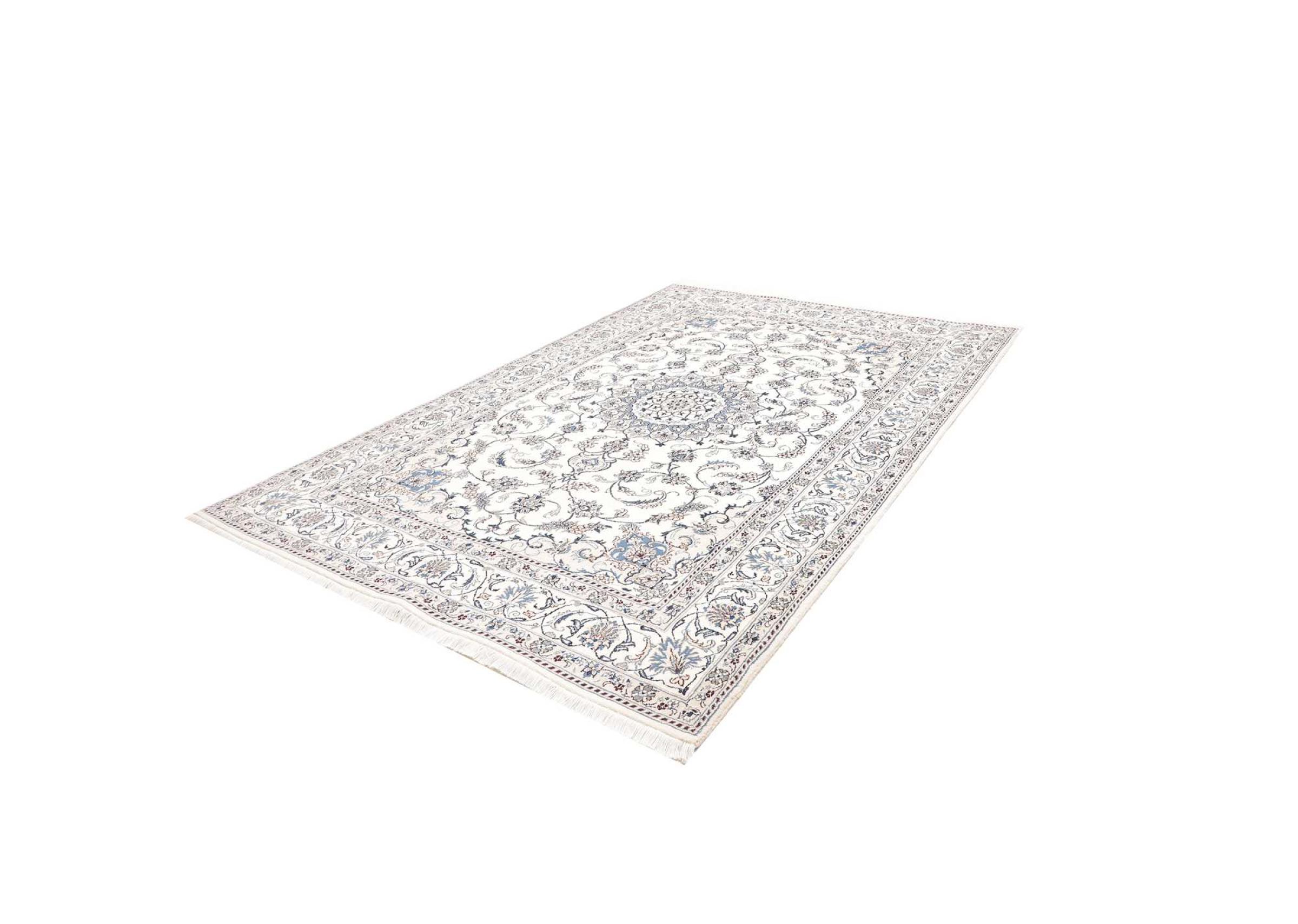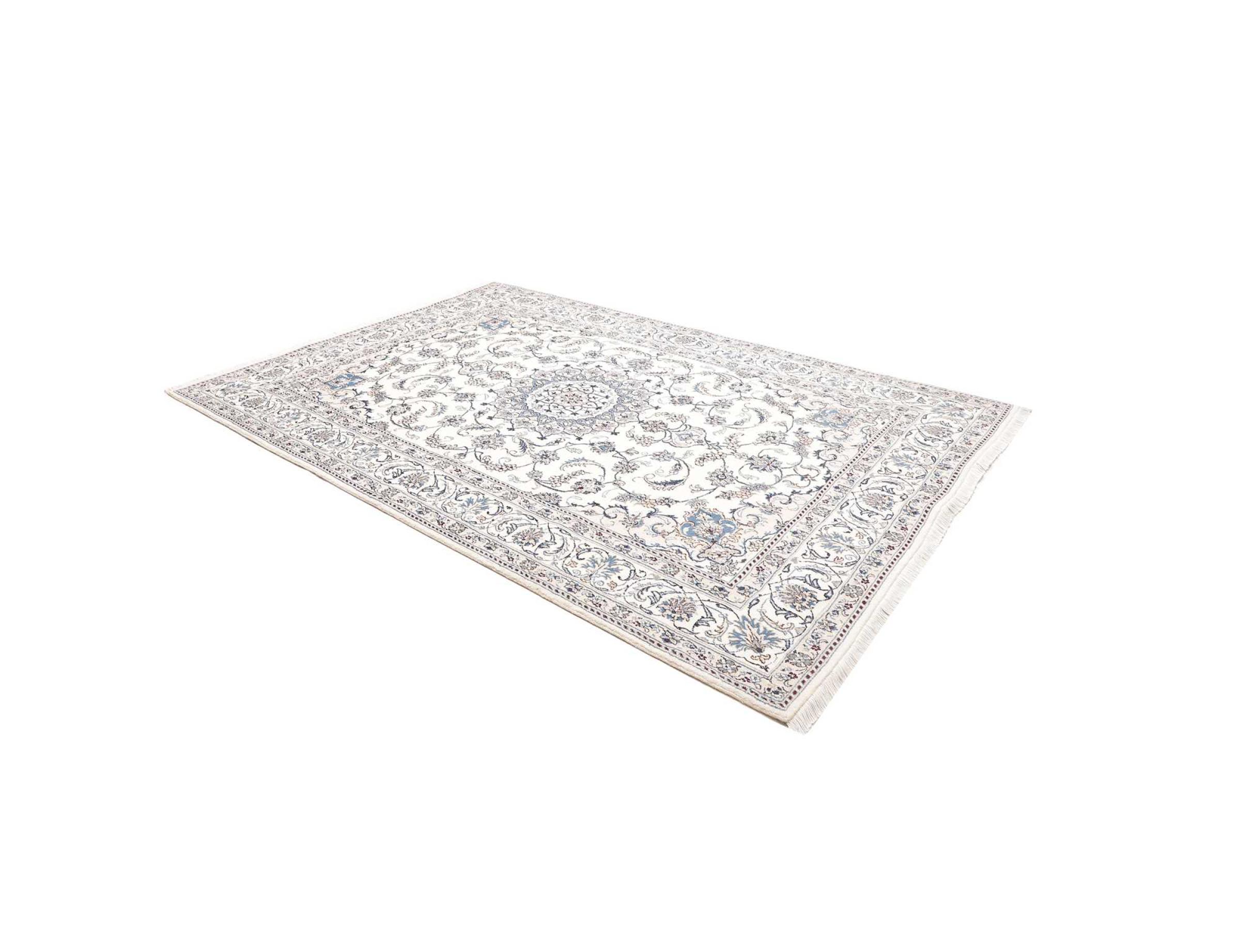 Dette Nain tæppe er vurderet til 12La. Det ser elegant og ædelt ud i sit typiske Nain-farveskema. Dette persiske tæppe blev håndknyttet af højkvalitets uld og natursilke i byen Nain, som ligger i den vestlige udkant af Dasht-e-Kavir-ørkenen. Med 12La er den ikke så fint og detaljeret udsmykket som en Nain 9La eller 6La.