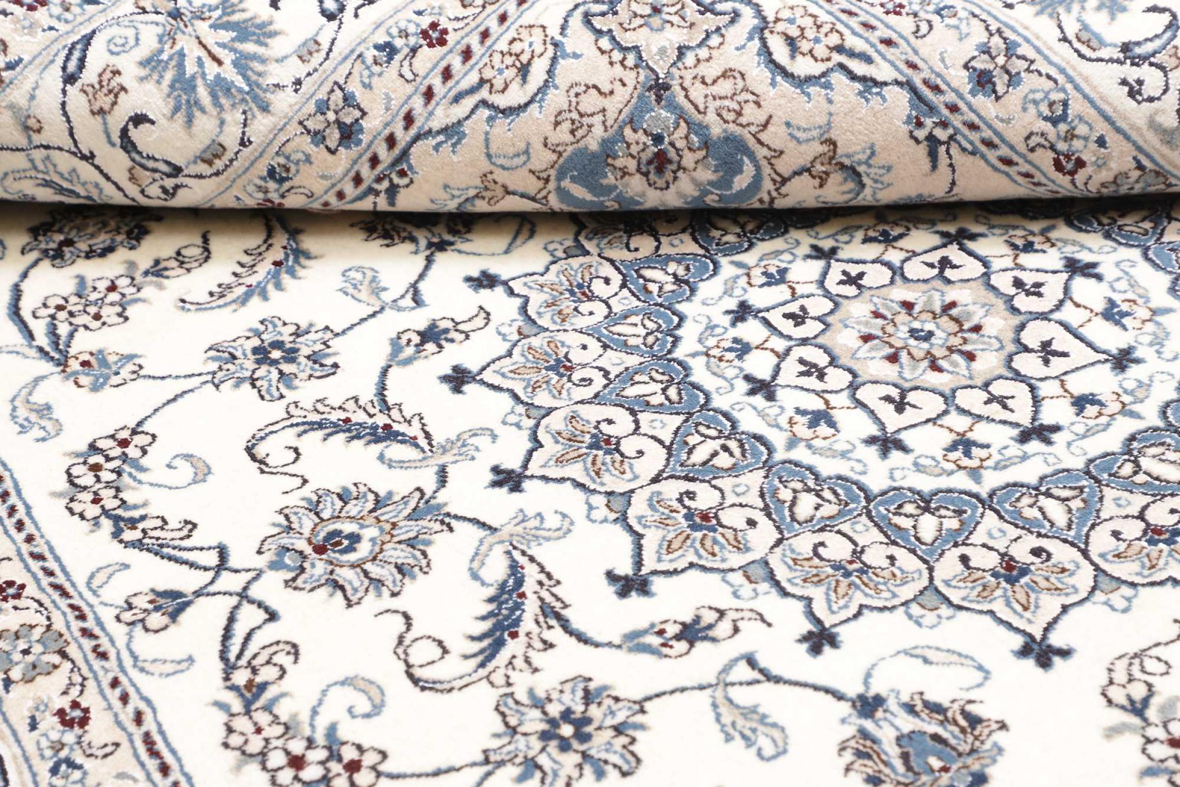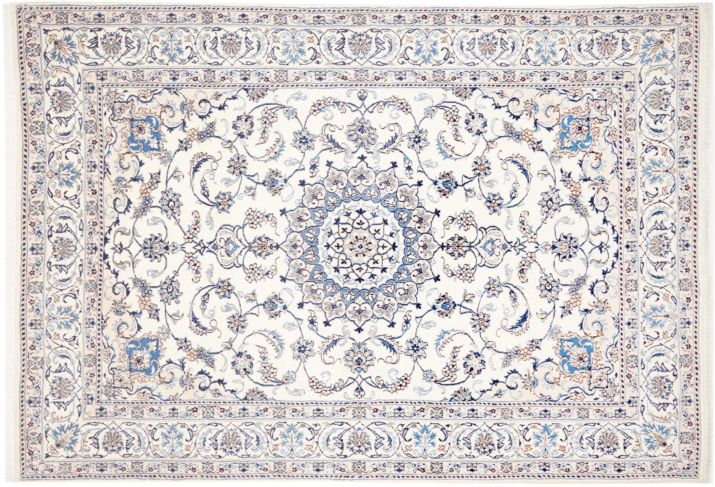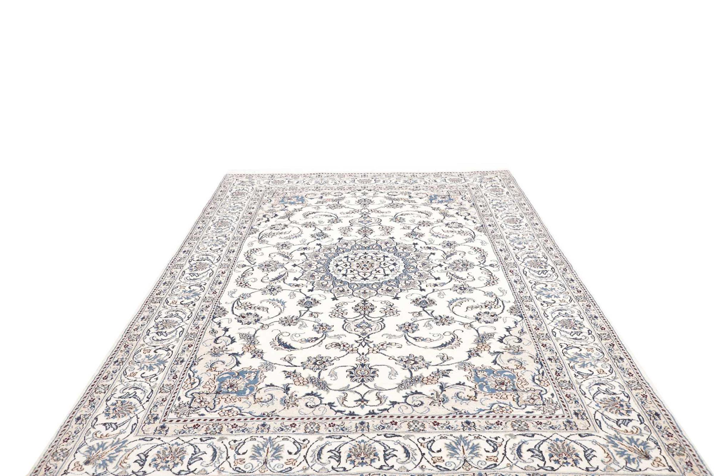 Dette Nain tæppe er vurderet til 12La. Det ser elegant og ædelt ud i sit typiske Nain-farveskema. Dette persiske tæppe blev håndknyttet af højkvalitets uld og natursilke i byen Nain, som ligger i den vestlige udkant af Dasht-e-Kavir-ørkenen. Med 12La er den ikke så fint og detaljeret udsmykket som en Nain 9La eller 6La.