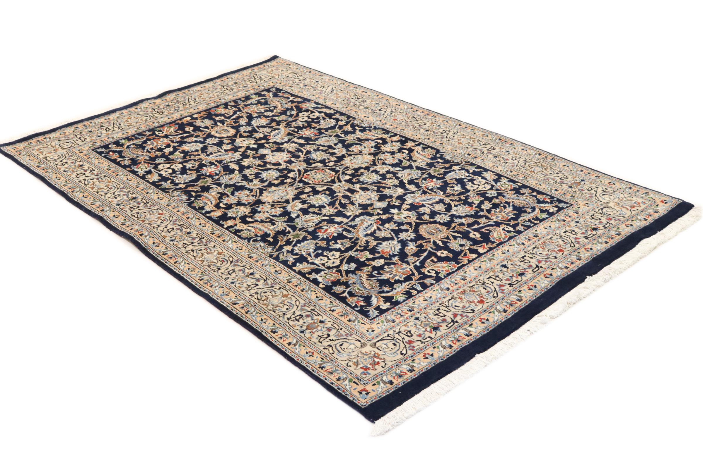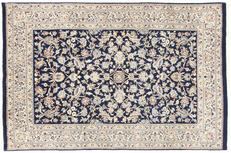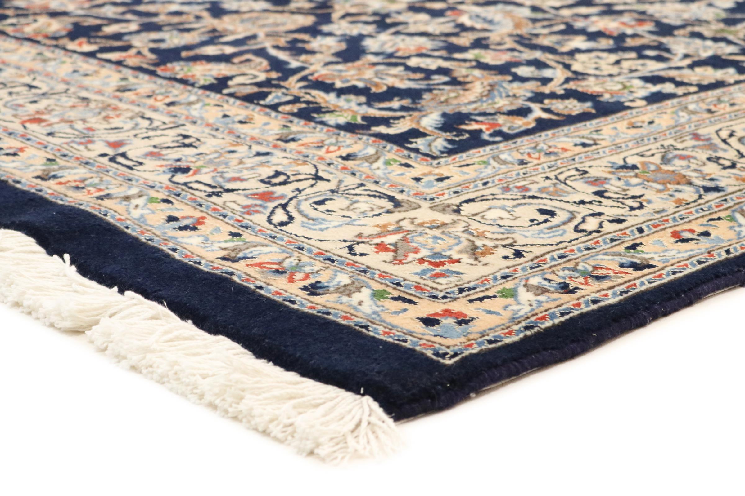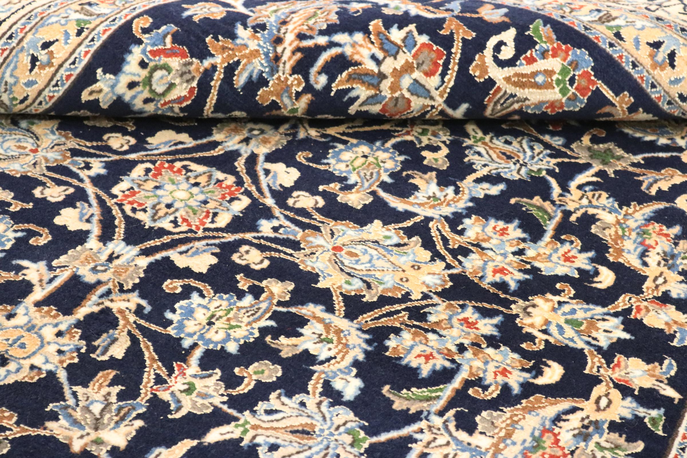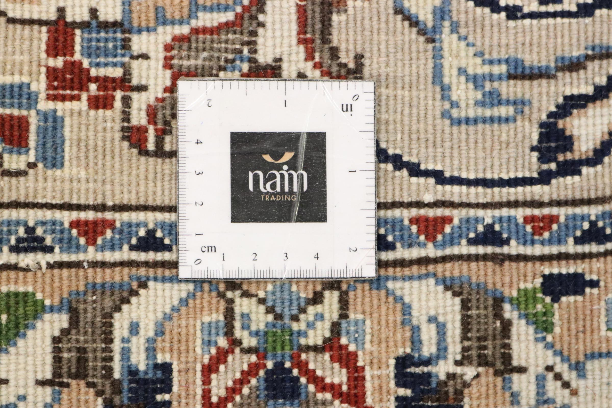 Dette Nain tæppe er vurderet til 12La. Det ser elegant og ædelt ud i sit typiske Nain-farveskema. Dette persiske tæppe blev håndknyttet af højkvalitets uld og natursilke i byen Nain, som ligger i den vestlige udkant af Dasht-e-Kavir-ørkenen. Med 12La er den ikke så fint og detaljeret udsmykket som en Nain 9La eller 6La.