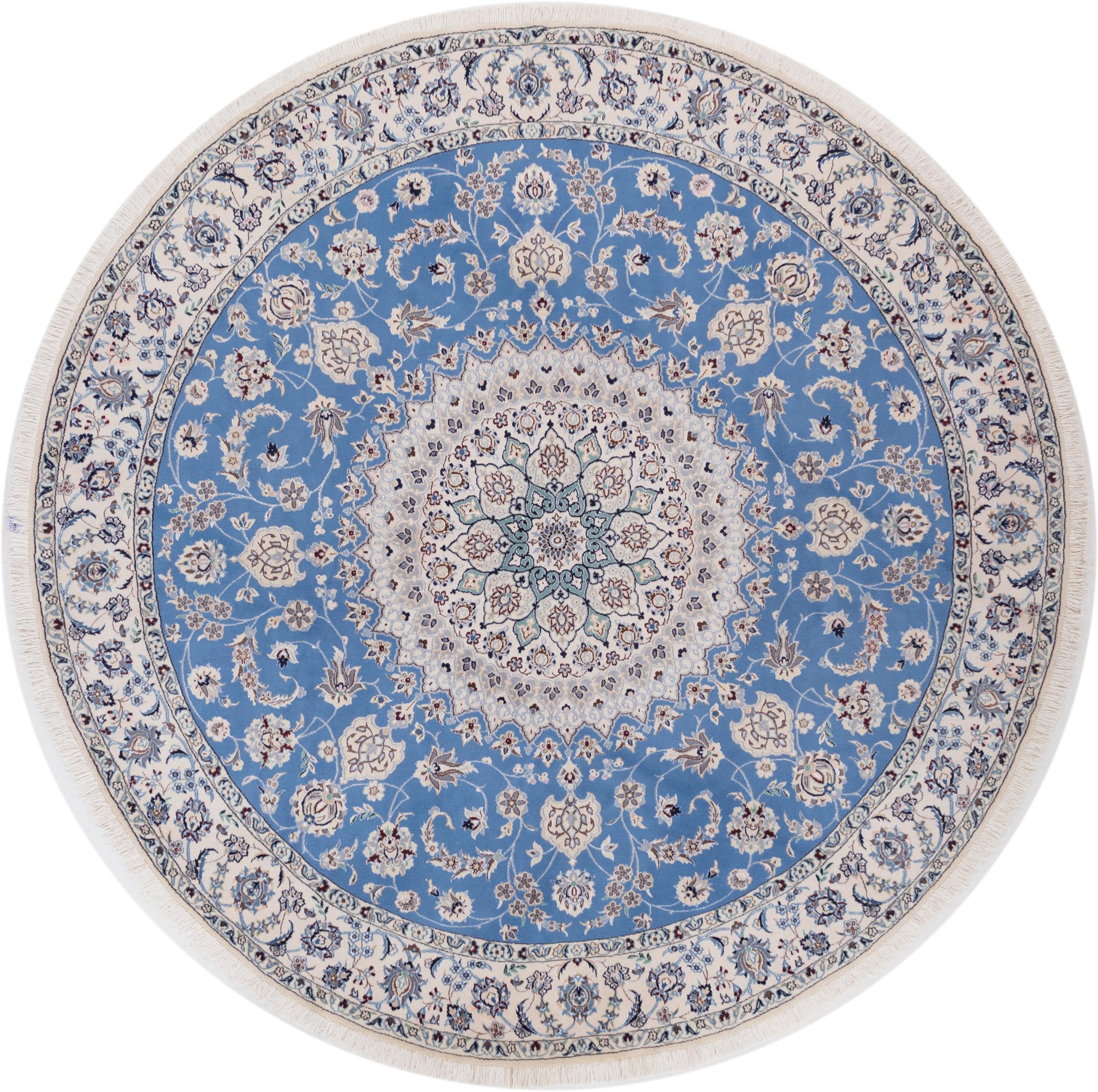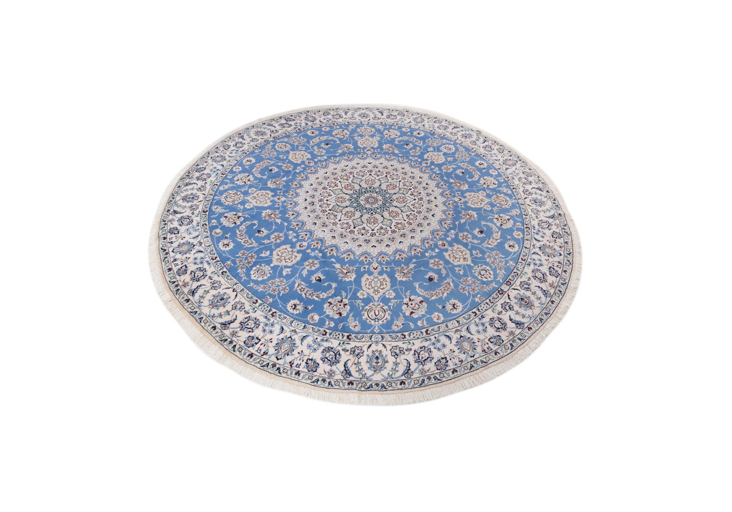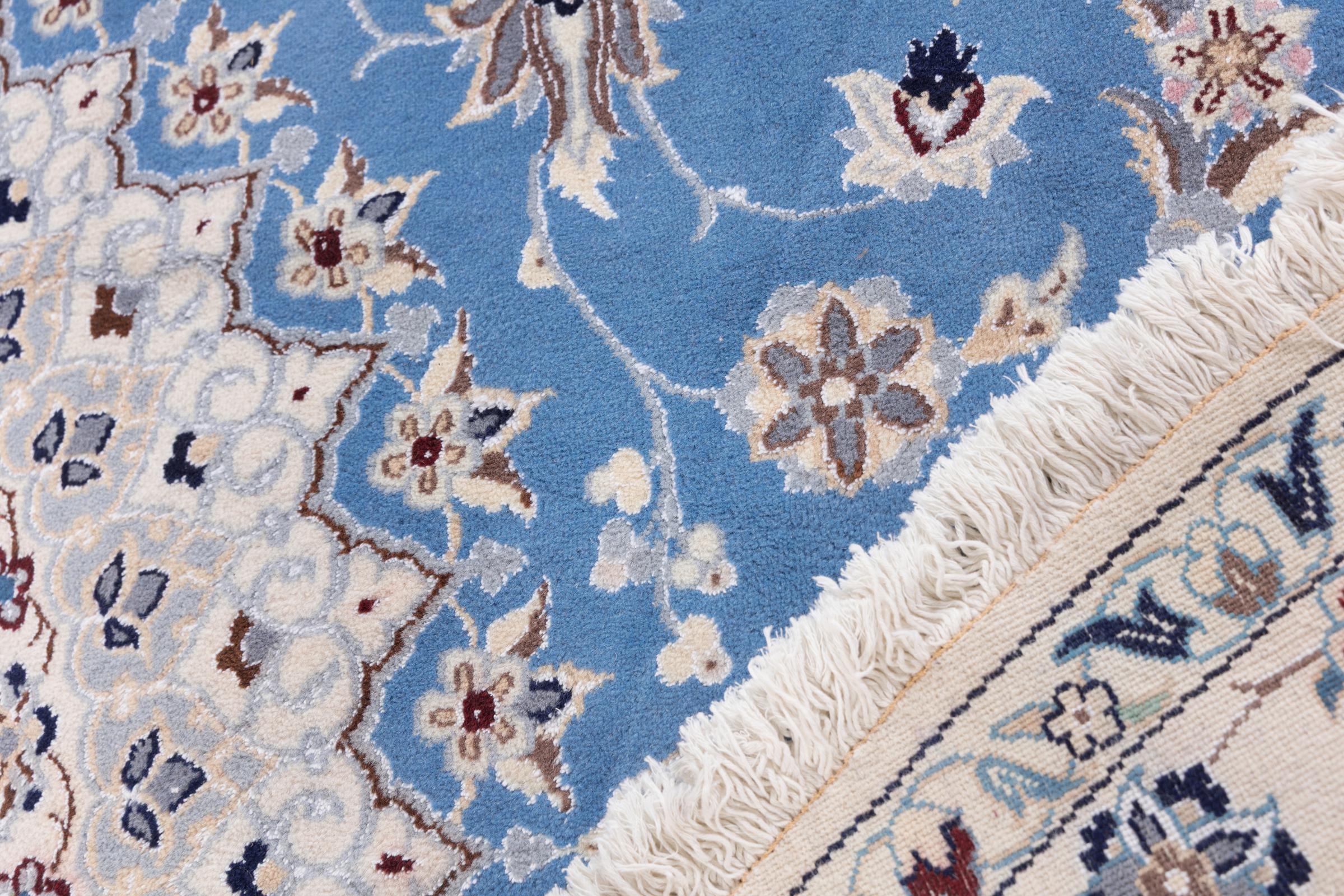 Dette Nain-tæppe er klassificeret 9La. Den fremragende kvalitet, det smukke orientalske design med sine buede mønstre glæder enhver køber. Dette persiske tæppe blev håndknyttet af højkvalitets uld og natursilke i byen Nain, som ligger i den vestlige udkant af Dasht-e-Kavir-ørkenen. 9La Nain er væsentligt finere end en 12La og viser allerede smukke detaljer.
