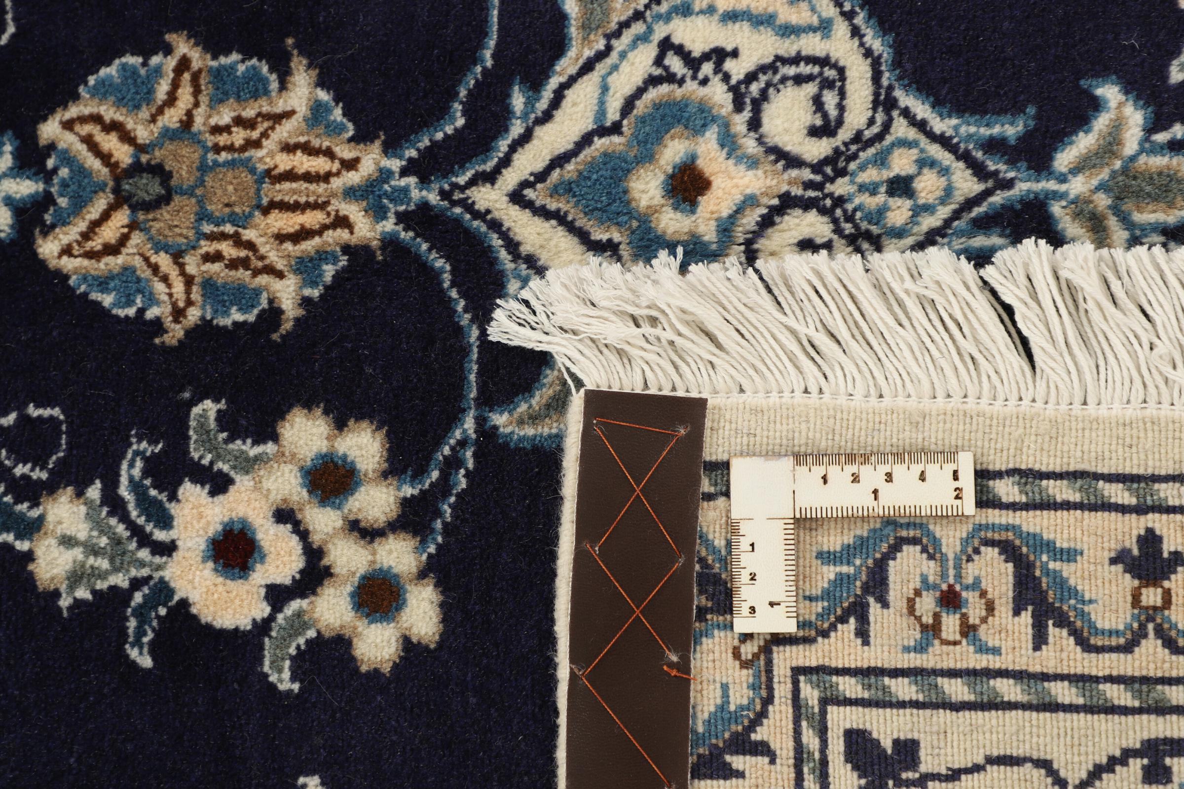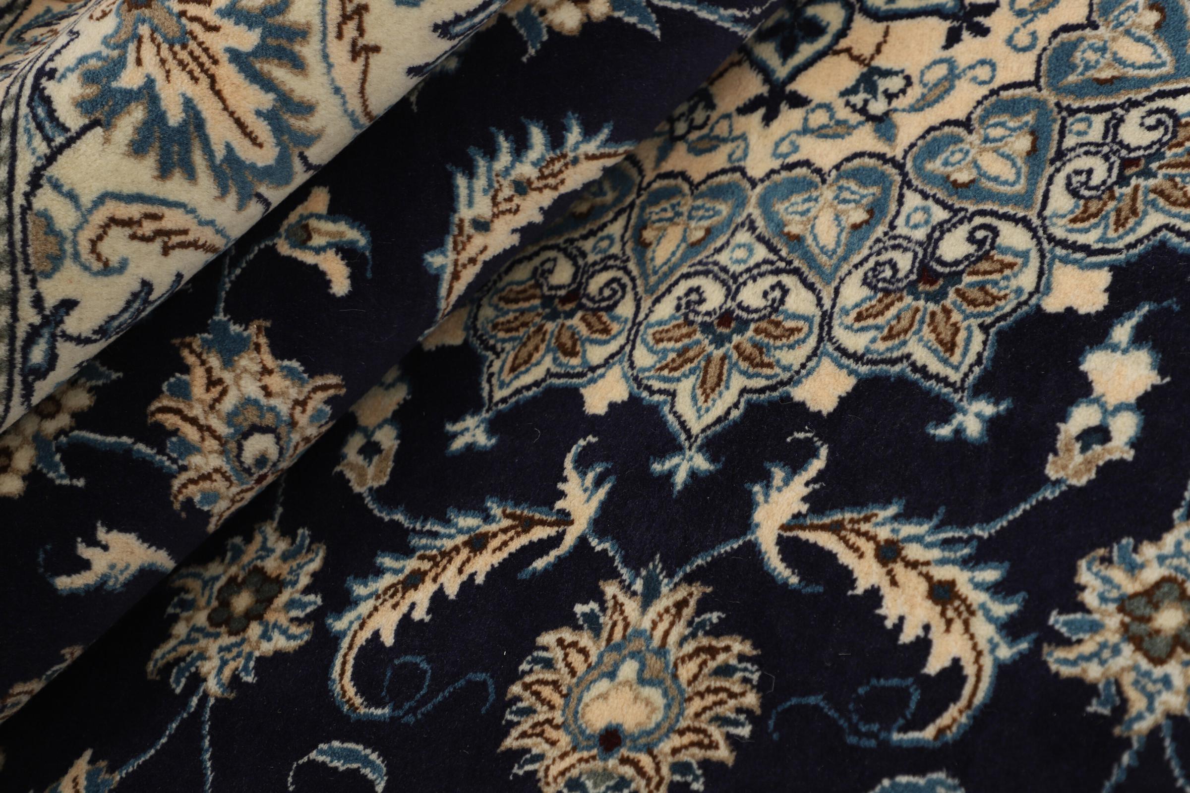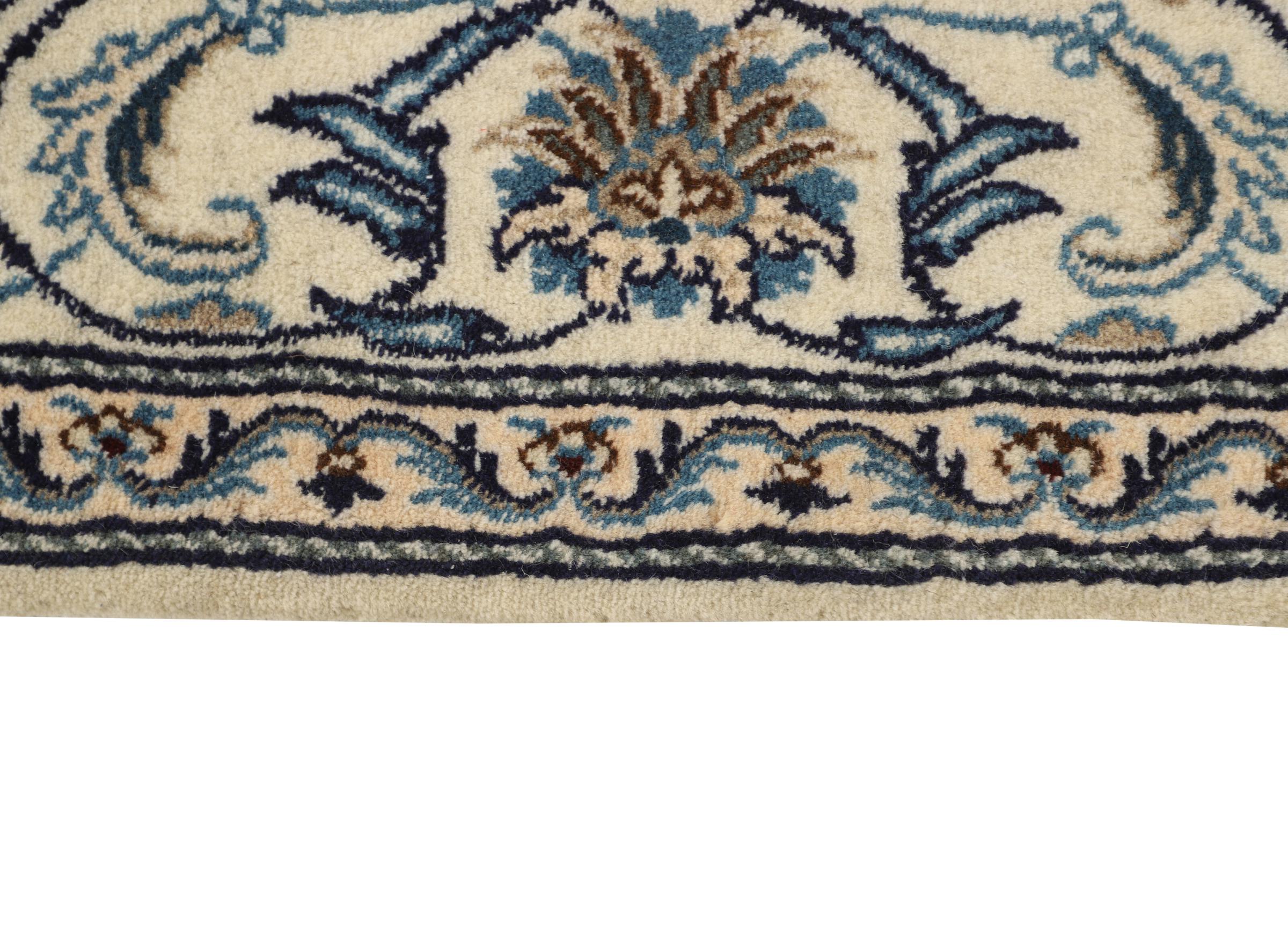 Dette Nain tæppe er vurderet til 12La. Det ser elegant og ædelt ud i sit typiske Nain-farveskema. Dette persiske tæppe blev håndknyttet af højkvalitets uld og natursilke i byen Nain, som ligger i den vestlige udkant af Dasht-e-Kavir-ørkenen. Med 12La er den ikke så fint og detaljeret udsmykket som en Nain 9La eller 6La.