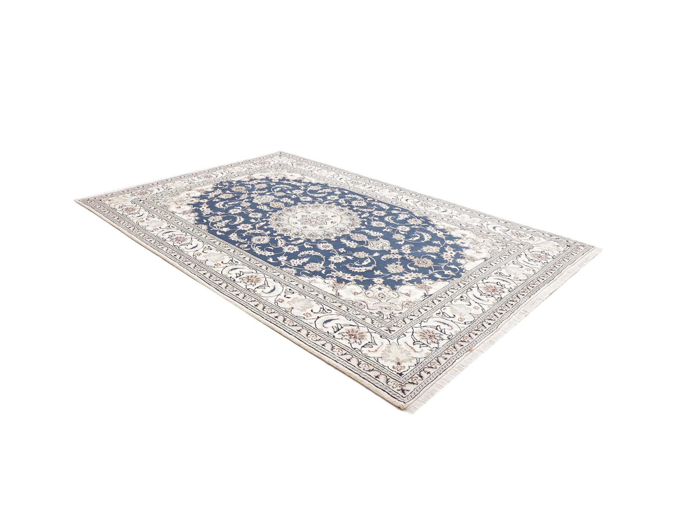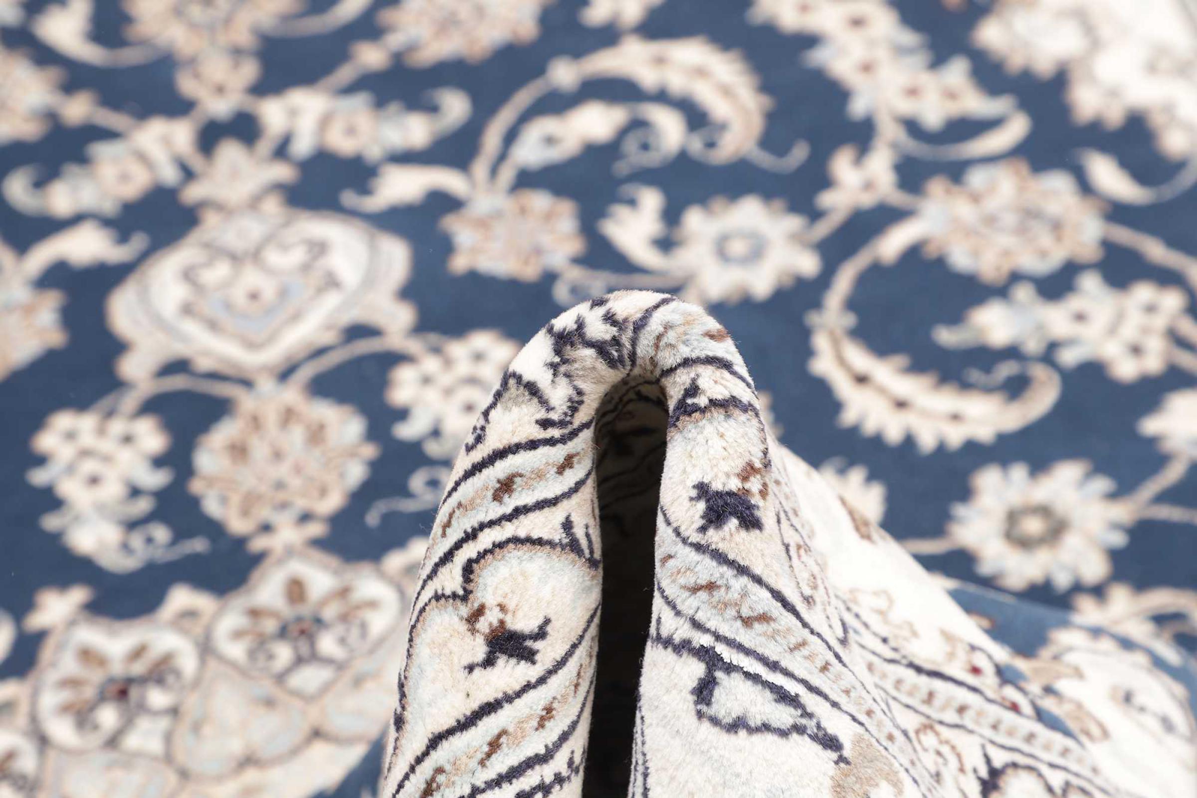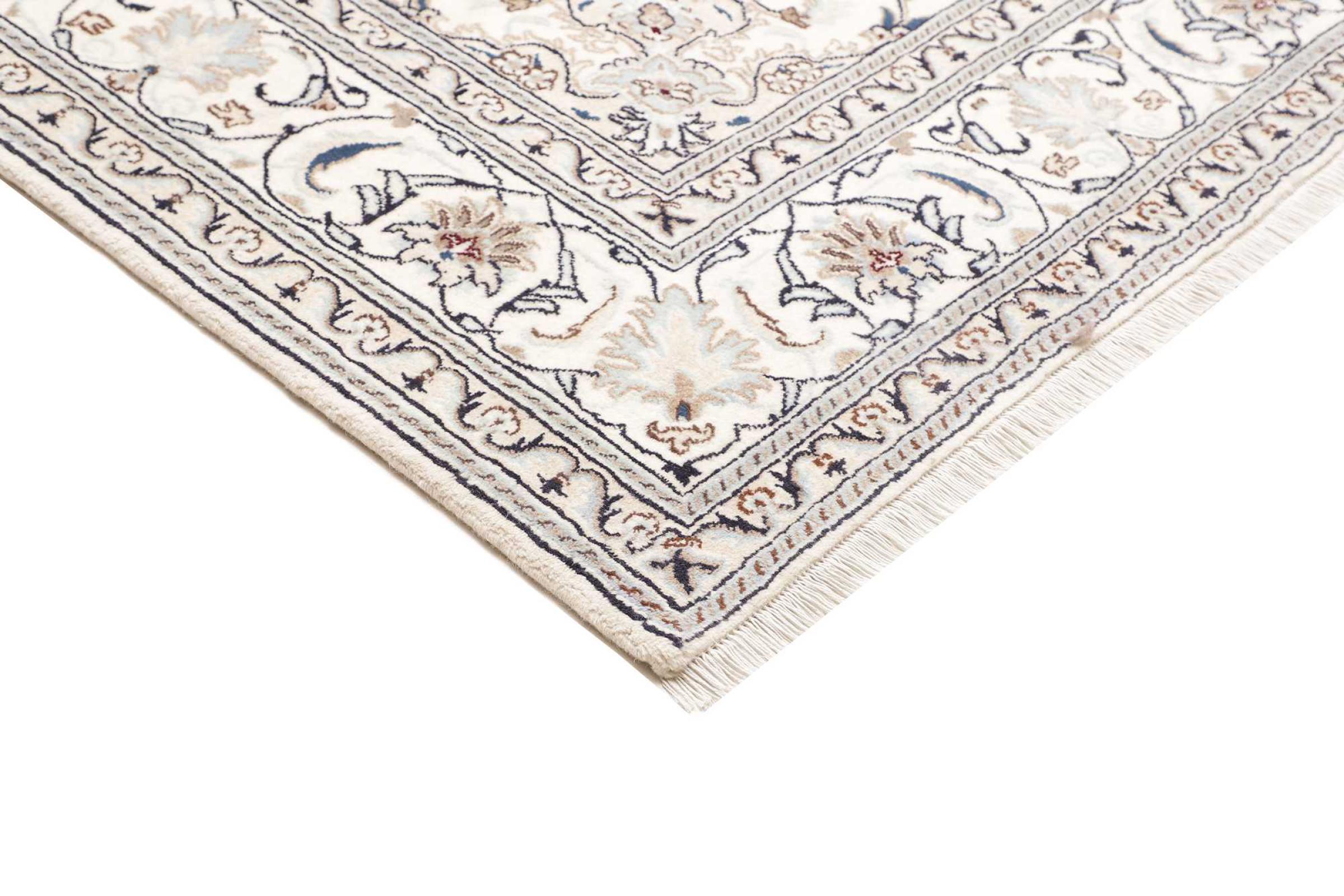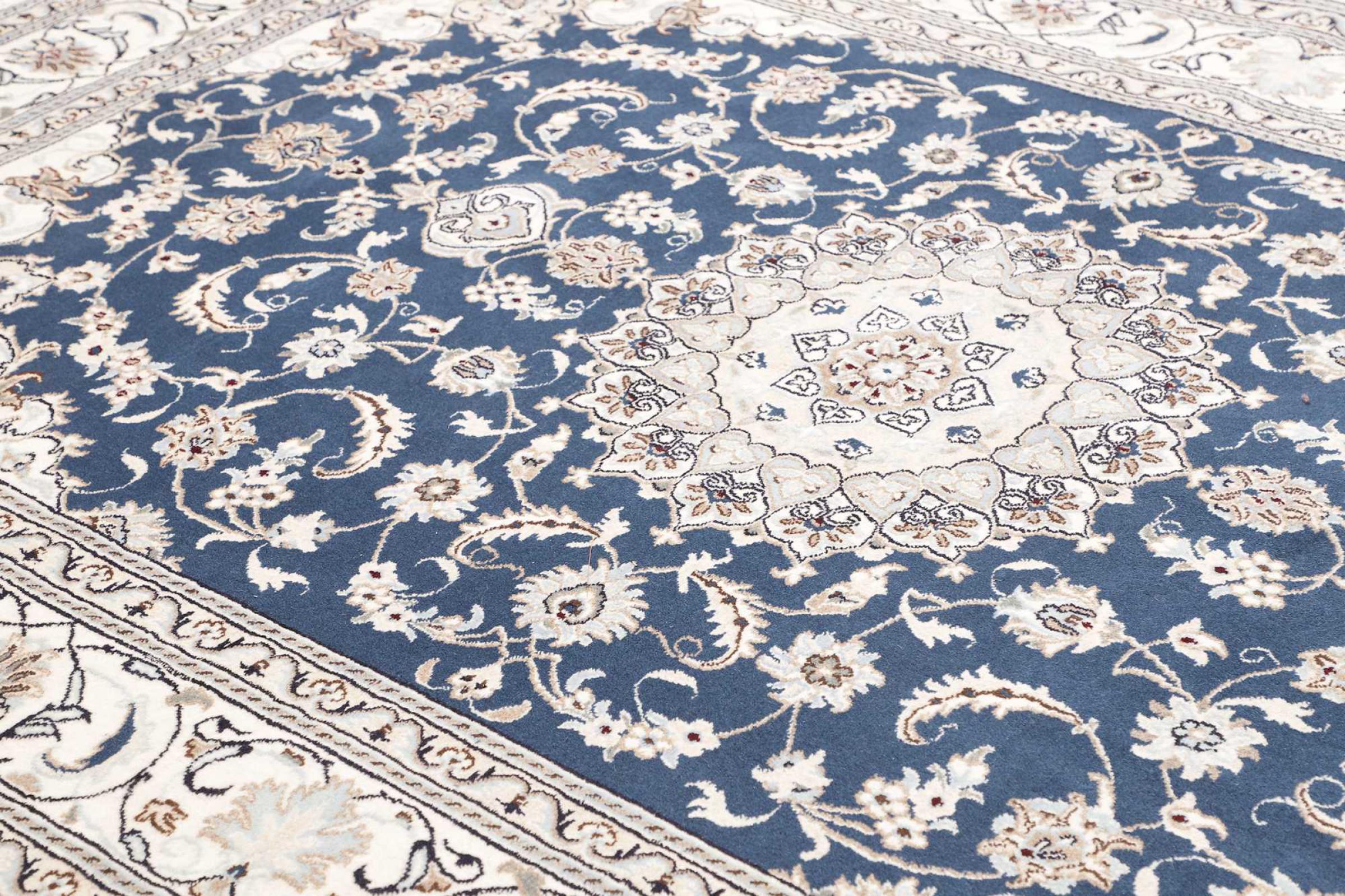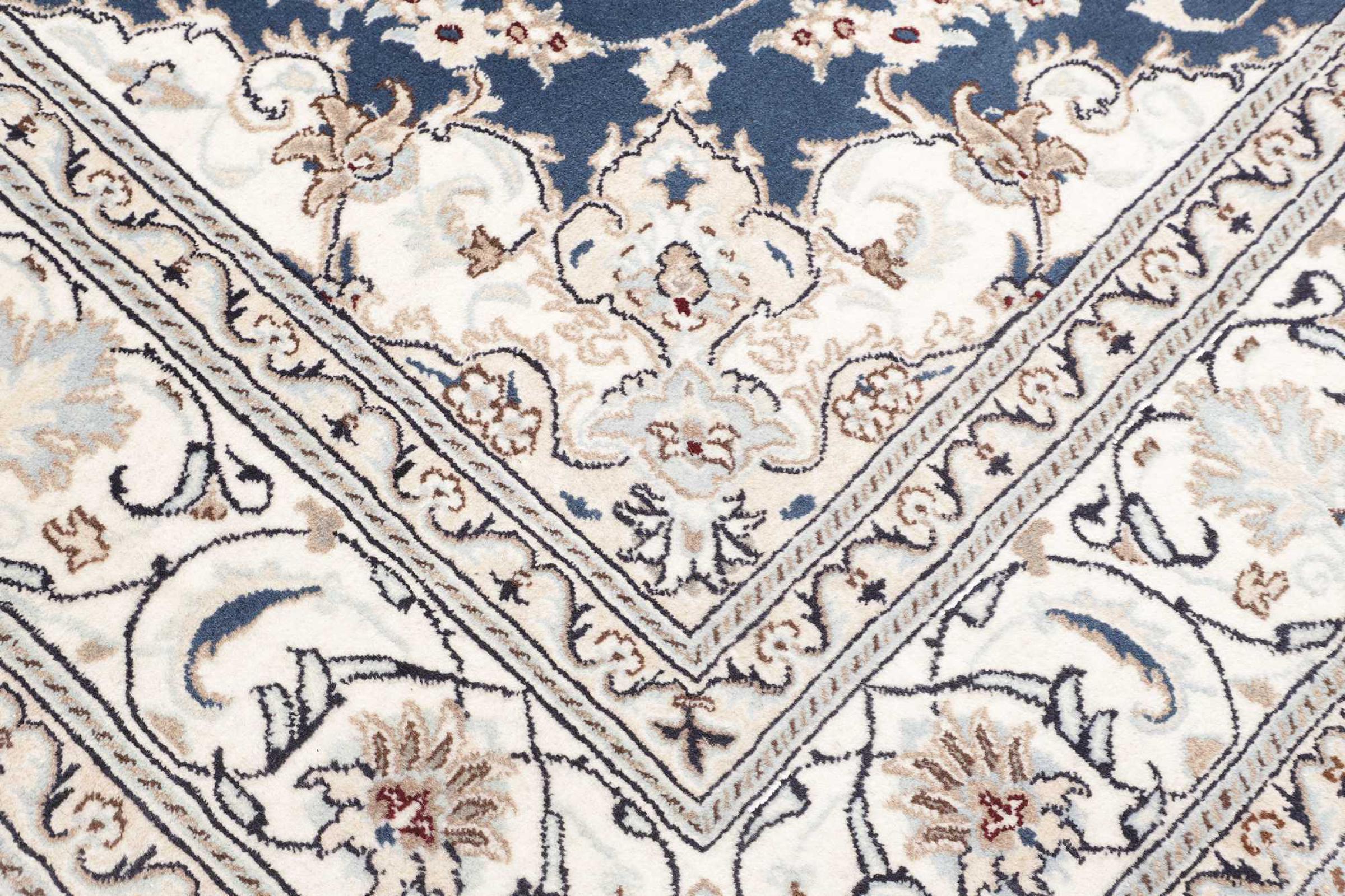 Dette Nain tæppe er vurderet til 12La. Det ser elegant og ædelt ud i sit typiske Nain-farveskema. Dette persiske tæppe blev håndknyttet af højkvalitets uld og natursilke i byen Nain, som ligger i den vestlige udkant af Dasht-e-Kavir-ørkenen. Med 12La er den ikke så fint og detaljeret udsmykket som en Nain 9La eller 6La.