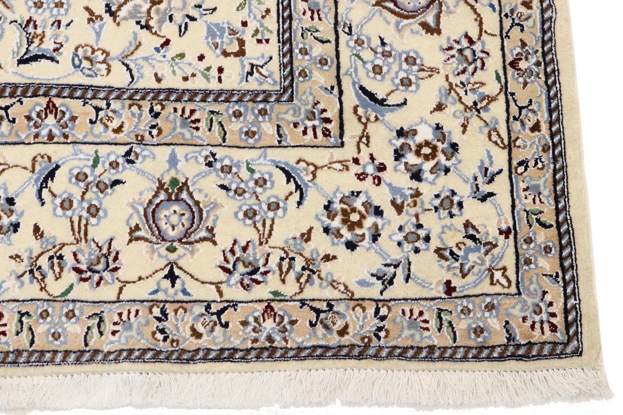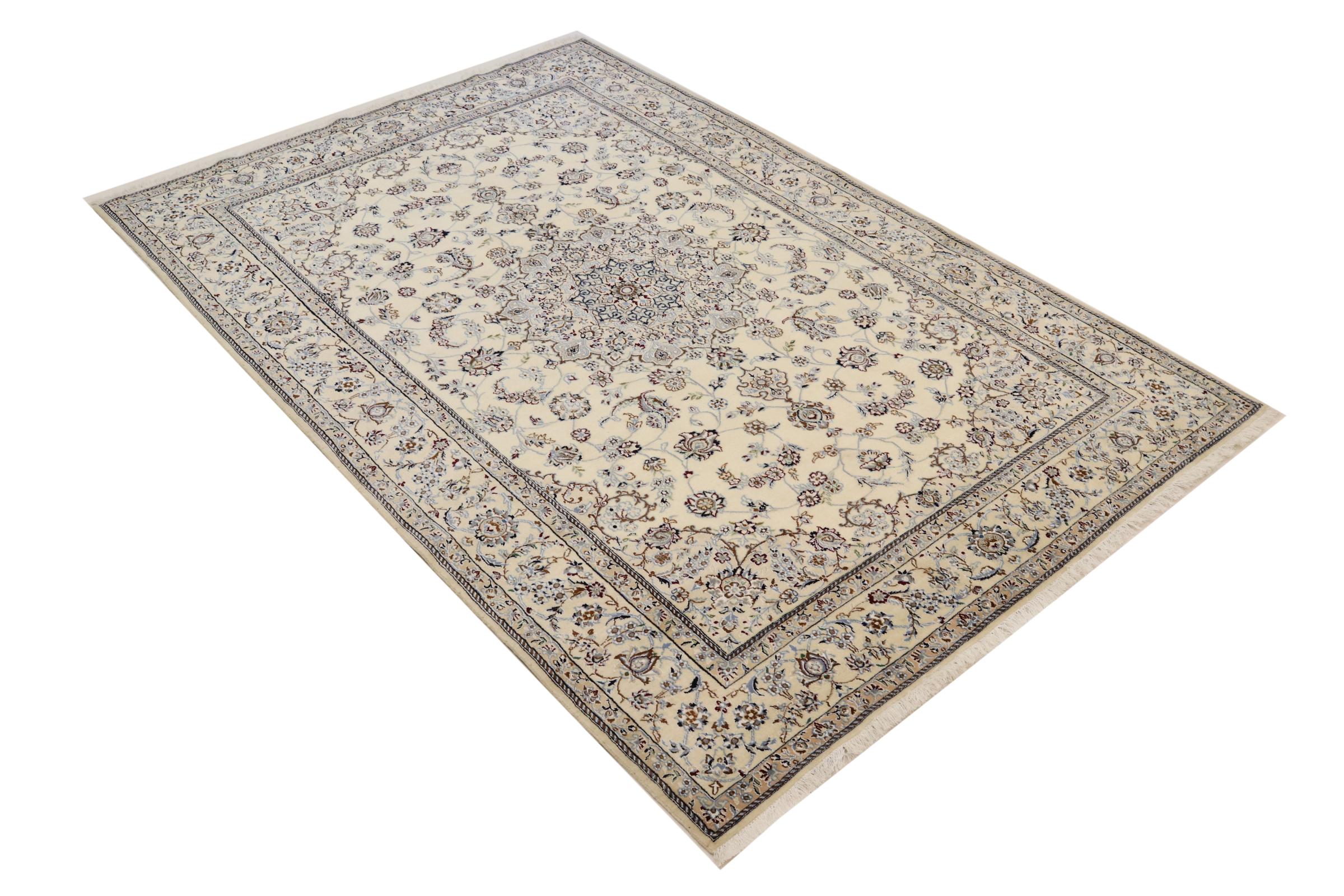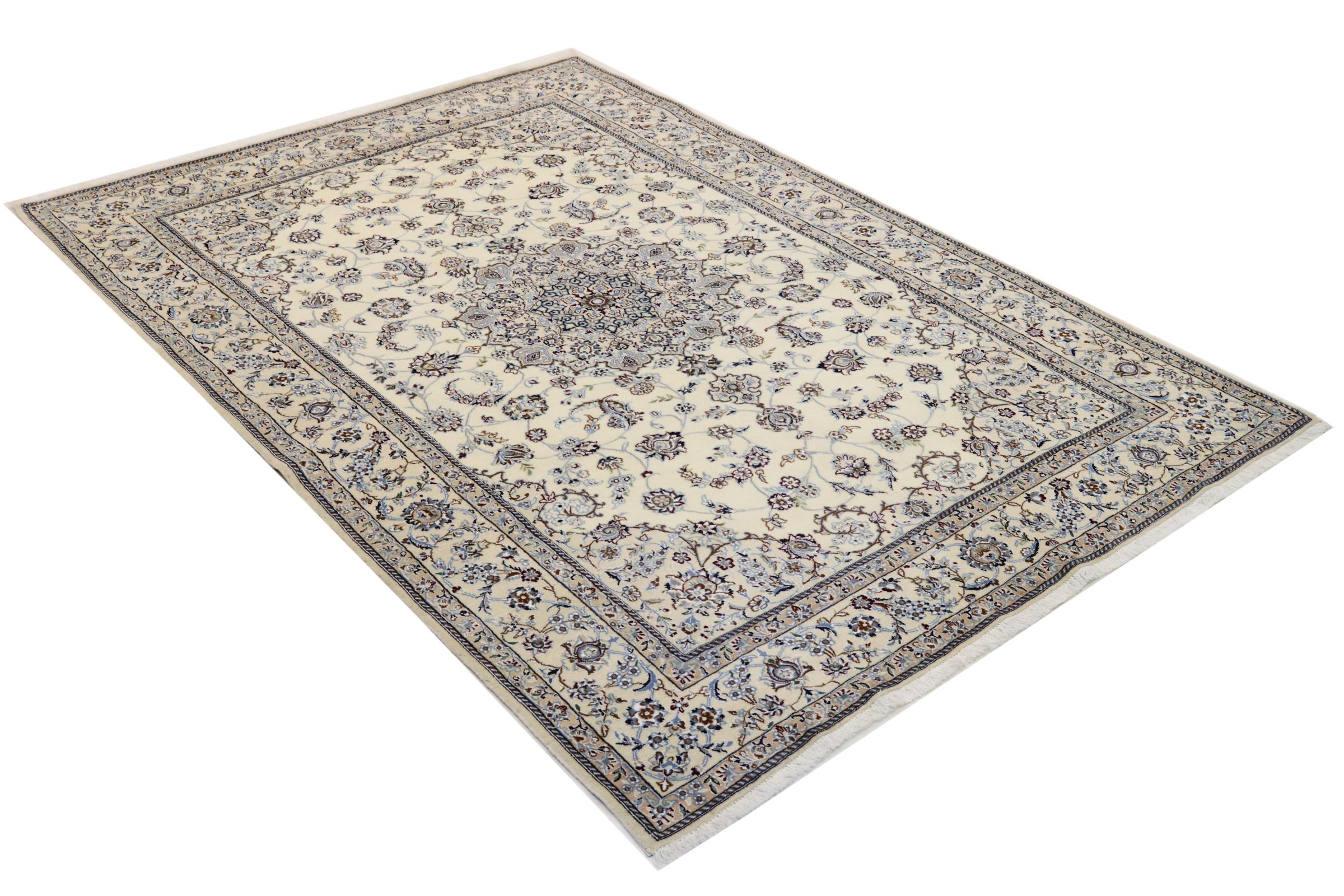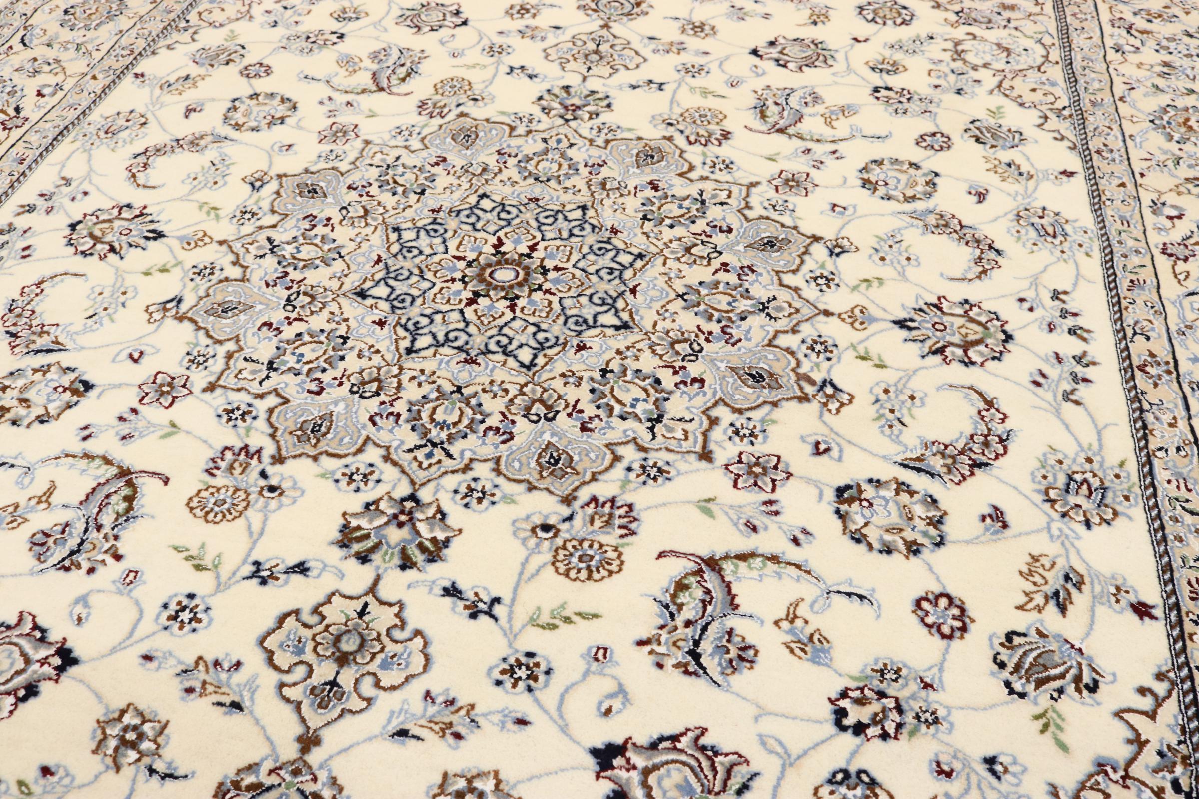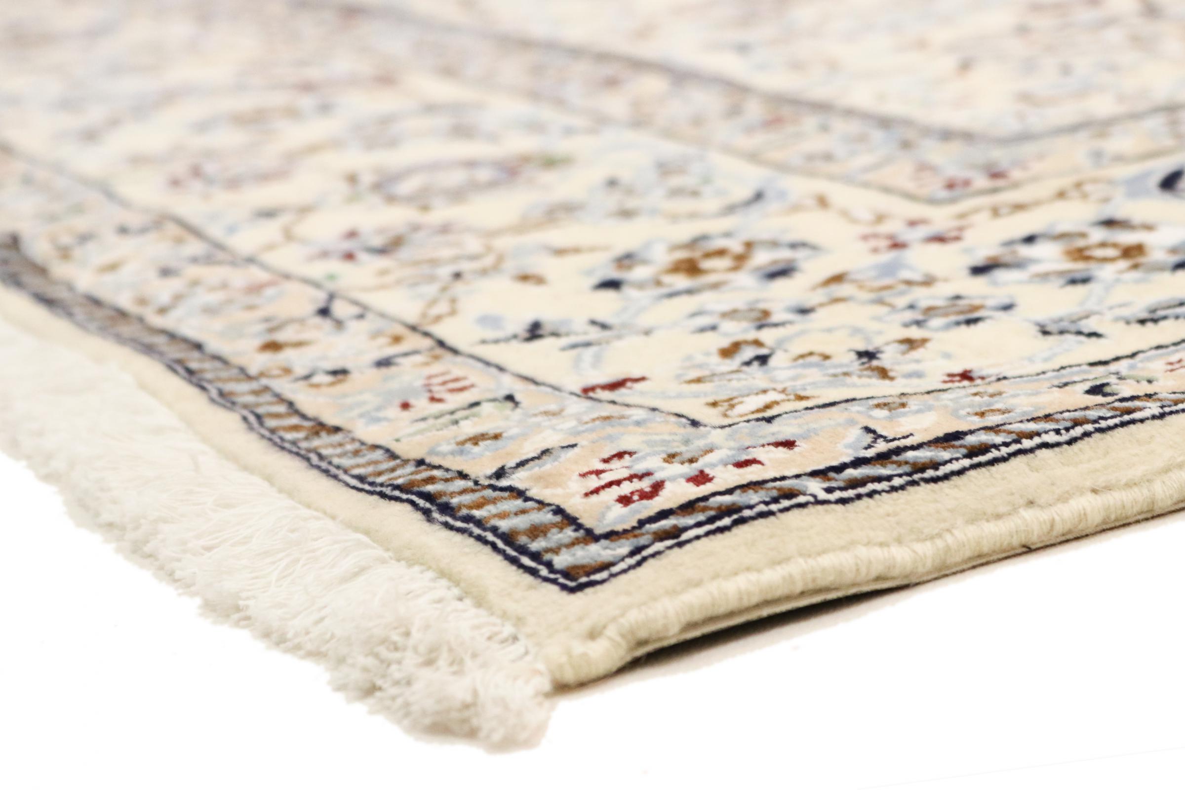Dette Nain tæppe er vurderet til 12La. Det ser elegant og ædelt ud i sit typiske Nain-farveskema. Dette persiske tæppe blev håndknyttet af højkvalitets uld og natursilke i byen Nain, som ligger i den vestlige udkant af Dasht-e-Kavir-ørkenen. Med 12La er den ikke så fint og detaljeret udsmykket som en Nain 9La eller 6La.