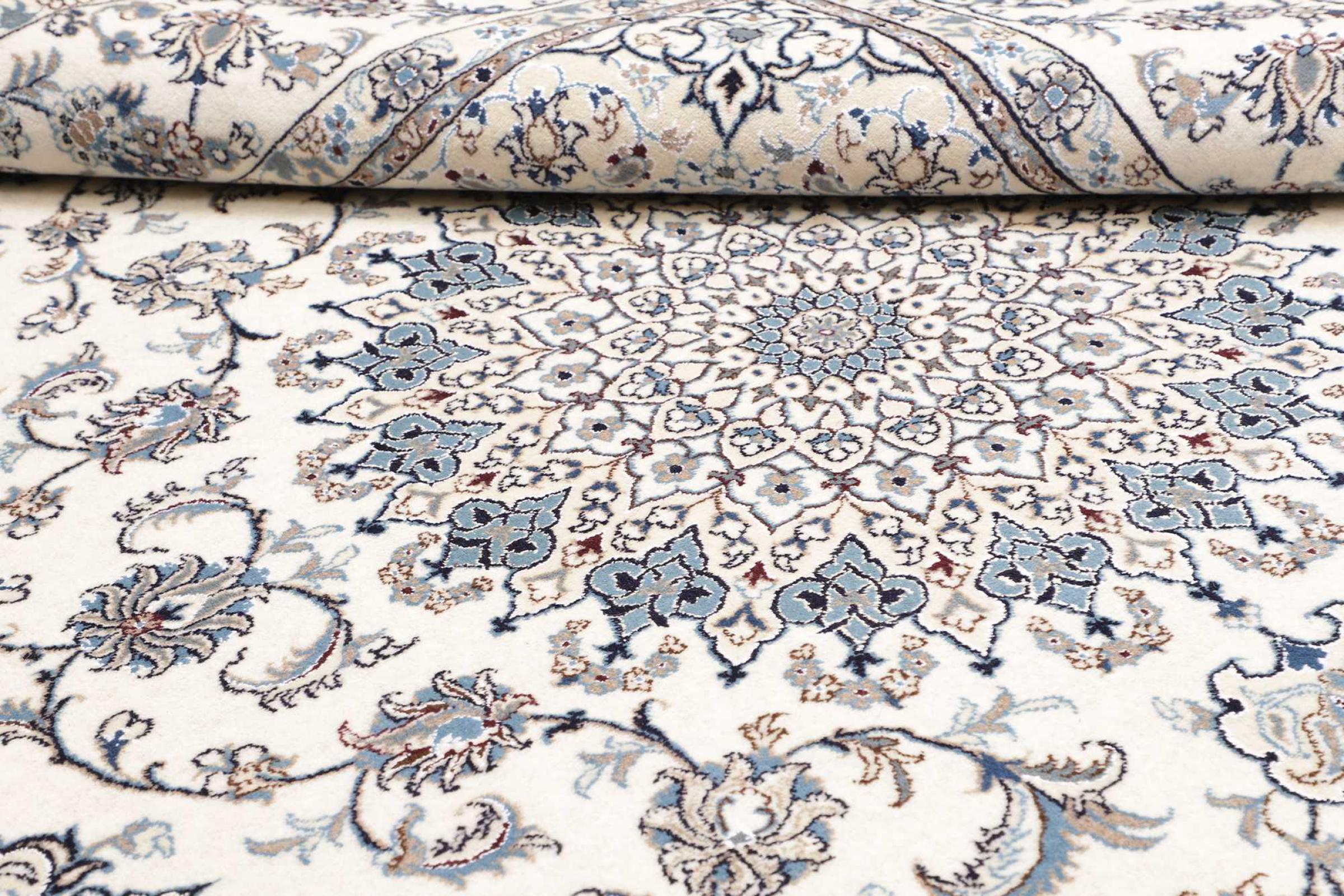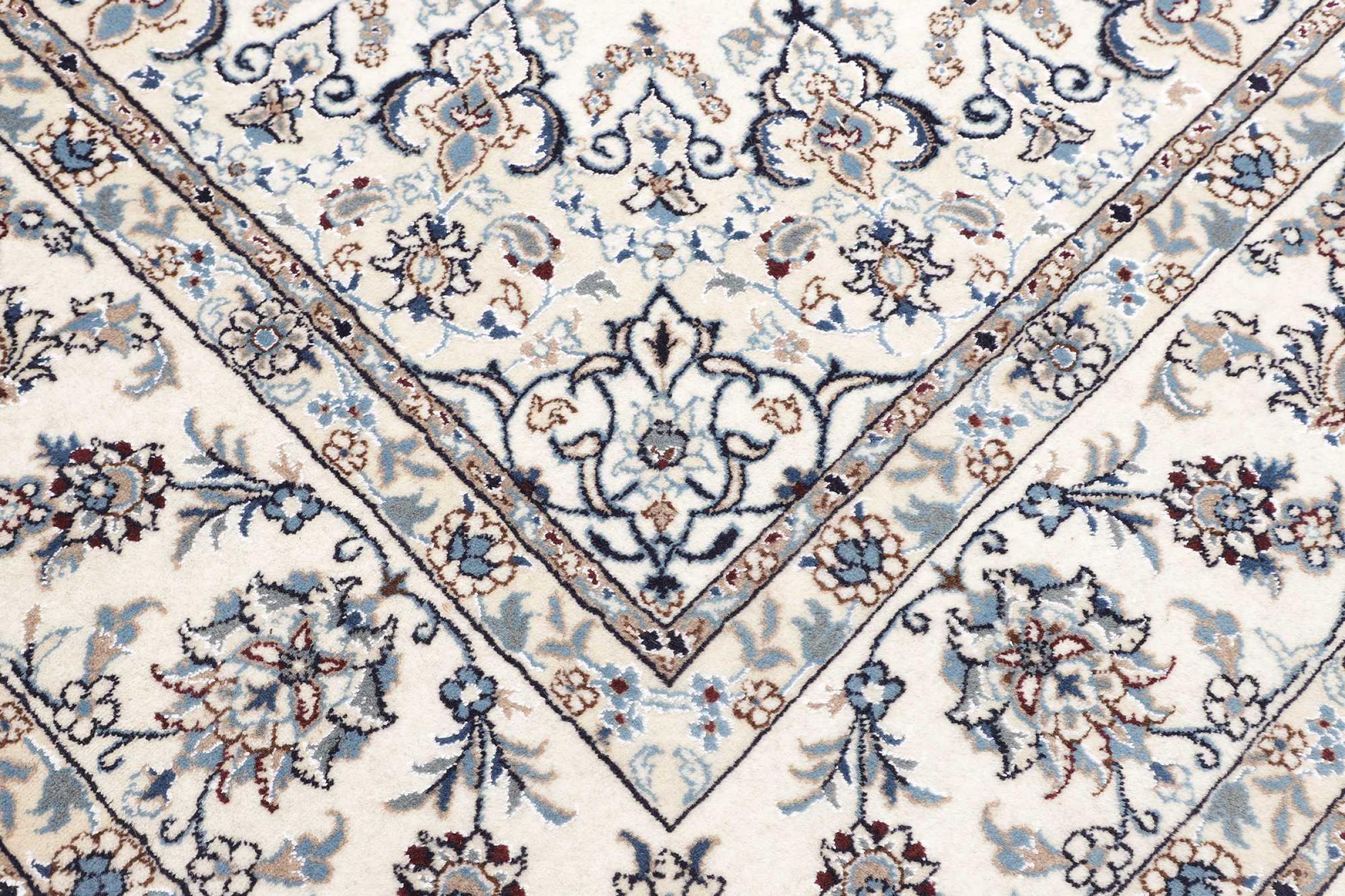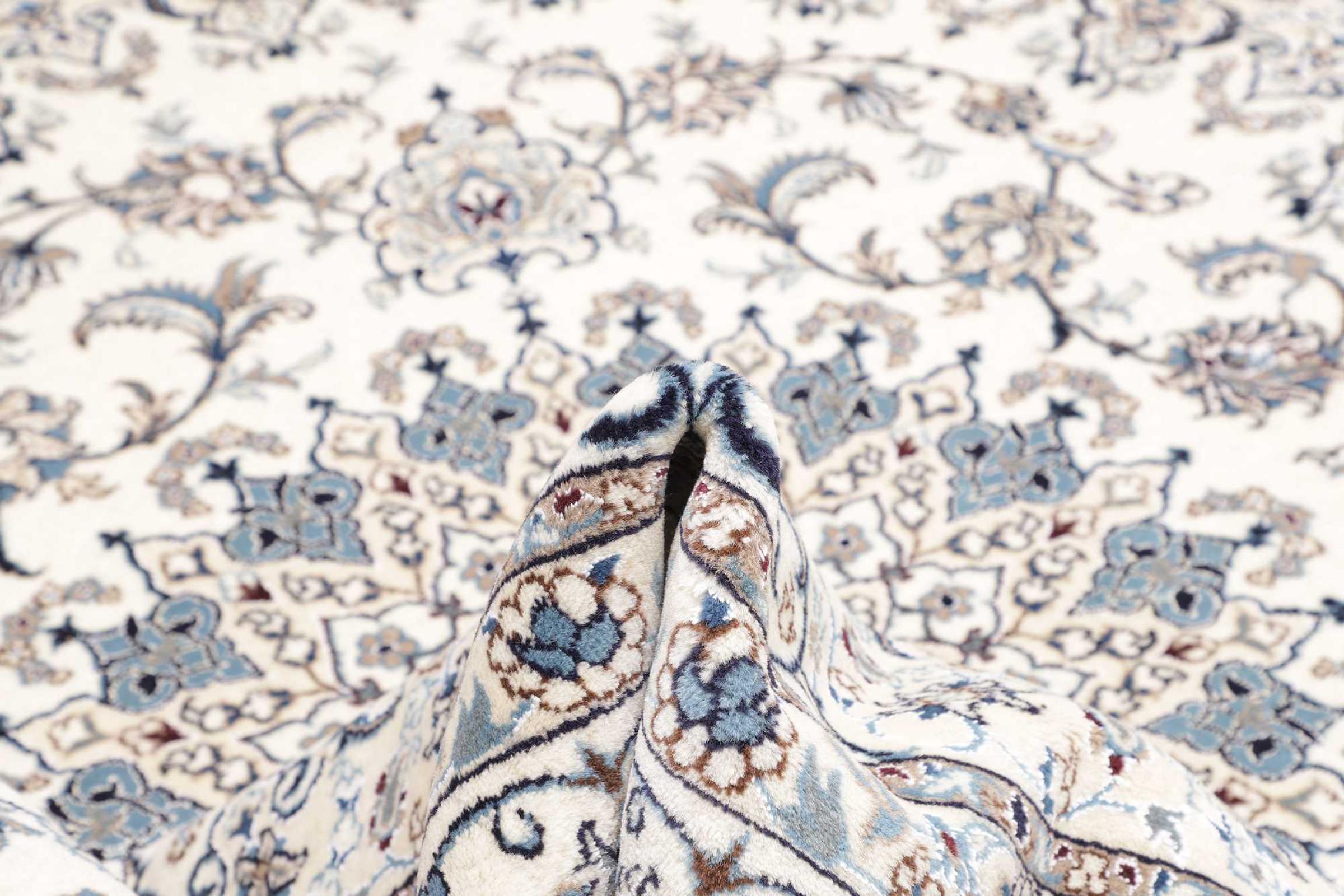 Dette Nain tæppe er vurderet til 12La. Det ser elegant og ædelt ud i sit typiske Nain-farveskema. Dette persiske tæppe blev håndknyttet af højkvalitets uld og natursilke i byen Nain, som ligger i den vestlige udkant af Dasht-e-Kavir-ørkenen. Med 12La er den ikke så fint og detaljeret udsmykket som en Nain 9La eller 6La.