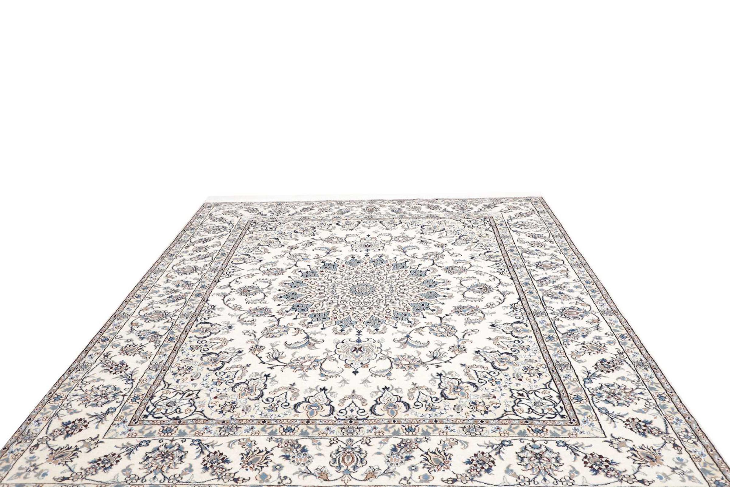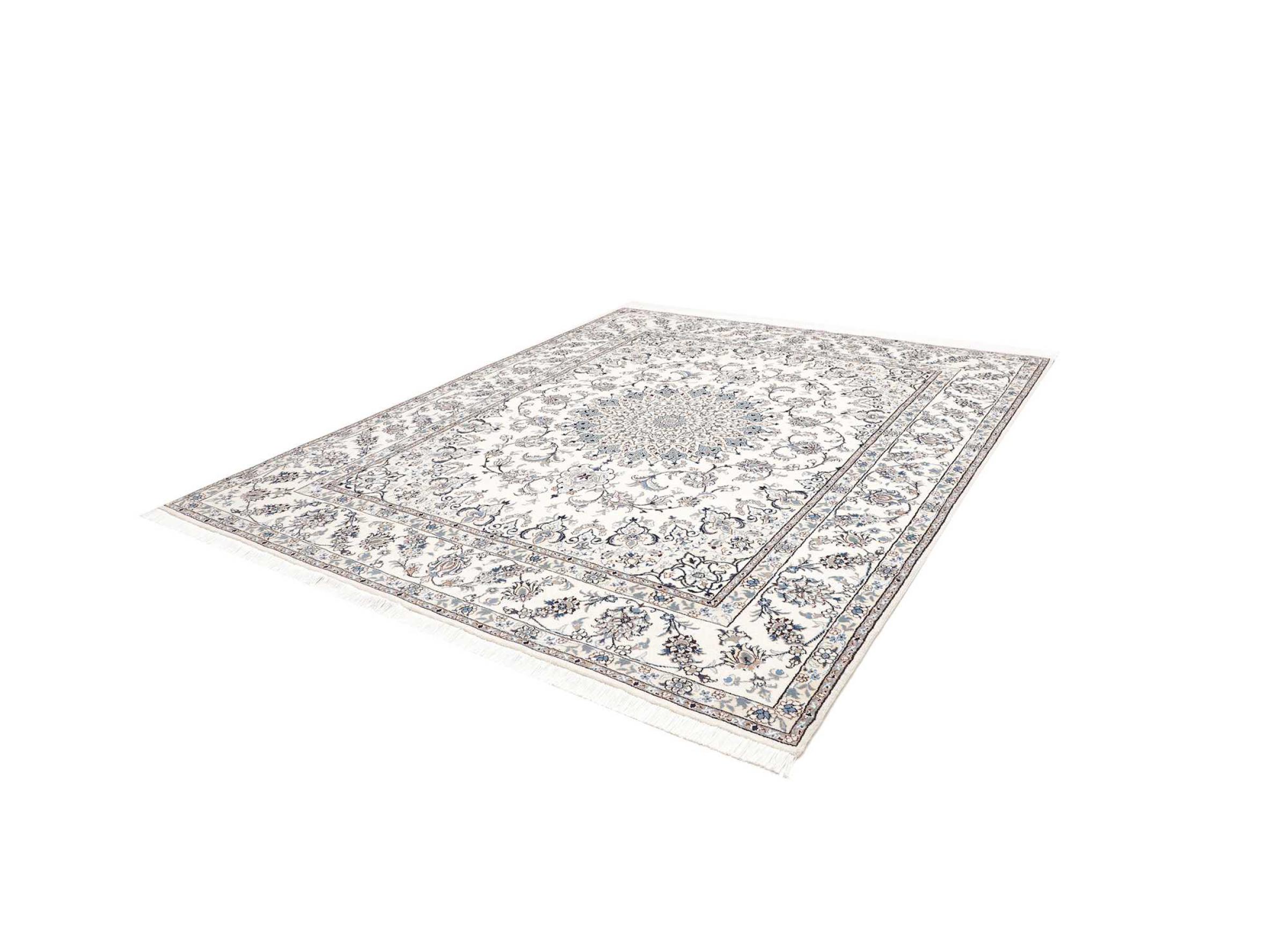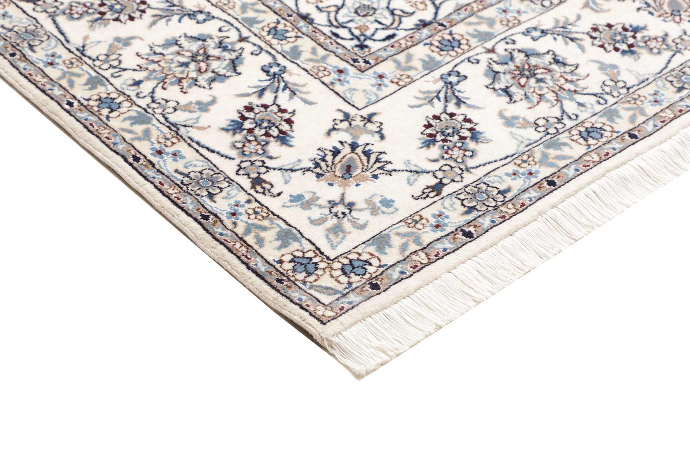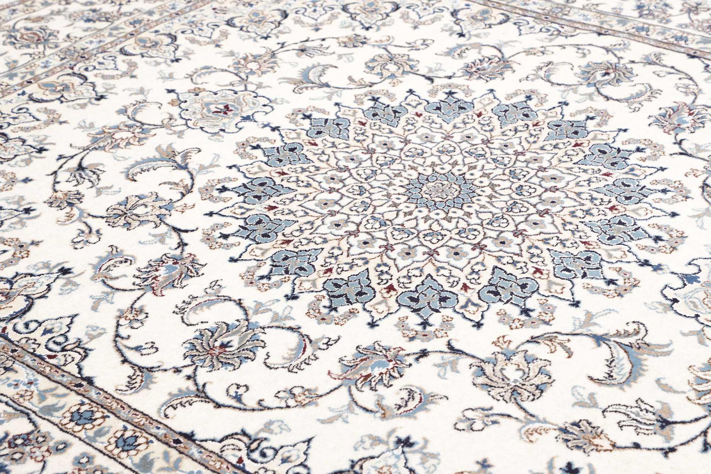 Dette Nain tæppe er vurderet til 12La. Det ser elegant og ædelt ud i sit typiske Nain-farveskema. Dette persiske tæppe blev håndknyttet af højkvalitets uld og natursilke i byen Nain, som ligger i den vestlige udkant af Dasht-e-Kavir-ørkenen. Med 12La er den ikke så fint og detaljeret udsmykket som en Nain 9La eller 6La.