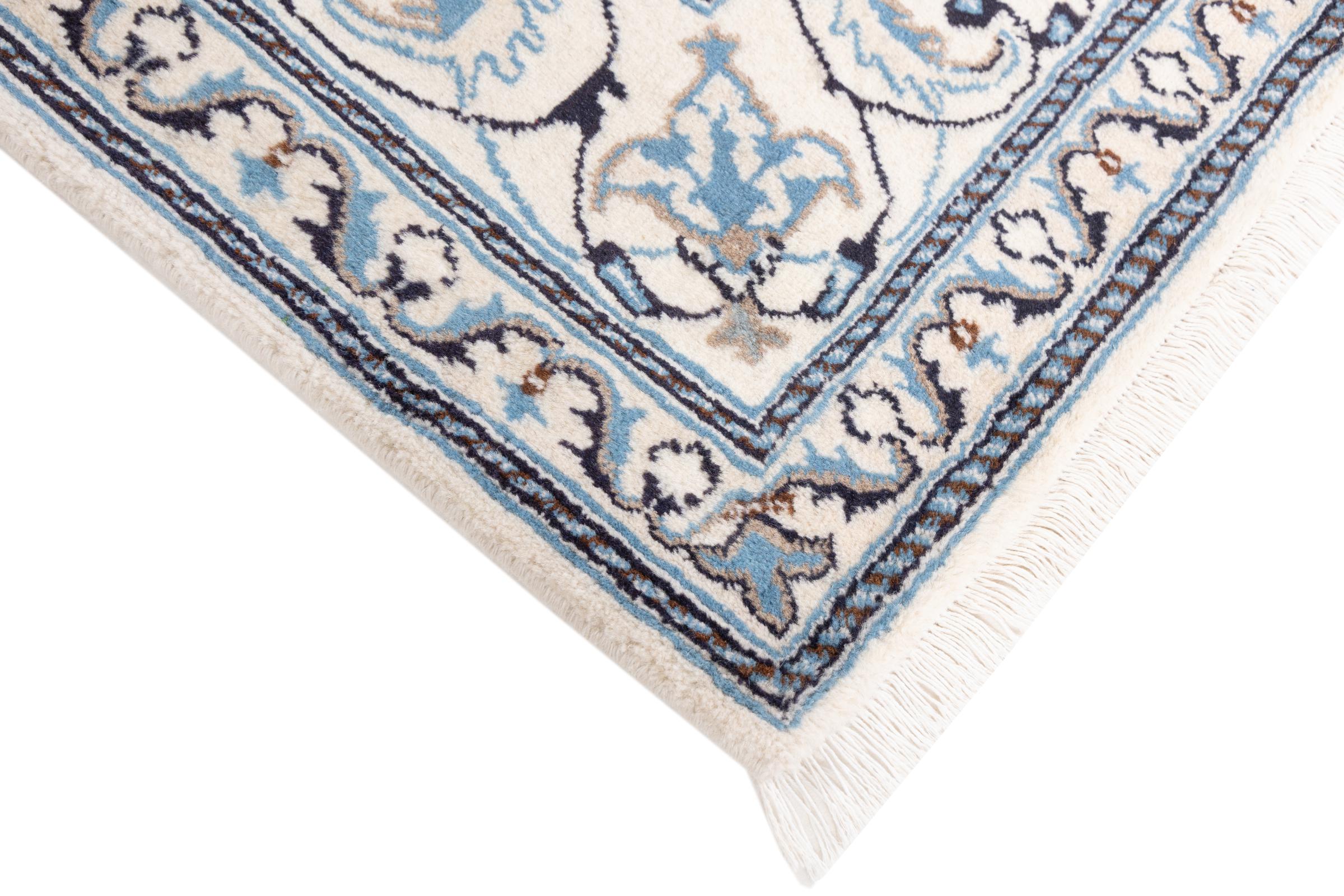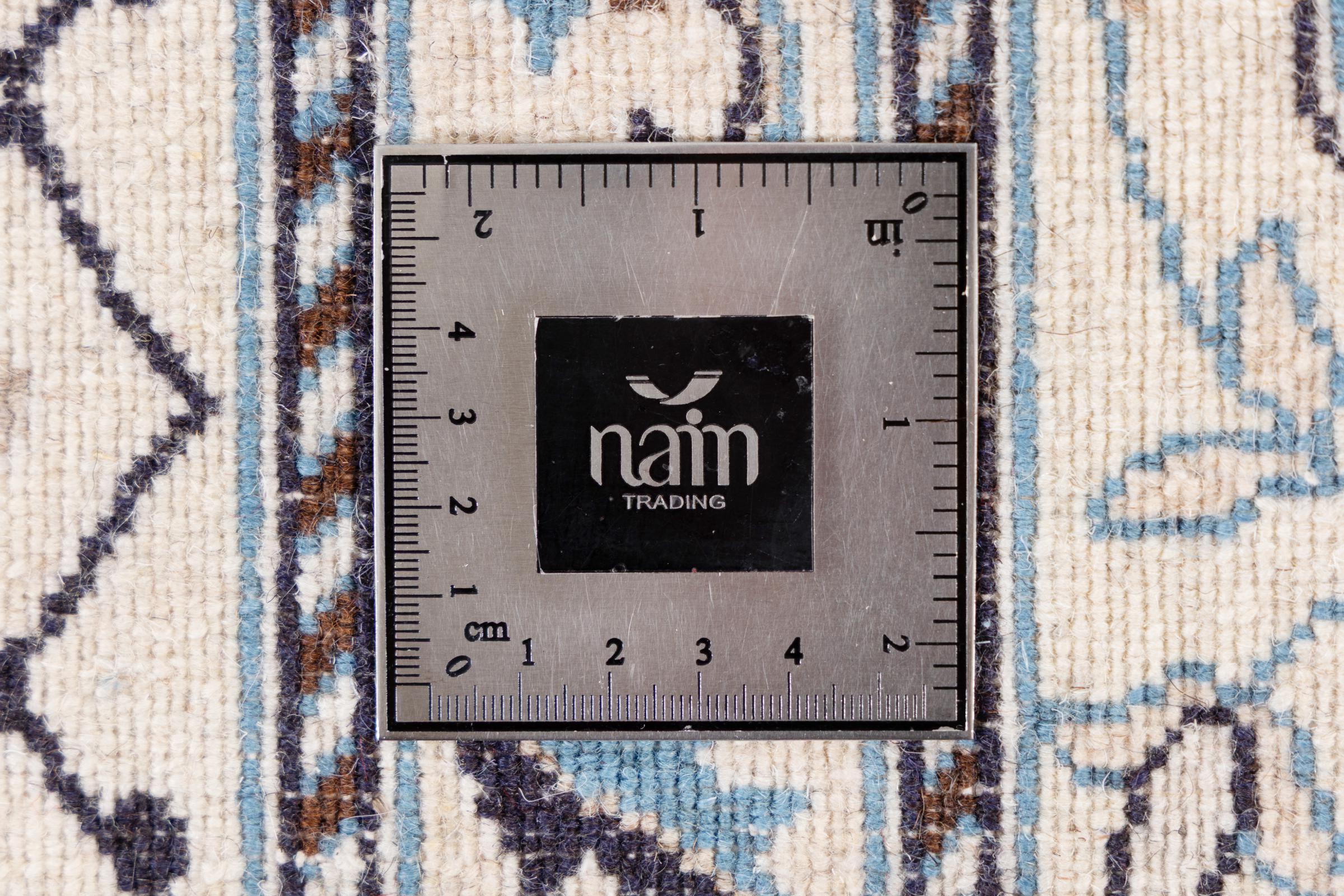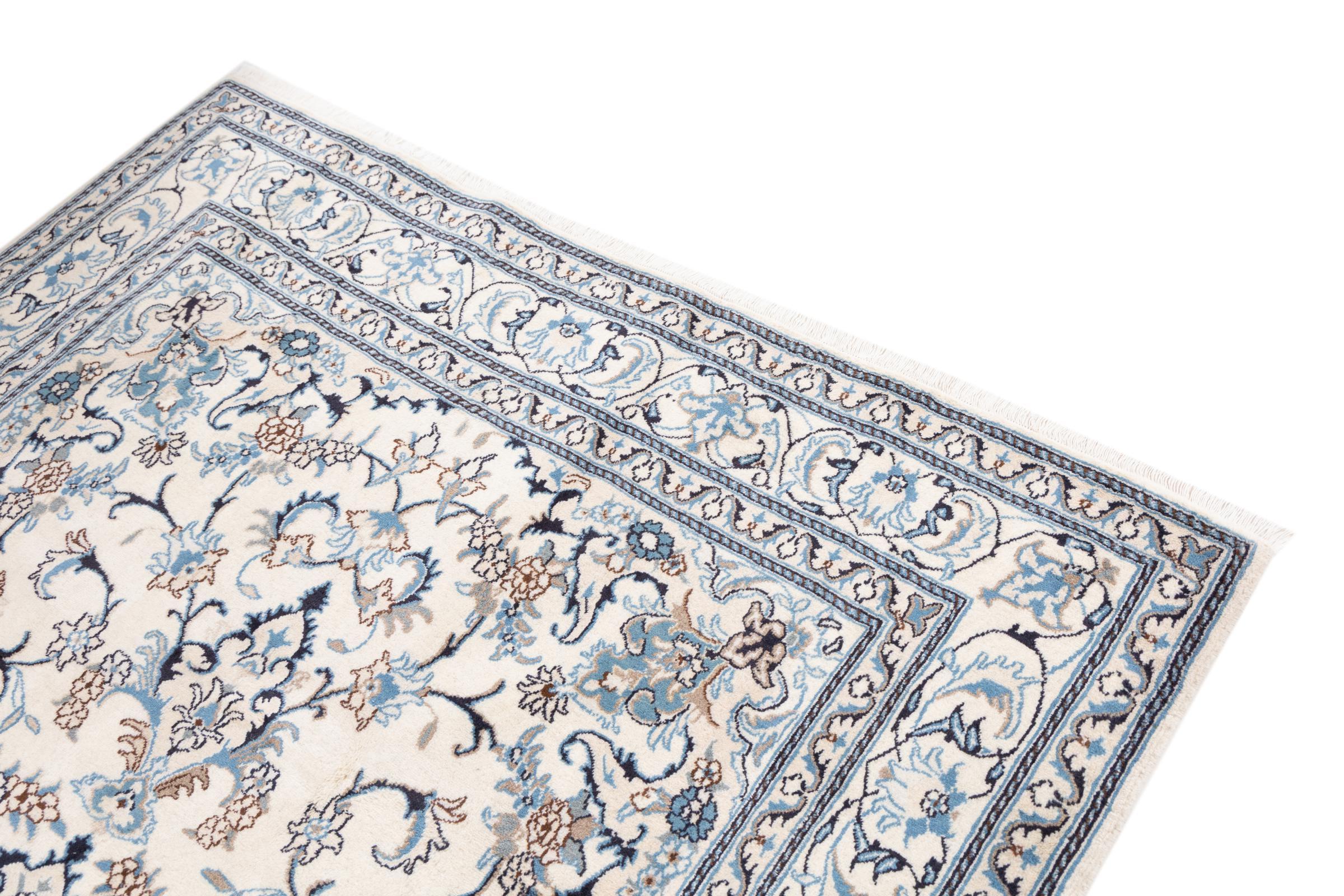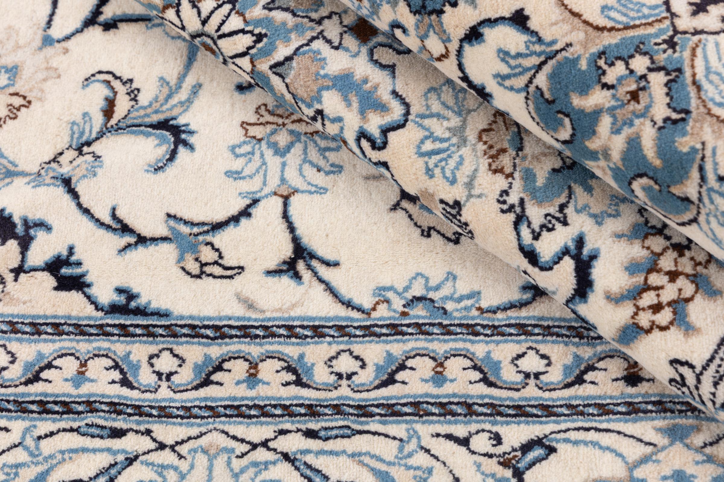 Dette Nain tæppe er vurderet til 12La. Det ser elegant og ædelt ud i sit typiske Nain-farveskema. Dette persiske tæppe blev håndknyttet af højkvalitets uld og natursilke i byen Nain, som ligger i den vestlige udkant af Dasht-e-Kavir-ørkenen. Med 12La er den ikke så fint og detaljeret udsmykket som en Nain 9La eller 6La.