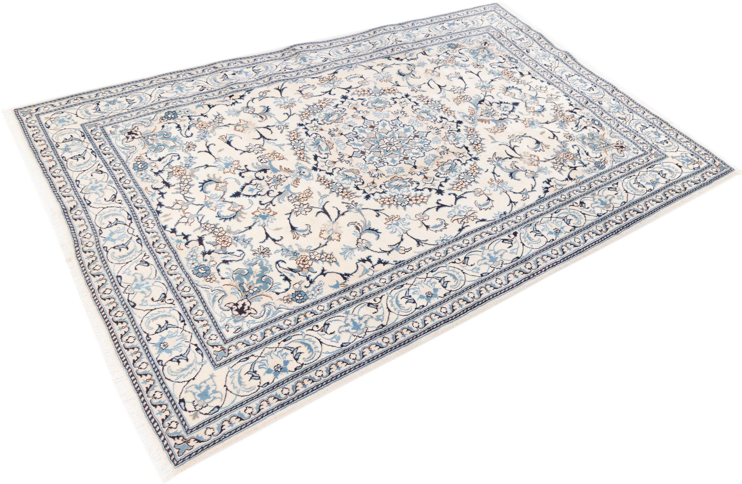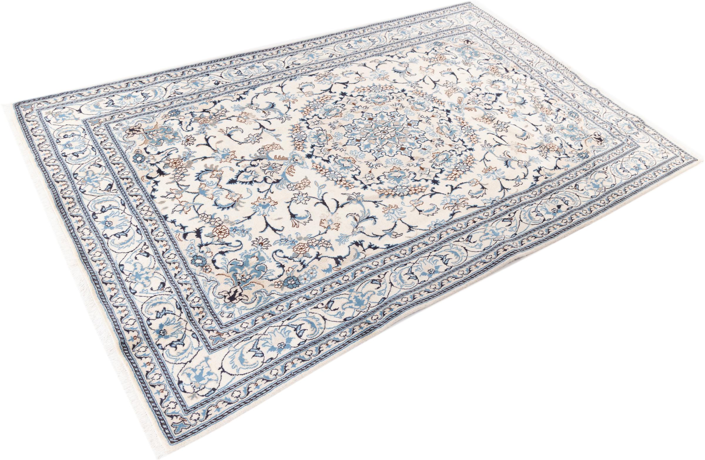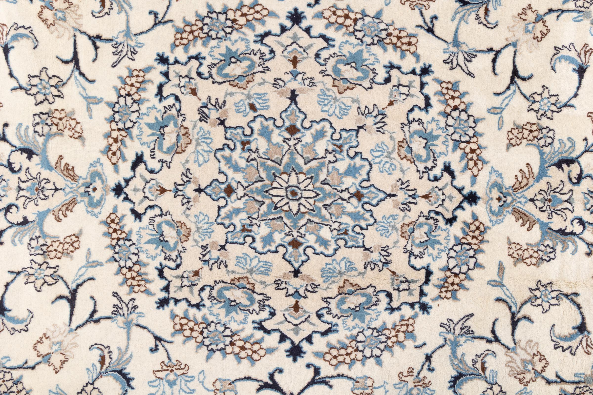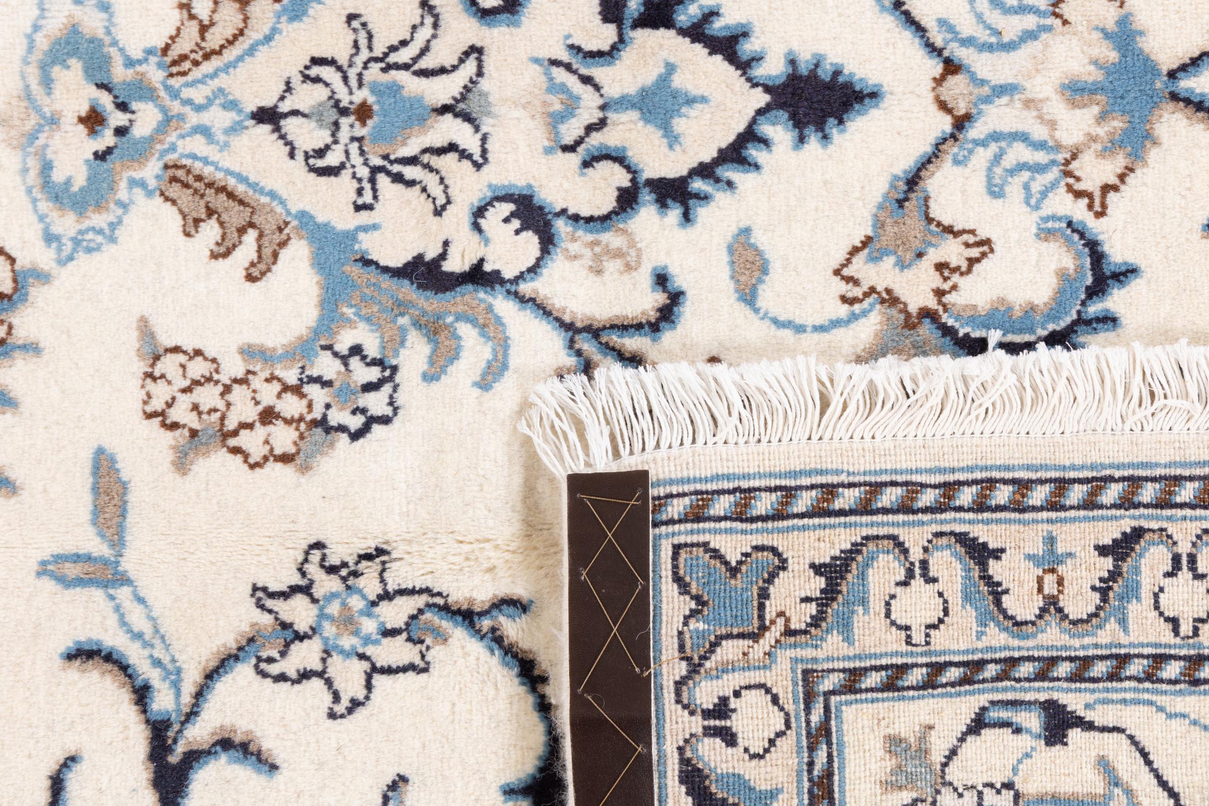 Dette Nain tæppe er vurderet til 12La. Det ser elegant og ædelt ud i sit typiske Nain-farveskema. Dette persiske tæppe blev håndknyttet af højkvalitets uld og natursilke i byen Nain, som ligger i den vestlige udkant af Dasht-e-Kavir-ørkenen. Med 12La er den ikke så fint og detaljeret udsmykket som en Nain 9La eller 6La.