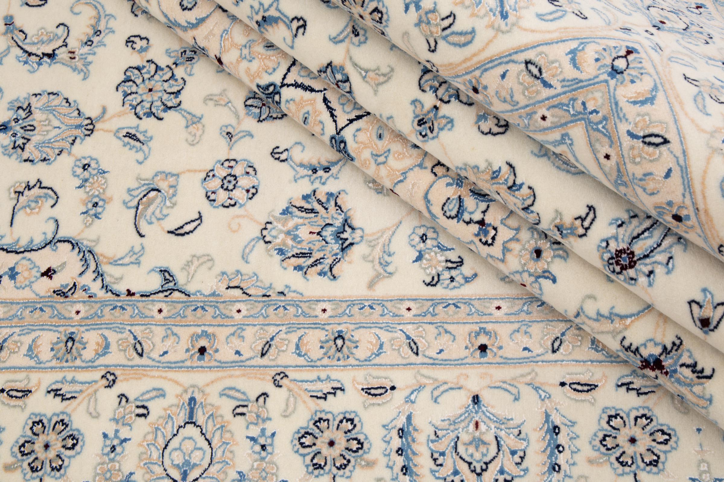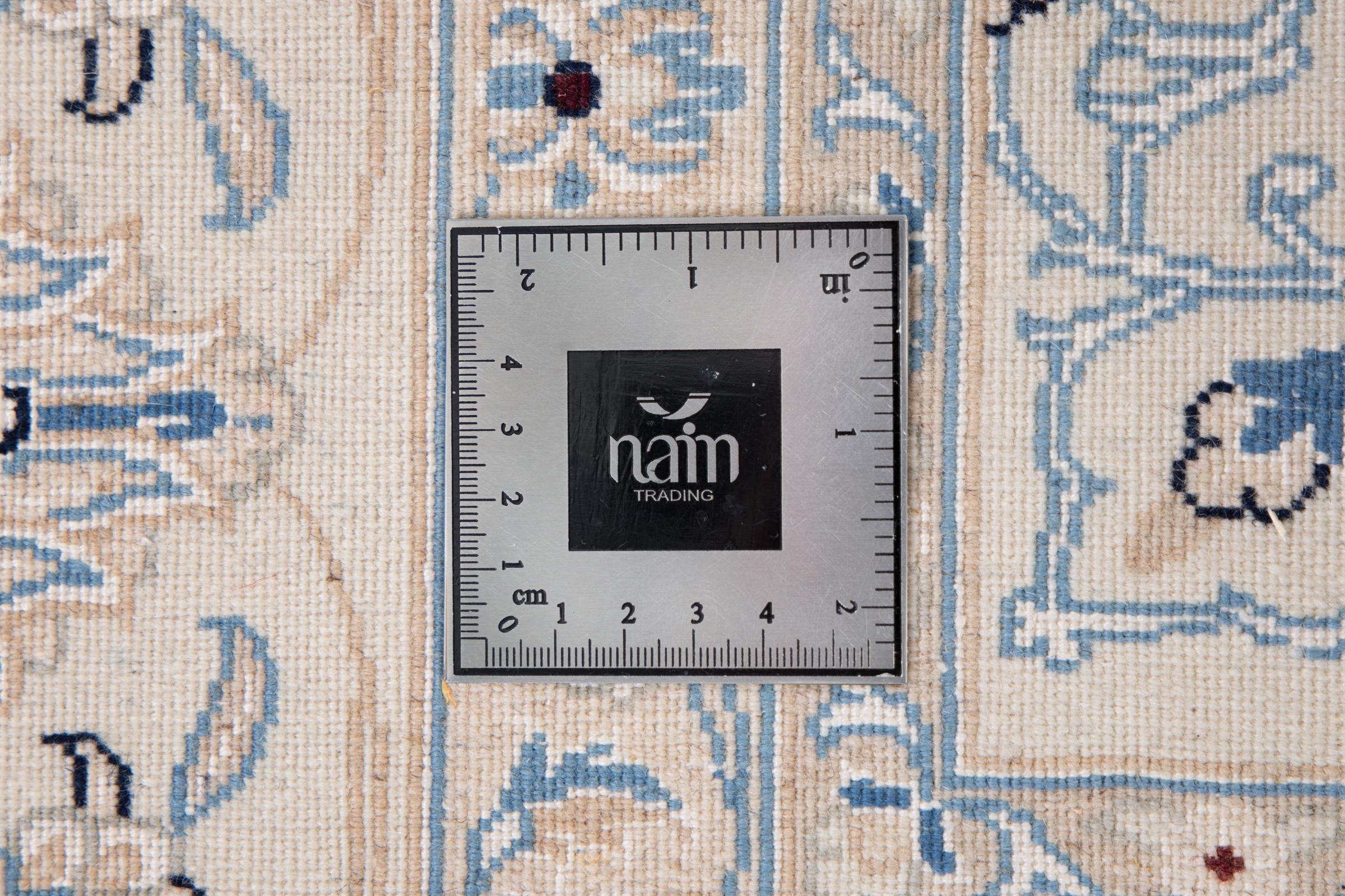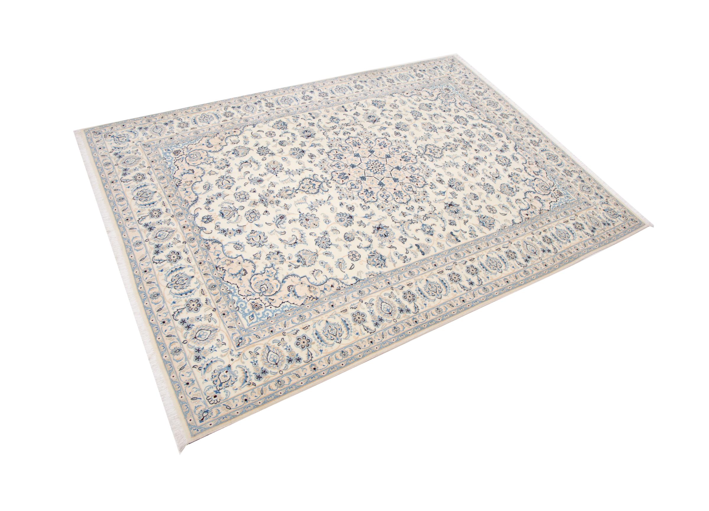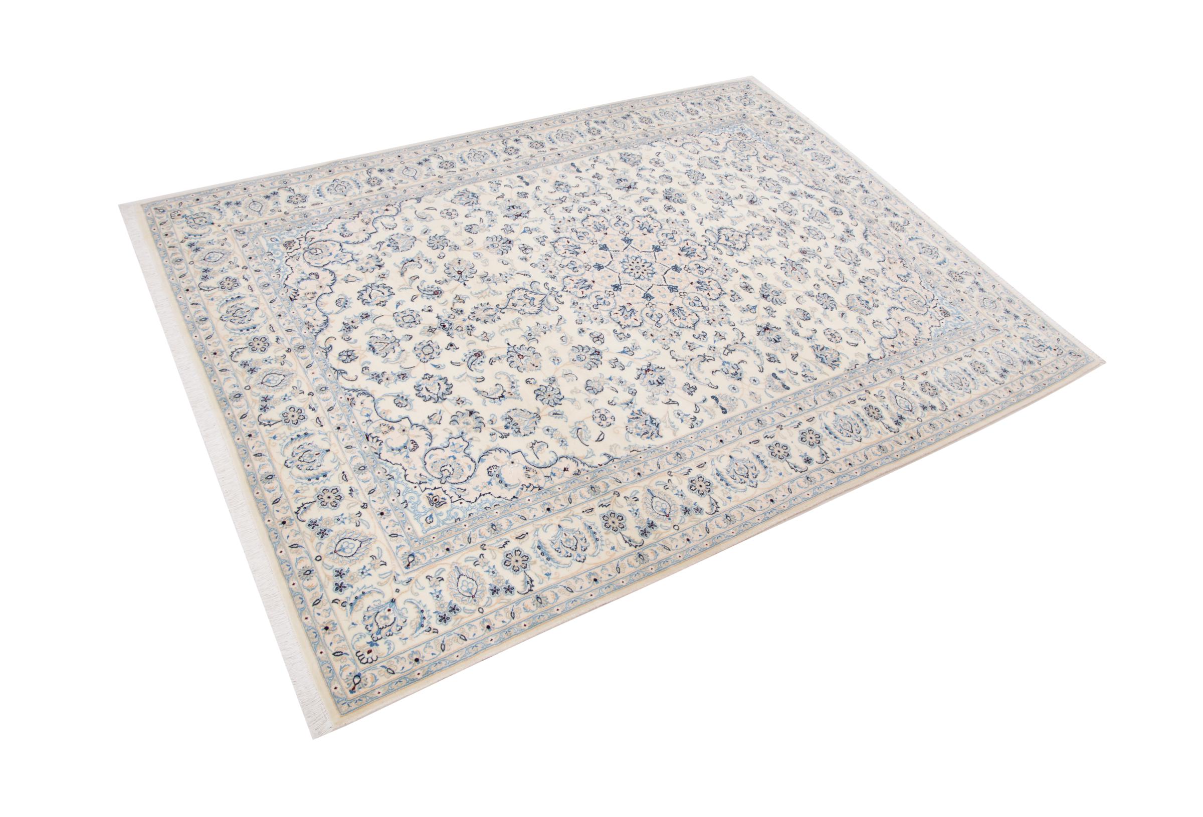 Dette Nain-tæppe er klassificeret 9La. Den fremragende kvalitet, det smukke orientalske design med sine buede mønstre glæder enhver køber. Dette persiske tæppe blev håndknyttet af højkvalitets uld og natursilke i byen Nain, som ligger i den vestlige udkant af Dasht-e-Kavir-ørkenen. 9La Nain er væsentligt finere end en 12La og viser allerede smukke detaljer.