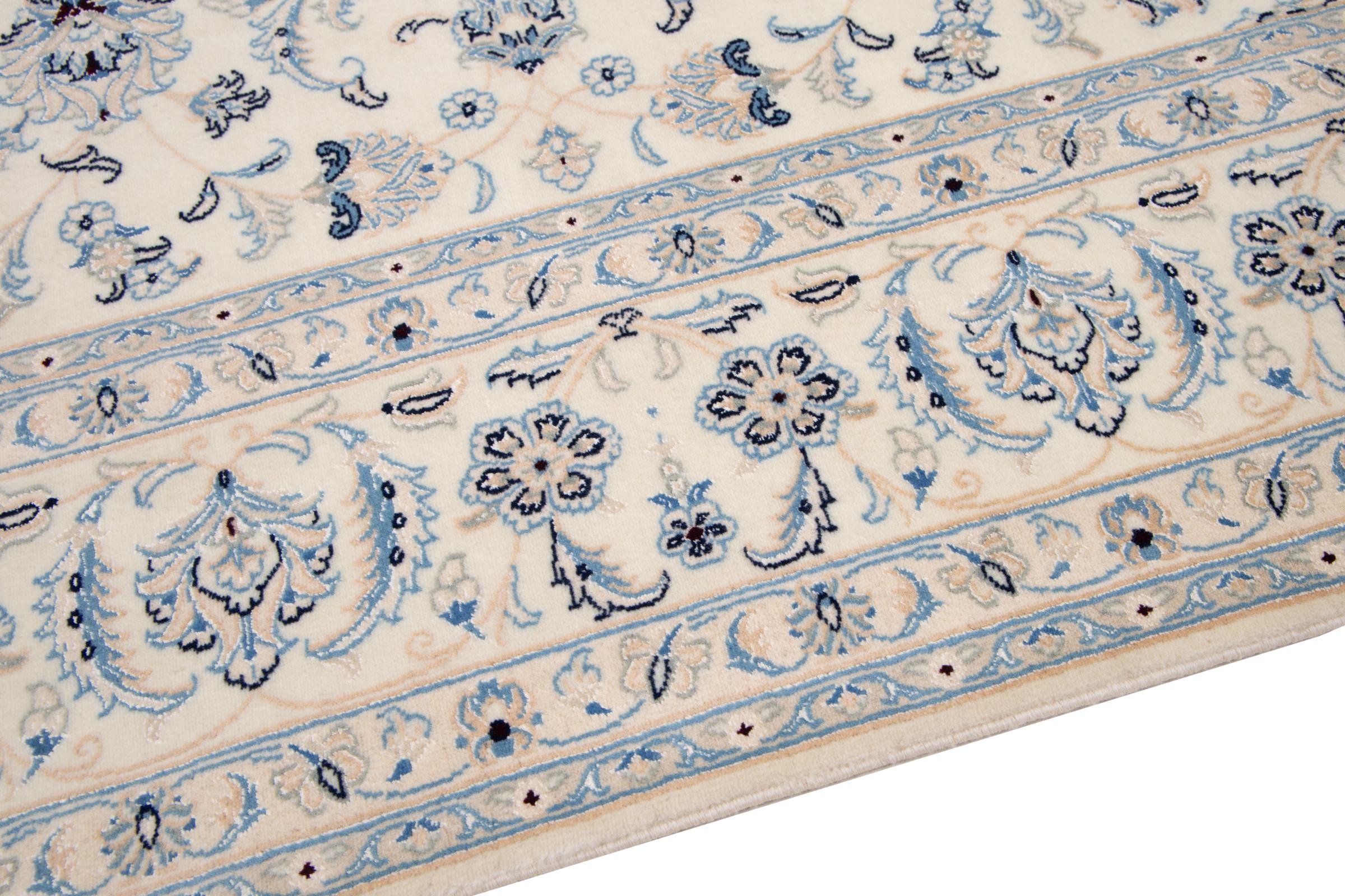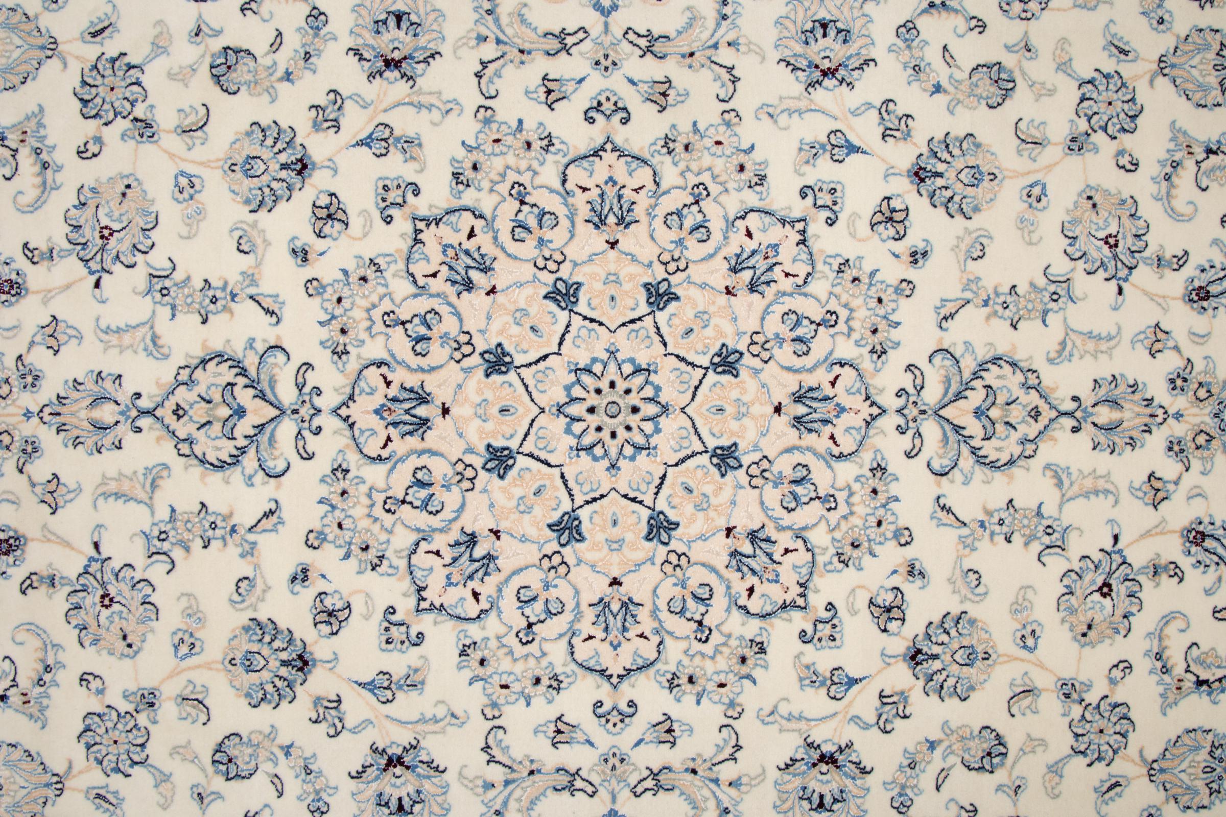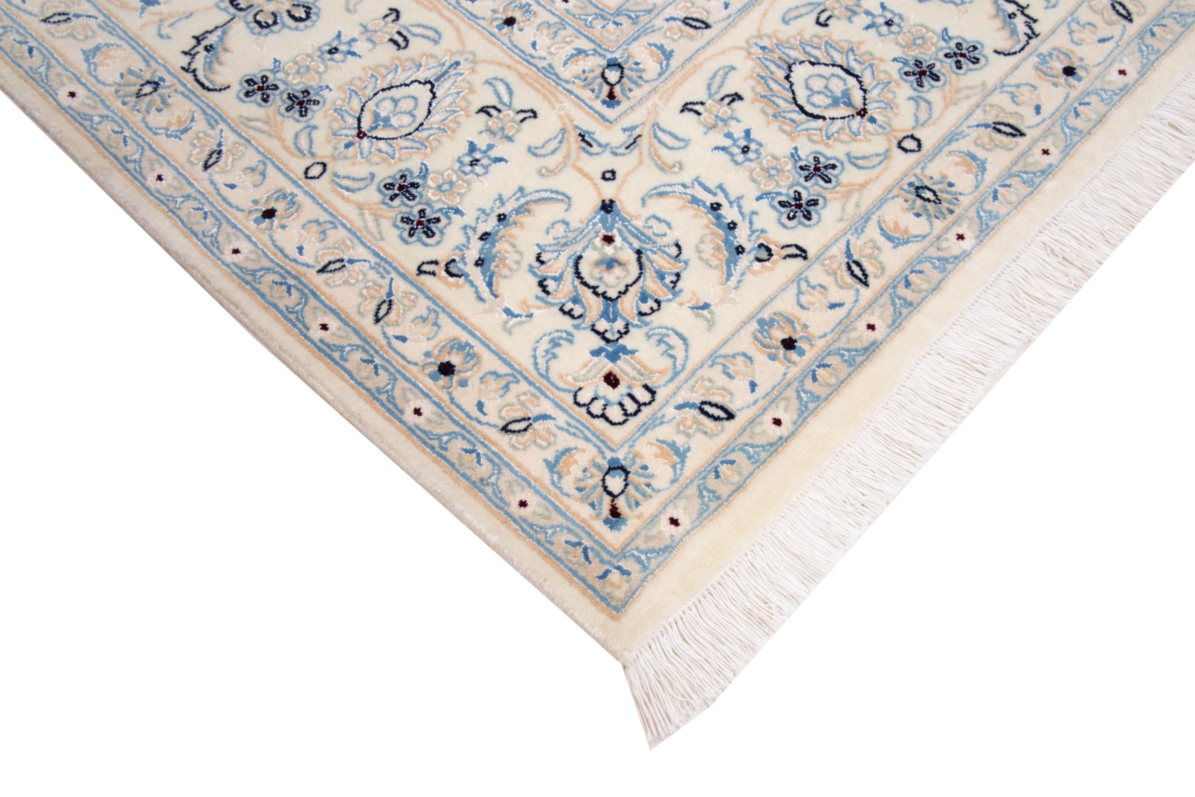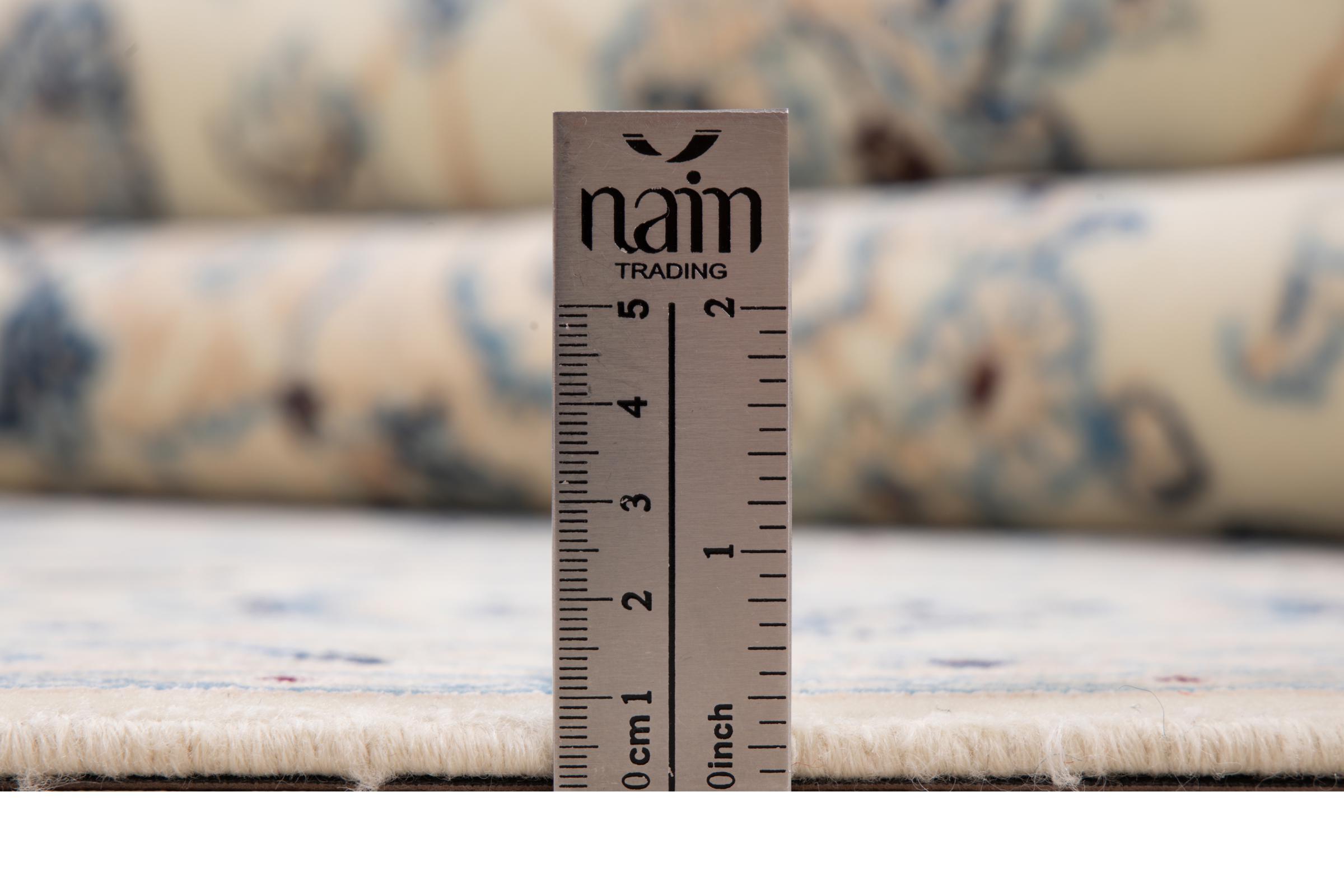 Dette Nain-tæppe er klassificeret 9La. Den fremragende kvalitet, det smukke orientalske design med sine buede mønstre glæder enhver køber. Dette persiske tæppe blev håndknyttet af højkvalitets uld og natursilke i byen Nain, som ligger i den vestlige udkant af Dasht-e-Kavir-ørkenen. 9La Nain er væsentligt finere end en 12La og viser allerede smukke detaljer.