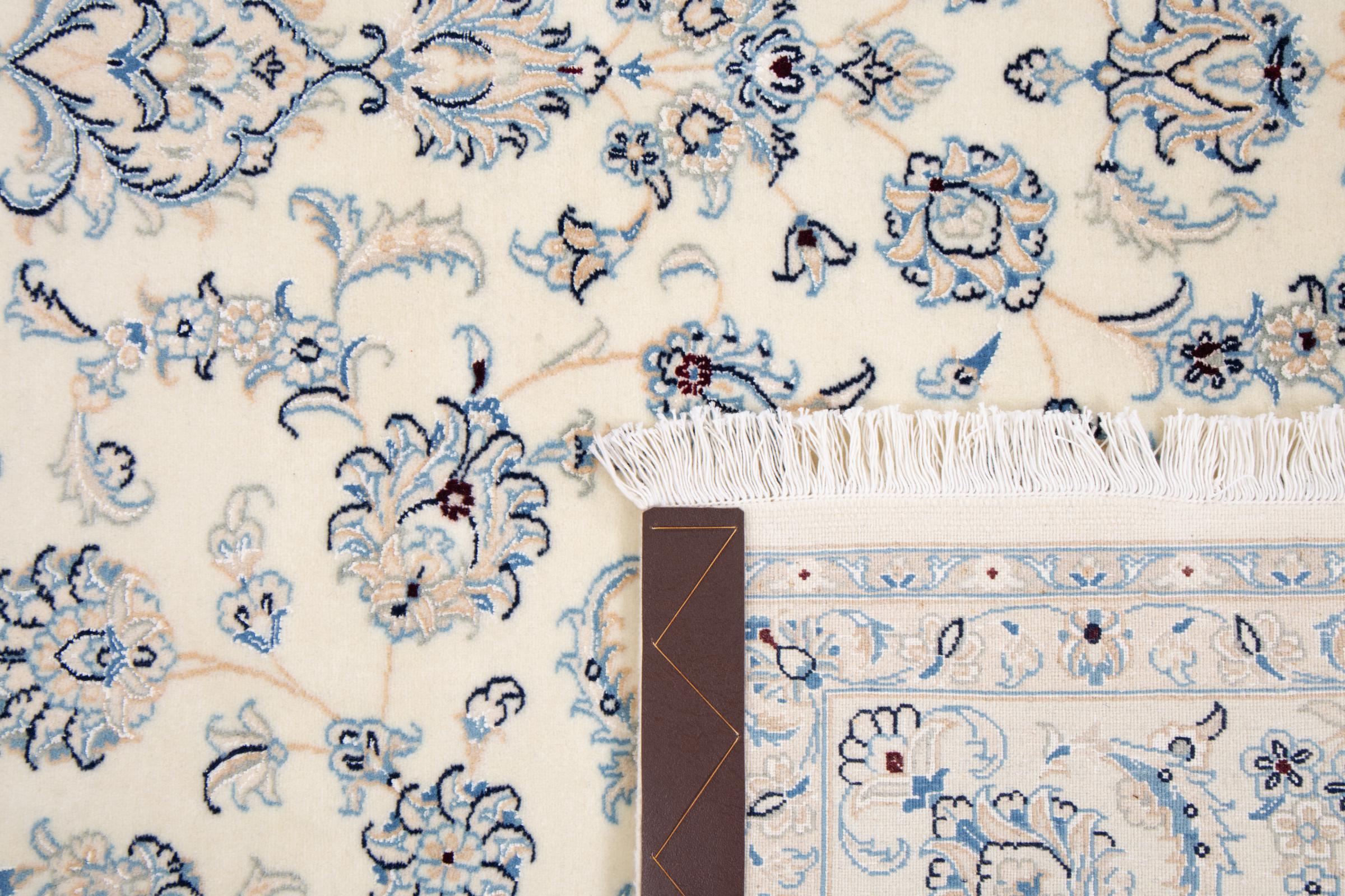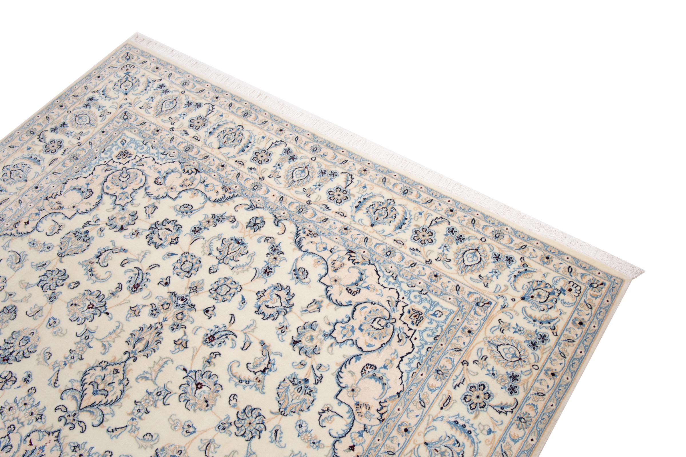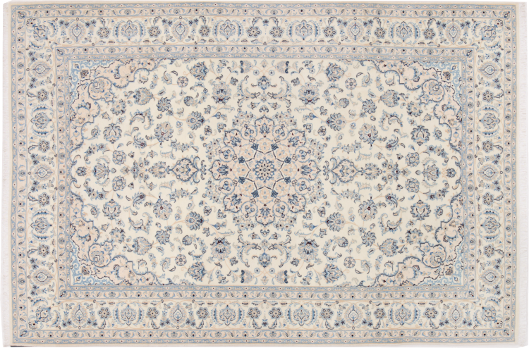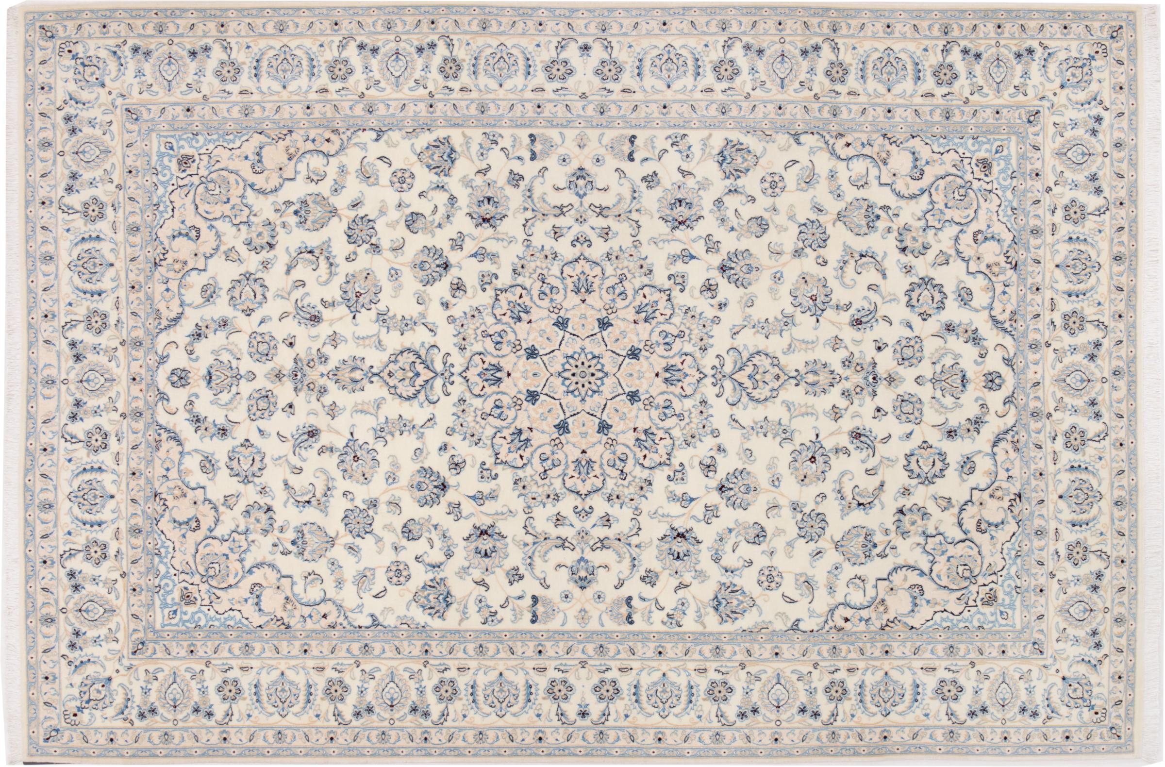 Dette Nain-tæppe er klassificeret 9La. Den fremragende kvalitet, det smukke orientalske design med sine buede mønstre glæder enhver køber. Dette persiske tæppe blev håndknyttet af højkvalitets uld og natursilke i byen Nain, som ligger i den vestlige udkant af Dasht-e-Kavir-ørkenen. 9La Nain er væsentligt finere end en 12La og viser allerede smukke detaljer.