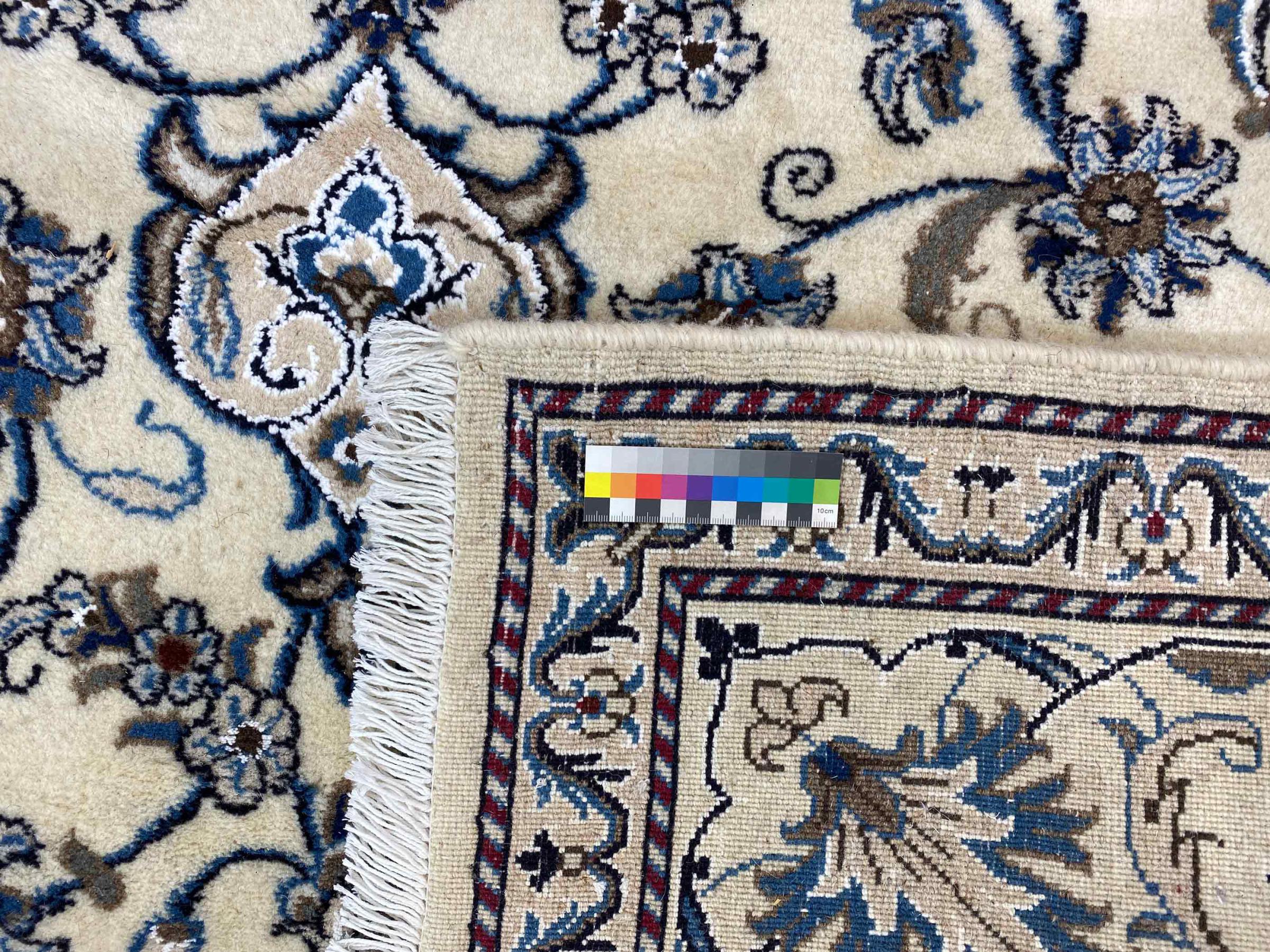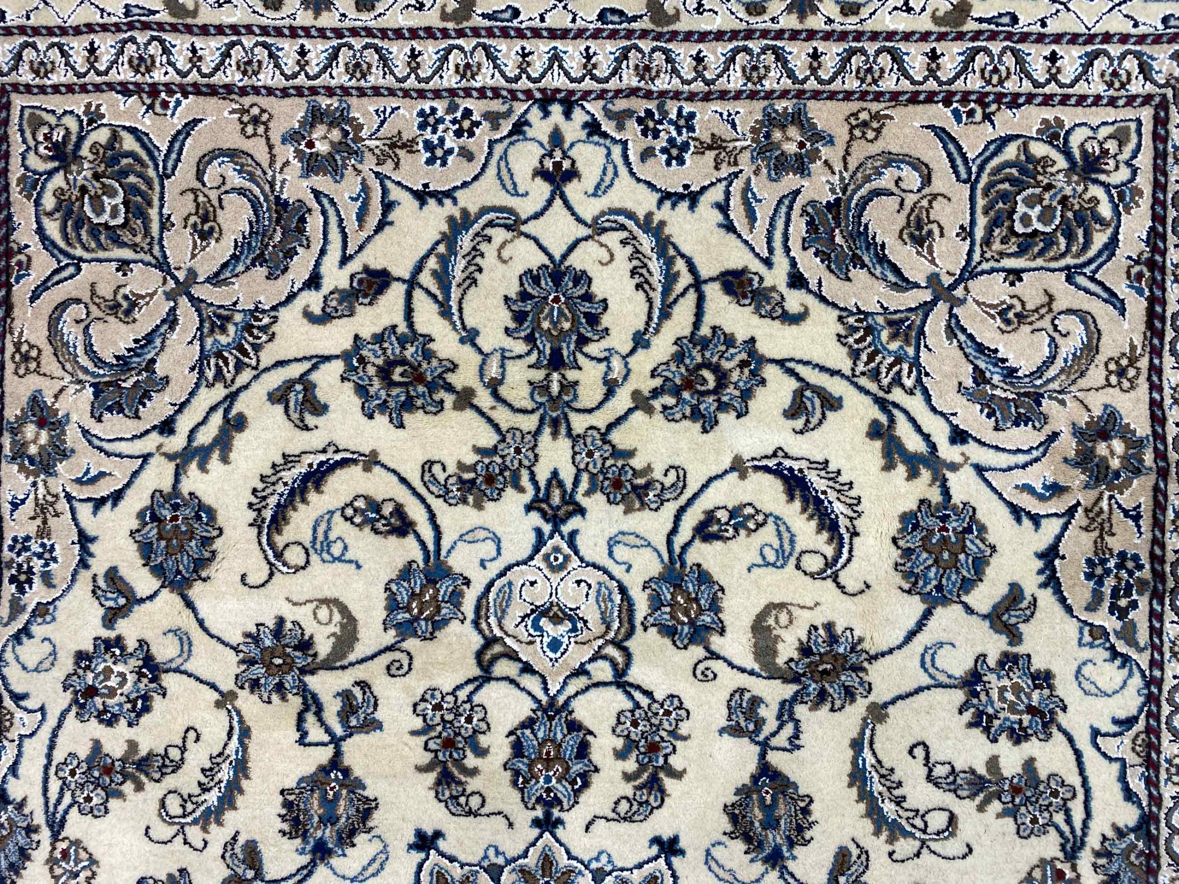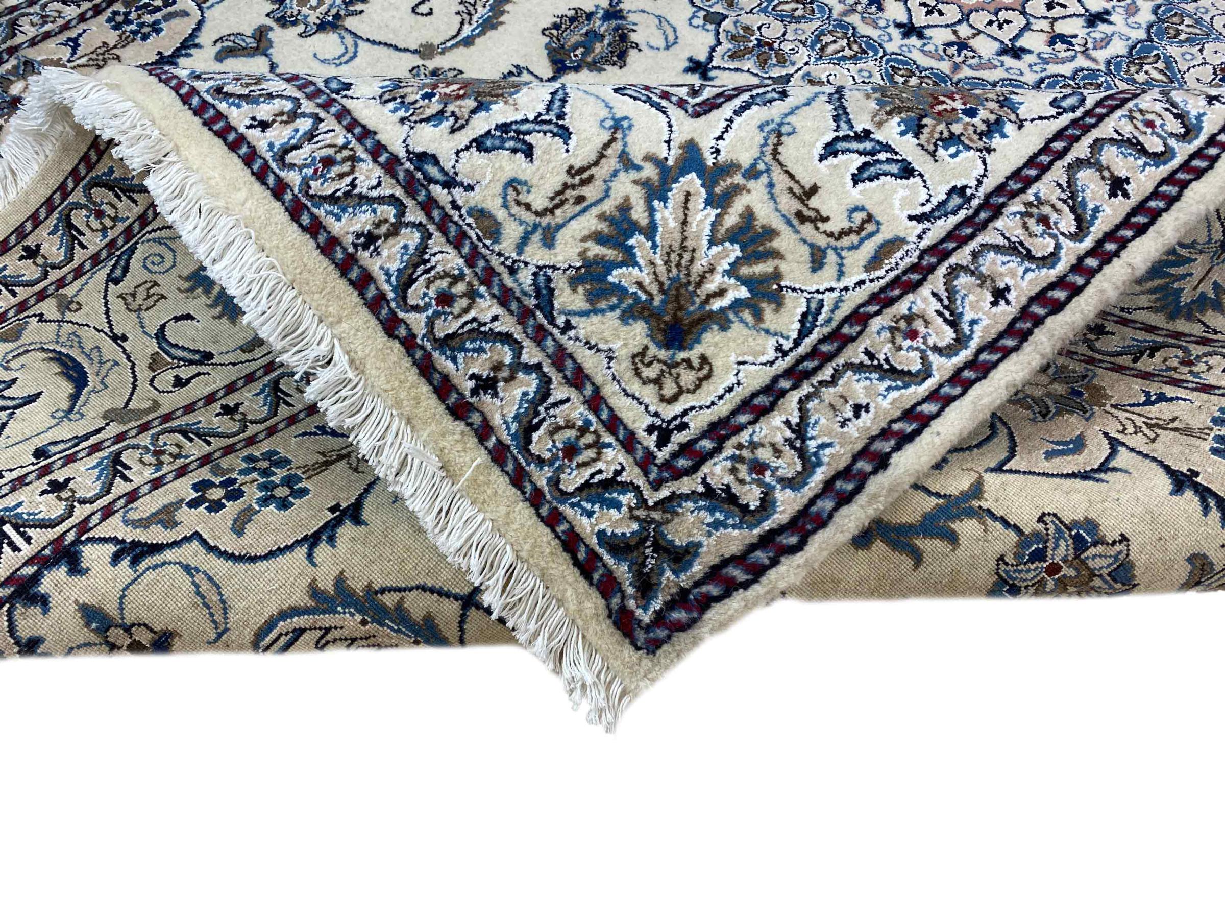 Dette Nain tæppe er vurderet til 12La. Det ser elegant og ædelt ud i sit typiske Nain-farveskema. Dette persiske tæppe blev håndknyttet af højkvalitets uld og natursilke i byen Nain, som ligger i den vestlige udkant af Dasht-e-Kavir-ørkenen. Med 12La er den ikke så fint og detaljeret udsmykket som en Nain 9La eller 6La.