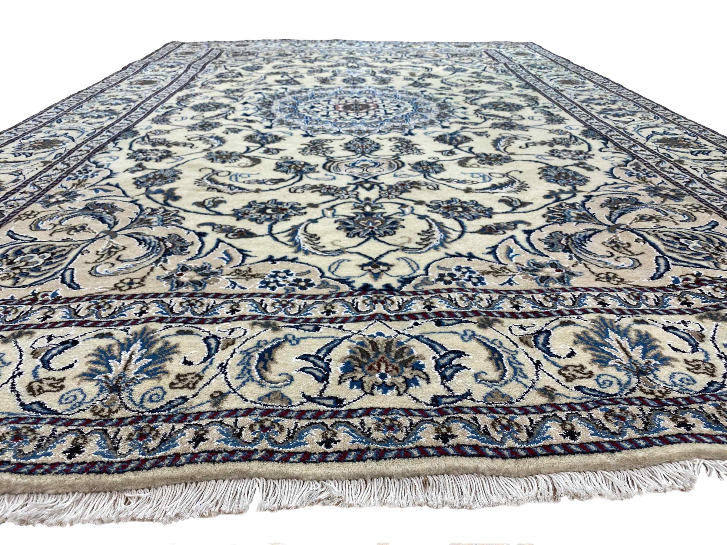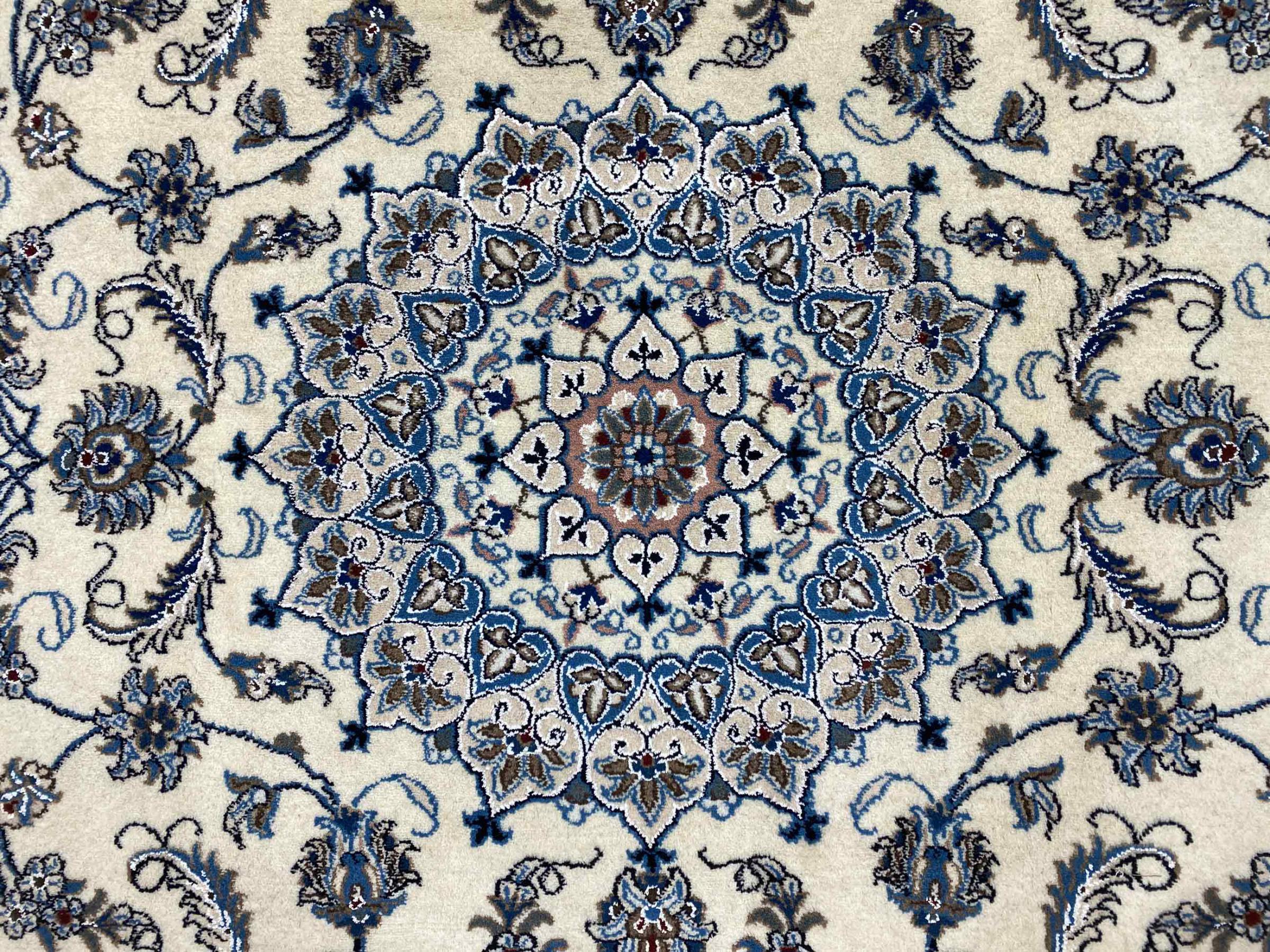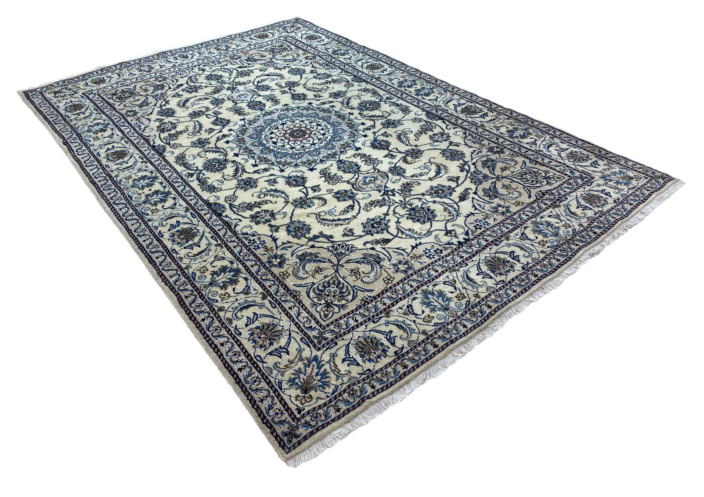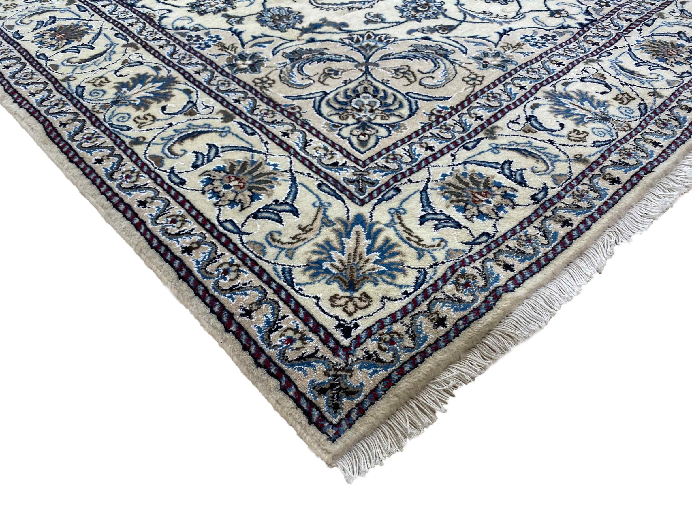 Dette Nain tæppe er vurderet til 12La. Det ser elegant og ædelt ud i sit typiske Nain-farveskema. Dette persiske tæppe blev håndknyttet af højkvalitets uld og natursilke i byen Nain, som ligger i den vestlige udkant af Dasht-e-Kavir-ørkenen. Med 12La er den ikke så fint og detaljeret udsmykket som en Nain 9La eller 6La.