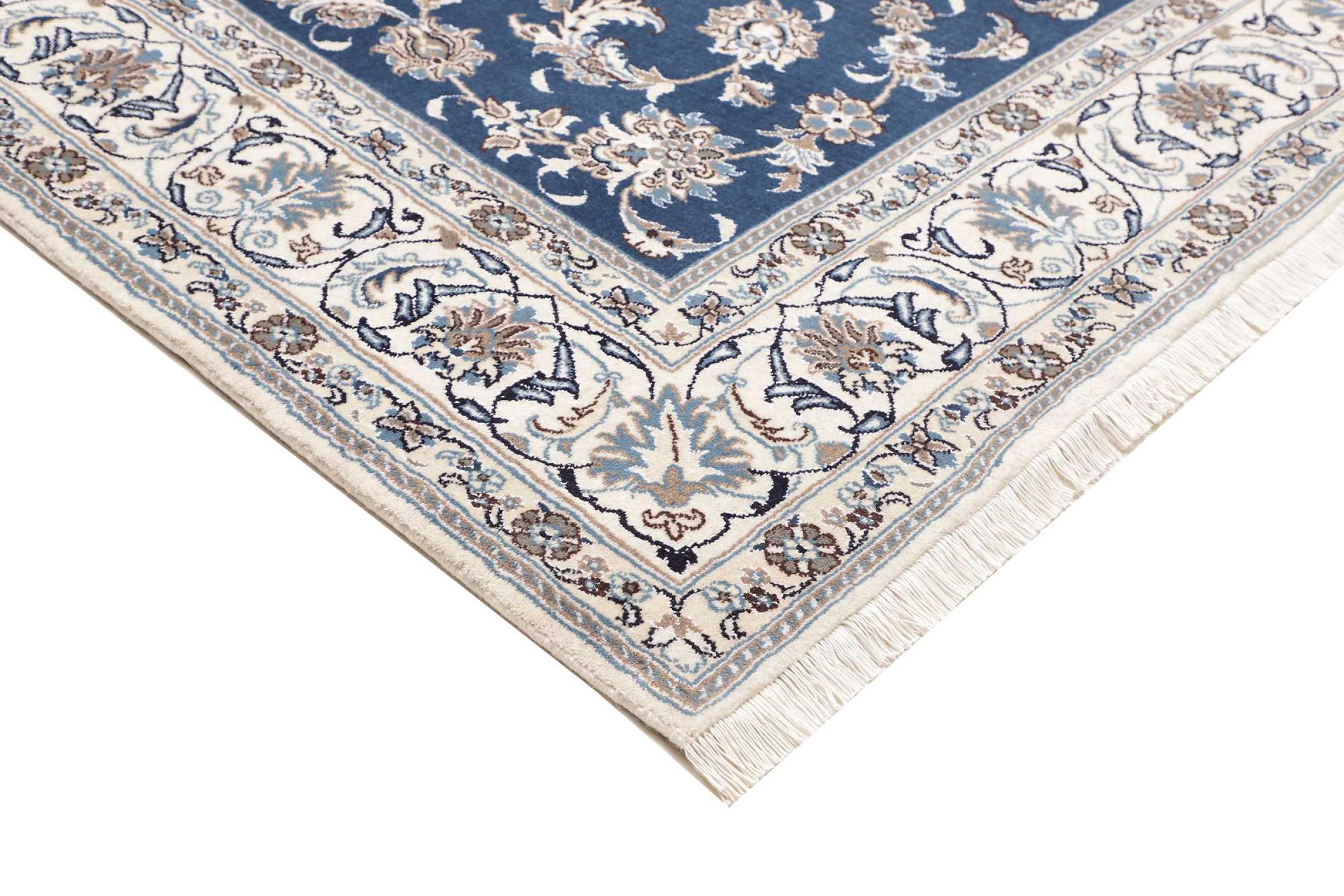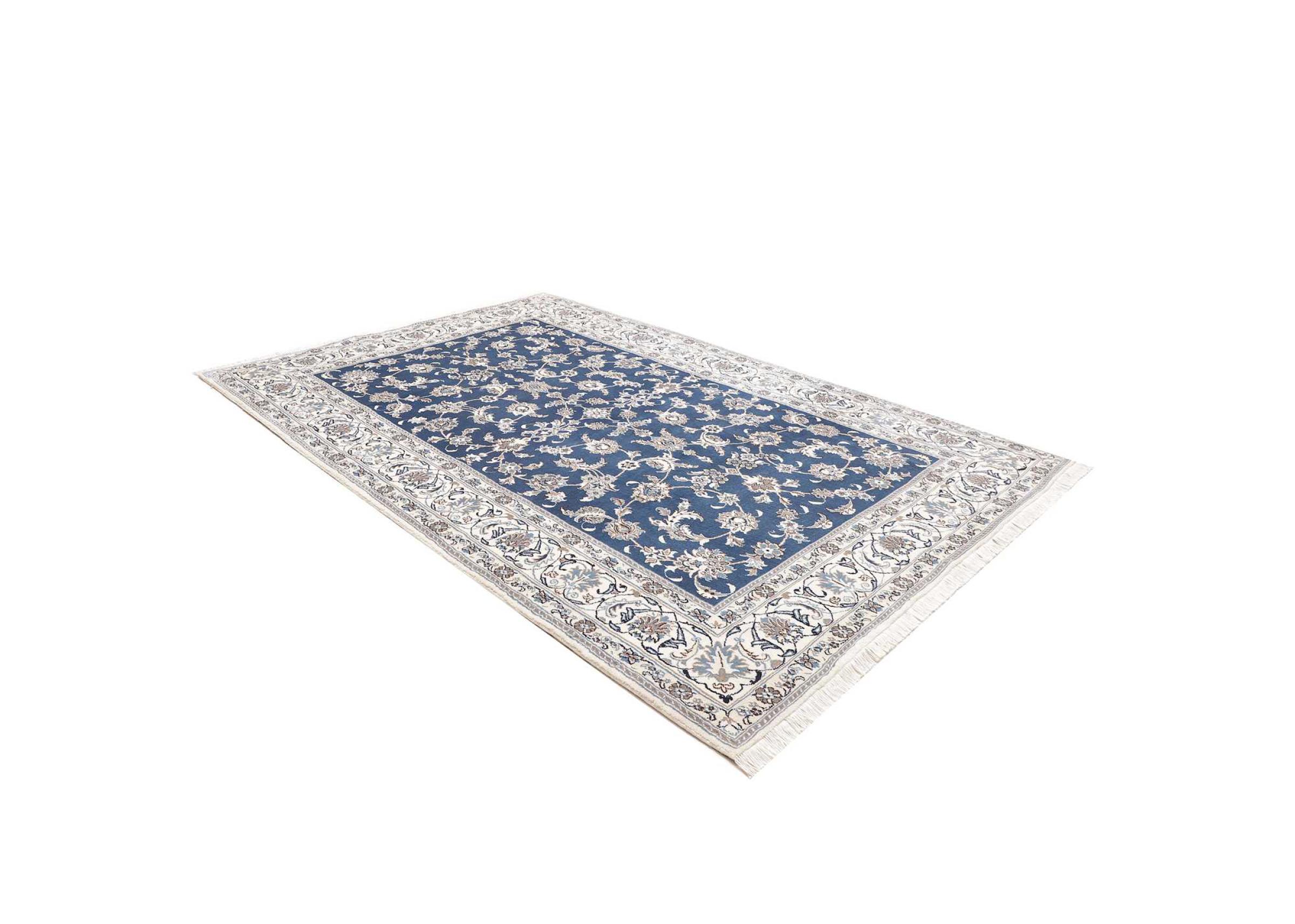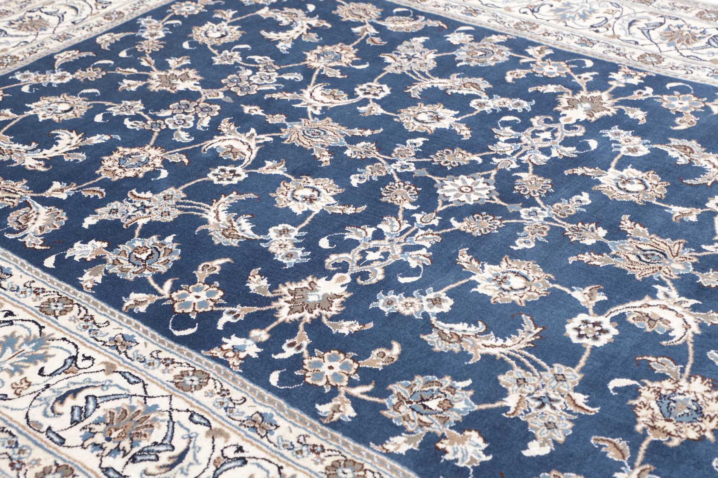 Dette Nain tæppe er vurderet til 12La. Det ser elegant og ædelt ud i sit typiske Nain-farveskema. Dette persiske tæppe blev håndknyttet af højkvalitets uld og natursilke i byen Nain, som ligger i den vestlige udkant af Dasht-e-Kavir-ørkenen. Med 12La er den ikke så fint og detaljeret udsmykket som en Nain 9La eller 6La.