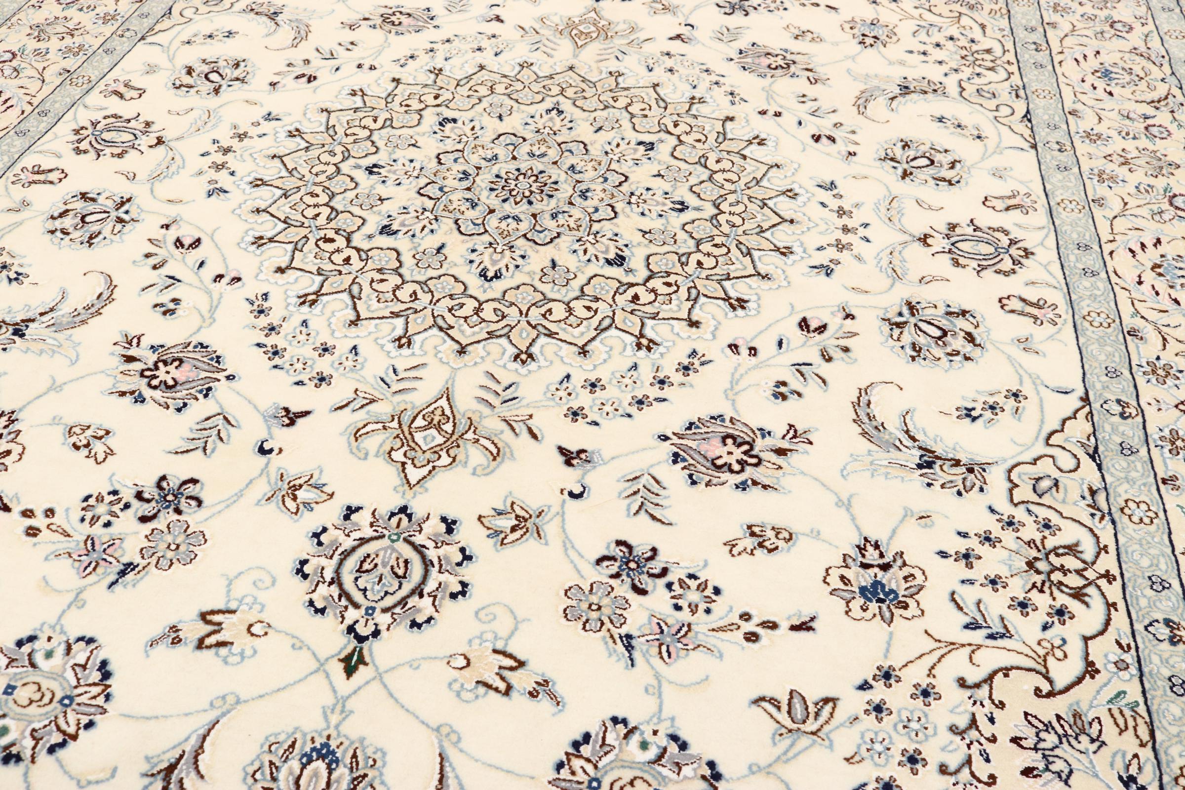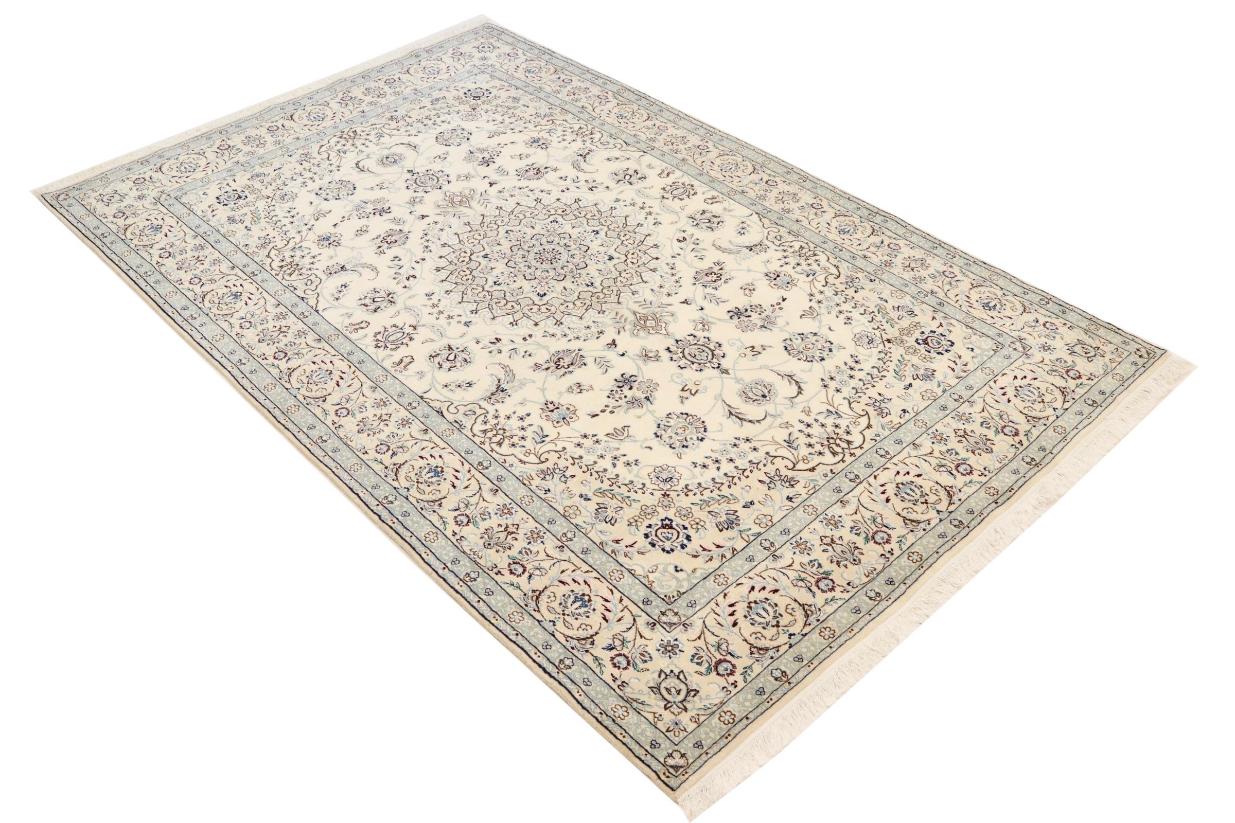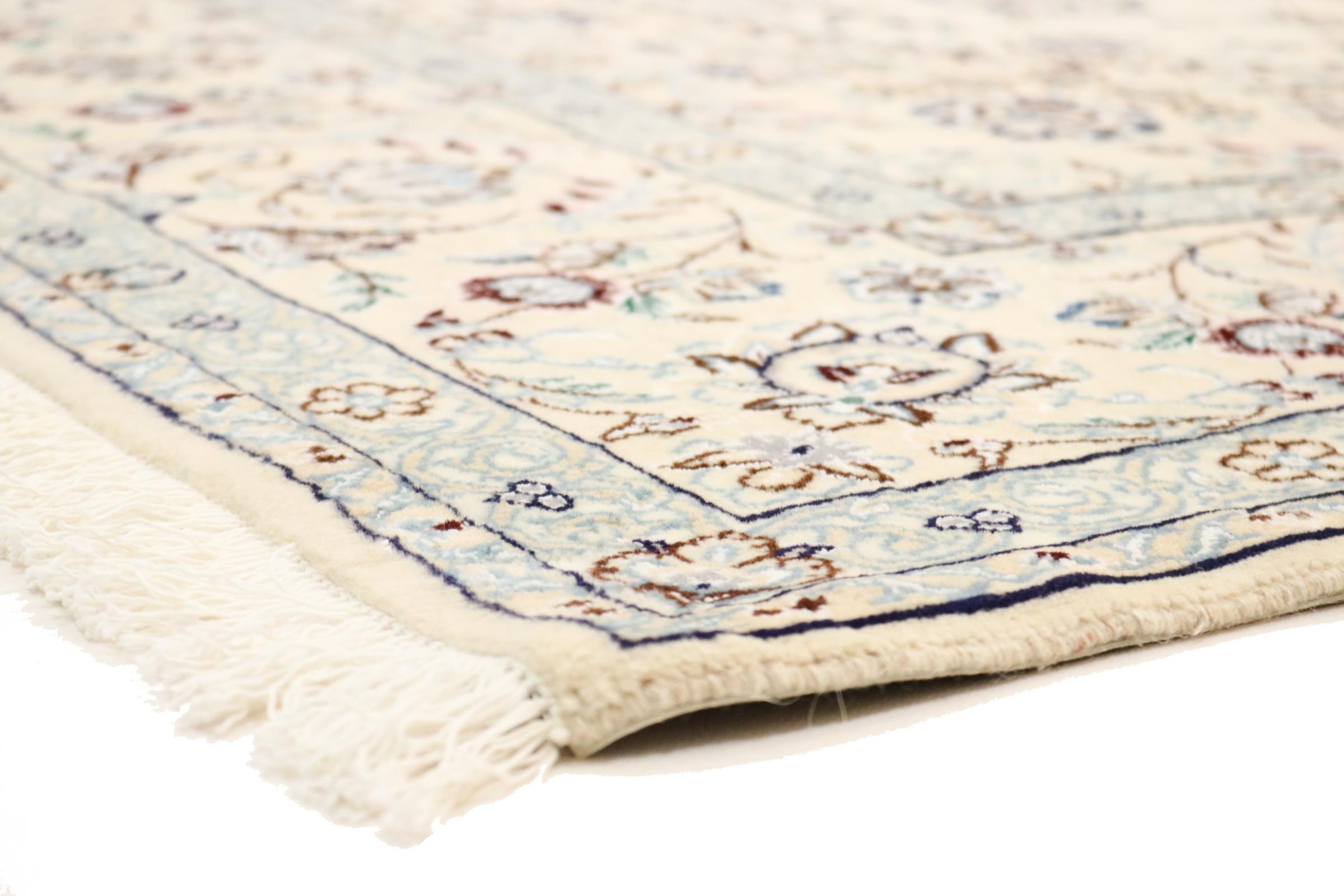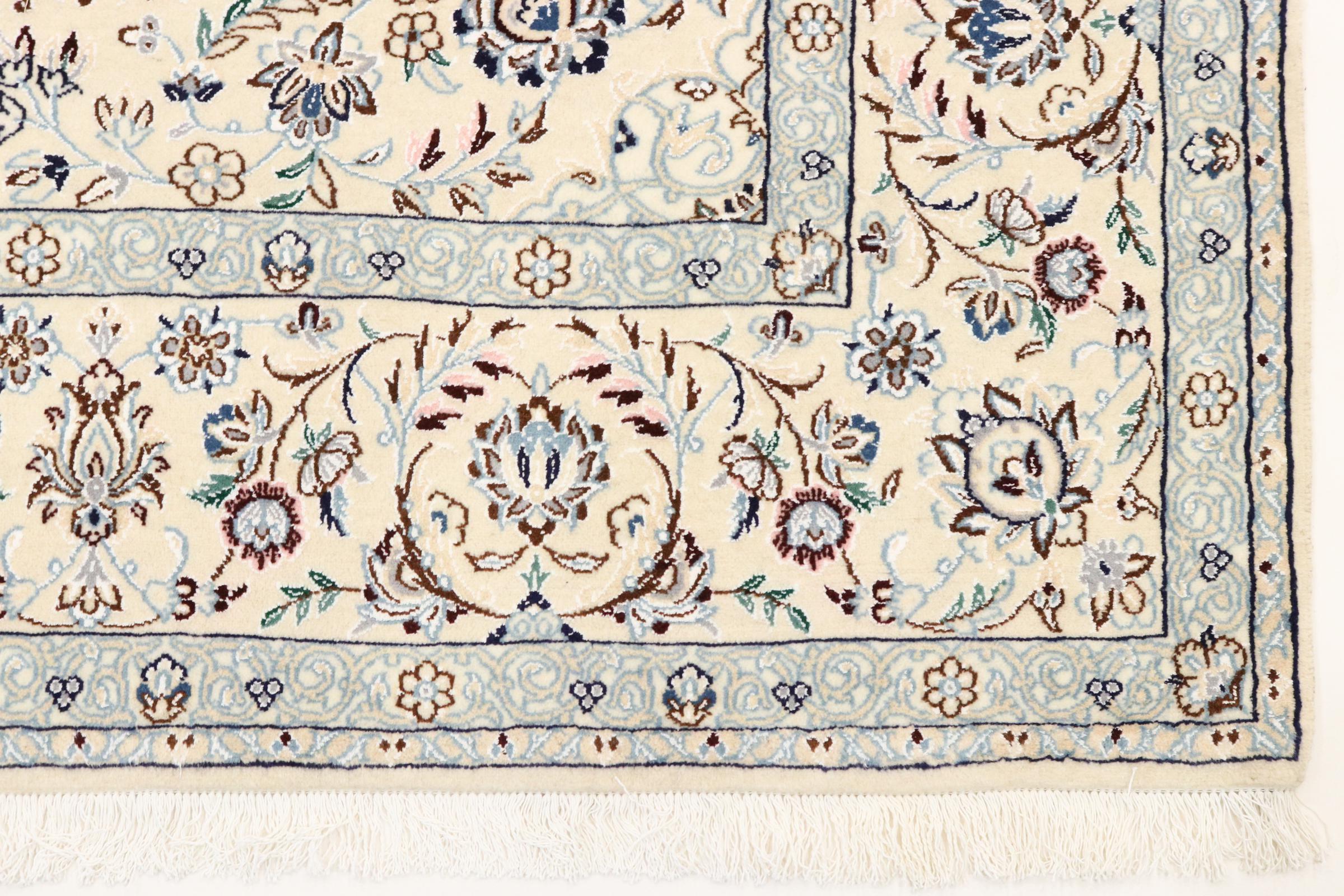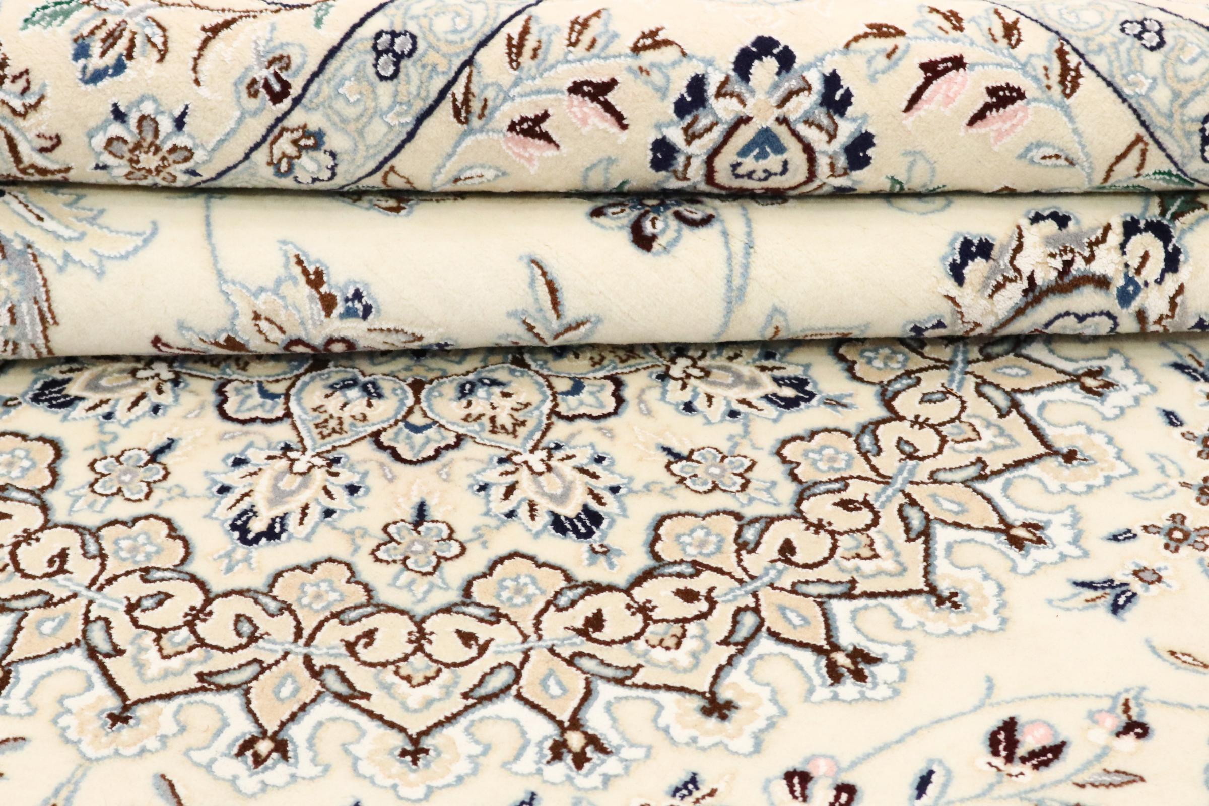 Dette Nain tæppe er vurderet til 12La. Det ser elegant og ædelt ud i sit typiske Nain-farveskema. Dette persiske tæppe blev håndknyttet af højkvalitets uld og natursilke i byen Nain, som ligger i den vestlige udkant af Dasht-e-Kavir-ørkenen. Med 12La er den ikke så fint og detaljeret udsmykket som en Nain 9La eller 6La.