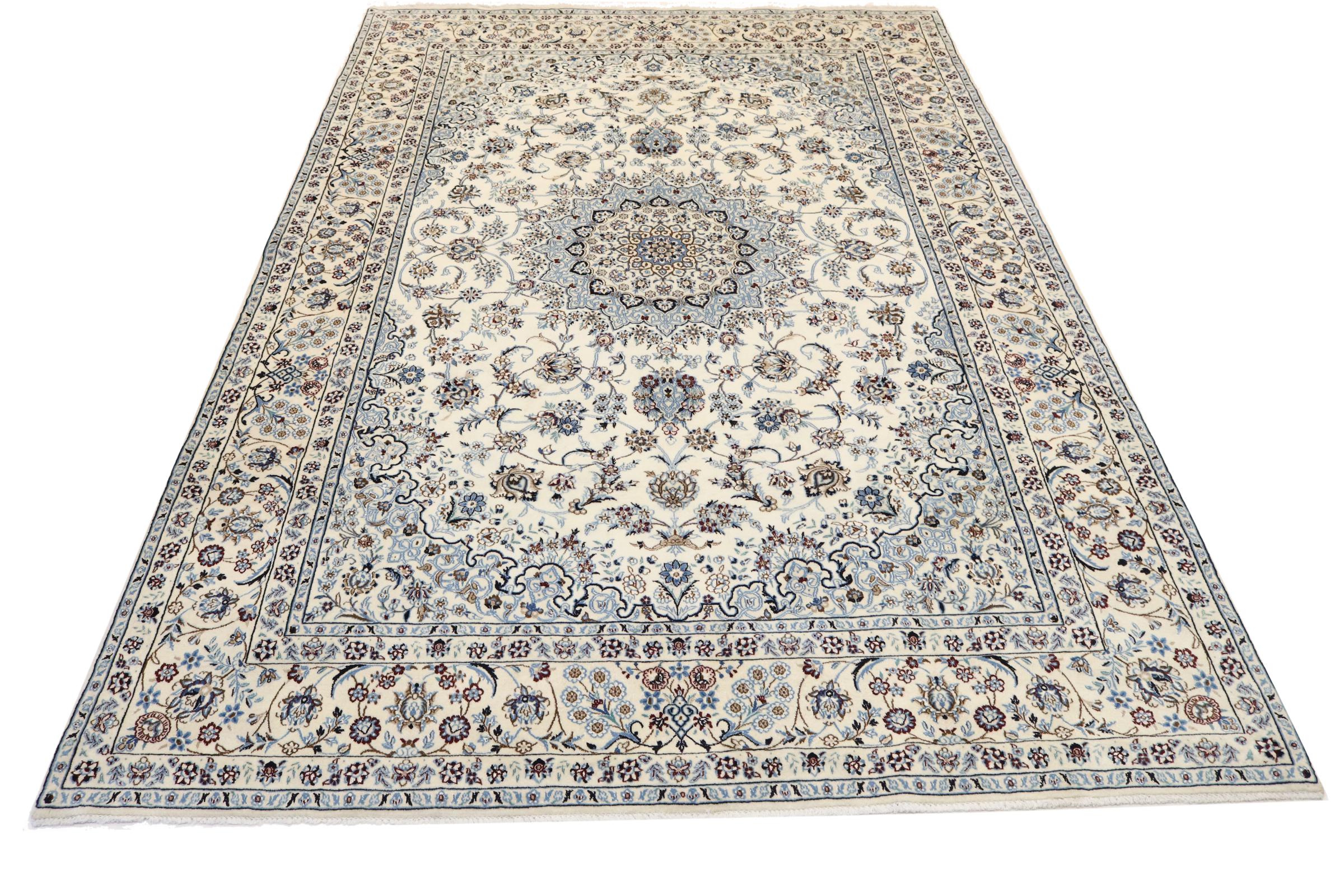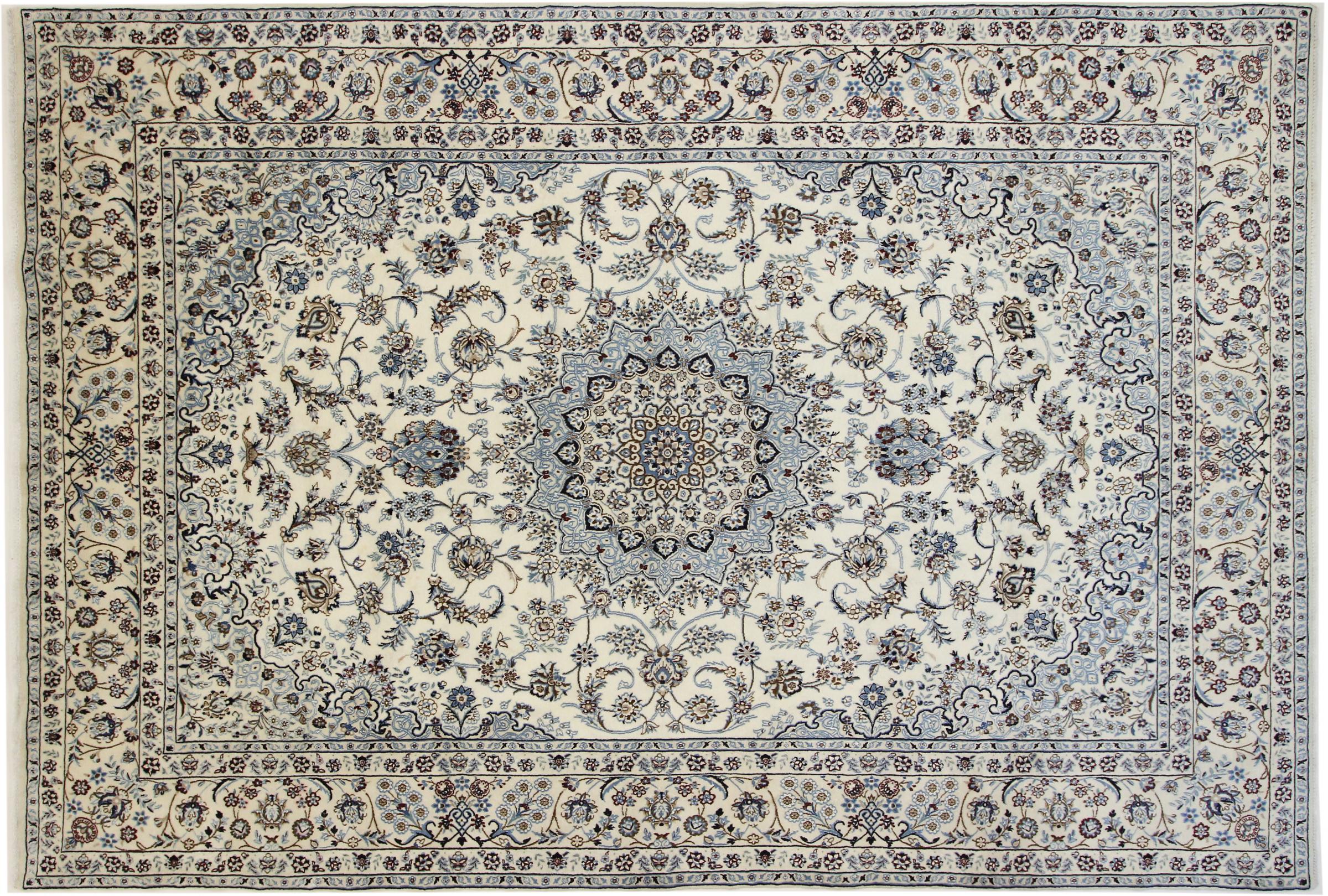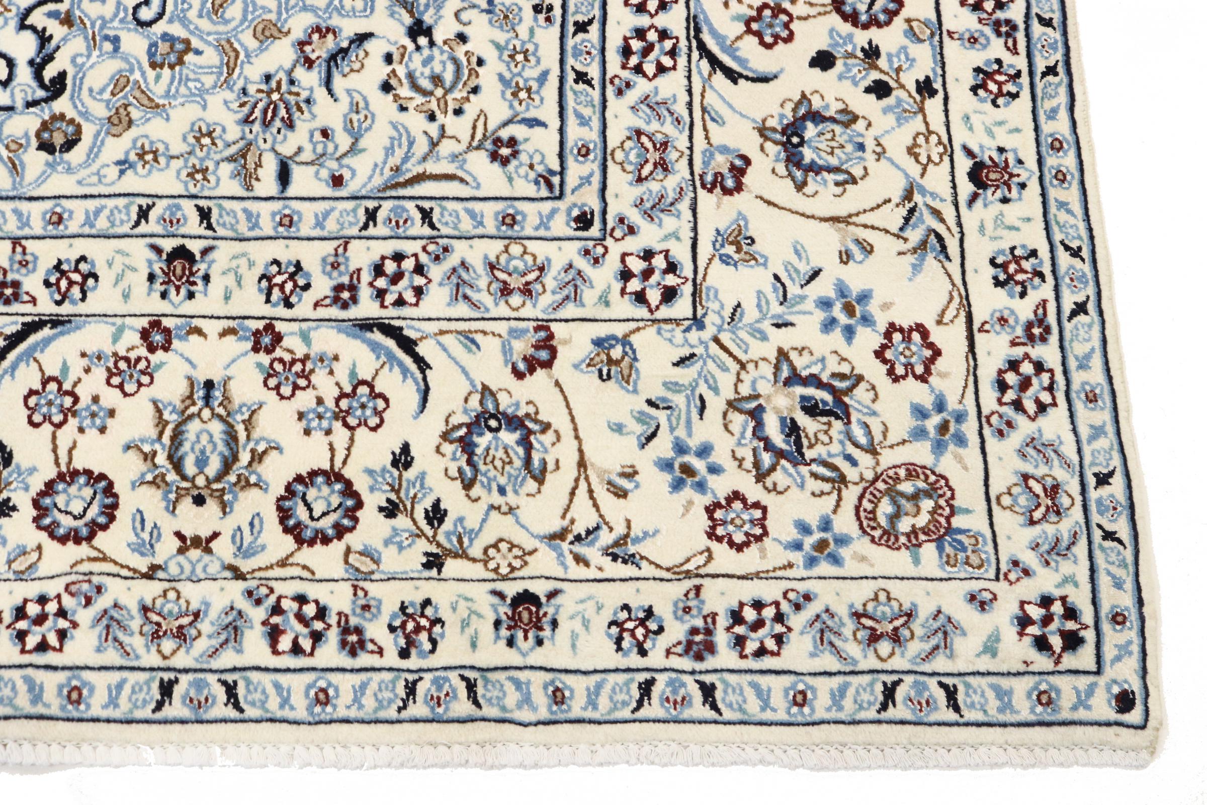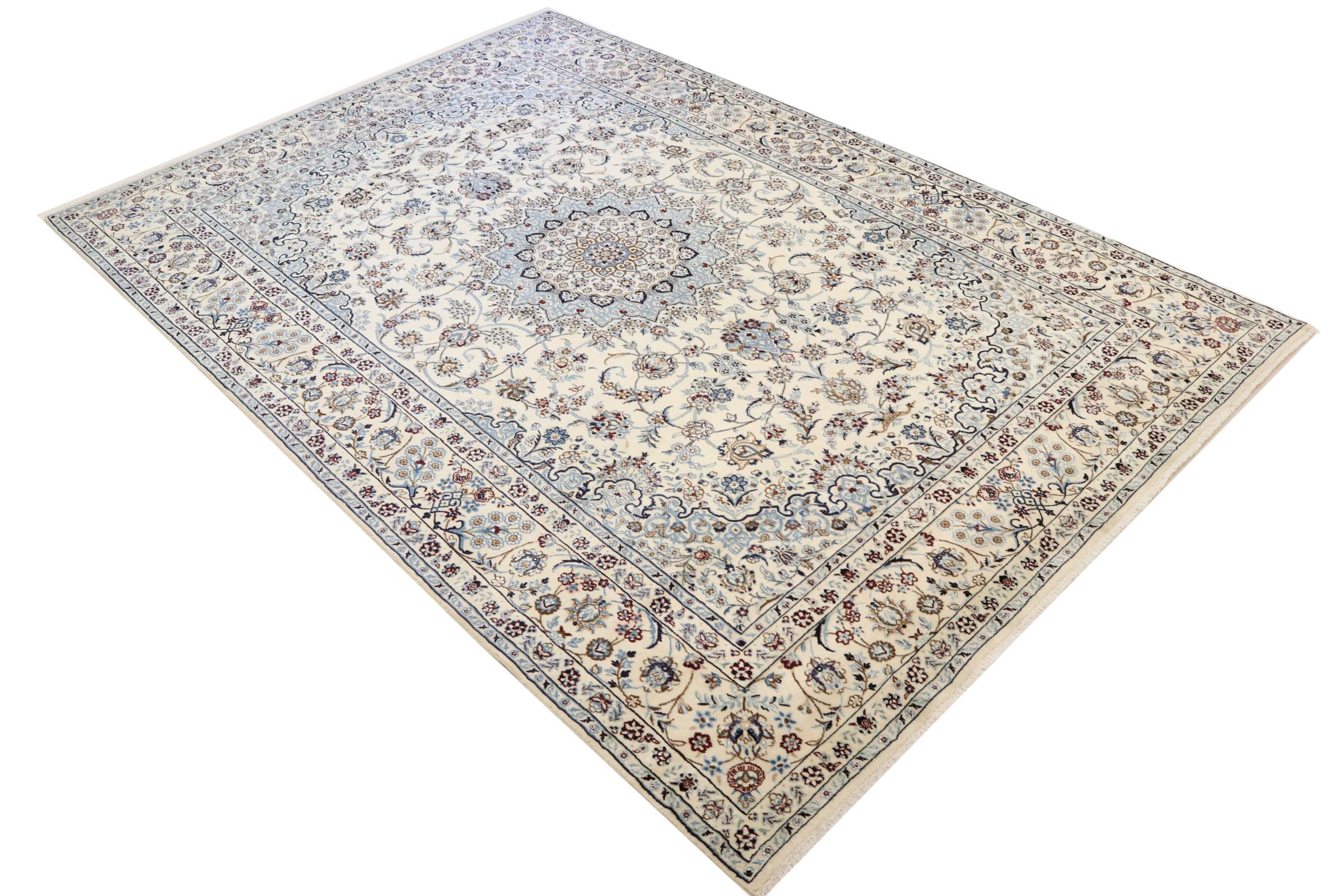 Dette Nain tæppe er vurderet til 12La. Det ser elegant og ædelt ud i sit typiske Nain-farveskema. Dette persiske tæppe blev håndknyttet af højkvalitets uld og natursilke i byen Nain, som ligger i den vestlige udkant af Dasht-e-Kavir-ørkenen. Med 12La er den ikke så fint og detaljeret udsmykket som en Nain 9La eller 6La.