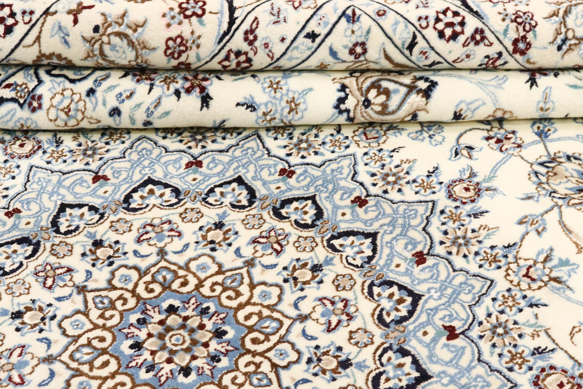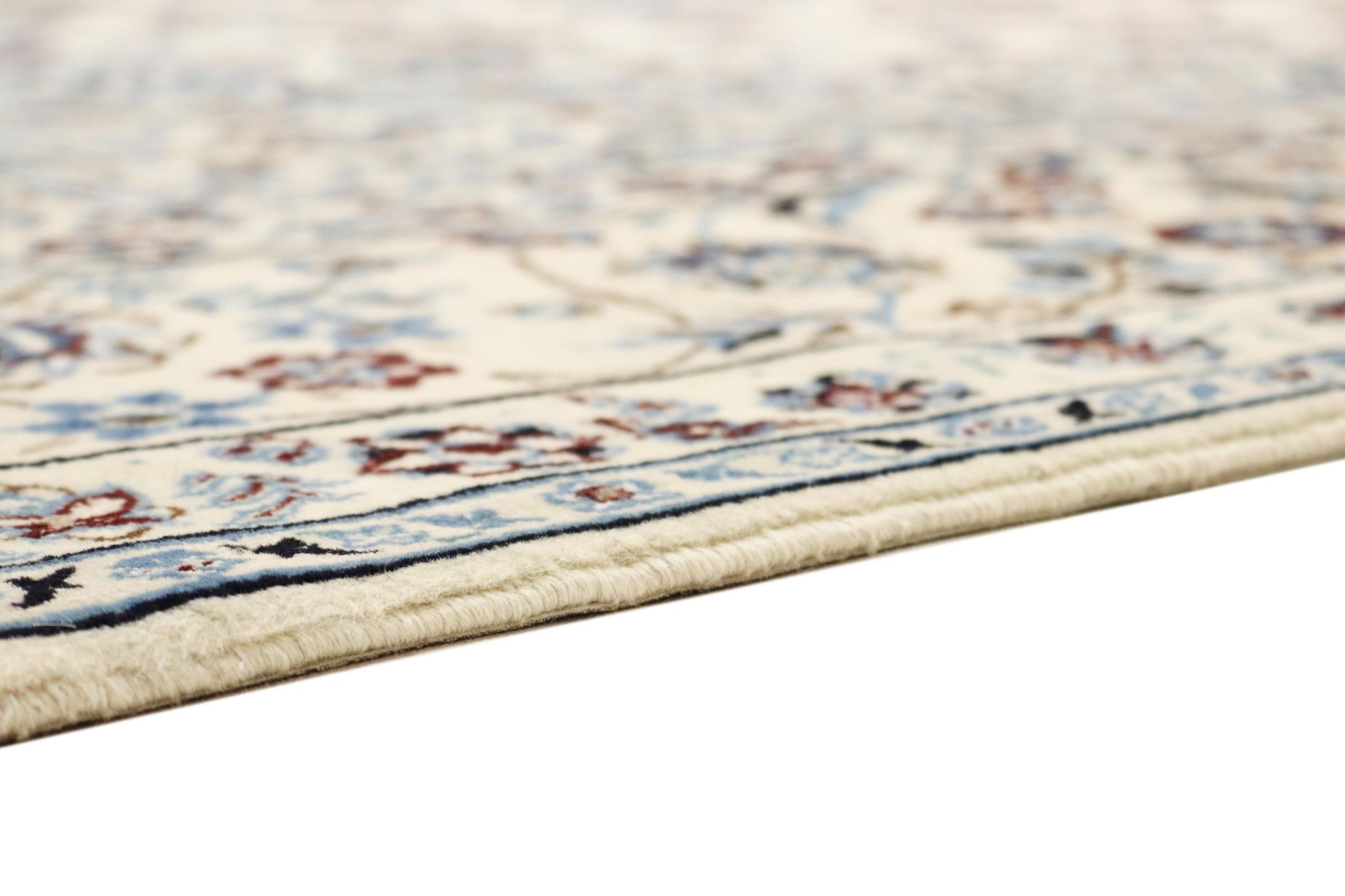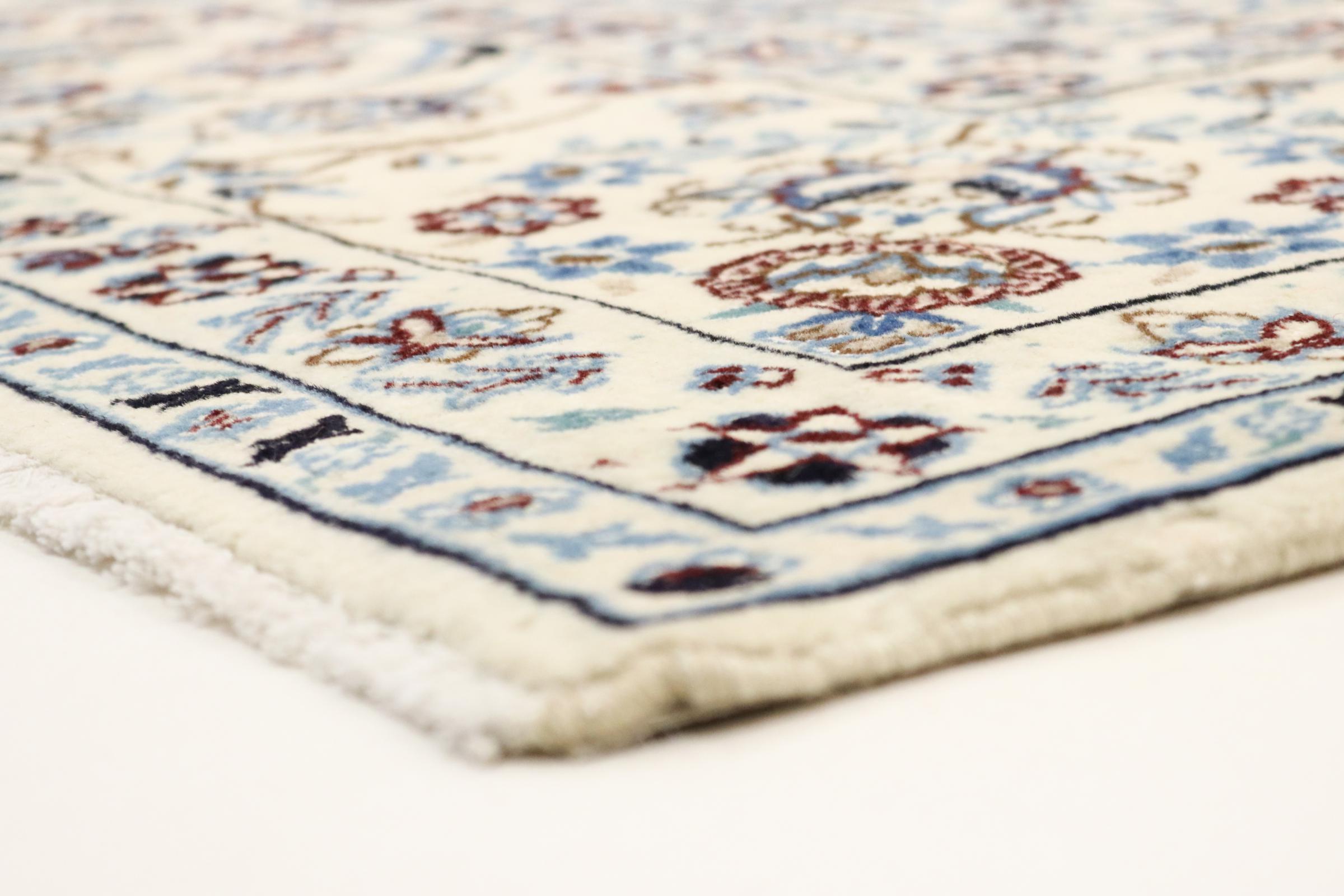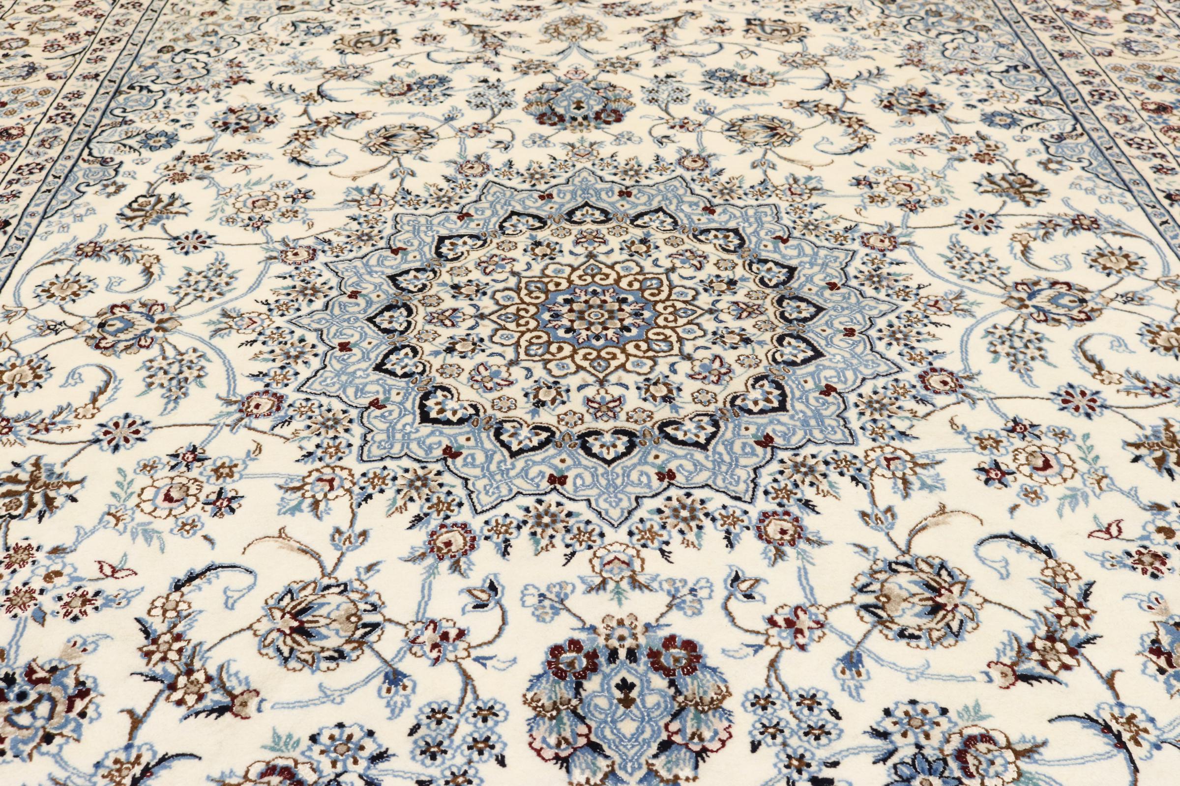 Dette Nain tæppe er vurderet til 12La. Det ser elegant og ædelt ud i sit typiske Nain-farveskema. Dette persiske tæppe blev håndknyttet af højkvalitets uld og natursilke i byen Nain, som ligger i den vestlige udkant af Dasht-e-Kavir-ørkenen. Med 12La er den ikke så fint og detaljeret udsmykket som en Nain 9La eller 6La.