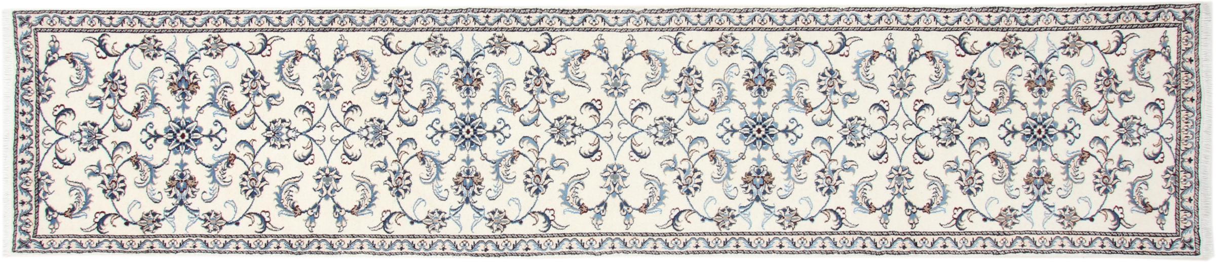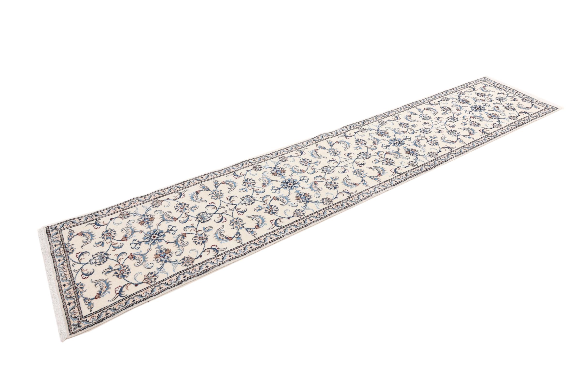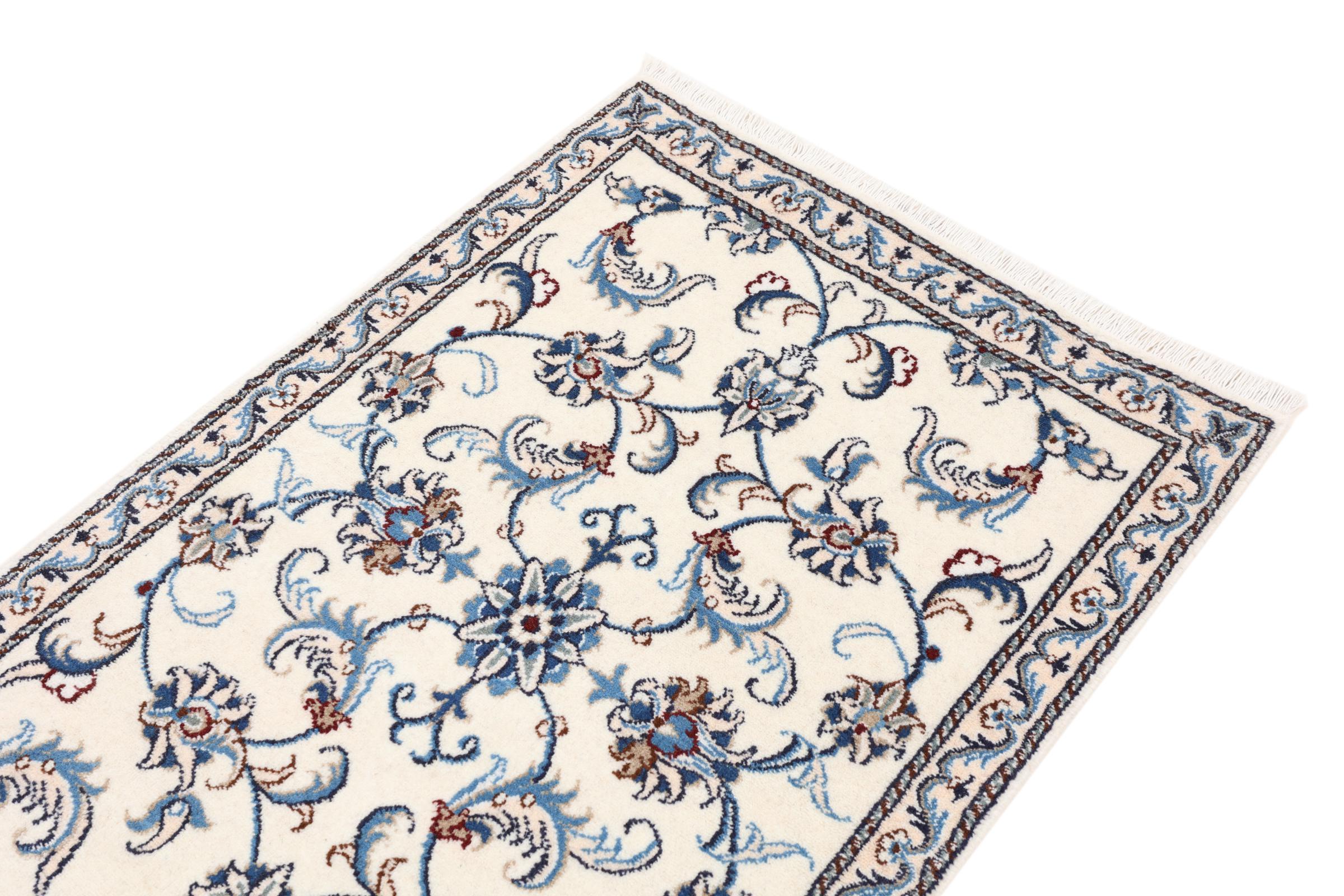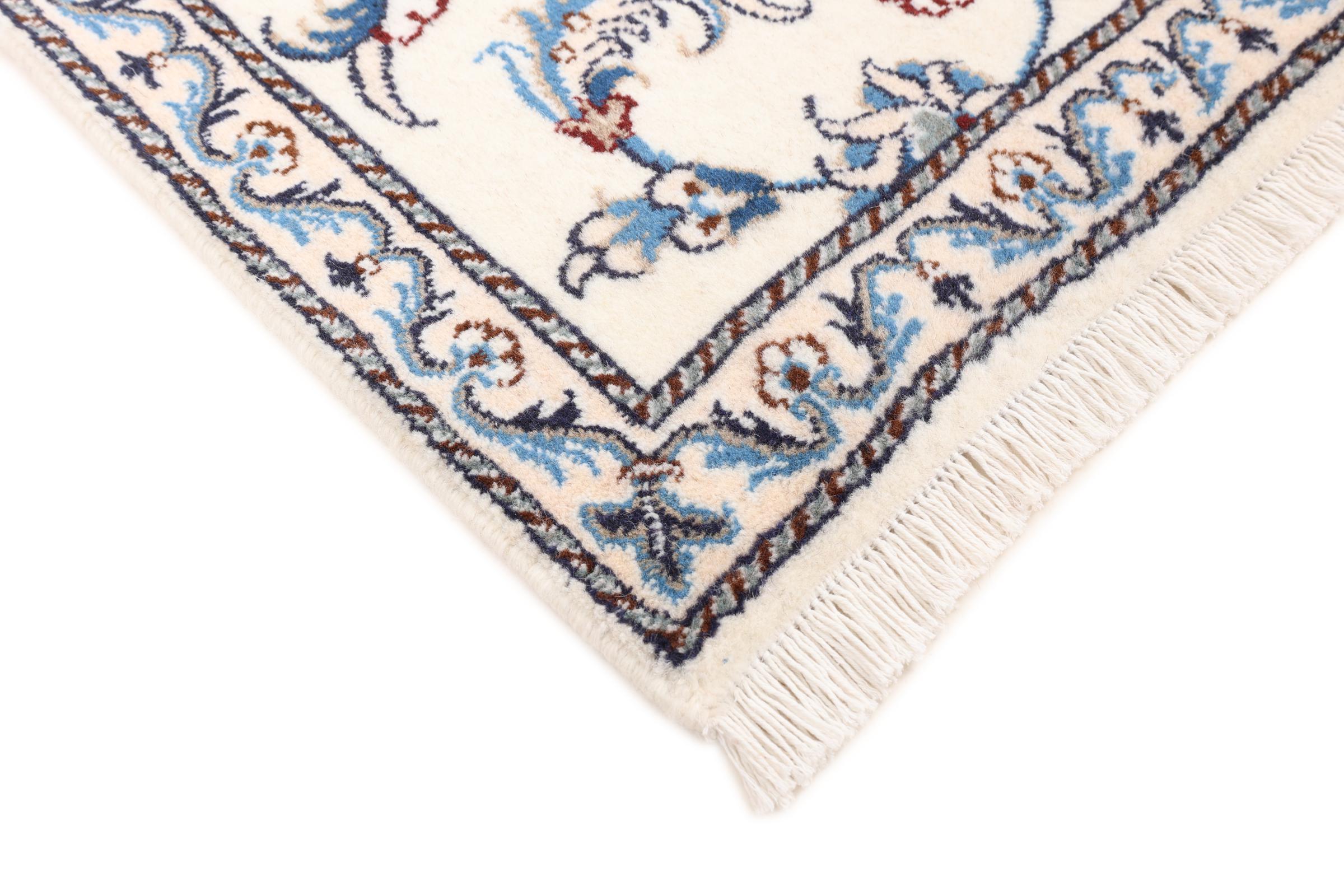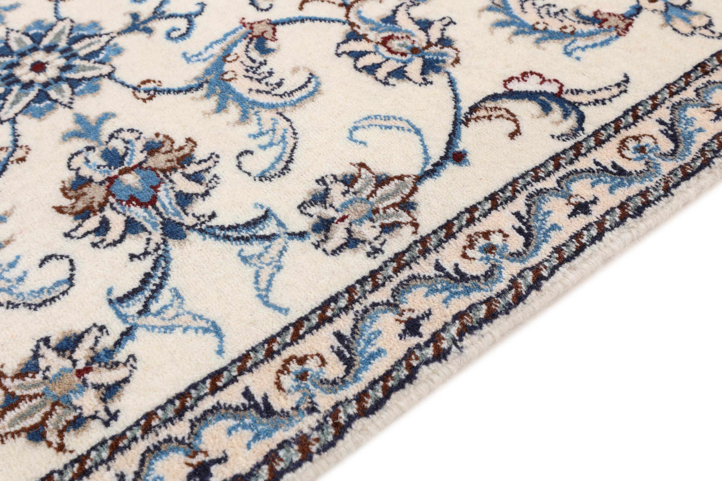 Dette Nain tæppe er vurderet til 12La. Det ser elegant og ædelt ud i sit typiske Nain-farveskema. Dette persiske tæppe blev håndknyttet af højkvalitets uld og natursilke i byen Nain, som ligger i den vestlige udkant af Dasht-e-Kavir-ørkenen. Med 12La er den ikke så fint og detaljeret udsmykket som en Nain 9La eller 6La.