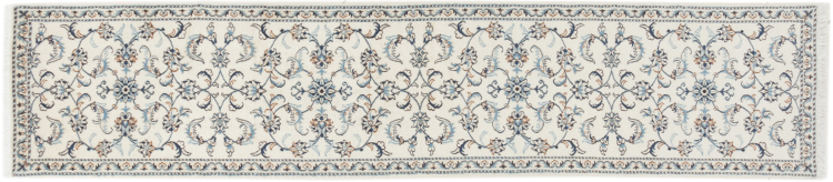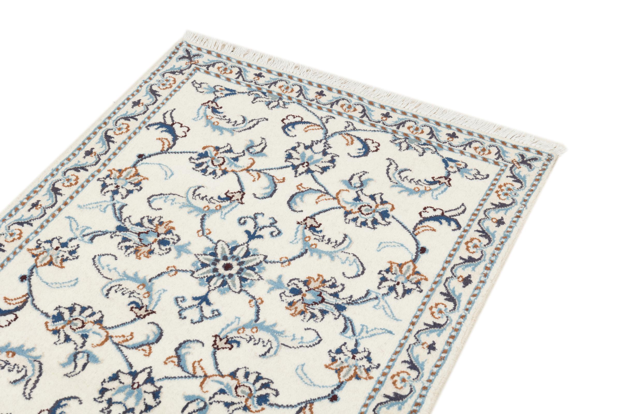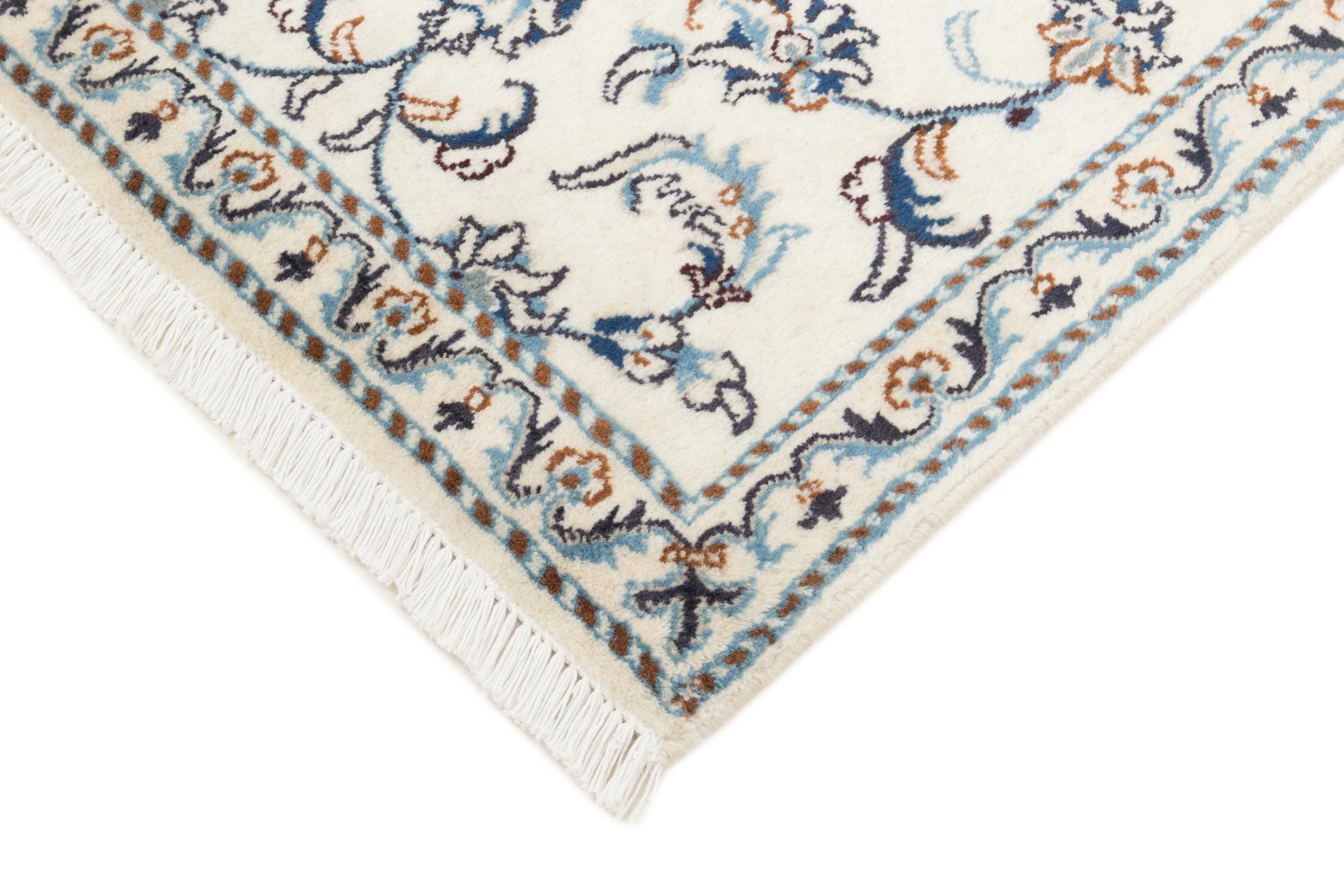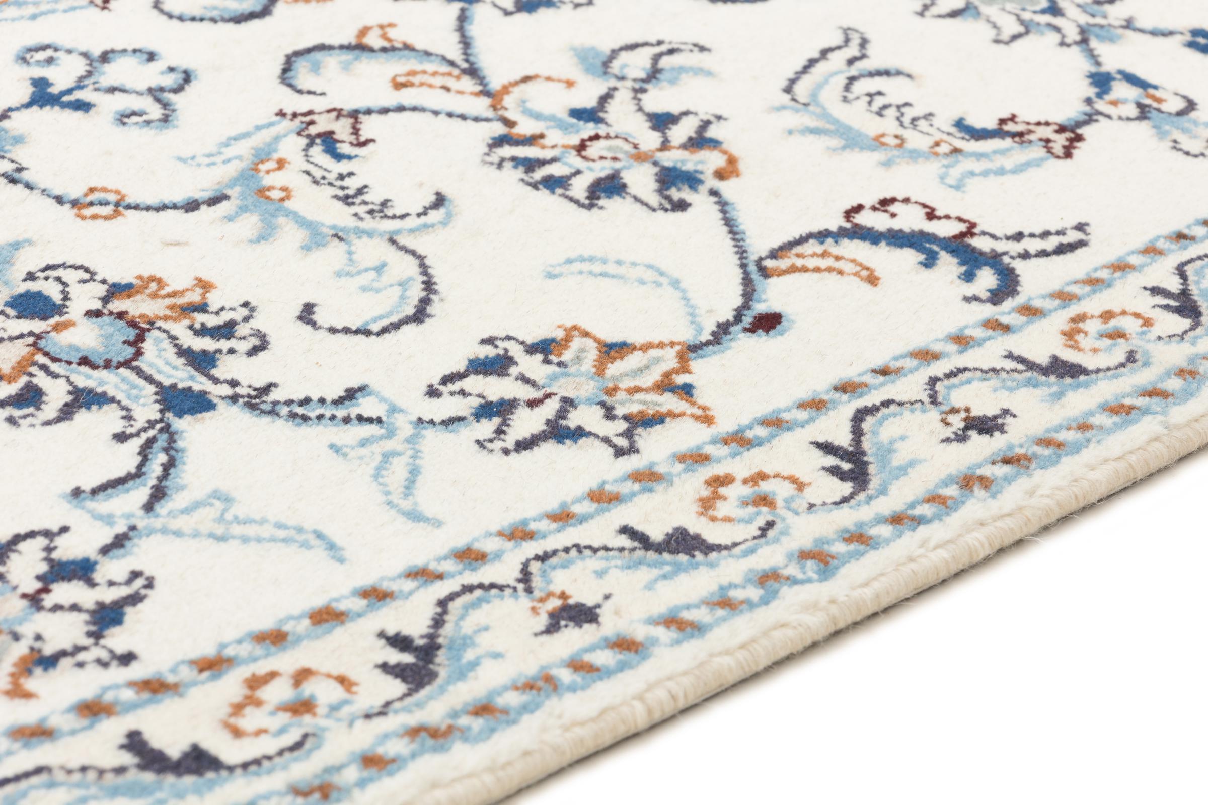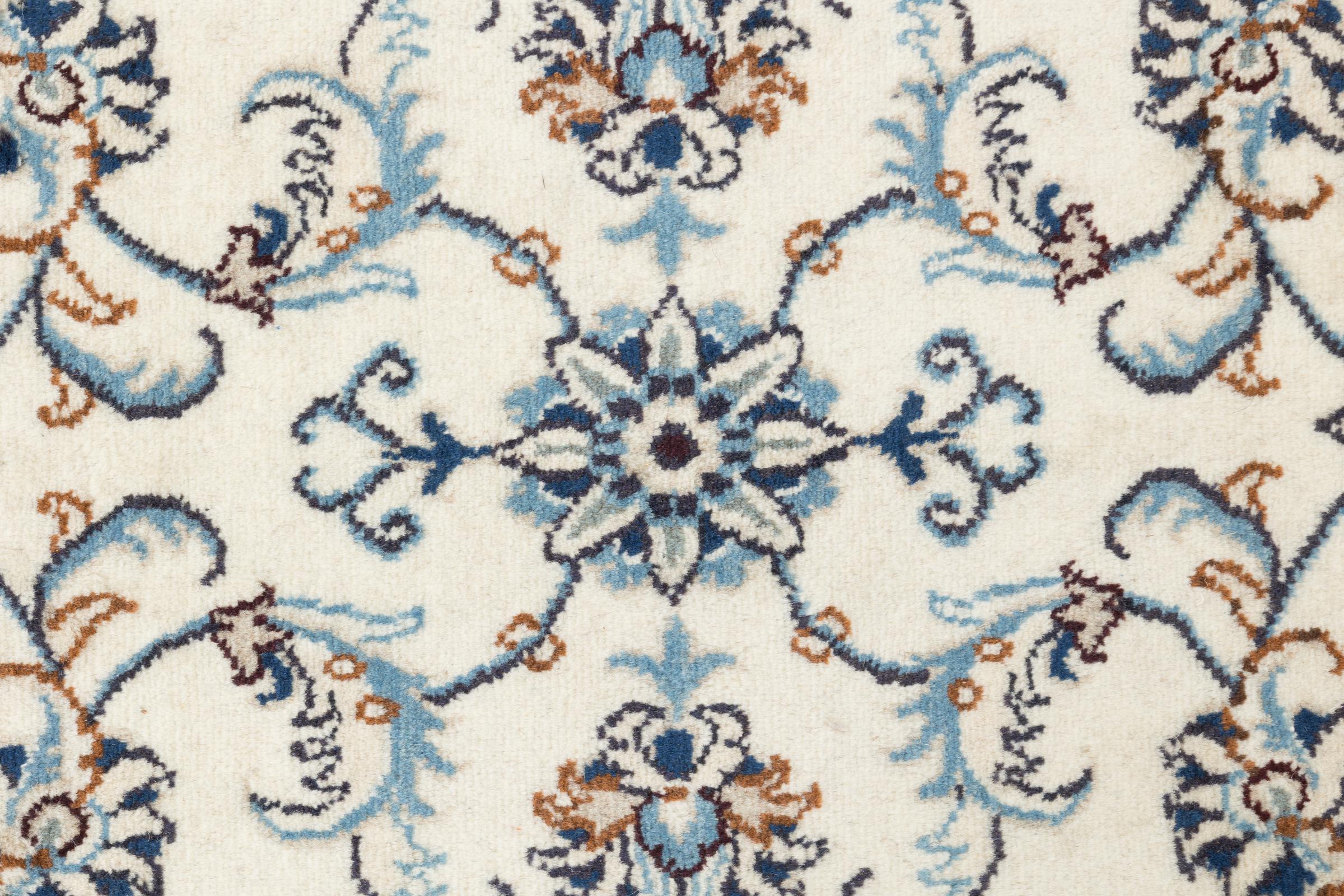 Dette Nain tæppe er vurderet til 12La. Det ser elegant og ædelt ud i sit typiske Nain-farveskema. Dette persiske tæppe blev håndknyttet af højkvalitets uld og natursilke i byen Nain, som ligger i den vestlige udkant af Dasht-e-Kavir-ørkenen. Med 12La er den ikke så fint og detaljeret udsmykket som en Nain 9La eller 6La.