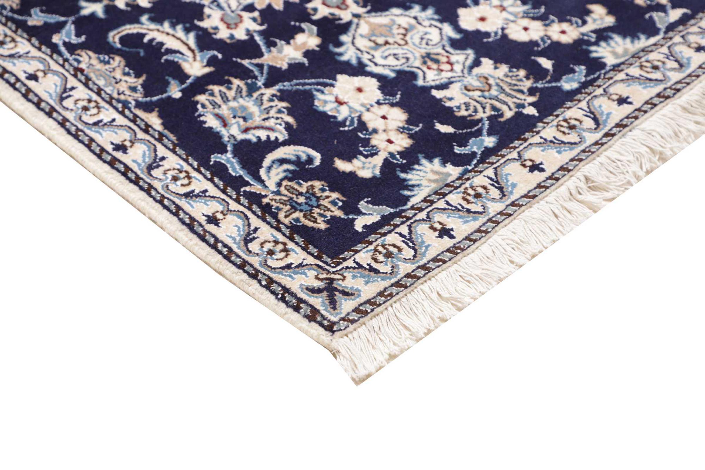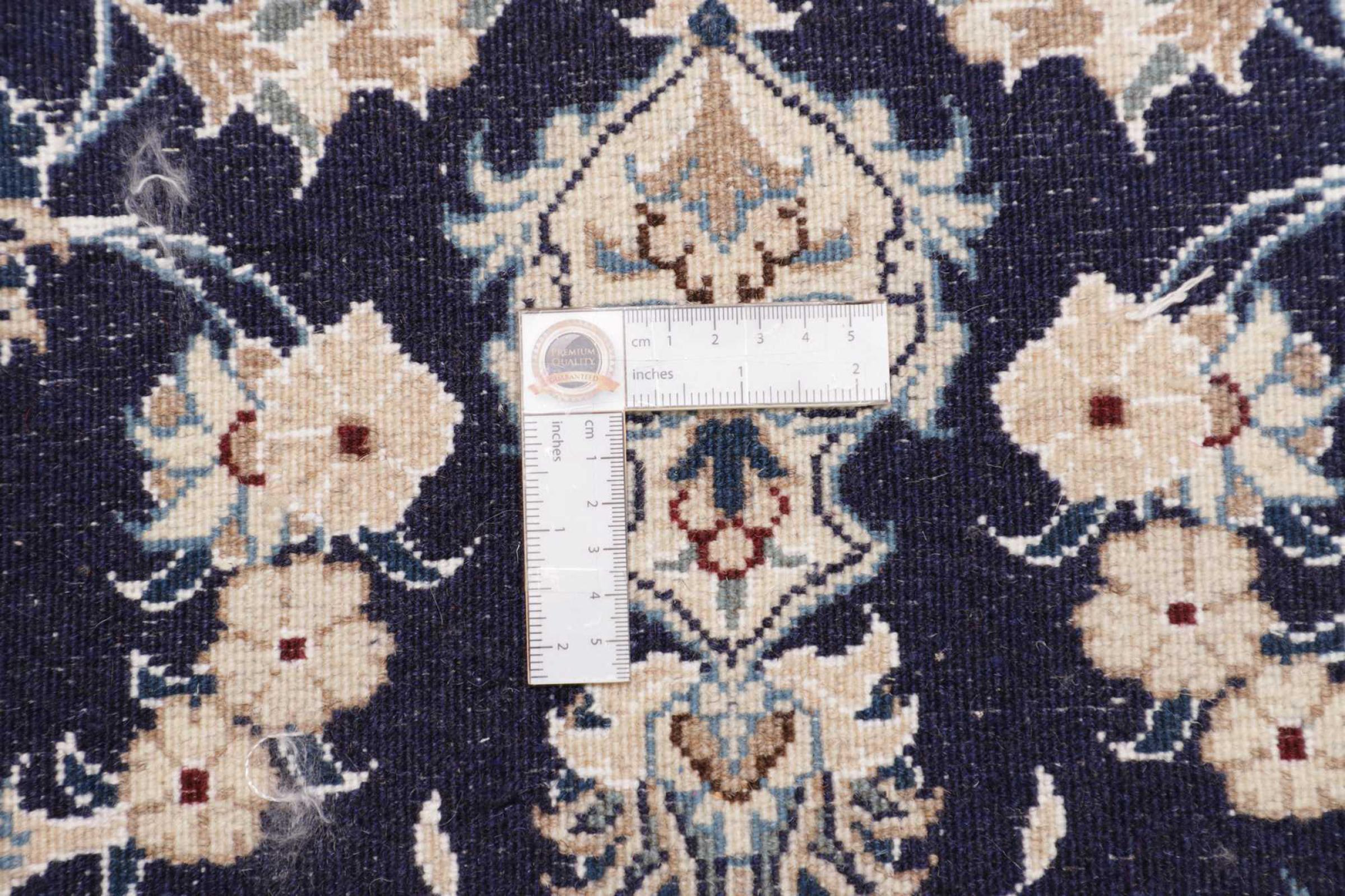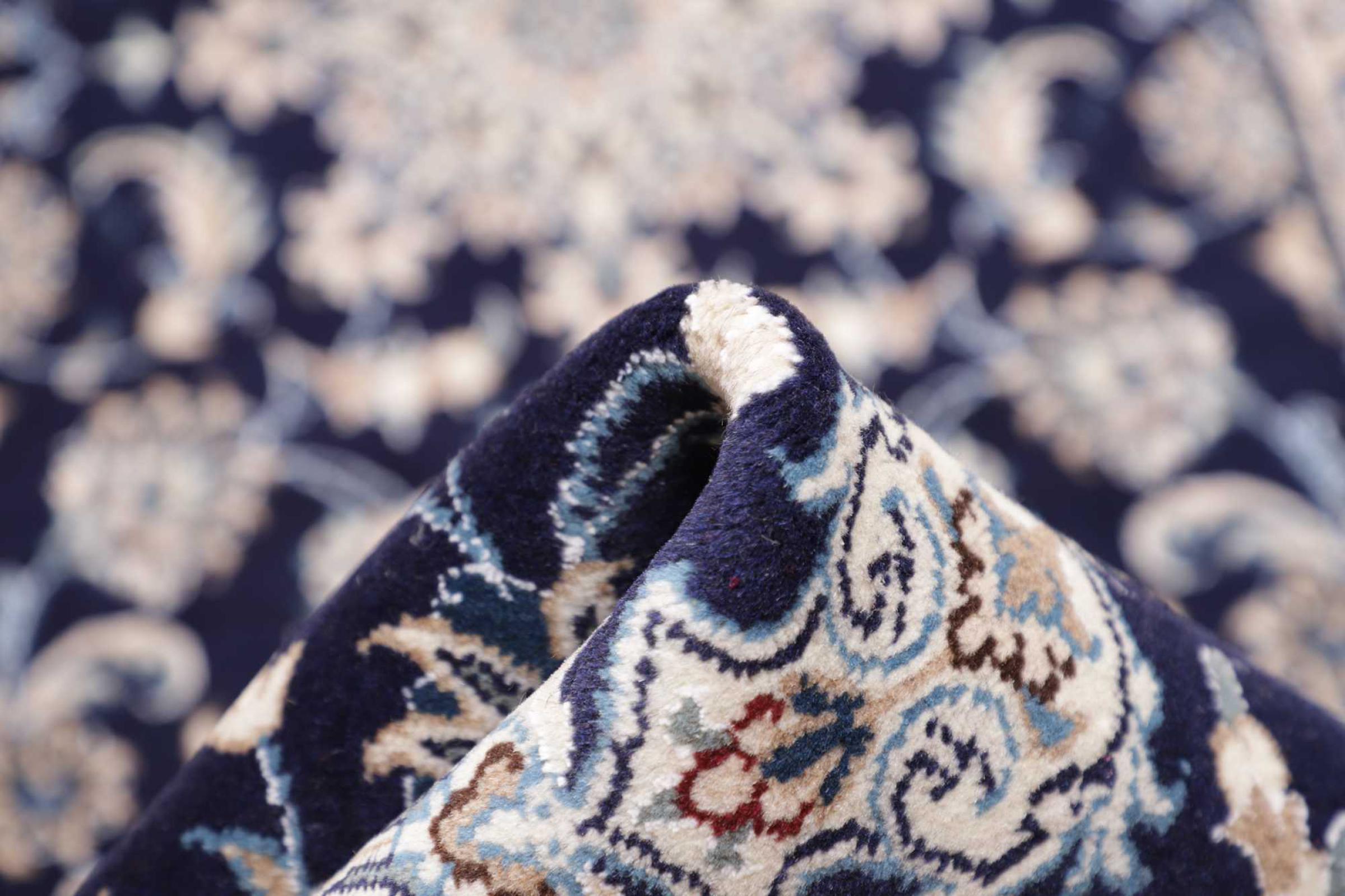 Dette Nain tæppe er vurderet til 12La. Det ser elegant og ædelt ud i sit typiske Nain-farveskema. Dette persiske tæppe blev håndknyttet af højkvalitets uld og natursilke i byen Nain, som ligger i den vestlige udkant af Dasht-e-Kavir-ørkenen. Med 12La er den ikke så fint og detaljeret udsmykket som en Nain 9La eller 6La.