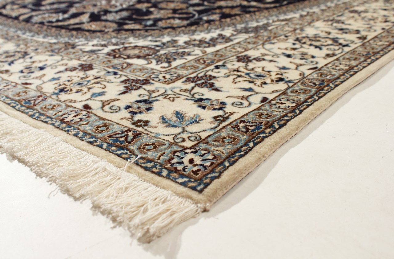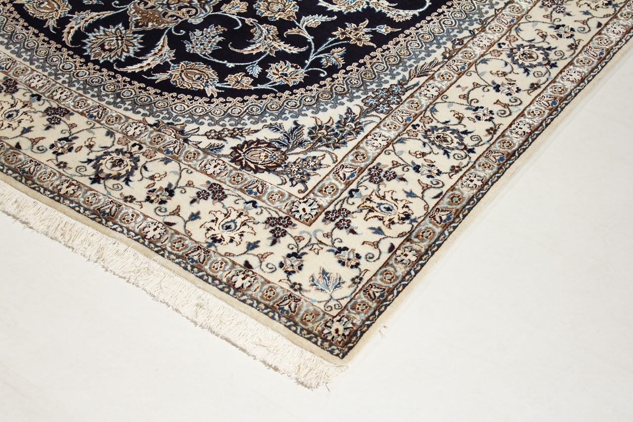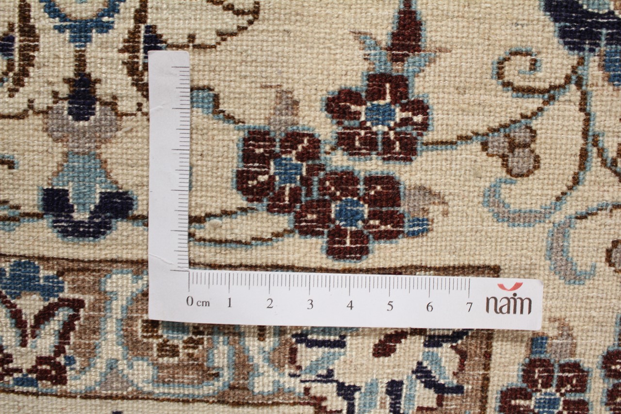 Dette Nain-tæppe kombinerer kvalitet, tradition og et umiskendeligt design. Den blev håndknyttet i ørkenbyen af ​​samme navn, Nain, af højkvalitets korkuld og natursilke. Elskere af værdifulde tæpper fra Iran vil kunne lide dette persiske tæppe. Med Nain-tæpper i 6La og 4La-klassificeringen har du et rigtigt kunstværk med et utroligt detaljeringsniveau, som du bogstaveligt talt kan fare vild. Nain 4La-tæpper er svære at finde i dag, fordi de er ekstremt komplekse at producere.