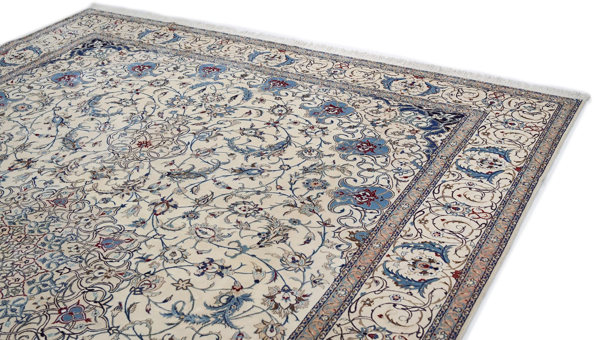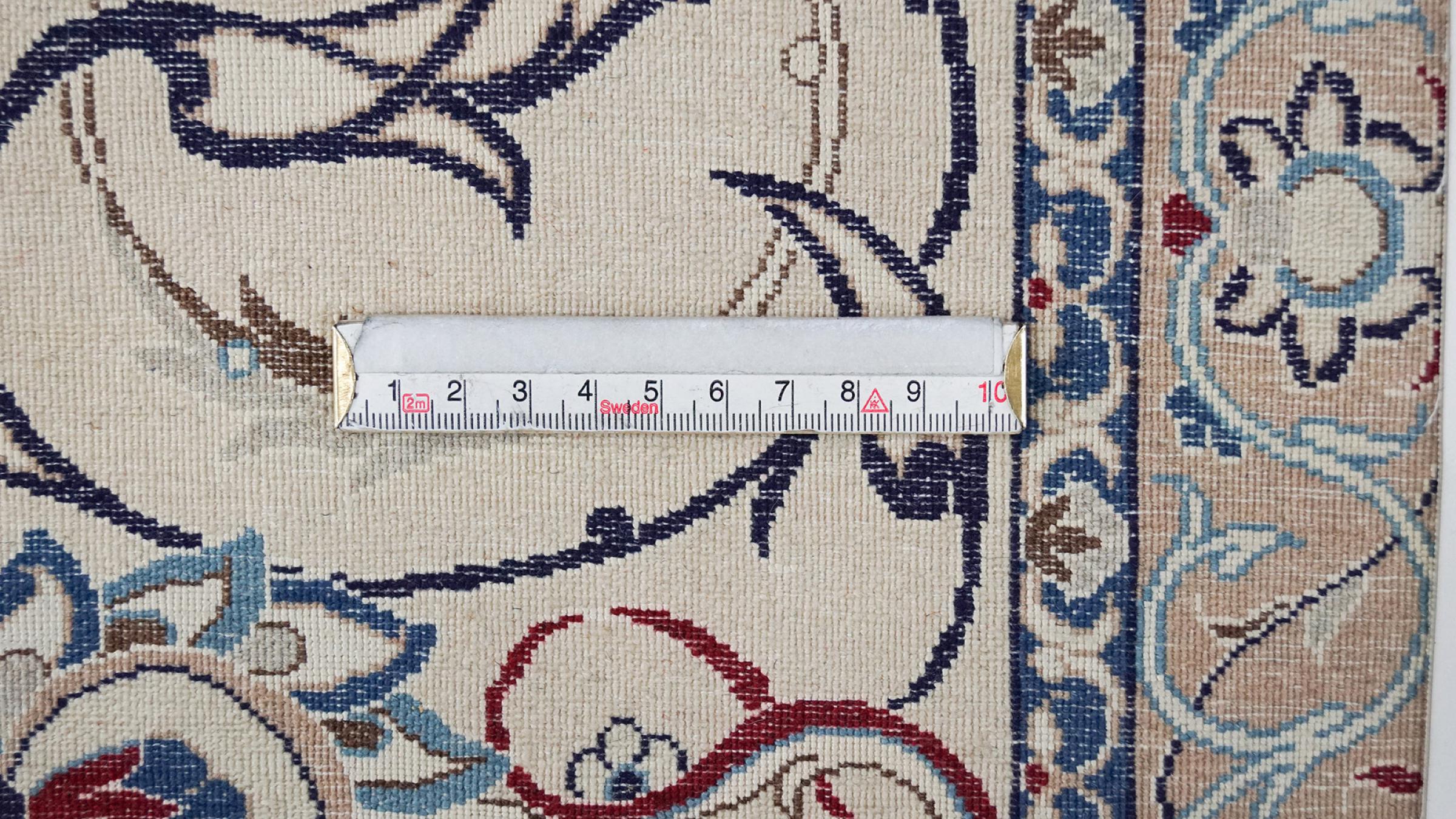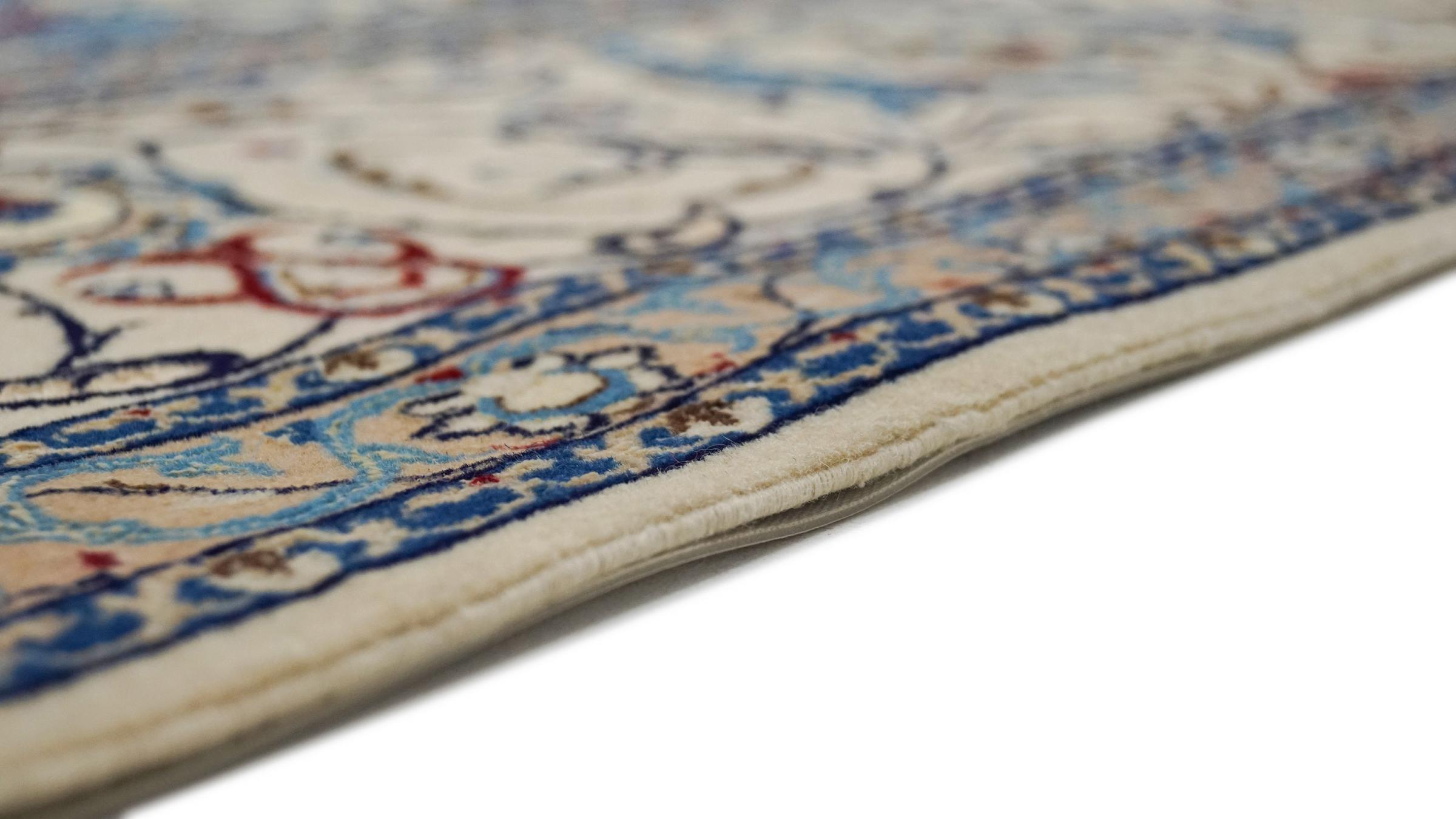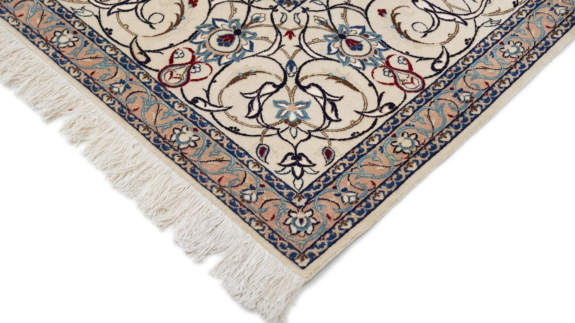 Dette Nain-tæppe kombinerer kvalitet, tradition og et umiskendeligt design. Den blev håndknyttet i ørkenbyen af ​​samme navn, Nain, af højkvalitets korkuld og natursilke. Elskere af værdifulde tæpper fra Iran vil kunne lide dette persiske tæppe. Med Nain-tæpper i 6La og 4La-klassificeringen har du et rigtigt kunstværk med et utroligt detaljeringsniveau, som du bogstaveligt talt kan fare vild. Nain 4La-tæpper er svære at finde i dag, fordi de er ekstremt komplekse at producere.