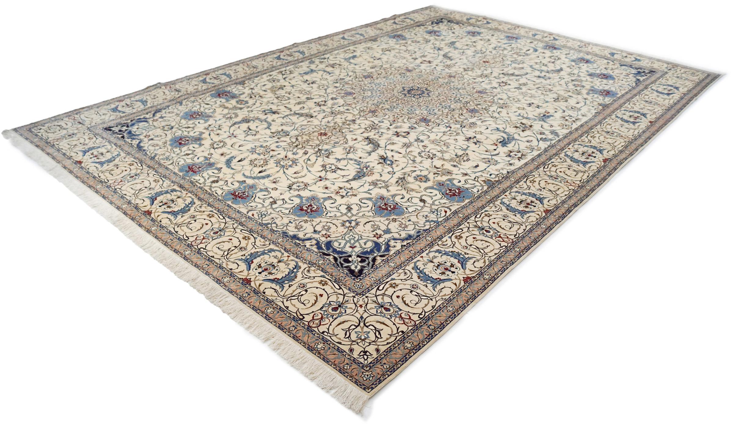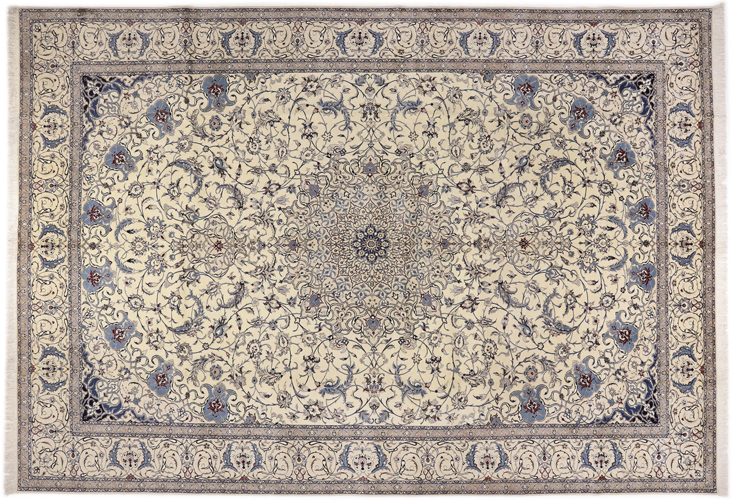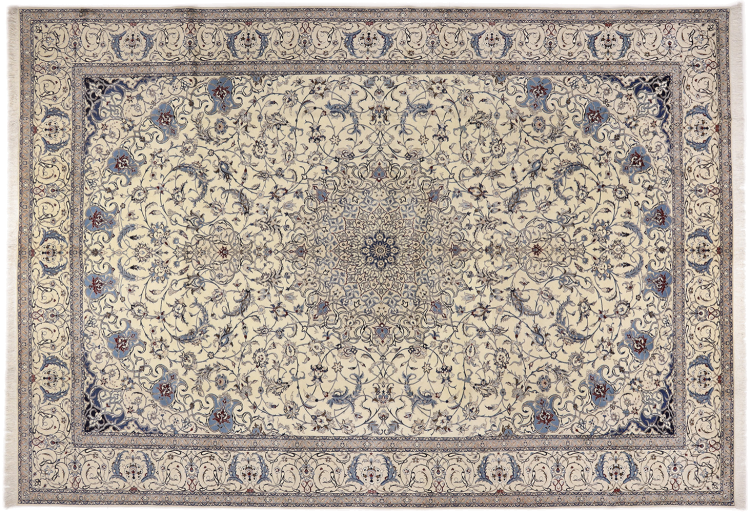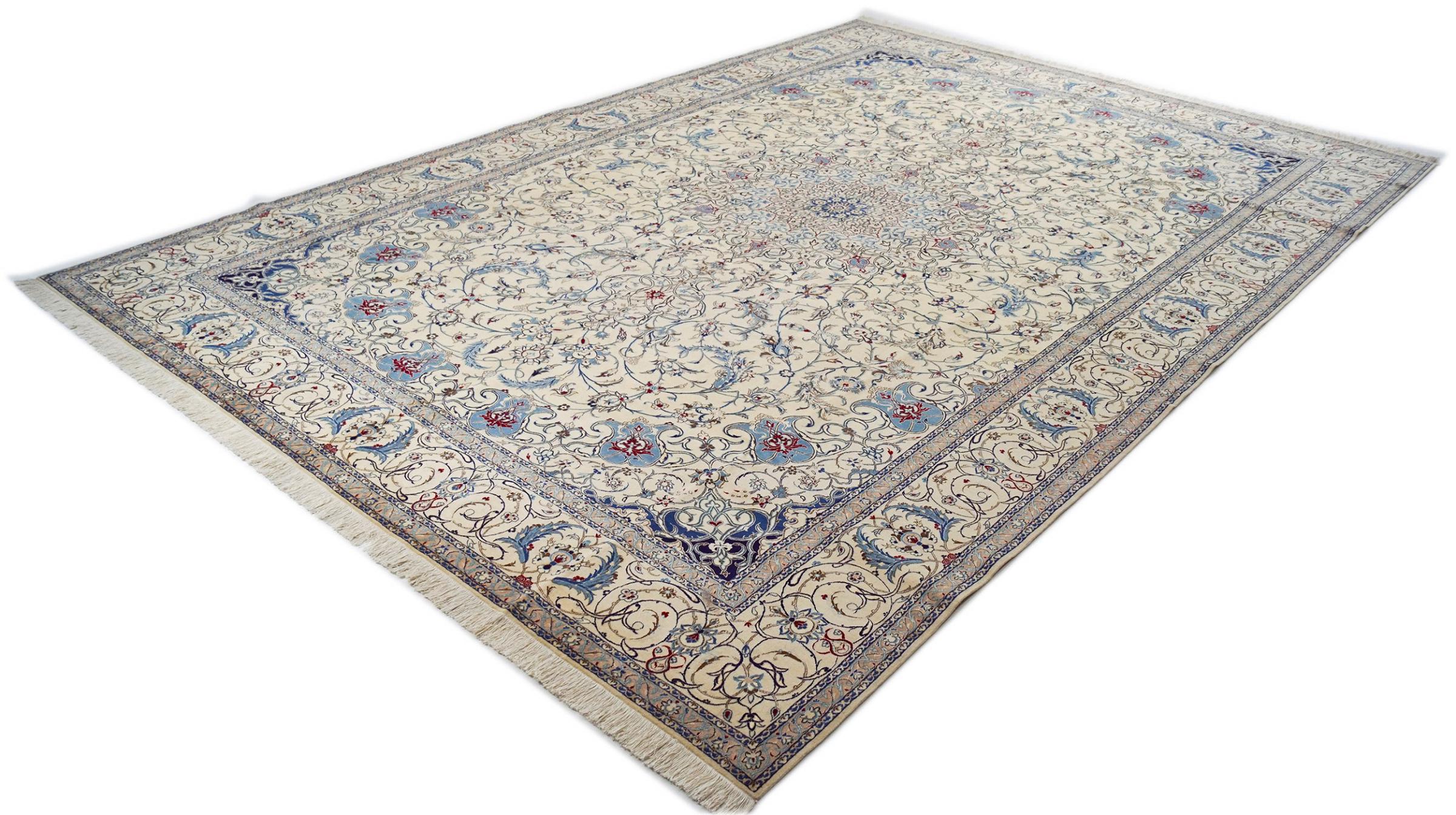 Dette Nain-tæppe kombinerer kvalitet, tradition og et umiskendeligt design. Den blev håndknyttet i ørkenbyen af ​​samme navn, Nain, af højkvalitets korkuld og natursilke. Elskere af værdifulde tæpper fra Iran vil kunne lide dette persiske tæppe. Med Nain-tæpper i 6La og 4La-klassificeringen har du et rigtigt kunstværk med et utroligt detaljeringsniveau, som du bogstaveligt talt kan fare vild. Nain 4La-tæpper er svære at finde i dag, fordi de er ekstremt komplekse at producere.
