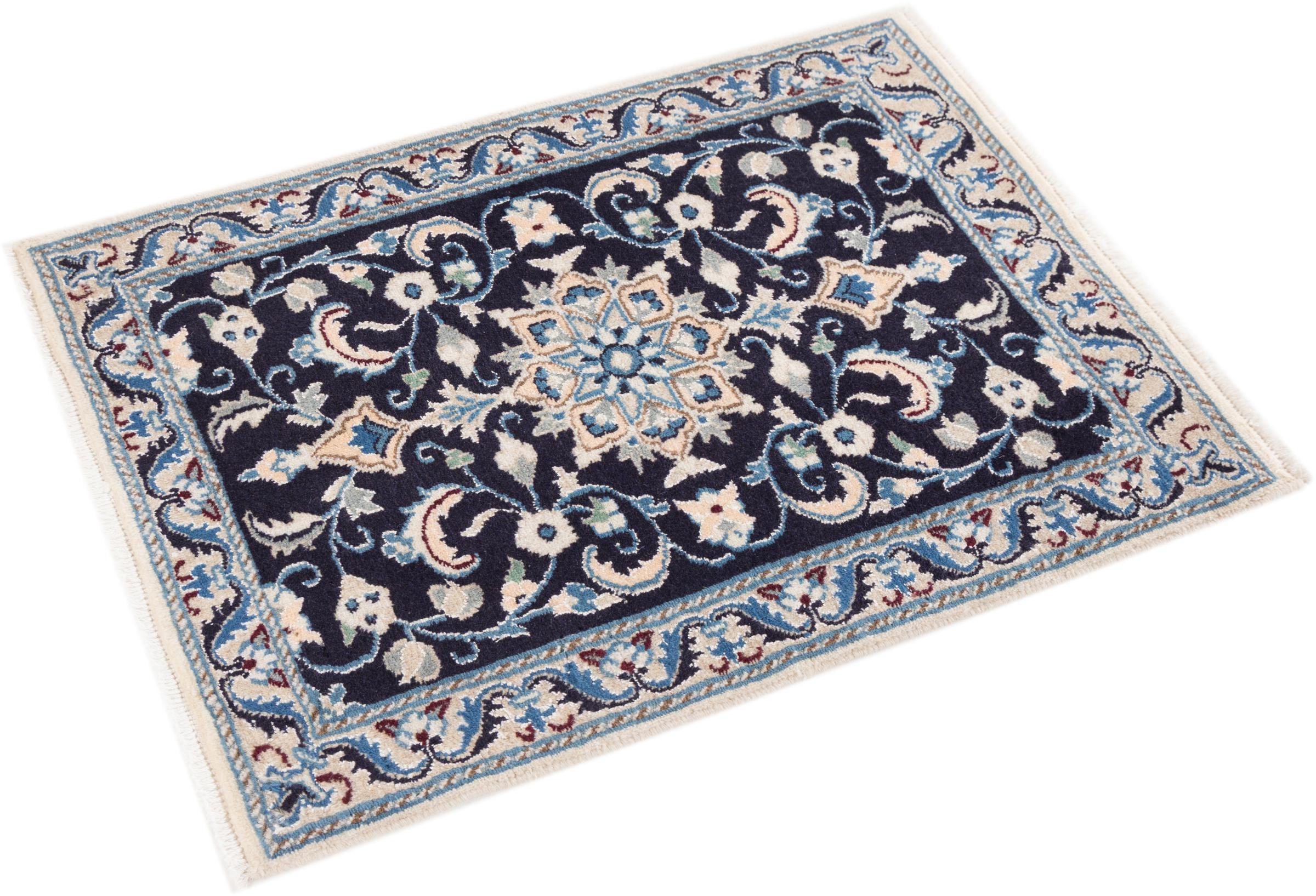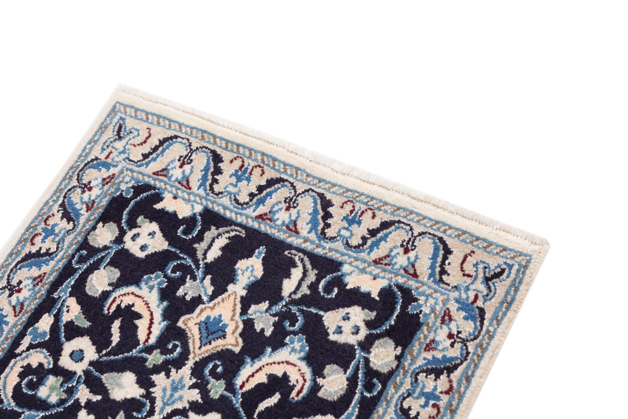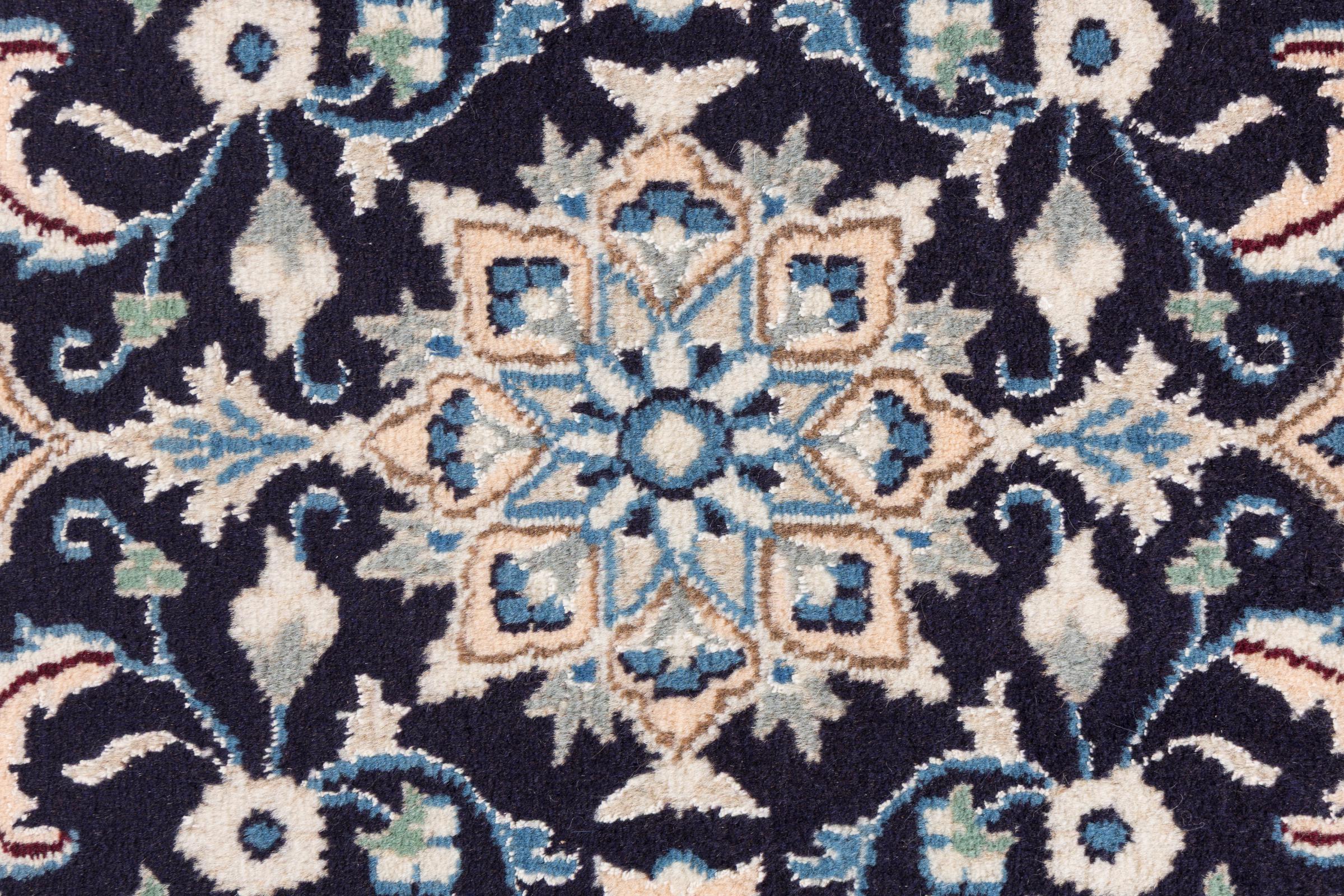 Dette Nain-tæppe er klassificeret 9La. Den fremragende kvalitet, det smukke orientalske design med sine buede mønstre glæder enhver køber. Dette persiske tæppe blev håndknyttet af højkvalitets uld og natursilke i byen Nain, som ligger i den vestlige udkant af Dasht-e-Kavir-ørkenen. 9La Nain er væsentligt finere end en 12La og viser allerede smukke detaljer.