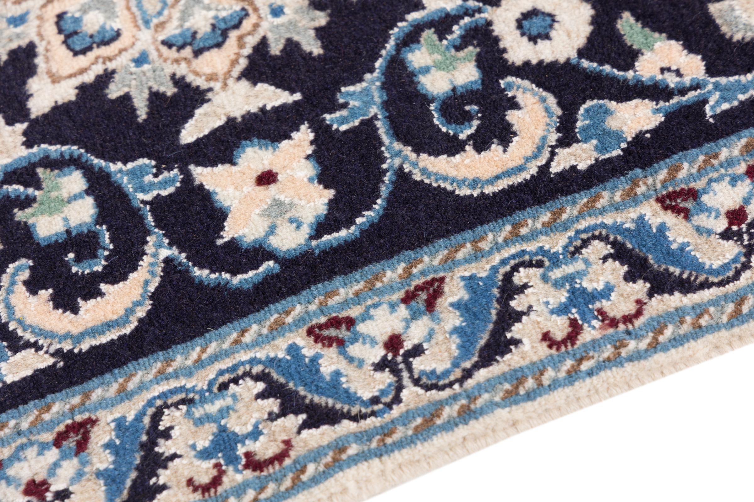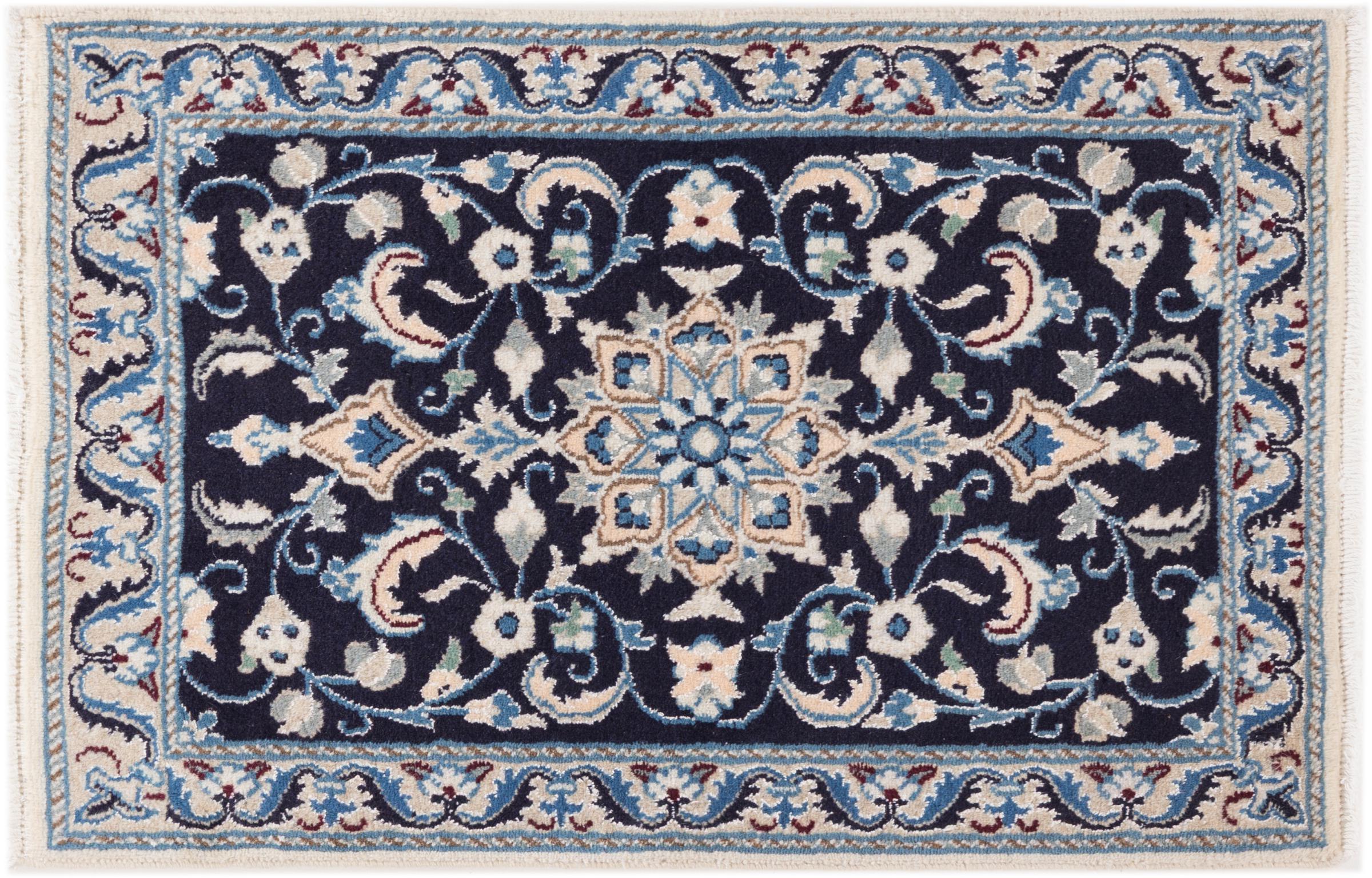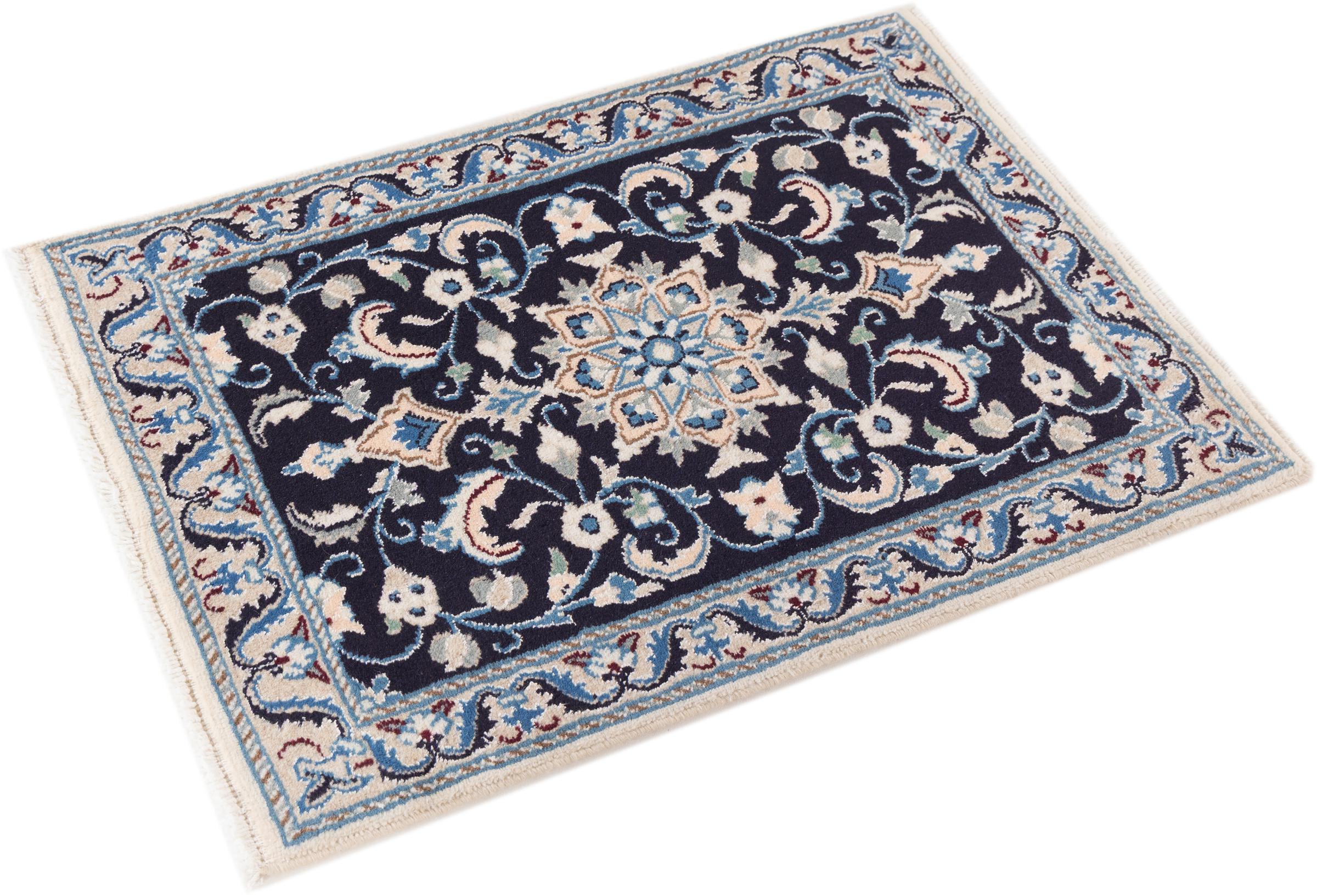 Dette Nain-tæppe er klassificeret 9La. Den fremragende kvalitet, det smukke orientalske design med sine buede mønstre glæder enhver køber. Dette persiske tæppe blev håndknyttet af højkvalitets uld og natursilke i byen Nain, som ligger i den vestlige udkant af Dasht-e-Kavir-ørkenen. 9La Nain er væsentligt finere end en 12La og viser allerede smukke detaljer.