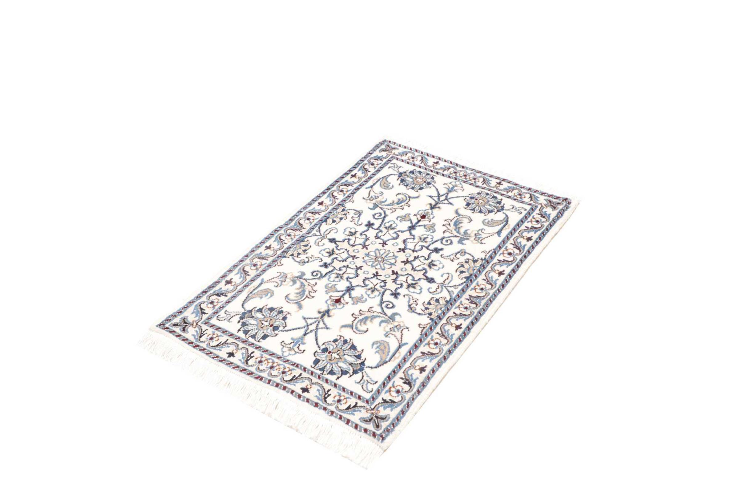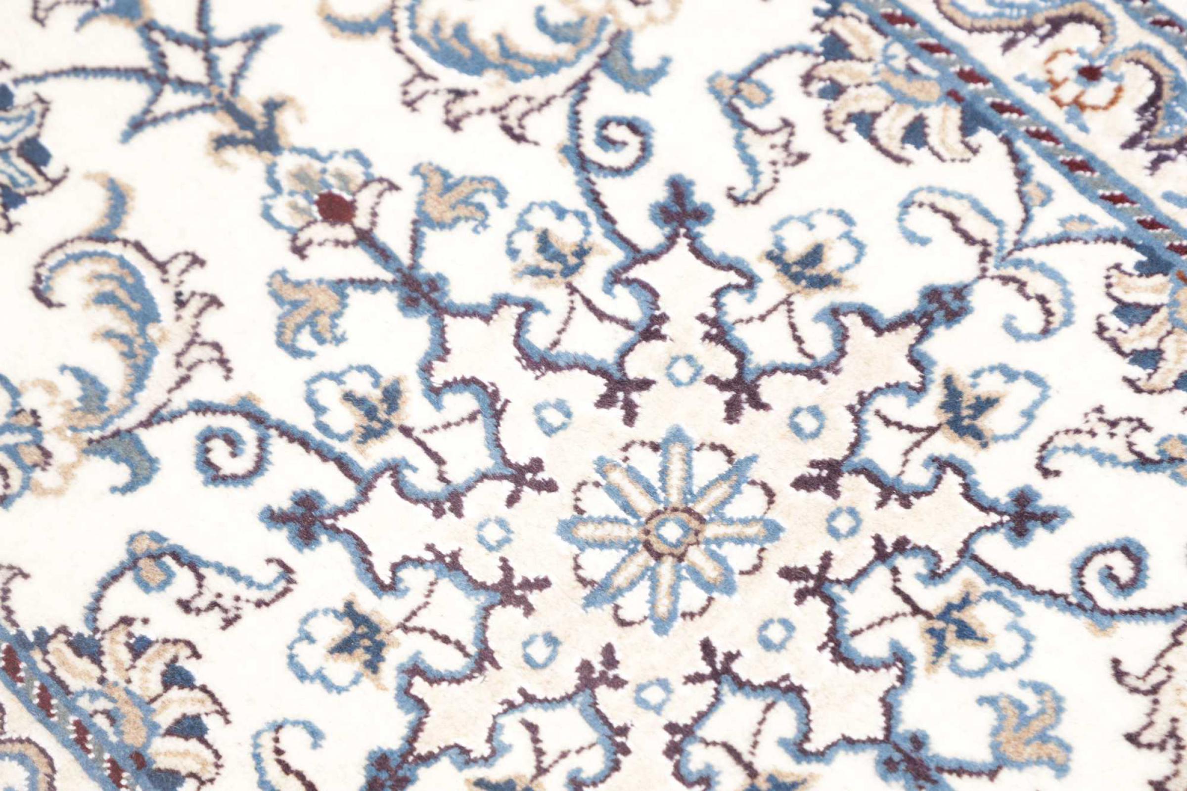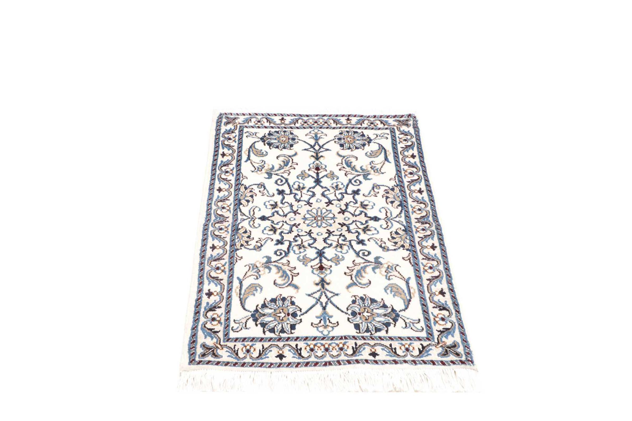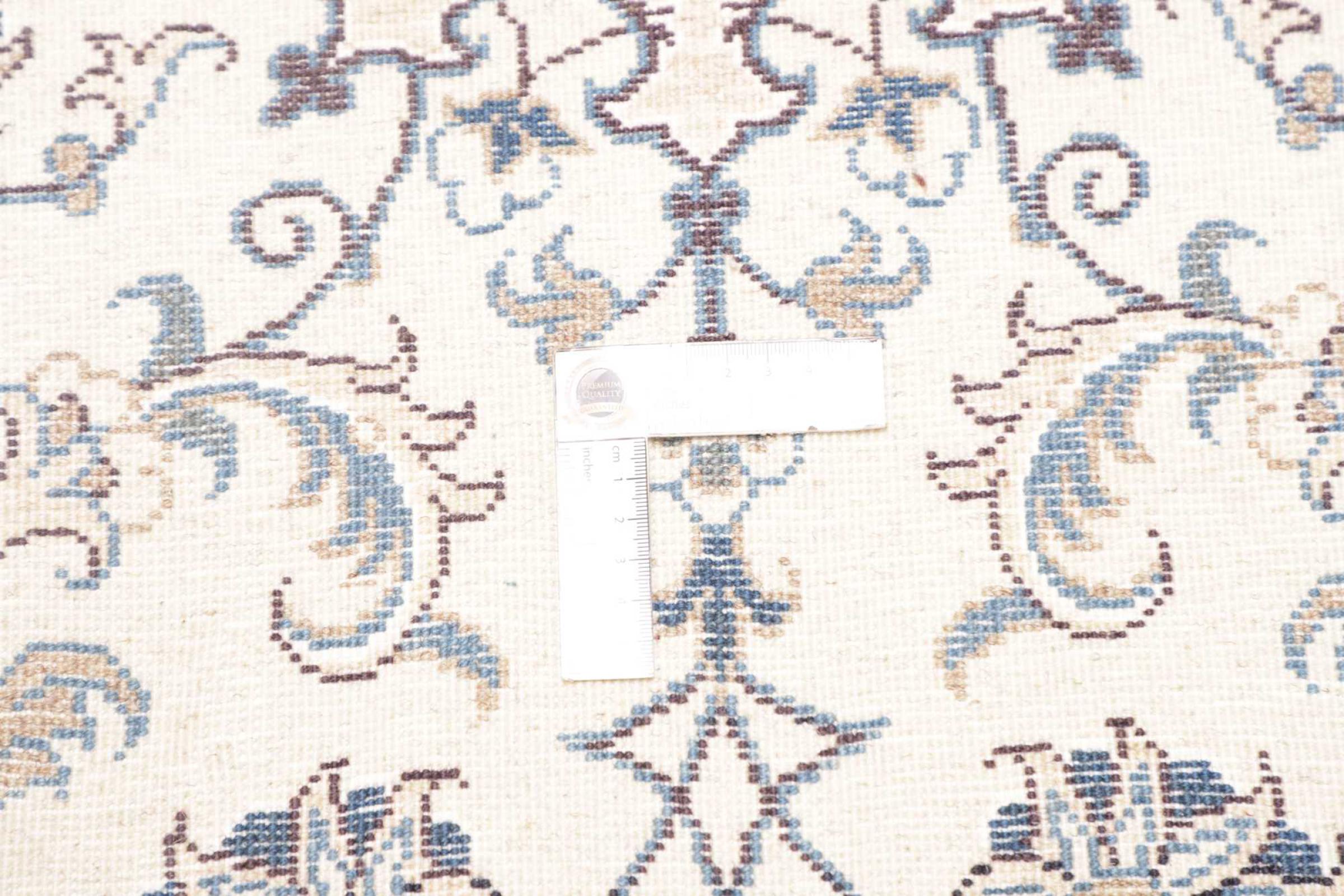 Dette Nain tæppe er vurderet til 12La. Det ser elegant og ædelt ud i sit typiske Nain-farveskema. Dette persiske tæppe blev håndknyttet af højkvalitets uld og natursilke i byen Nain, som ligger i den vestlige udkant af Dasht-e-Kavir-ørkenen. Med 12La er den ikke så fint og detaljeret udsmykket som en Nain 9La eller 6La.