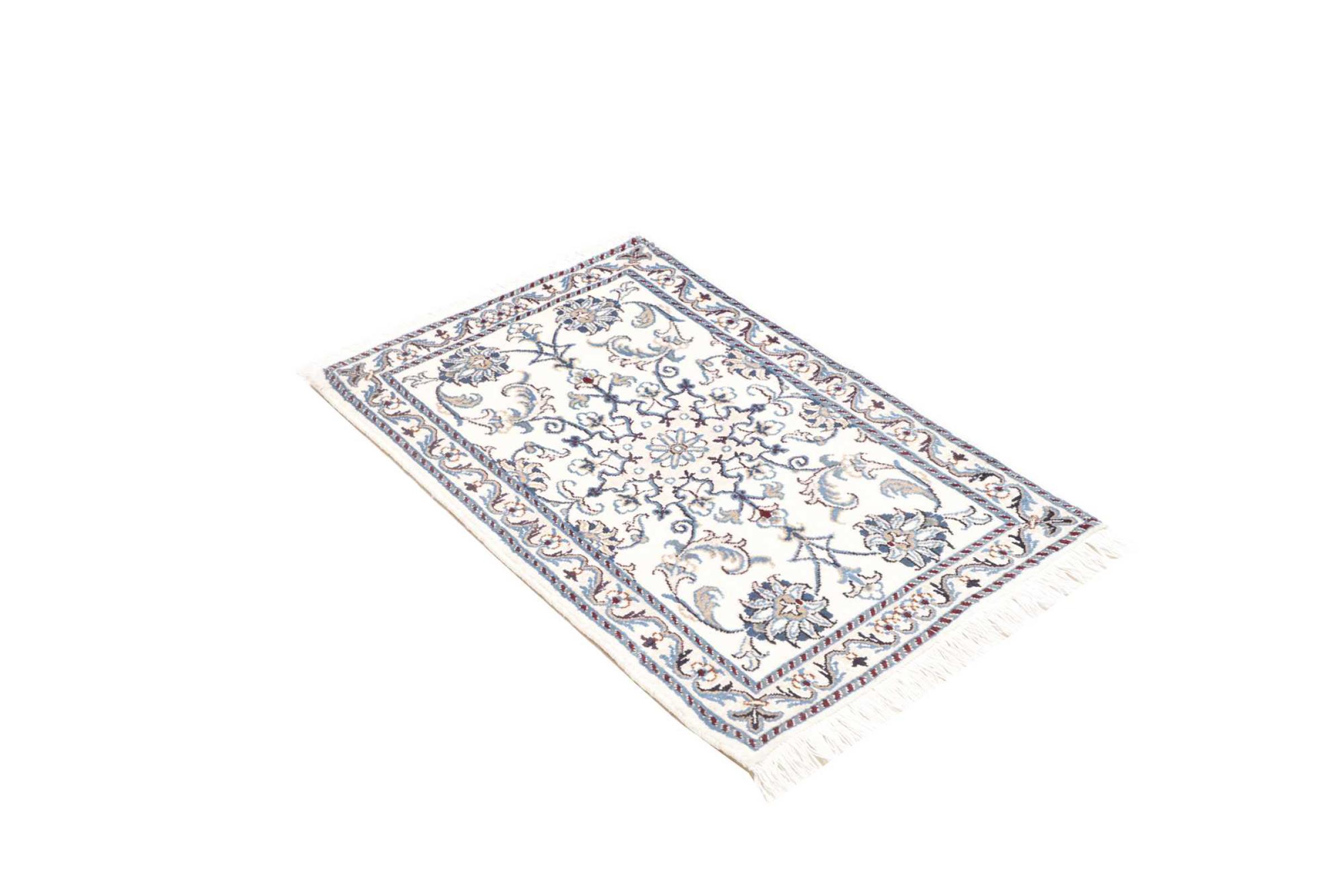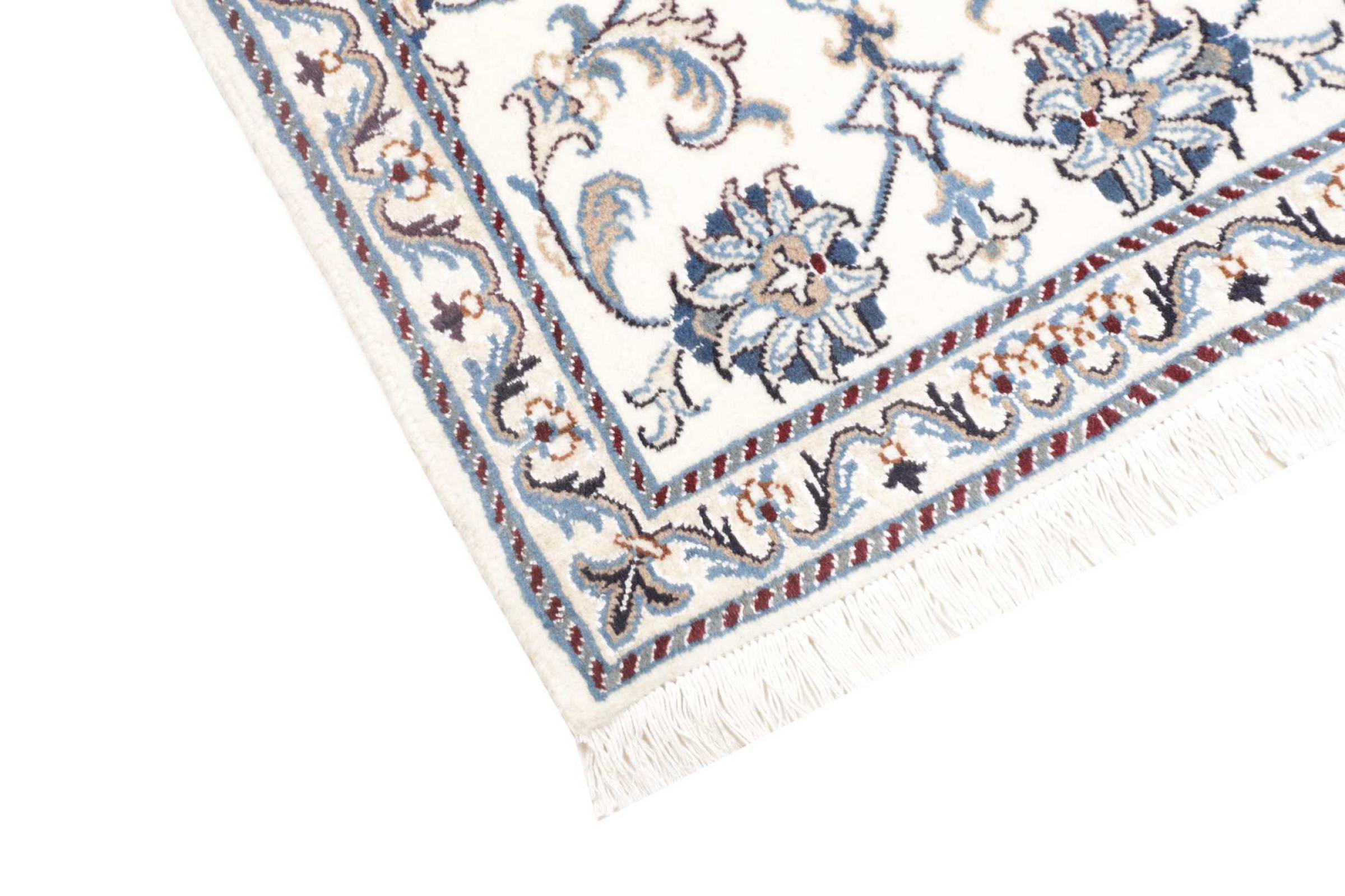 Dette Nain tæppe er vurderet til 12La. Det ser elegant og ædelt ud i sit typiske Nain-farveskema. Dette persiske tæppe blev håndknyttet af højkvalitets uld og natursilke i byen Nain, som ligger i den vestlige udkant af Dasht-e-Kavir-ørkenen. Med 12La er den ikke så fint og detaljeret udsmykket som en Nain 9La eller 6La.