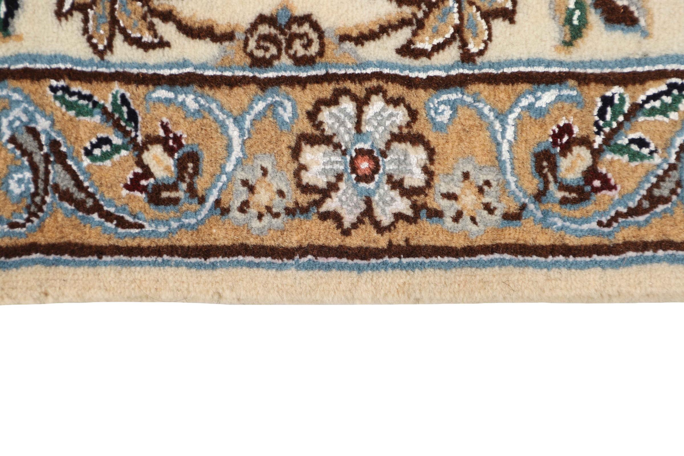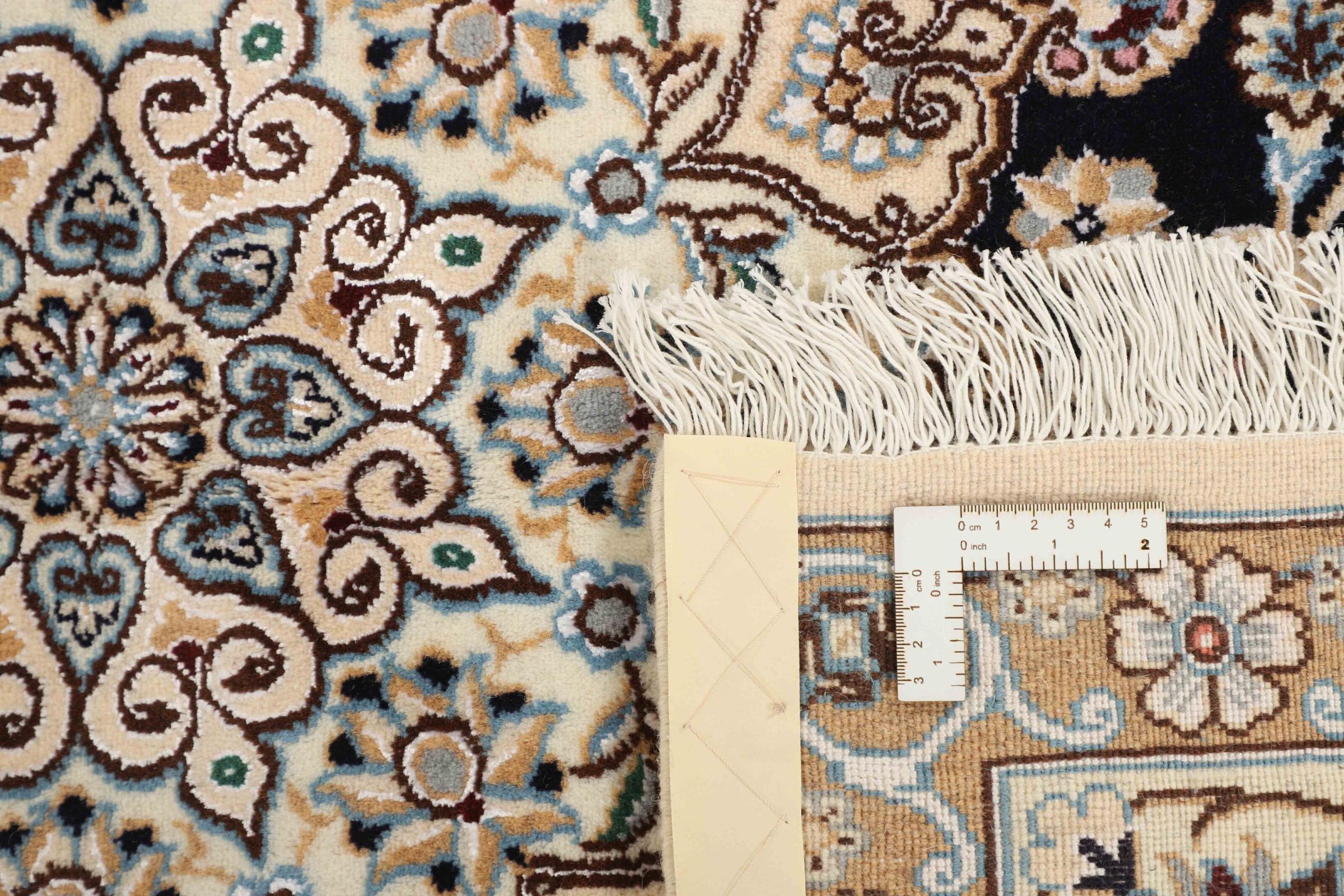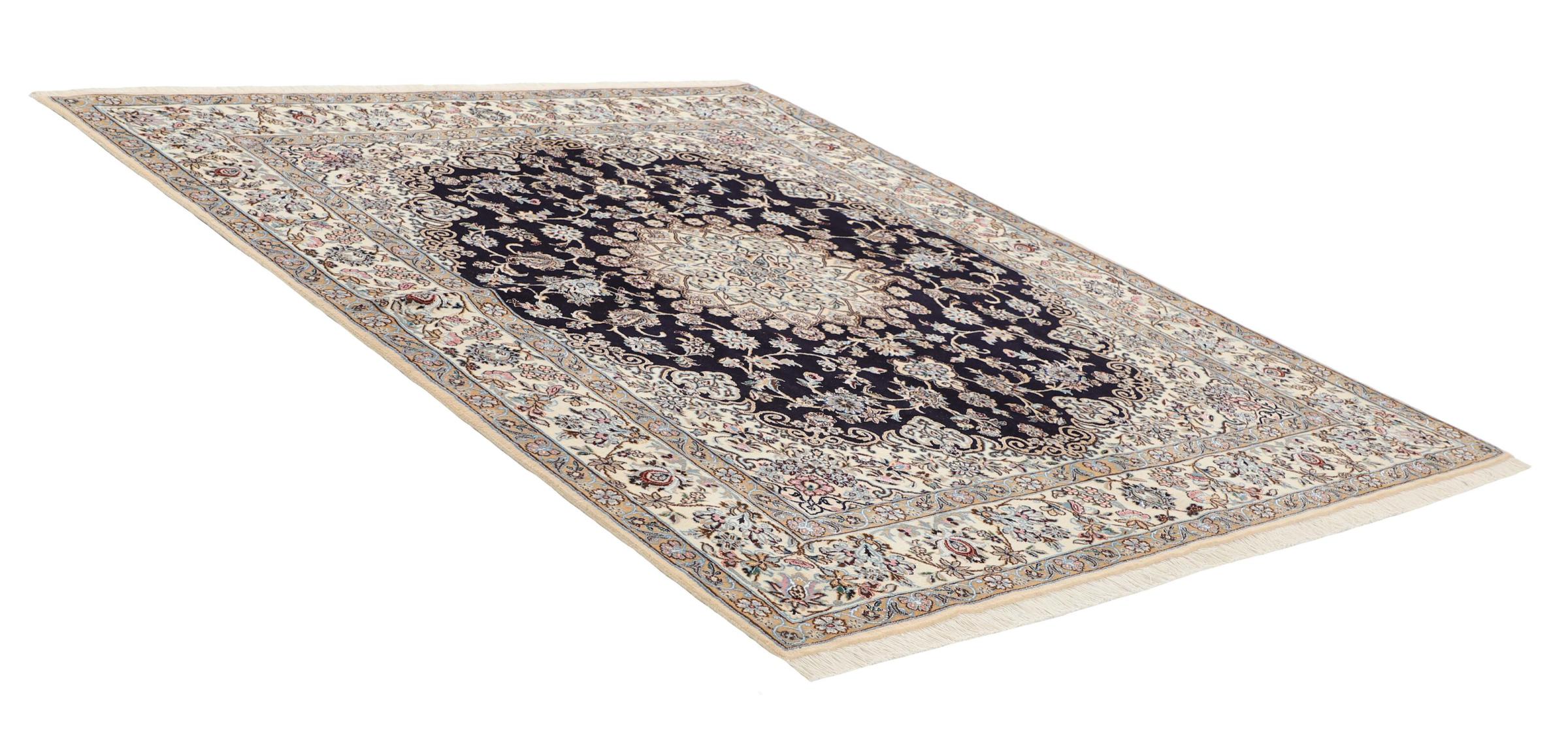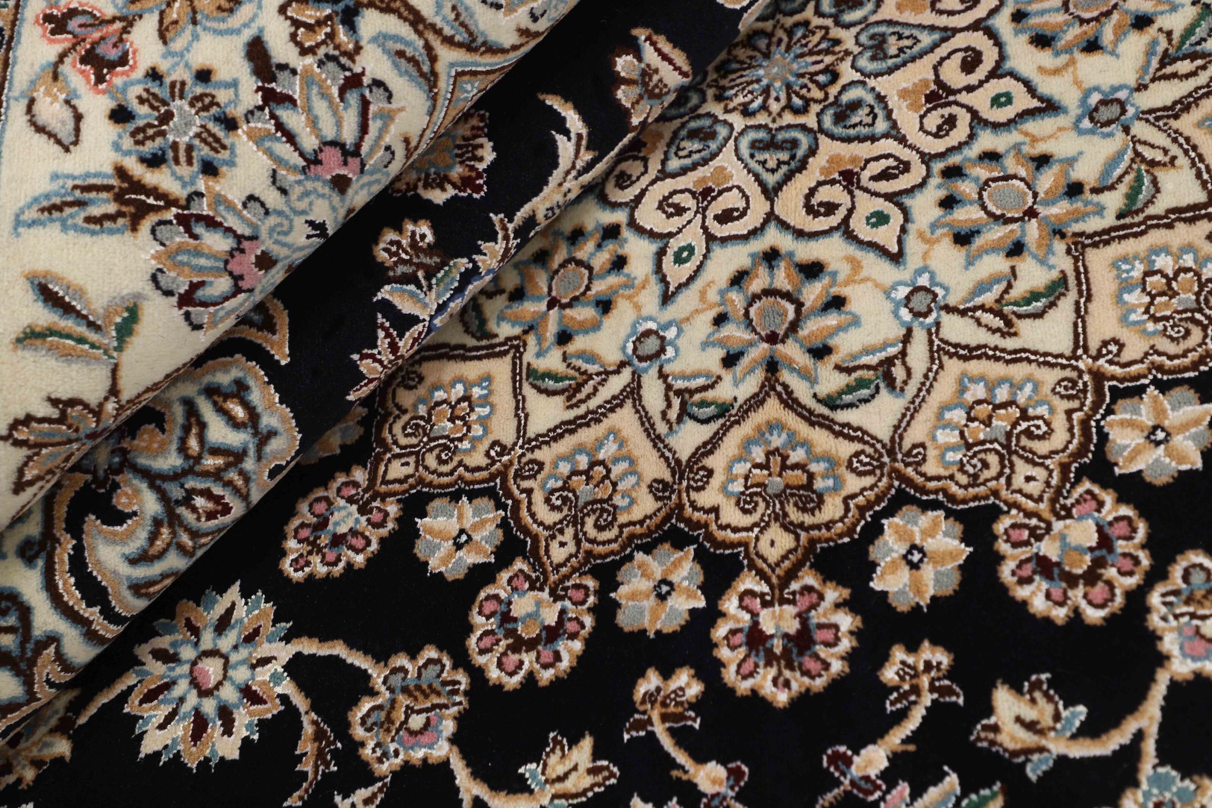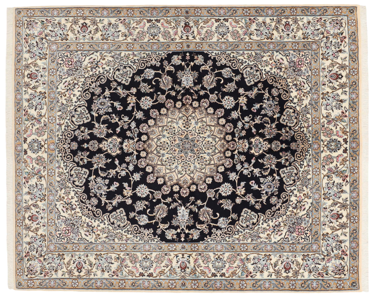 Dette Nain-tæppe er klassificeret 9La. Den fremragende kvalitet, det smukke orientalske design med sine buede mønstre glæder enhver køber. Dette persiske tæppe blev håndknyttet af højkvalitets uld og natursilke i byen Nain, som ligger i den vestlige udkant af Dasht-e-Kavir-ørkenen. 9La Nain er væsentligt finere end en 12La og viser allerede smukke detaljer.