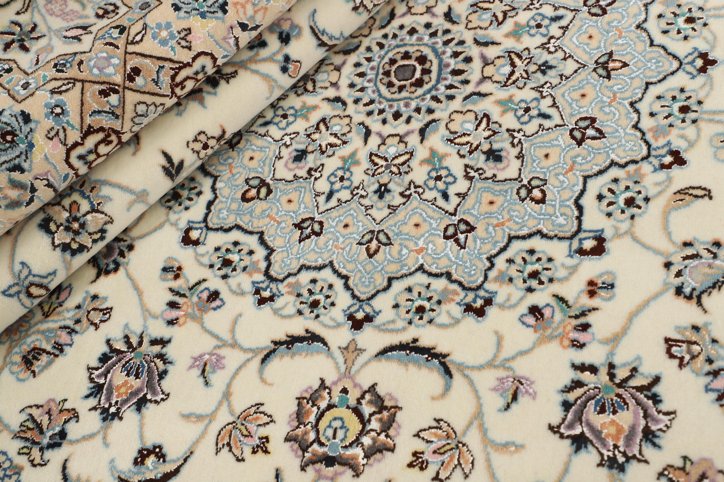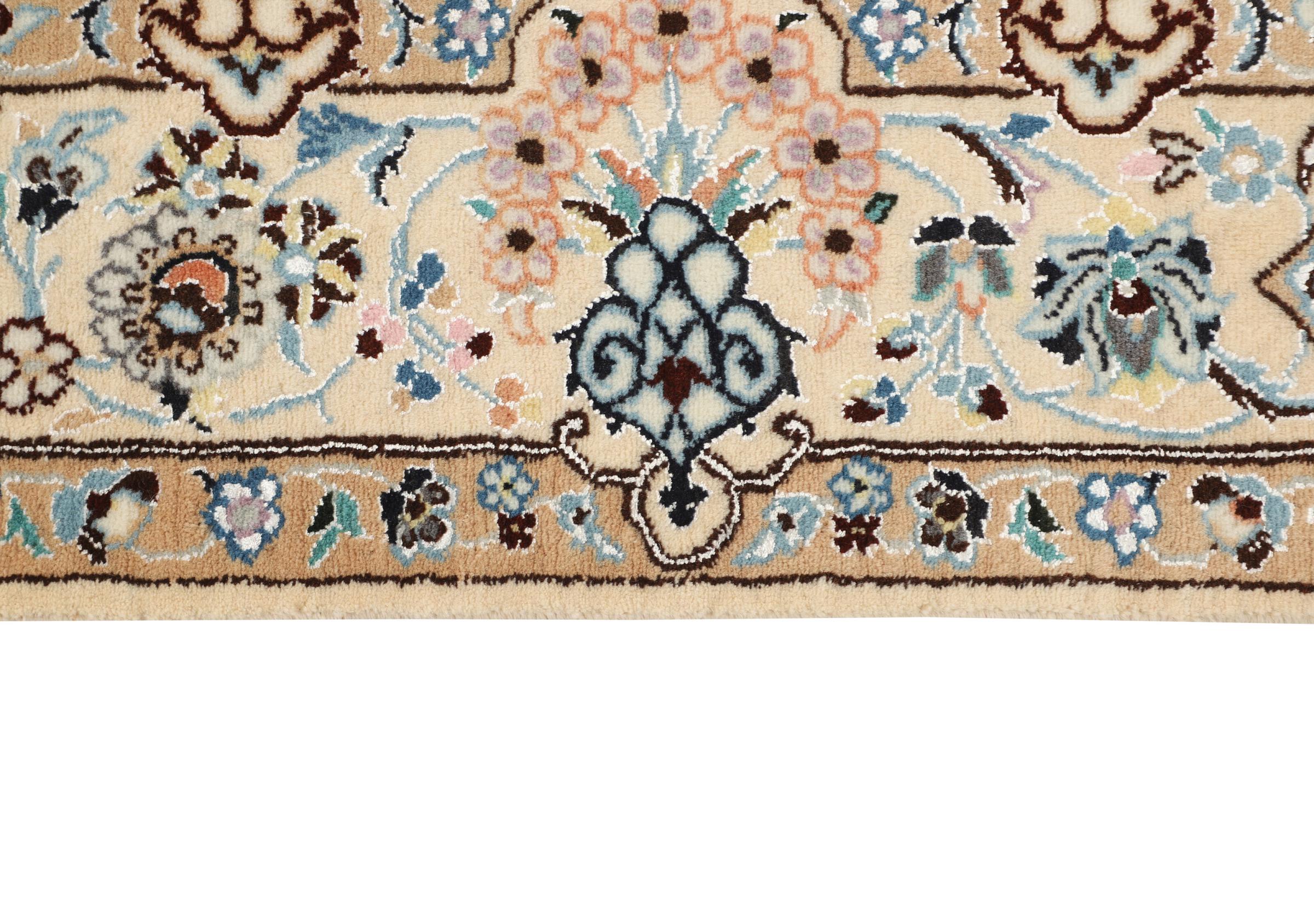 Dette Nain-tæppe er klassificeret 9La. Den fremragende kvalitet, det smukke orientalske design med sine buede mønstre glæder enhver køber. Dette persiske tæppe blev håndknyttet af højkvalitets uld og natursilke i byen Nain, som ligger i den vestlige udkant af Dasht-e-Kavir-ørkenen. 9La Nain er væsentligt finere end en 12La og viser allerede smukke detaljer.
