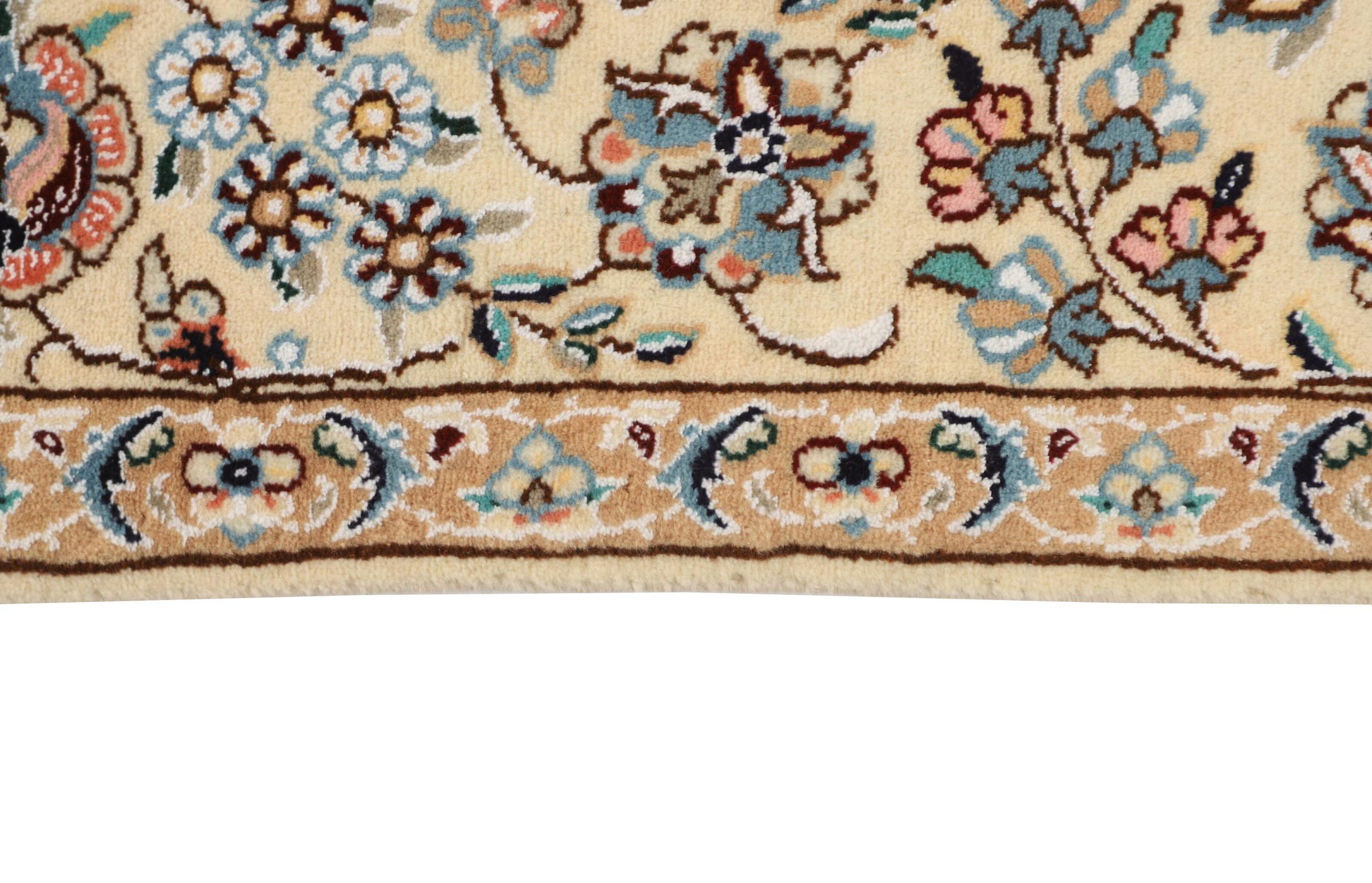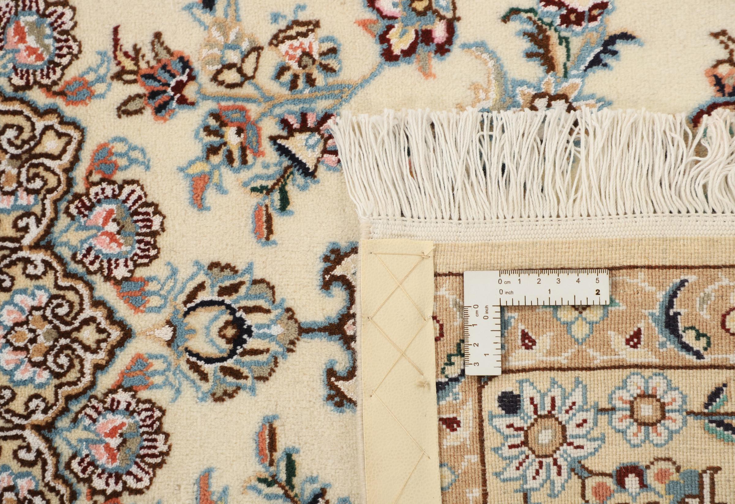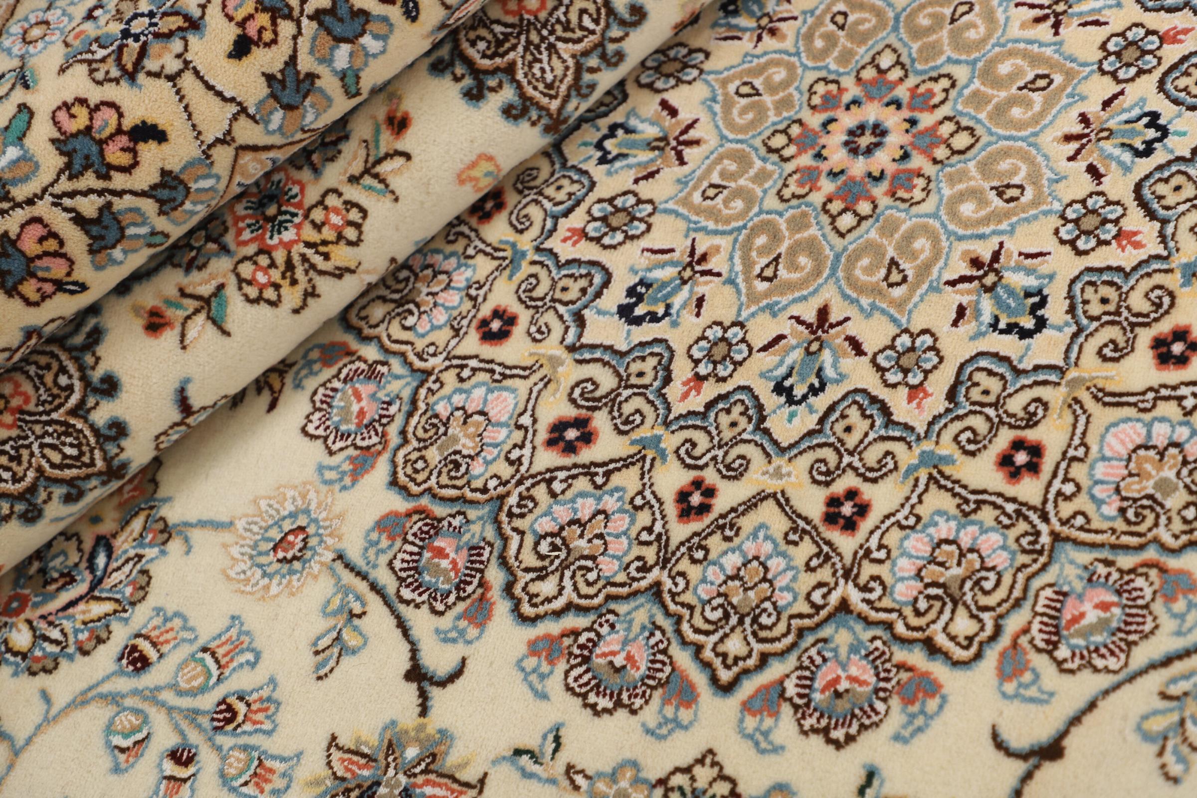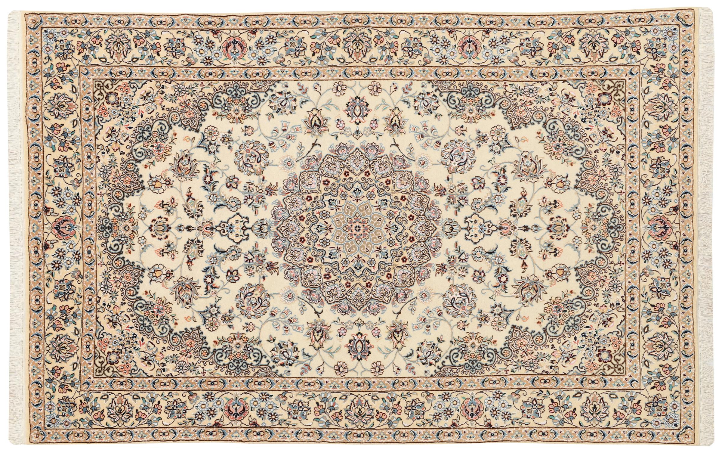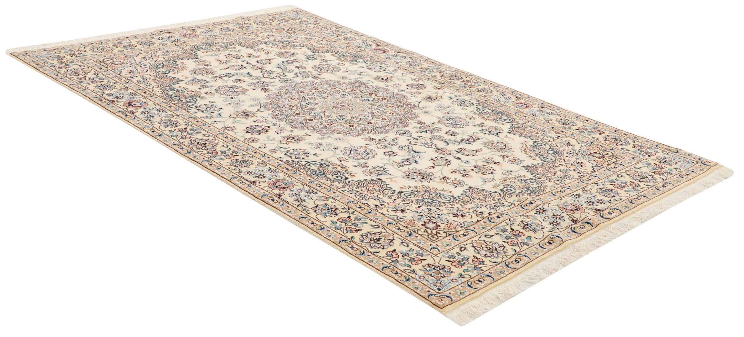 Dette Nain-tæppe er klassificeret 9La. Den fremragende kvalitet, det smukke orientalske design med sine buede mønstre glæder enhver køber. Dette persiske tæppe blev håndknyttet af højkvalitets uld og natursilke i byen Nain, som ligger i den vestlige udkant af Dasht-e-Kavir-ørkenen. 9La Nain er væsentligt finere end en 12La og viser allerede smukke detaljer.