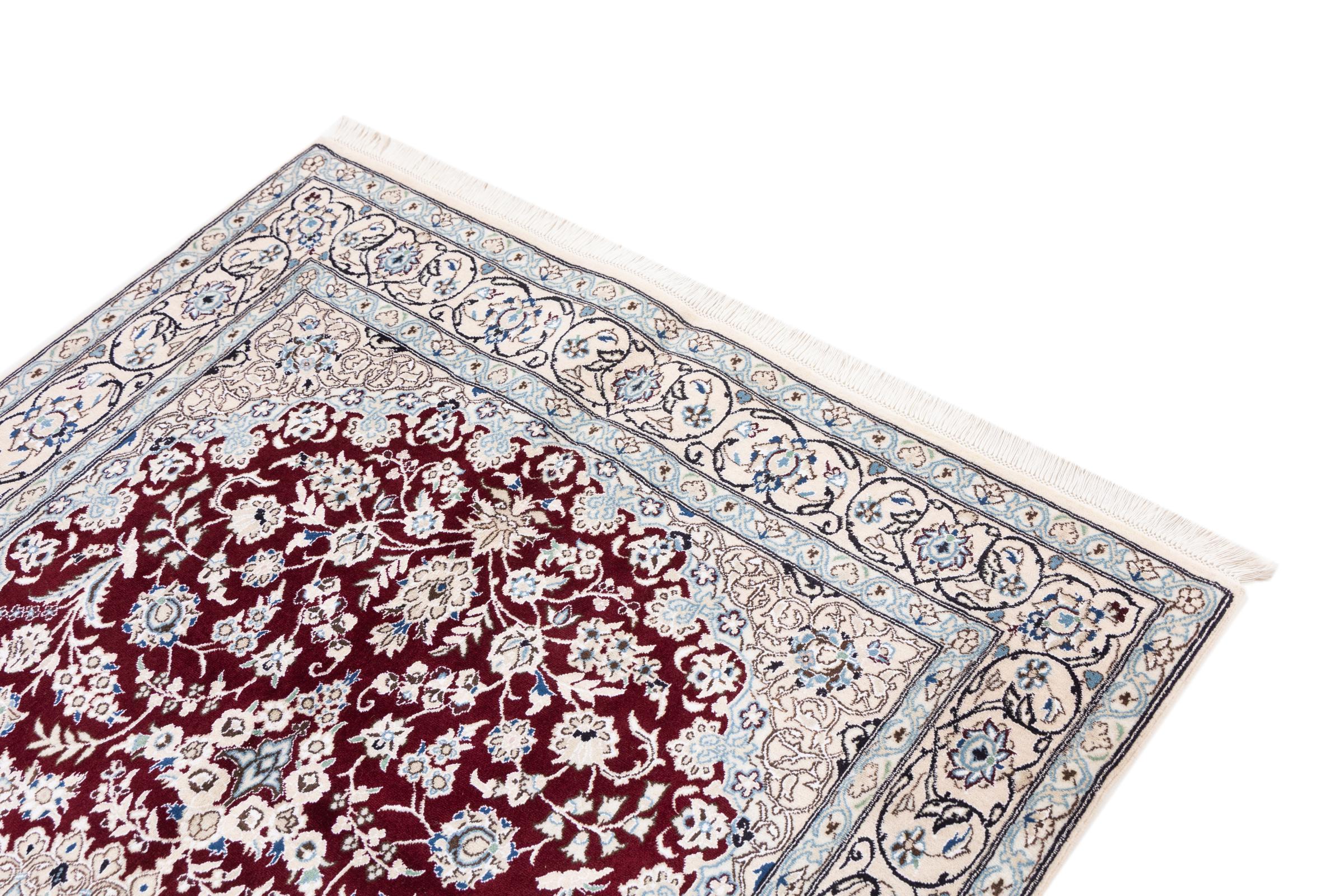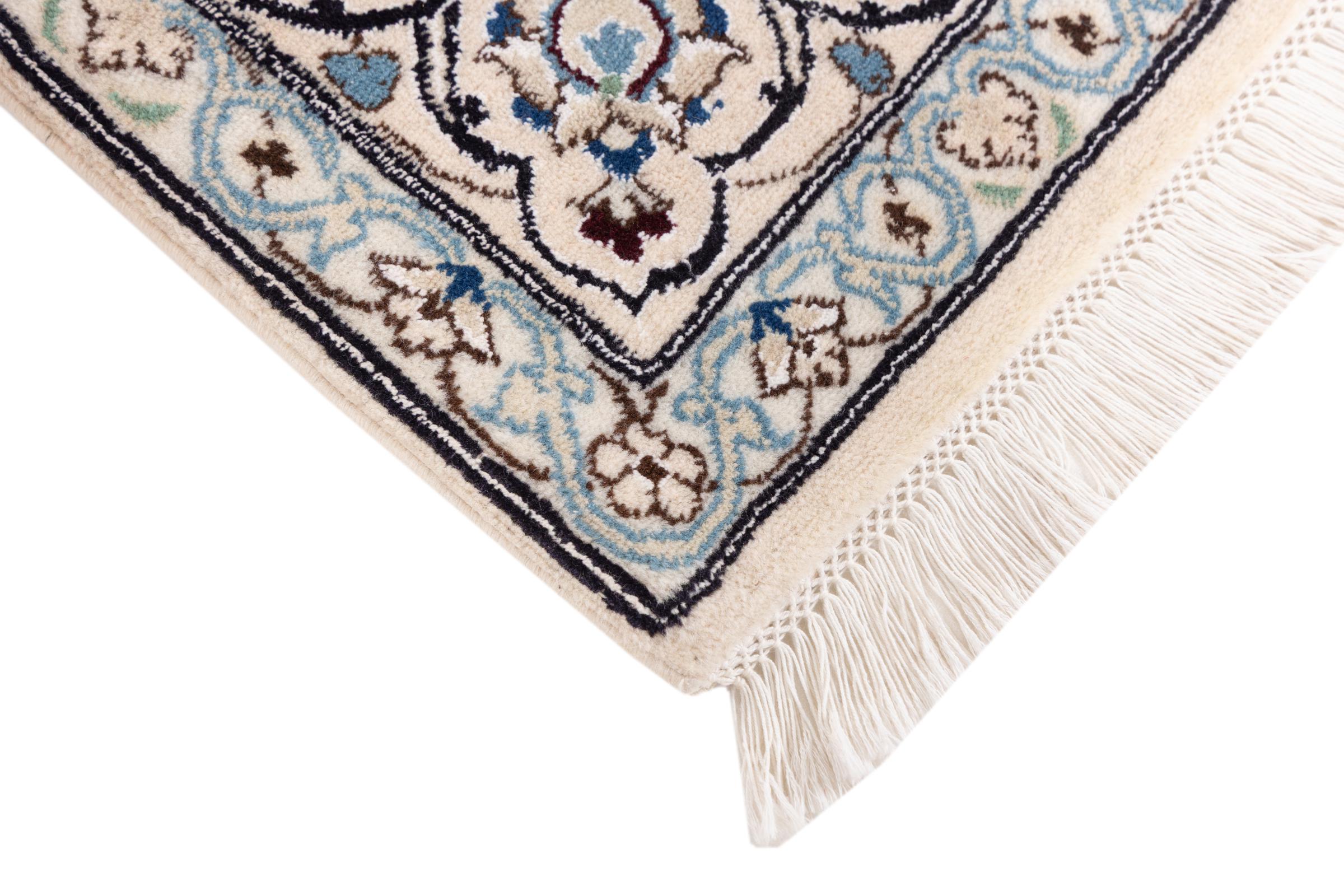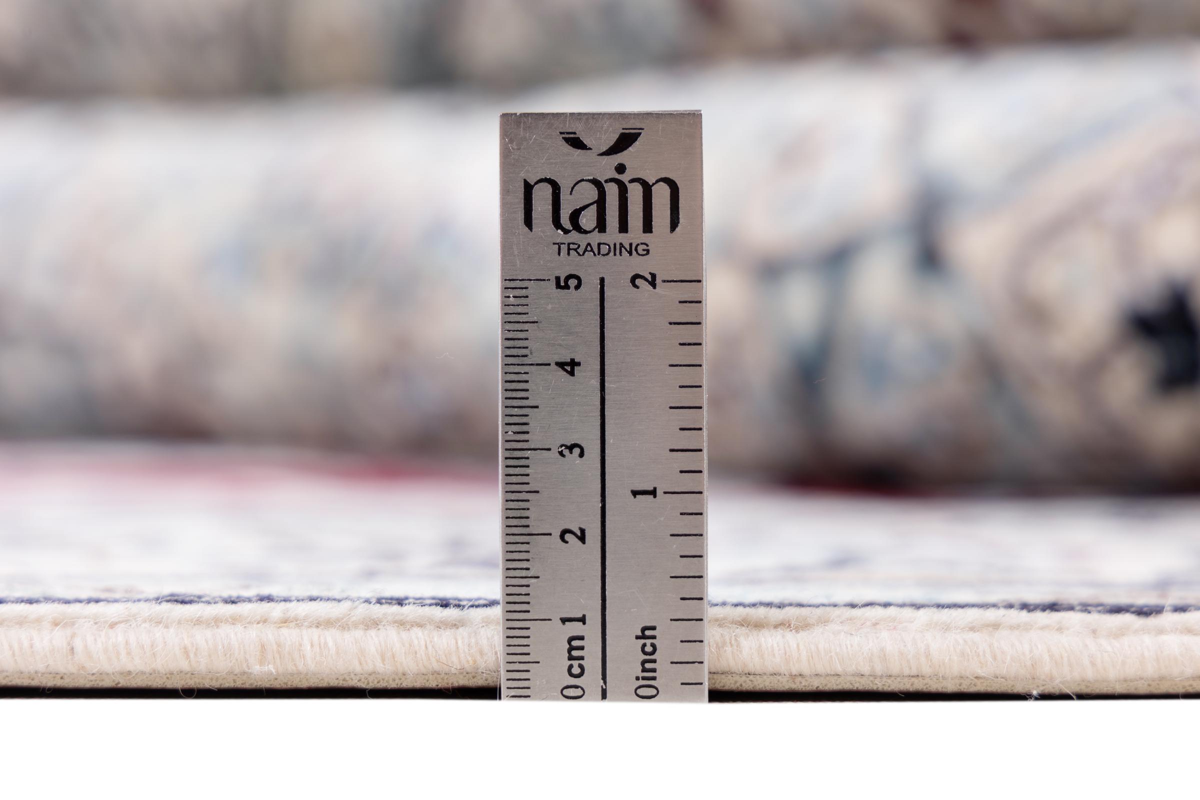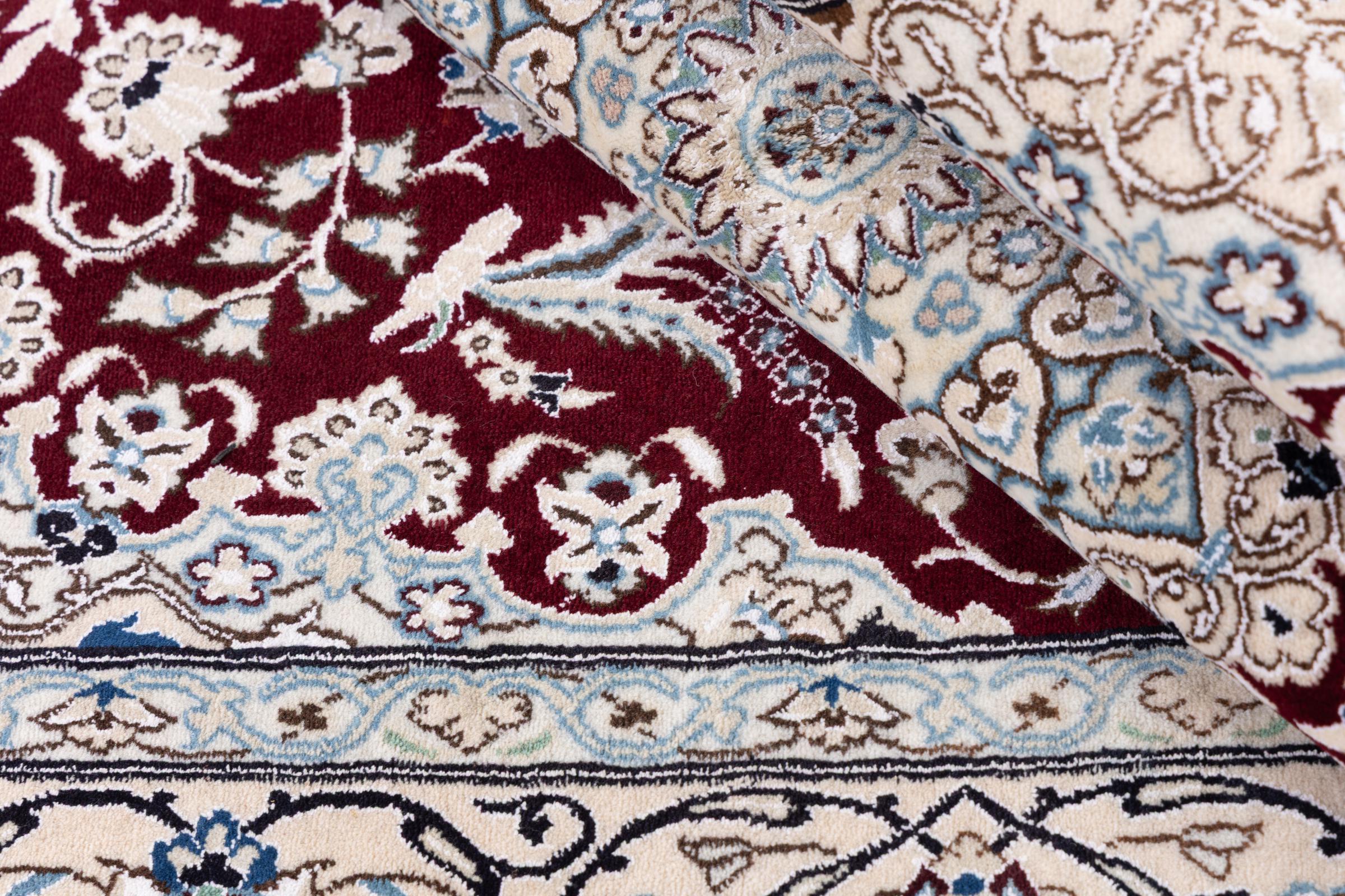 Dette Nain-tæppe er klassificeret 9La. Den fremragende kvalitet, det smukke orientalske design med sine buede mønstre glæder enhver køber. Dette persiske tæppe blev håndknyttet af højkvalitets uld og natursilke i byen Nain, som ligger i den vestlige udkant af Dasht-e-Kavir-ørkenen. 9La Nain er væsentligt finere end en 12La og viser allerede smukke detaljer.
