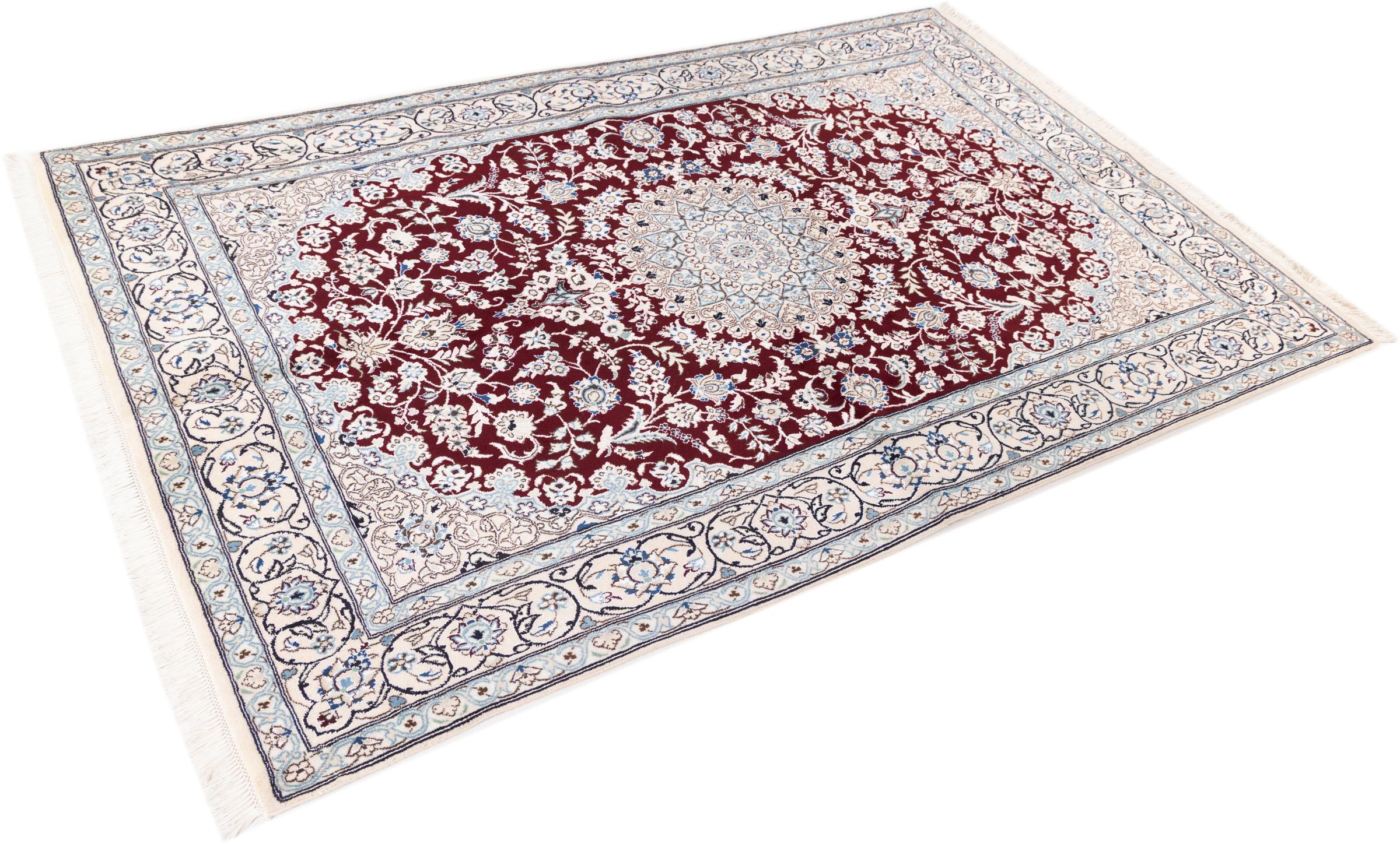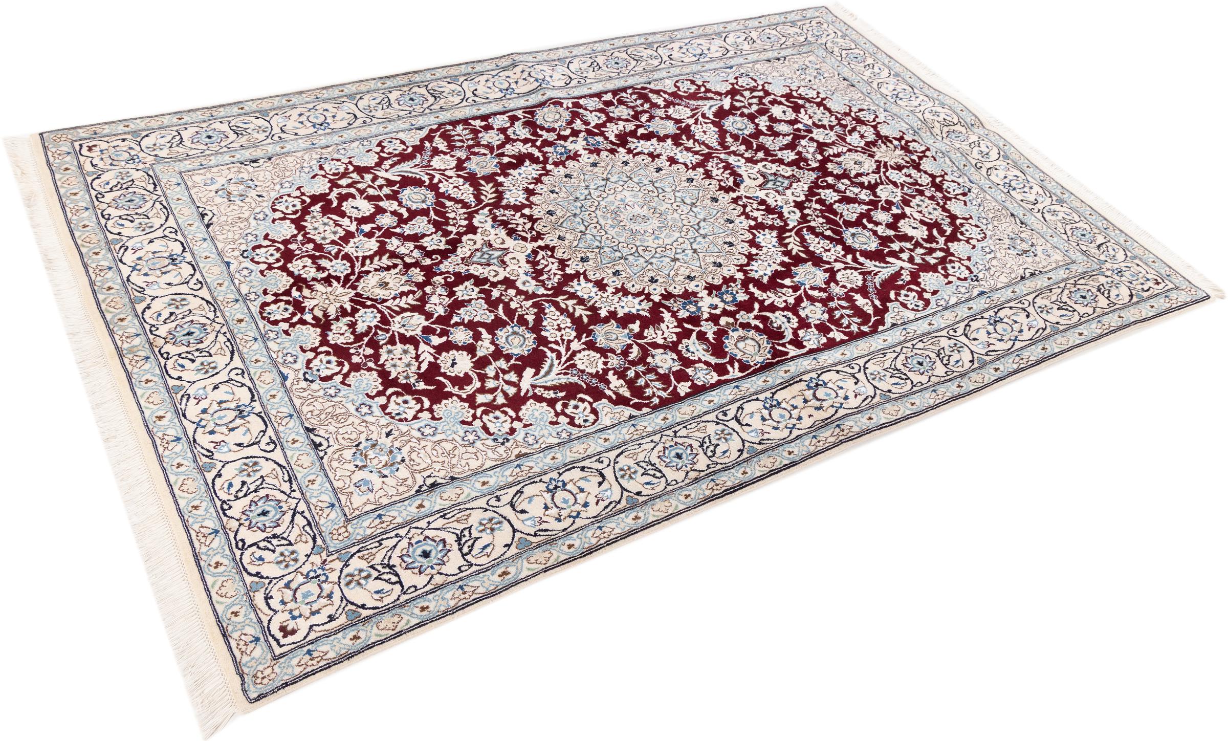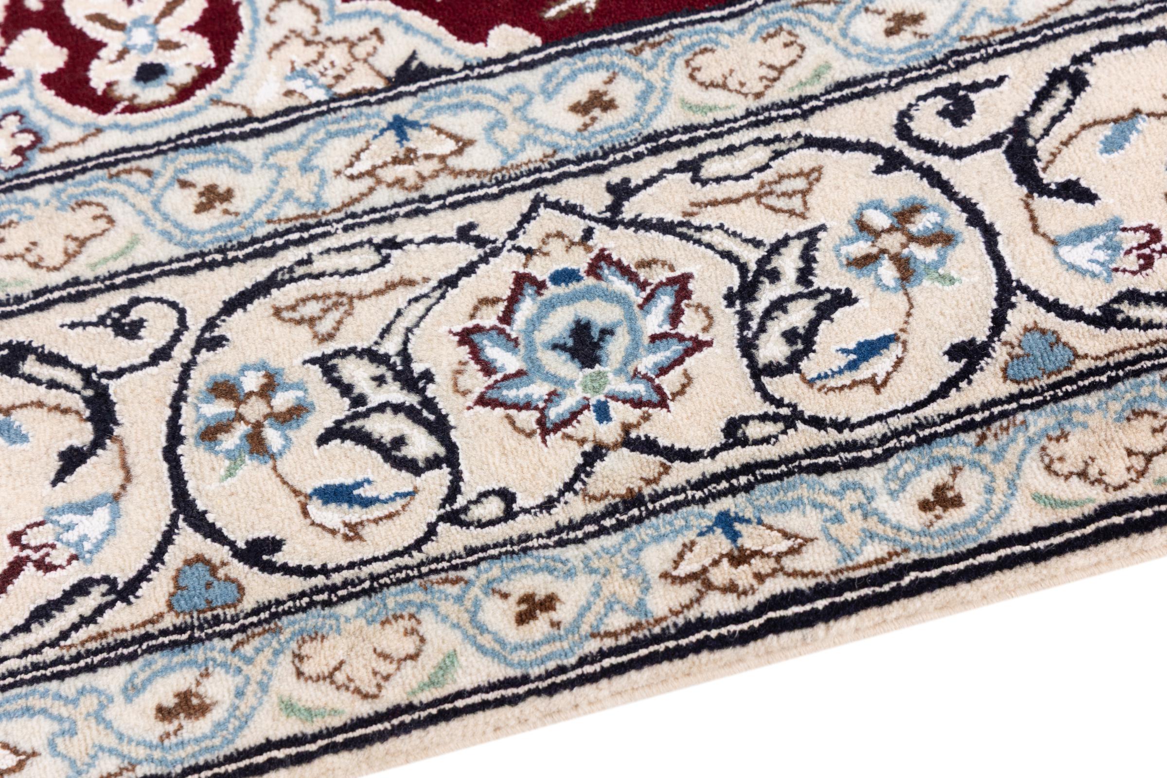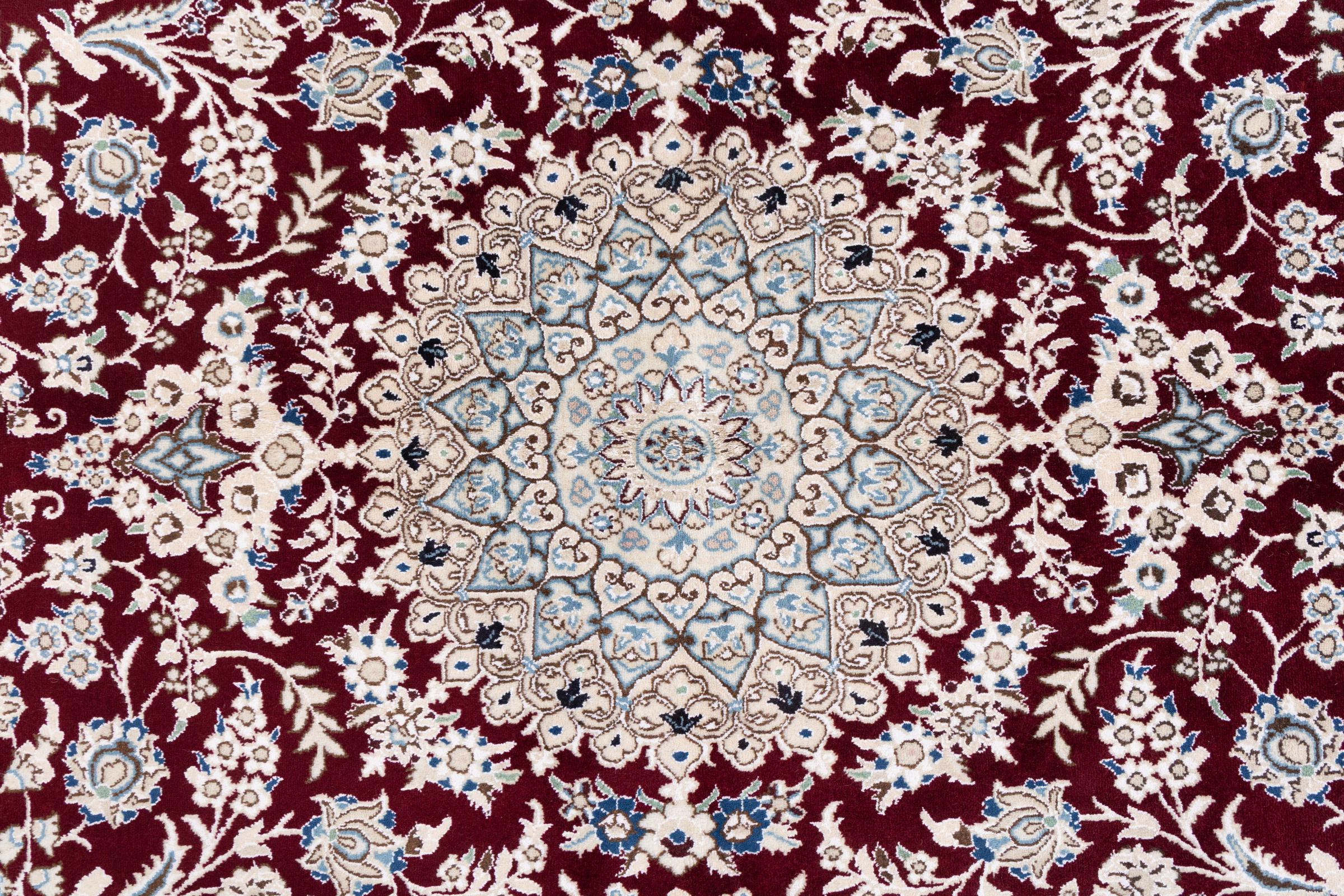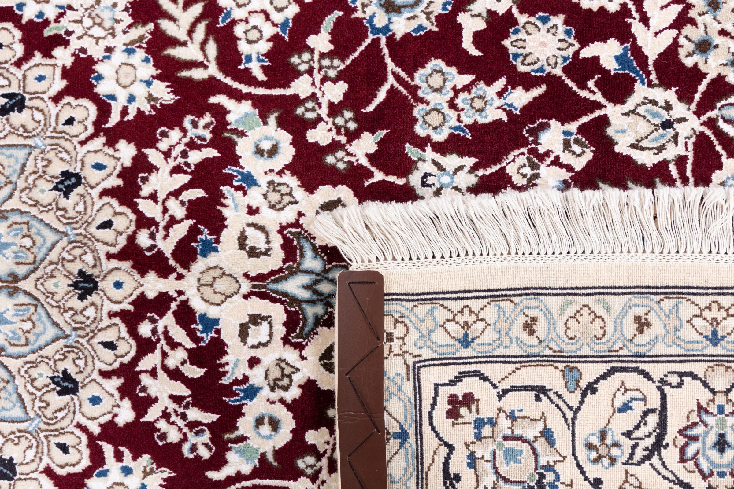 Dette Nain-tæppe er klassificeret 9La. Den fremragende kvalitet, det smukke orientalske design med sine buede mønstre glæder enhver køber. Dette persiske tæppe blev håndknyttet af højkvalitets uld og natursilke i byen Nain, som ligger i den vestlige udkant af Dasht-e-Kavir-ørkenen. 9La Nain er væsentligt finere end en 12La og viser allerede smukke detaljer.