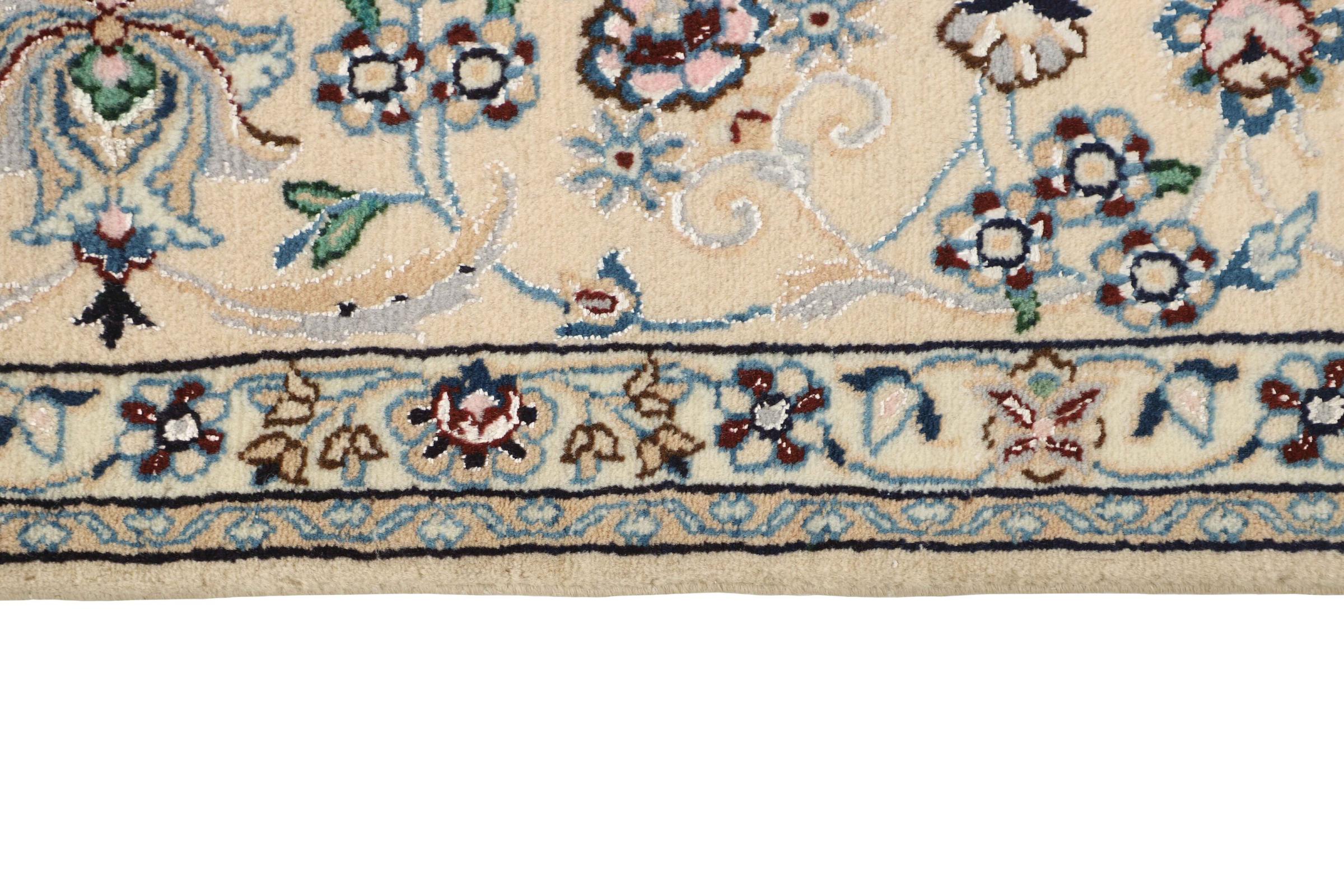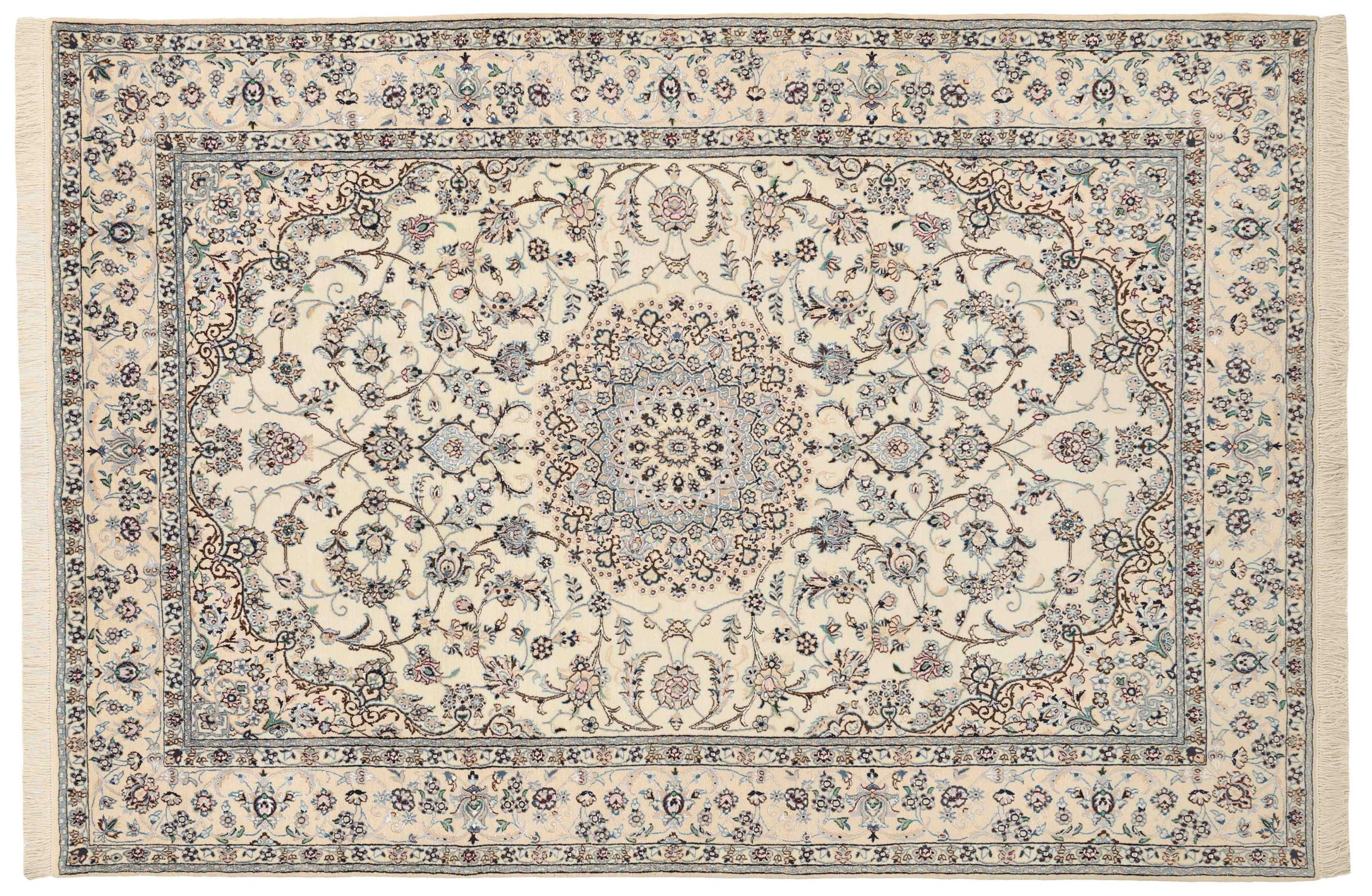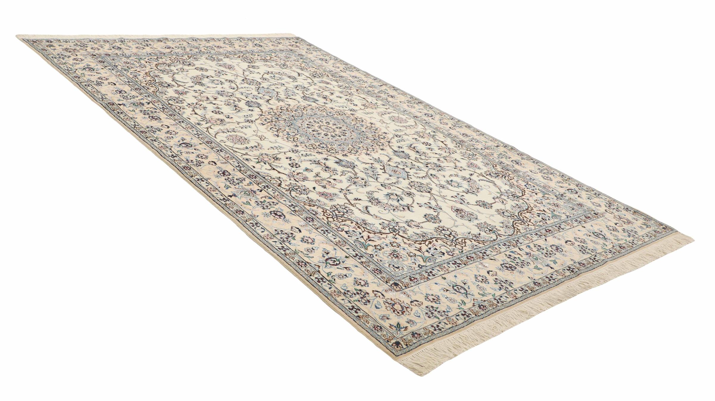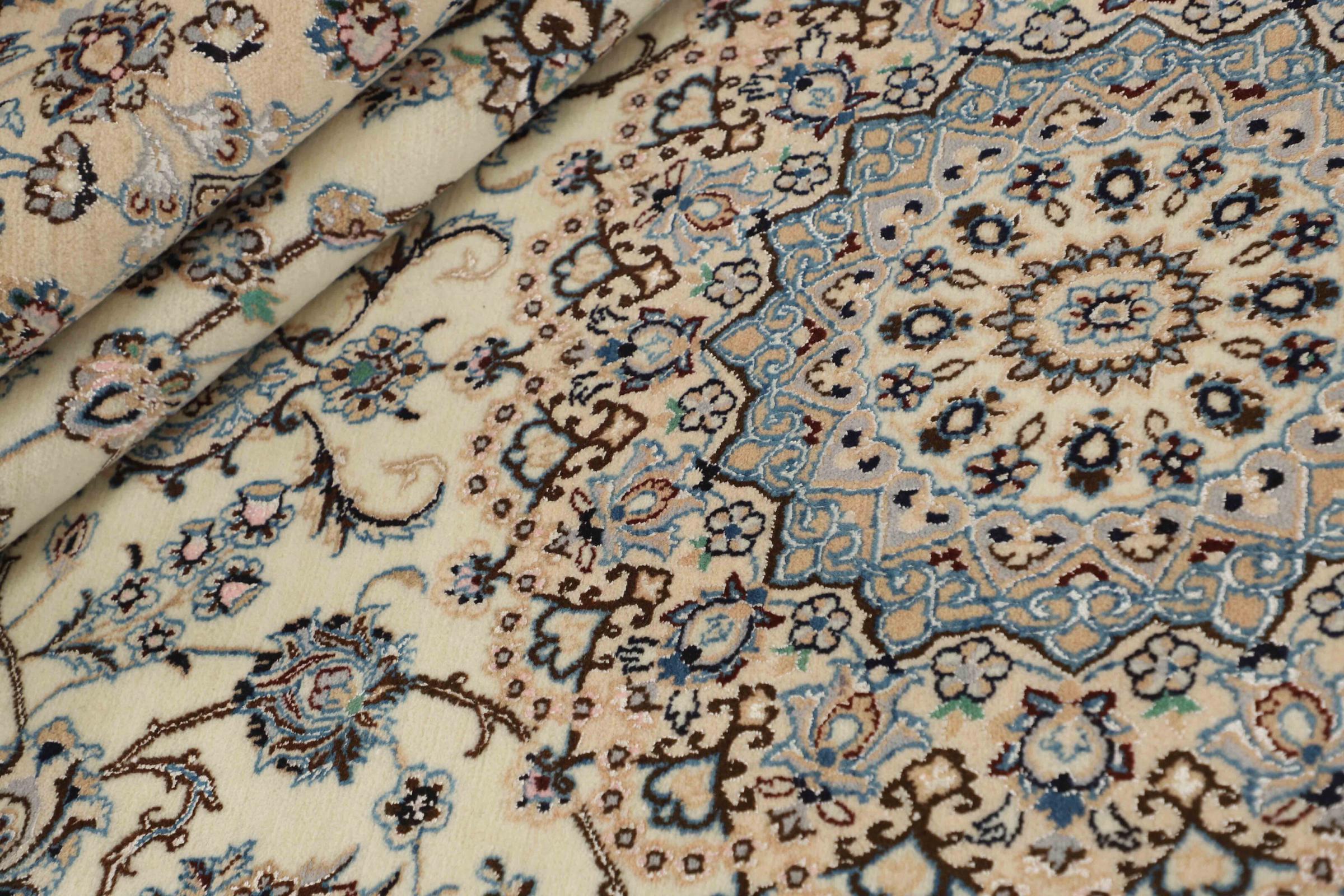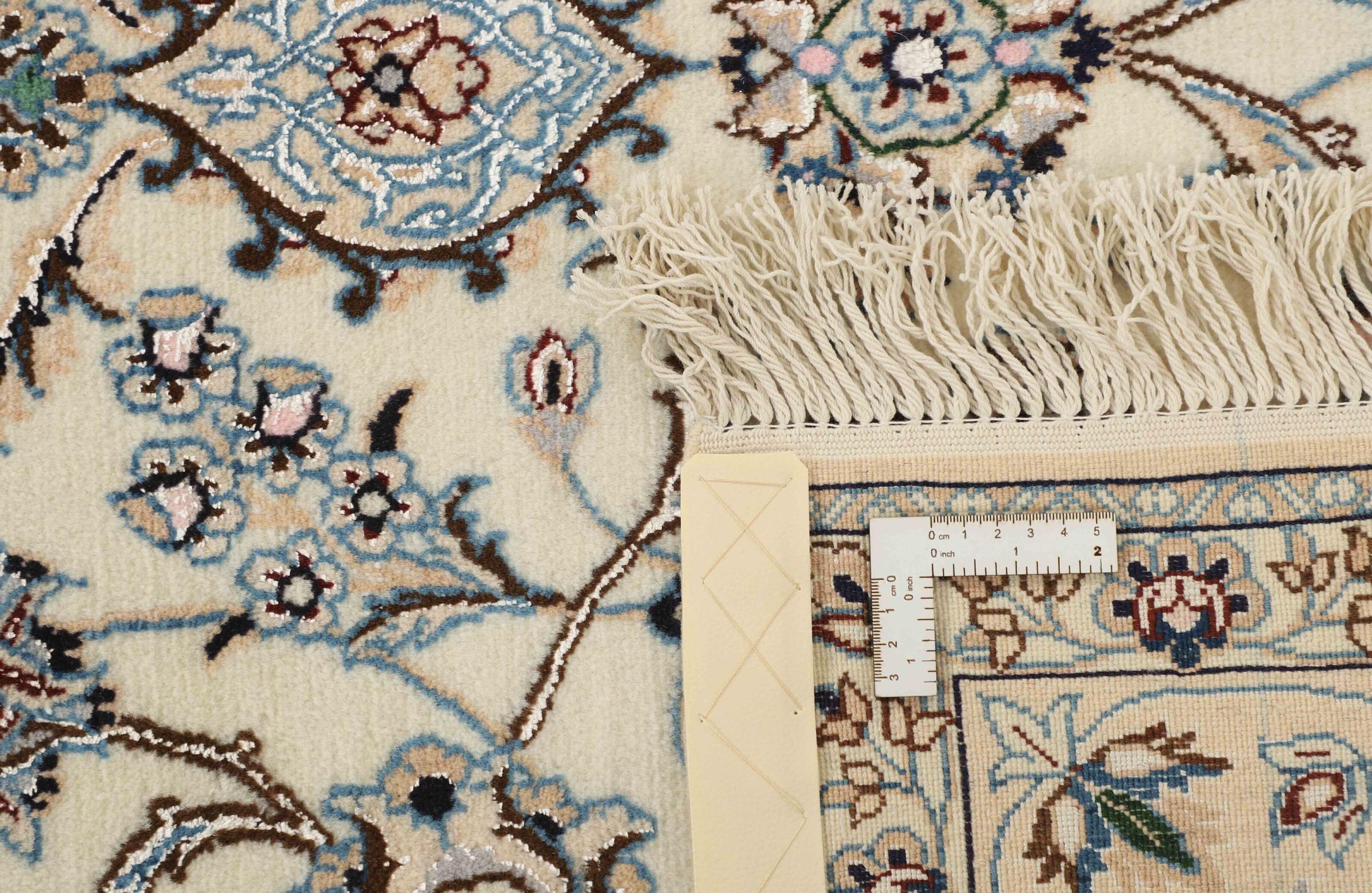Dette Nain-tæppe er klassificeret 9La. Den fremragende kvalitet, det smukke orientalske design med sine buede mønstre glæder enhver køber. Dette persiske tæppe blev håndknyttet af højkvalitets uld og natursilke i byen Nain, som ligger i den vestlige udkant af Dasht-e-Kavir-ørkenen. 9La Nain er væsentligt finere end en 12La og viser allerede smukke detaljer.