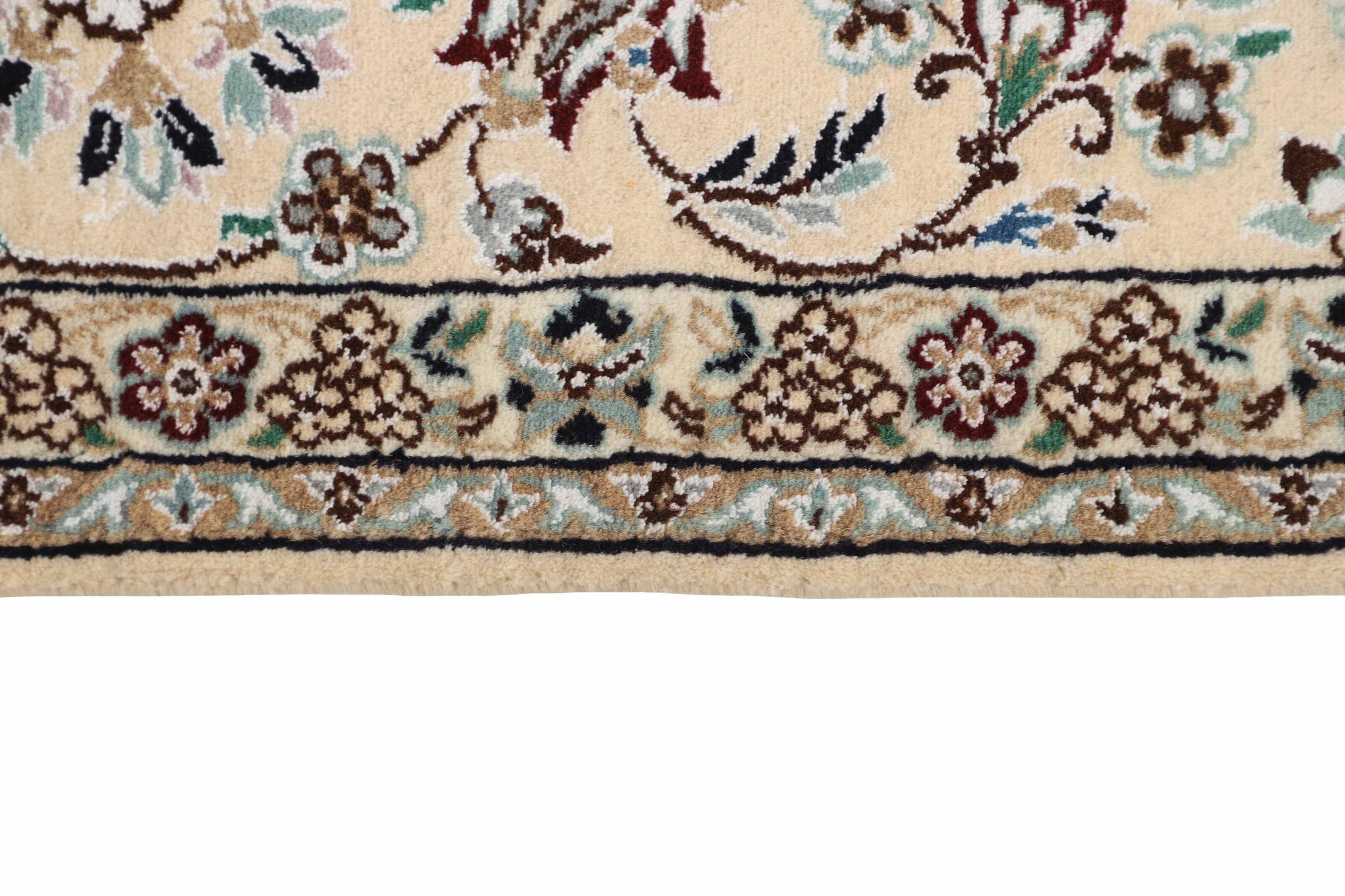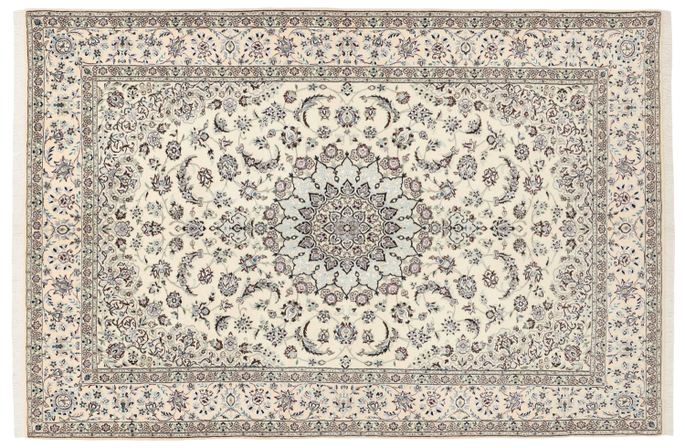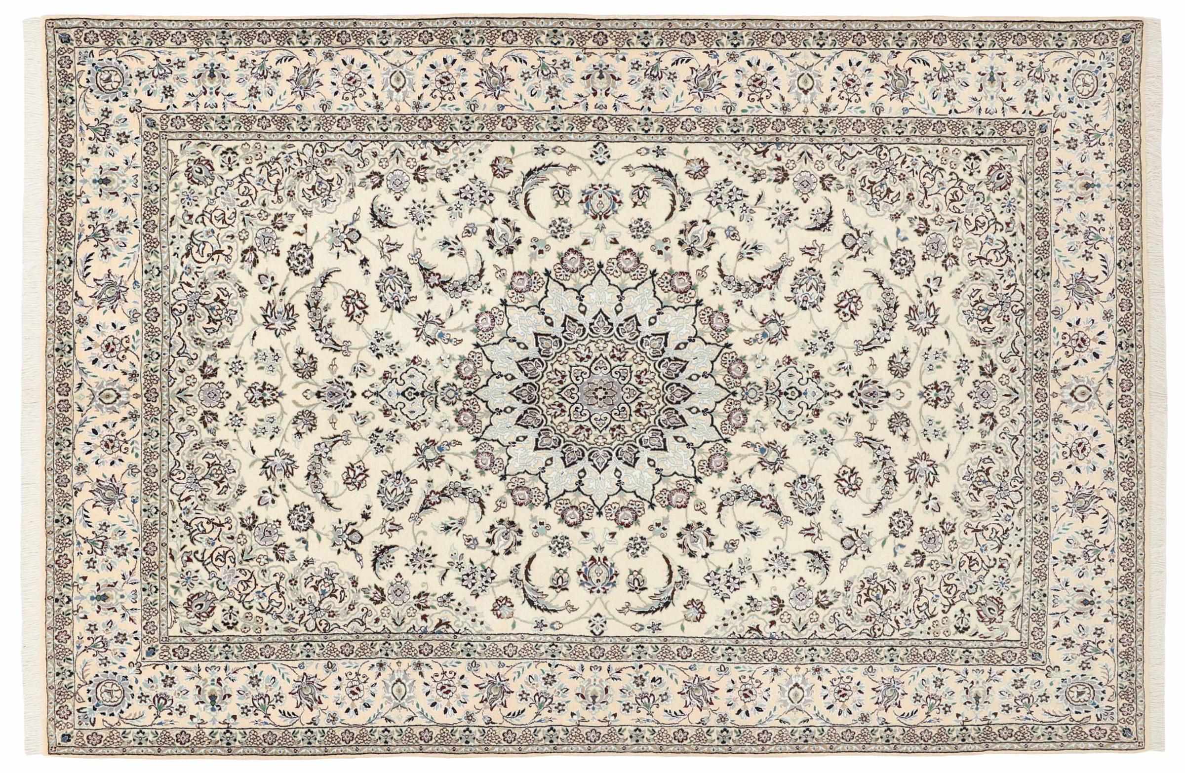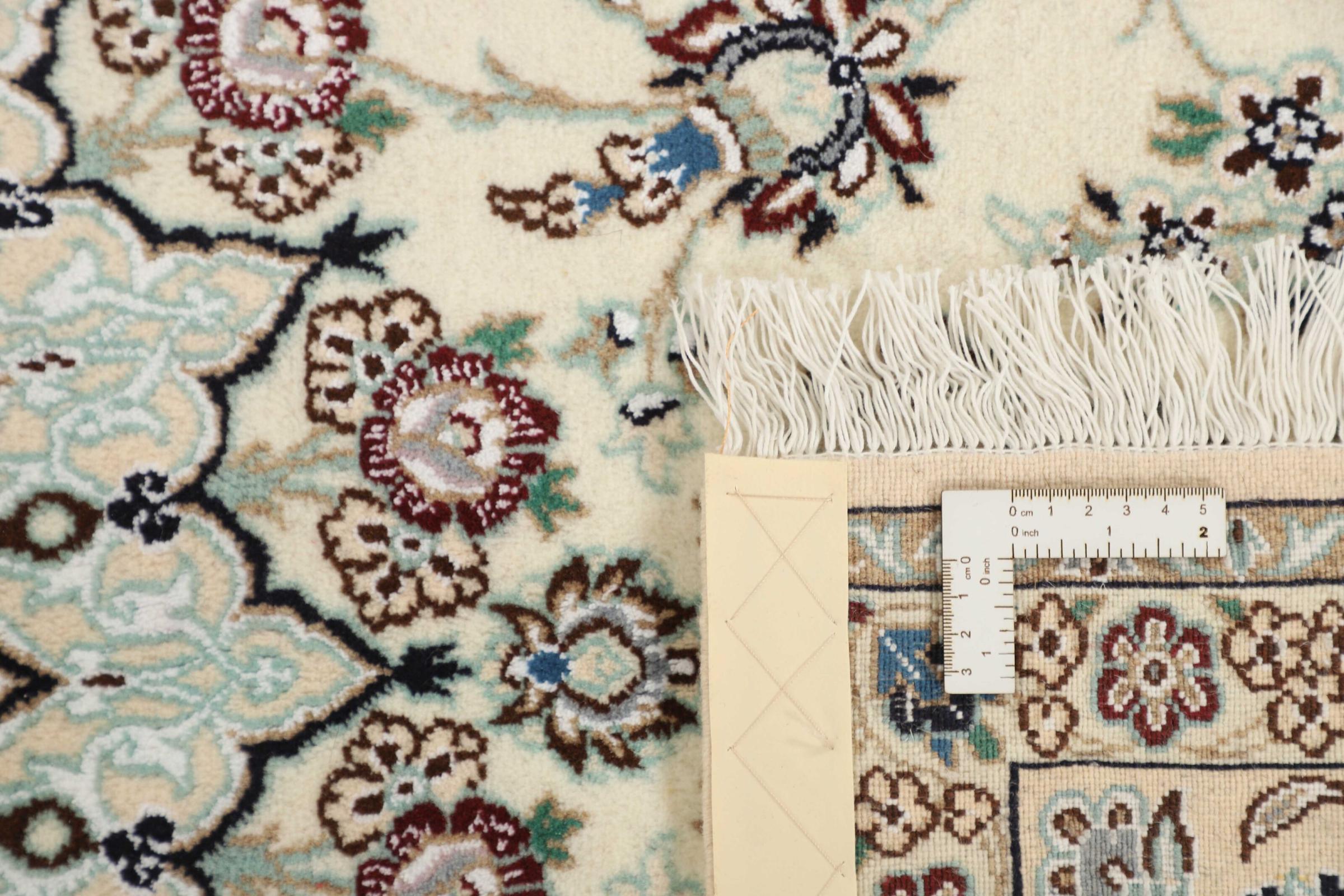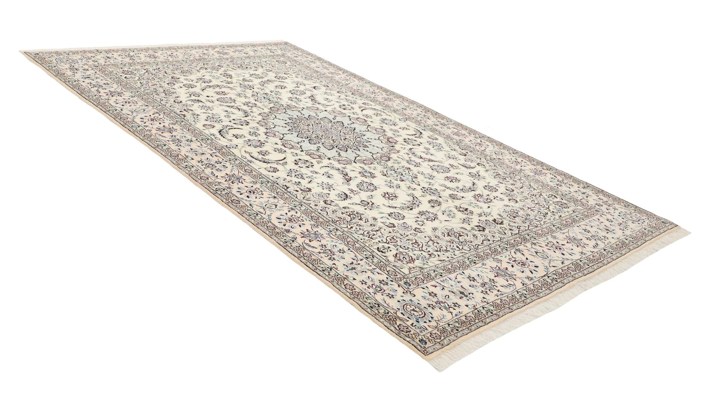 Dette Nain-tæppe er klassificeret 9La. Den fremragende kvalitet, det smukke orientalske design med sine buede mønstre glæder enhver køber. Dette persiske tæppe blev håndknyttet af højkvalitets uld og natursilke i byen Nain, som ligger i den vestlige udkant af Dasht-e-Kavir-ørkenen. 9La Nain er væsentligt finere end en 12La og viser allerede smukke detaljer.