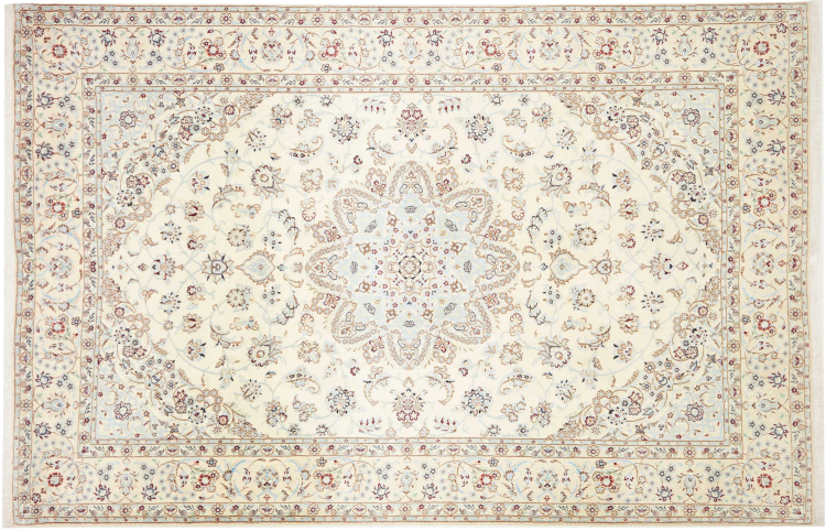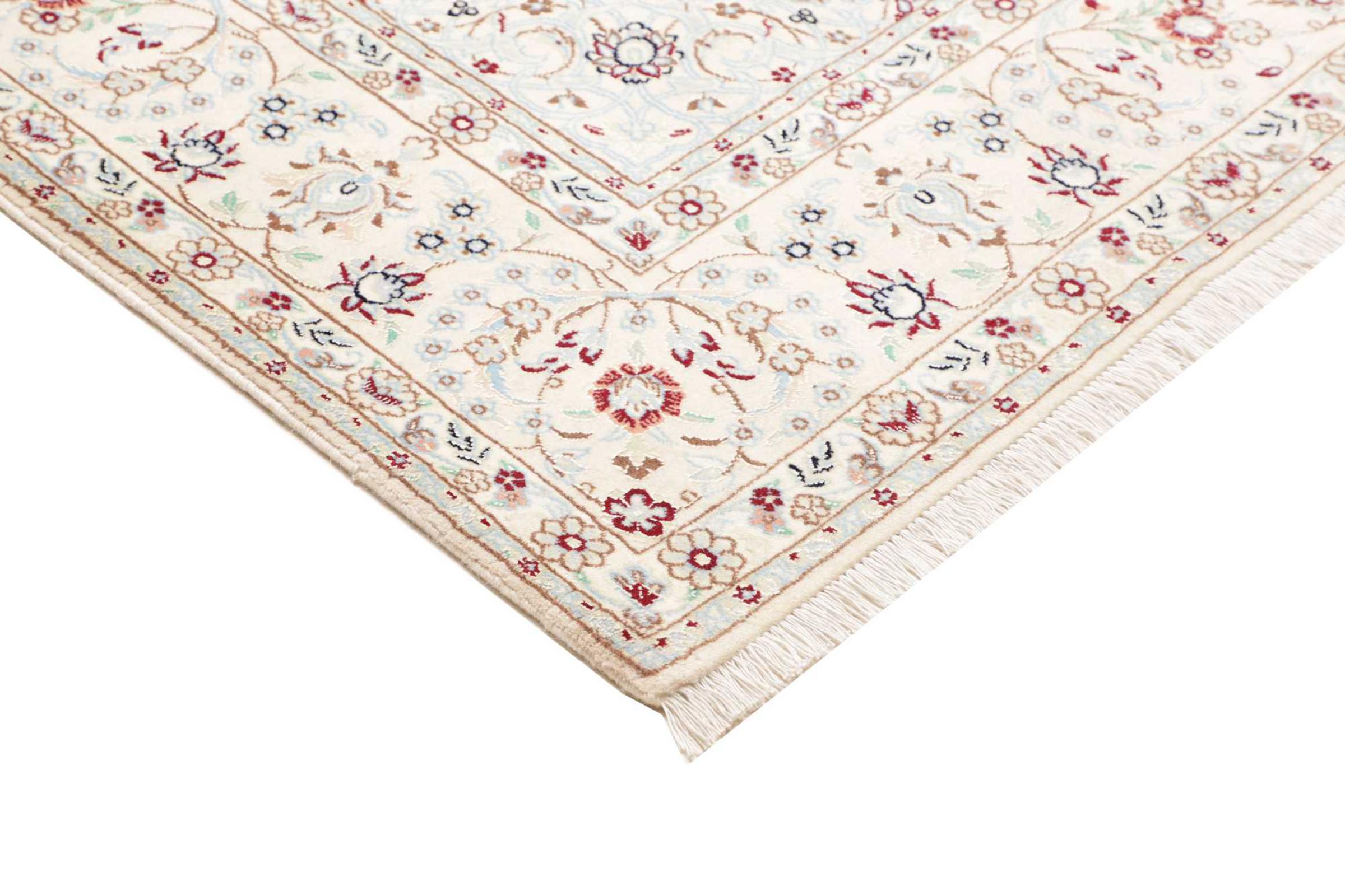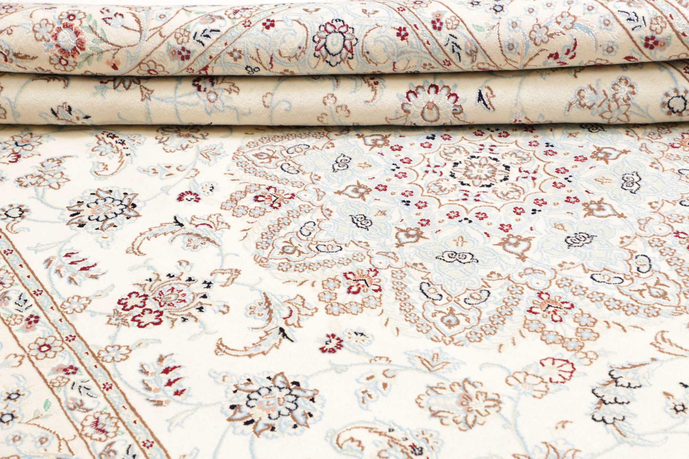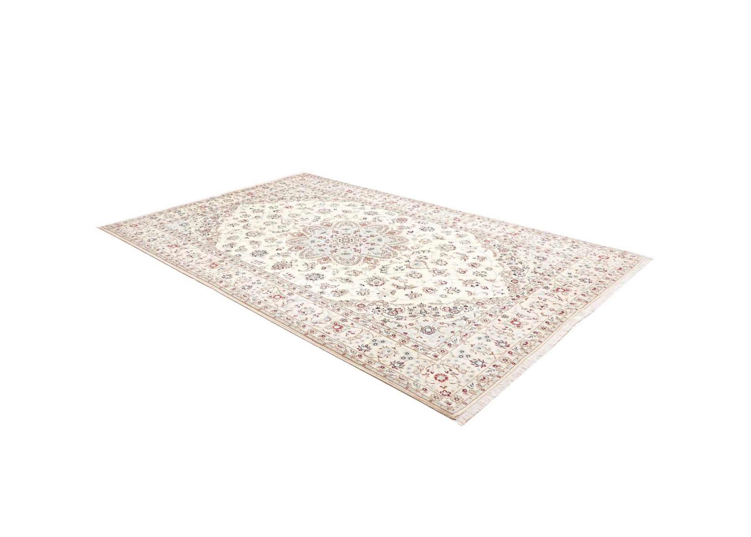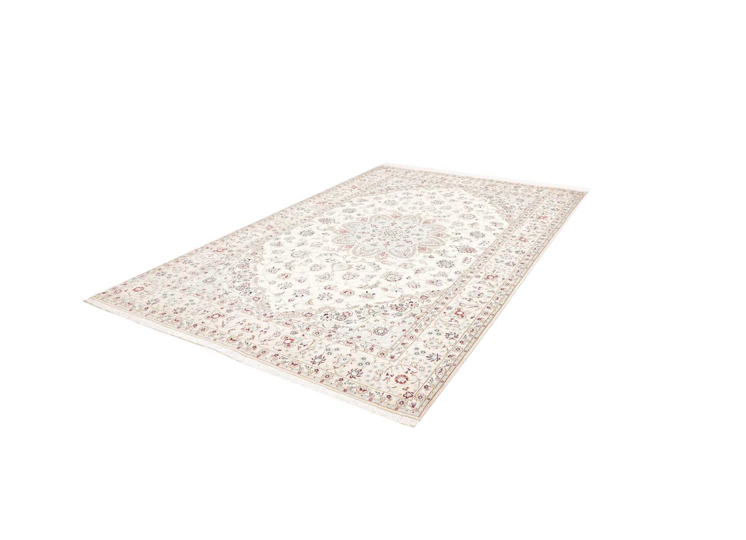 Dette Nain-tæppe er klassificeret 9La. Den fremragende kvalitet, det smukke orientalske design med sine buede mønstre glæder enhver køber. Dette persiske tæppe blev håndknyttet af højkvalitets uld og natursilke i byen Nain, som ligger i den vestlige udkant af Dasht-e-Kavir-ørkenen. 9La Nain er væsentligt finere end en 12La og viser allerede smukke detaljer.